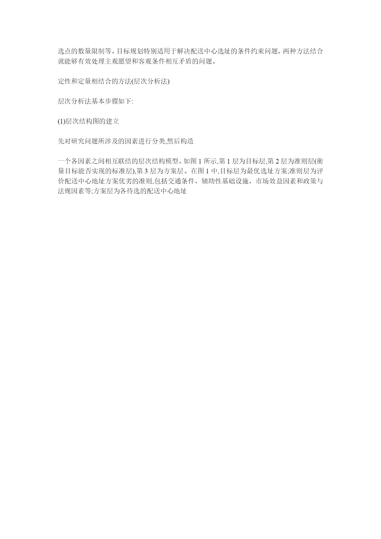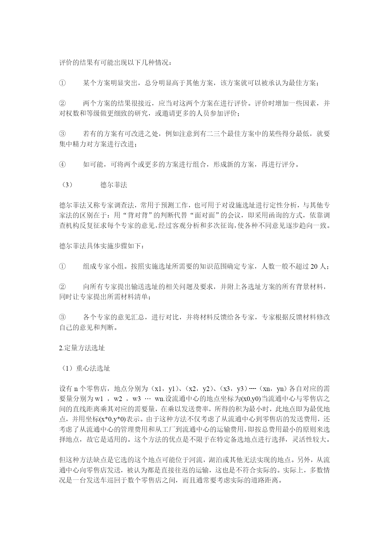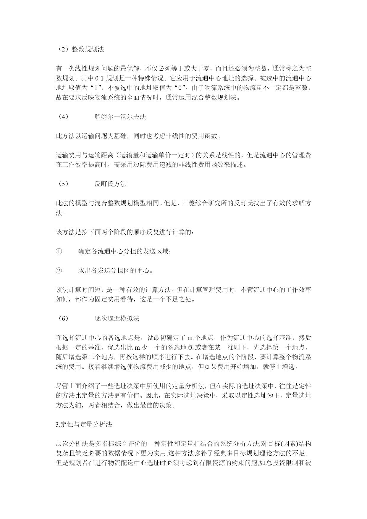 物流设施选址方法介绍定性分析法(1)优缺点比较法优缺点比较法是一种最简单的设施选址的定性分析法,尤其适应于非经济因素的比较。该方法的具体做法是:罗列出各个方案的优缺点进行分析比较,并按最优、次优、一般、较差、极坏5个等级对各个方案的各个特点进行评分,对每个方案的各项得分加总,得分最多的方案为最优方案。这种方法在实际应用中,有的规划人员可能认为某个实施方案的优缺点是“显而易见“的或是很容易明白的,从而忽略了有说服力的分析。其实,对一个有经验的规划人员,列出一个优缺点评价表并不困难,而对说服有关人员却是十分必要和有效的。问题是要选择好优缺点所涉及的因素。特别是有关人员所考虑和关心的主导因素,这一点对决策者特别重要。为了防止遗漏。可以编一个内容齐全而最常用的实施方案评价因素点检表,供规划人员结合实施的具体情况逐项点检并筛选需要比较的因素。优缺点比较法的比较因素可从以下方面考虑:区域位置、面积及地形、地势与坡度、风向和日照、地质条件、土石方工程量、场址、现在所有者情况、交通情况、与城市的距离、供电与给排水、地震、防洪措施、经营条件、协作条件、建设速度等。这一方法基本上是就事论事,缺乏量化的比较,科学性不足,对非成本因素考虑较少,难以满足市场经济条件下的运作。但是这种传统方法中对各种选址因素的罗列分析,特别是调查研究的经验对初学者在选址中制订各种侯选方案是仍有借鉴之处。(2)加权因素比较法这种方法的特点是可以把提供比较的各项因素进行加权综合比较,充分考虑了各种因素对方案的影响程度,因此是一种比较通用的方法。关键是要选择好比较的因素,合理地确定各个因素的权数和客观地对每个方案的各个因素打分。加权因素评价的程序如下:①明确要评价的方案②选址考虑的因素③准备评分表④确定每个因素的相对重要性⑤给每个方案每个因素评分⑥计算加权分评价的结果有可能出现以下几种情况:①某个方案明显突出,总分明显高于其他方案,该方案就可以被承认为最佳方案;②两个方案的结果很接近,应当对这两个方案在进行评价。评价时增加一些因素,并对权数和等级做更细致的研究,或邀请更多的人员参加评价;③若有的方案有可改进之处,例如注意到有二三个最佳方案中的某些得分最低,就要集中精力对方案进行改进;④如可能,可将两个或更多的方案进行组合,形成新的方案,再进行评分。(3)德尔菲法德尔菲法又称专家调查法,常用于预测工作,也可用于对设施选址进行定性分析,与其他专家法的区别在于:用“背对背”的判断代替“面对面”的会议,即采用函询的方式,依靠调查机构反复征求每个专家的意见,经过客观分析和多次征询,使各种不同意见逐步趋向一致。德尔菲法具体实施步骤如下:①组成专家小组。按照实施选址所需要的知识范围确定专家,人数一般不超过20人;②向所有专家提出输送选址的相关问题及要求,并附上各选址方案的所有背景材料,同时让专家提出所需材料清单;③各个专家的意见汇总,进行对比,并将材料反馈给各专家,专家根据反馈材料修改自己的意见和判断。2.定量方法选址(1)重心法选址设有n个零售店,地点分别为(x1,y1)、(x2,y2)、(x3,y3)┉(xn,yn)各自对应的需要量分别为w1,w2,w3…wn.设流通中心的地点坐标为(x0,y0)当流通中心与零售店之间的直线距离乘其对应的需要量,在乘以发送费率,所得的积为最小时,此地点即为最优地点,并用坐标(x*0,y*0)表示。由于这种方法不仅考虑了从流通中心到零售店的发送费用,还考虑了从流通中心的管理费用和从工厂到流通中心的运输费用,即按总费用最小的原则来选择地点,故它是适用的。这个方法的优点是不限于在特定备选地点进行选择,灵活性较大。但这种方法缺点是它选的这个地点可能位于河流,湖泊或其他无法实现的地点。另外,从流通中心向零售店发送,被认为都是直接往返的运输,这也是不符合实际的。实际上,多数情况是一台发送车巡回于数个零售店之间,而且通常要考虑实际的道路距离。(2)整数规划法有一类线性规划问题的最优解,不仅必须等于或大于零,而且还必须为整数,通常称之为整数规划。其中0-1规划是一种特殊情况。它应用于流通中心地址的选择。被选中的流通中心地址取值为“1”,不被选中的地址取值为“0”。由于物流系统中的物流量不一定都是整数,故在要求反映物流系统的全面情况时,通常运用混合整数规划法。(4)鲍姆尔—沃尔夫法此方法以运输问题为基础,同时也考虑非线性的费用函数。运输费用与运输距离(运输量和运输单价一定时)的关系是线性的,但是流通中心的管理费在工作效率提高时,需采用边际费用递减的非线性费用函数来描述。(5)反町氏方法此法的模型与混合整数规划模型相
