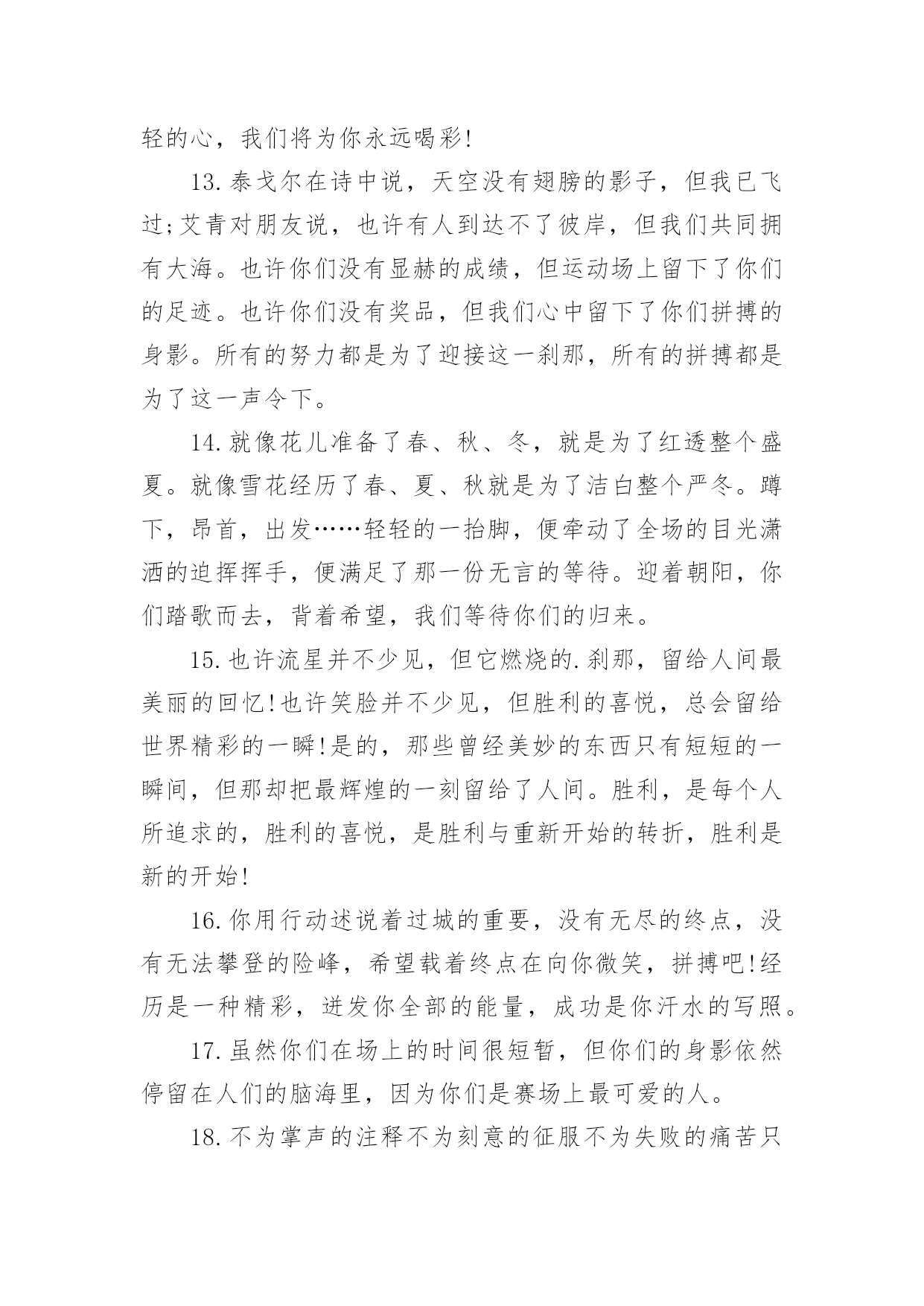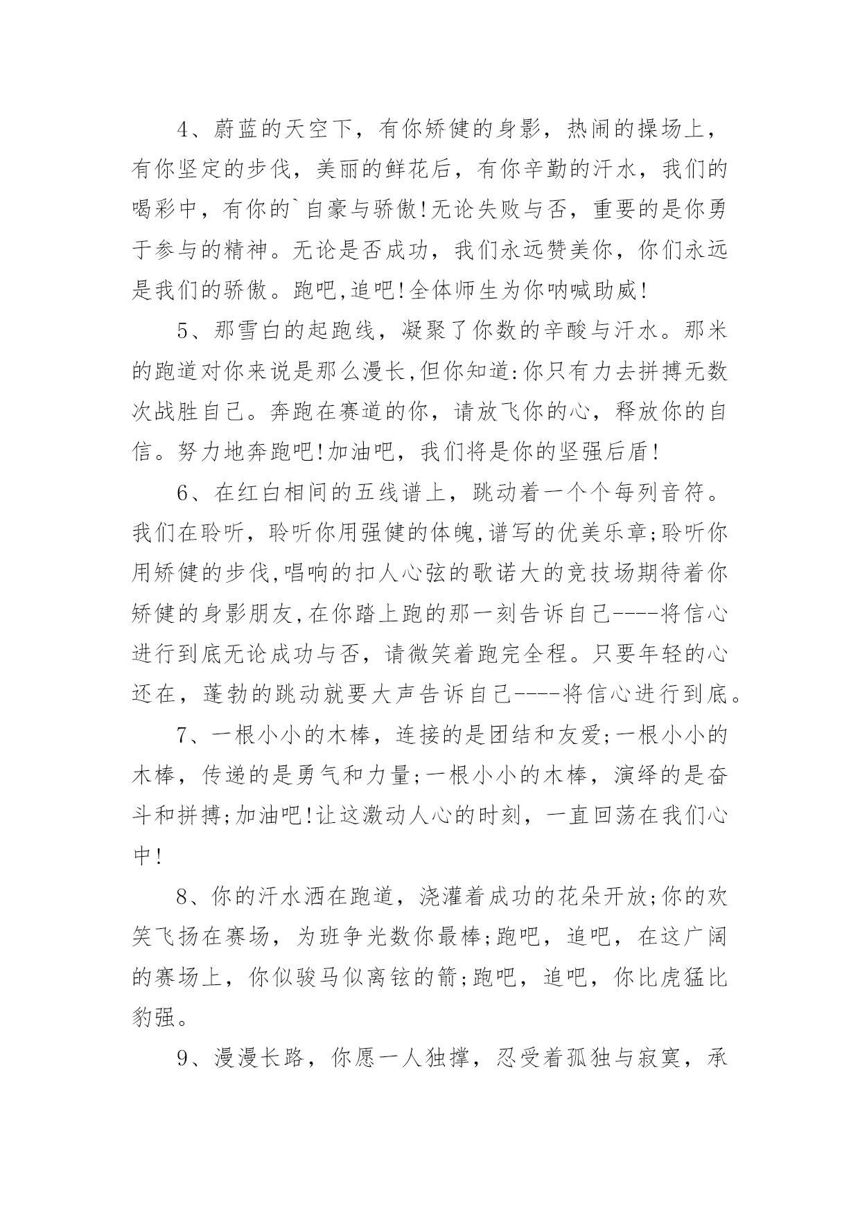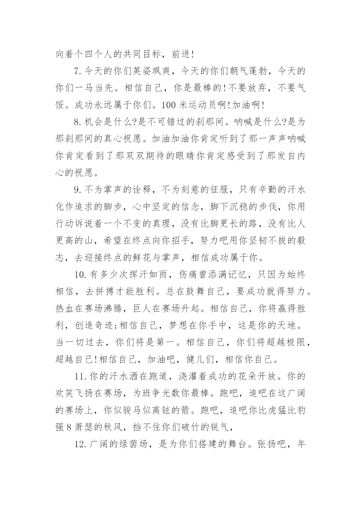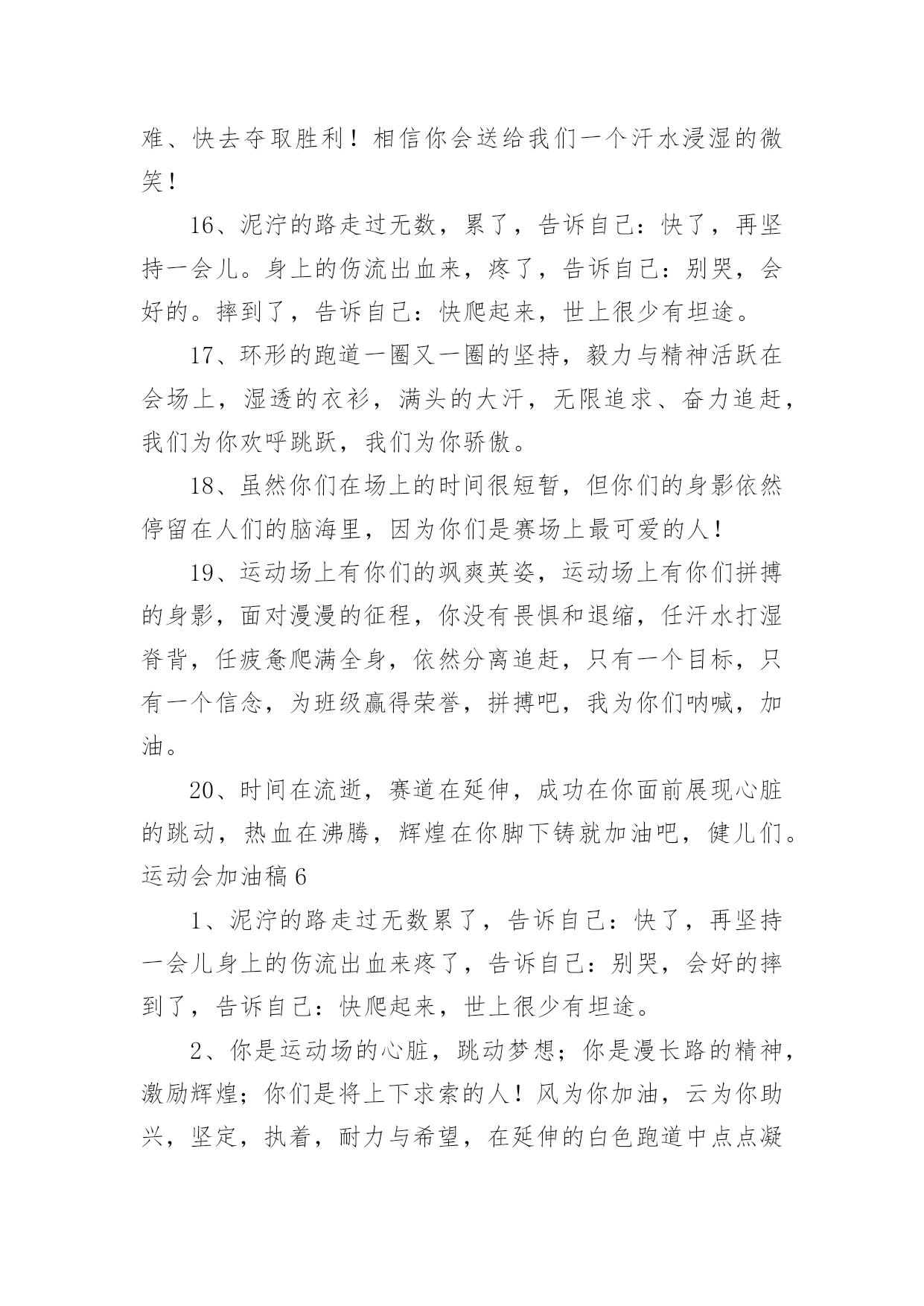 运动会加油稿(热门)运动会加油稿在社会发展不断提速的今天,我们用到加油稿的地方越来越多,借助加油稿可以活跃气氛,催人奋进。那要怎么写好加油稿呢?以下是小编为大家收集的运动会加油稿,仅供参考,欢迎大家阅读。运动会加油稿1远远的地方吹来一阵微风,夹着轻轻的私语。侧耳仔细听,那是同学们的加油声,裁判的枪声,就像一种音乐,为我校第xx届运动会伴奏的音乐。夏夜蛙虫的鸣唱,春晨鸟雀的.啾唧,这些自然的声音都不及一声枪响令人震惊,似乎身体里的血液都为之沸腾。我们怀着期待的心情,像每一个传说里的英雄一样,把梦想和汗水一起调和密封,然后潜心等待那注定的时刻。加油啊,xx班,我们或许会忘记童年生活的美好点滴,但我们不会忘记操场上有你那矫健的身影。运动会加油稿21.倒下的时候,生命又怎能屹立!歪歪斜斜的身影,又怎耐的住风雨的洗礼。你若有一个不屈的灵魂,脚下才会有一方坚实的土地。昨天的失败已经过去,胜利不仅仅是一个美好的话题。2.每一份辛劳都有一份收获,每一次的痛苦都是快乐的开始,没一声呐喊都是力量的呼唤。我们有着大浪拍岸的豪迈,所以你不必在乎初露的恬静,我们有着春日的阳光明媚,所以不用去羡慕冬日乱玉碎琼,我们是雨天的一把伞,是寒冷冬日里的一盆碳火,温暖的不只是你我,而是大家的心。运动场上的健儿,掌声属于你们,鲜花属于你们,成功也是属于你们!3.借着奥运的东风迎着观众的喝彩,我们运动起来,奔跑在的跑道上,让我们共同努力,奔跑奔跑,冲向胜利的终点。4.每一份辛劳都有一份收获,每一次的痛苦都是快乐的开始,没一声呐喊都是力量的呼唤。我们有着大浪拍岸的豪迈,所以你不必在乎初露的恬静,我们有着春日的阳光明媚,所以不用去羡慕冬日乱玉碎琼,我们是雨天的一把伞,是寒冷冬日里的一盆碳火,温暖的不只是你我,而是大家的心。运动场上的健儿,掌声属于你们,鲜花属于你们,成功也是属于你们!5.借着奥运的东风迎着观众的喝彩,我们运动起来,奔跑在的跑道上,让我们共同努力,奔跑奔跑,冲向胜利的终点。6.一条跑道,要四个人去打造一个信念,要四个人去拼搏每次交接都是信任的传递每次交接都是永恒的支持前世的五百次回眸,才能够换来今天的相遇,冲吧!向着终点,向着个四个人的共同目标,前进!7.今天的你们英姿飒爽,今天的你们朝气蓬勃,今天的你们一马当先。相信自己,你是最棒的!不要放弃,不要气馁。成功永远属于你们。100米运动员啊!加油啊!8.机会是什么?是不可错过的刹那间。呐喊是什么?是为那刹那间的真心祝愿。加油加油你肯定听到了那一声声呐喊你肯定看到了那双双期待的眼睛你肯定感受到了那发自内心的祝愿。9.不为掌声的诠释,不为刻意的征服,只有辛勤的汗水化作追求的脚步,心中坚定的信念,脚下沉稳的步伐,你用行动诉说着一个不变的真理,没有比脚更长的路,没有比人更高的山,希望在终点向你招手,努力吧用你坚韧不拔的毅志,去迎接终点的鲜花与掌声,相信成功属于你。10.有多少次挥汗如雨,伤痛曾添满记忆,只因为始终相信,去拼搏才能胜利。总在鼓舞自己,要成功就得努力。热血在赛场沸腾,巨人在赛场升起。相信自己,你将赢得胜利,创造奇迹;相信自己,梦想在你手中,这是你的天地。当一切过去,你们将是第一。相信自己,你们将超越极限,超越自己!相信自己,加油吧,健儿们,相信你自己。11.你的汗水洒在跑道,浇灌着成功的花朵开放。你的欢笑飞扬在赛场,为班争光数你最棒。跑吧,追吧在这广阔的赛场上,你似骏马似离铉的箭。跑吧,追吧你比虎猛比豹强8萧瑟的秋风,挡不住你们破竹的锐气,12.广阔的绿茵场,是为你们搭建的舞台。张扬吧,年轻的心,我们将为你永远喝彩!13.泰戈尔在诗中说,天空没有翅膀的影子,但我已飞过;艾青对朋友说,也许有人到达不了彼岸,但我们共同拥有大海。也许你们没有显赫的成绩,但运动场上留下了你们的足迹。也许你们没有奖品,但我们心中留下了你们拼搏的身影。所有的努力都是为了迎接这一刹那,所有的拼搏都是为了这一声令下。14.就像花儿准备了春、秋、冬,就是为了红透整个盛夏。就像雪花经历了春、夏、秋就是为了洁白整个严冬。蹲下,昂首,出发……轻轻的一抬脚,便牵动了全场的目光潇洒的迫挥挥手,便满足了那一份无言的等待。迎着朝阳,你们踏歌而去,背着希望,我们等待你们的归来。15.也许流星并不少见,但它燃烧的.刹那,留给人间最美丽的回忆!也许笑脸并不少见,但胜利的喜悦,总会留给世界精彩的一瞬!是的,那些曾经美妙的东西只有短短的一瞬间,但那却把最辉煌的一刻留给了人间。胜利,是每个人所追求的,胜利的喜悦,是胜利与重新开始的转折,胜利是新的开始!16.你用行动述说着过城的重要,没有无尽的终点,没有无法攀登的险峰,希望载着终点在向你微笑,拼搏吧!经历是一种精彩,迸发你全部的能量,成功是你汗水的写照。17.虽然你们在场上的时间很短暂,但你们的身影依然停留在人
