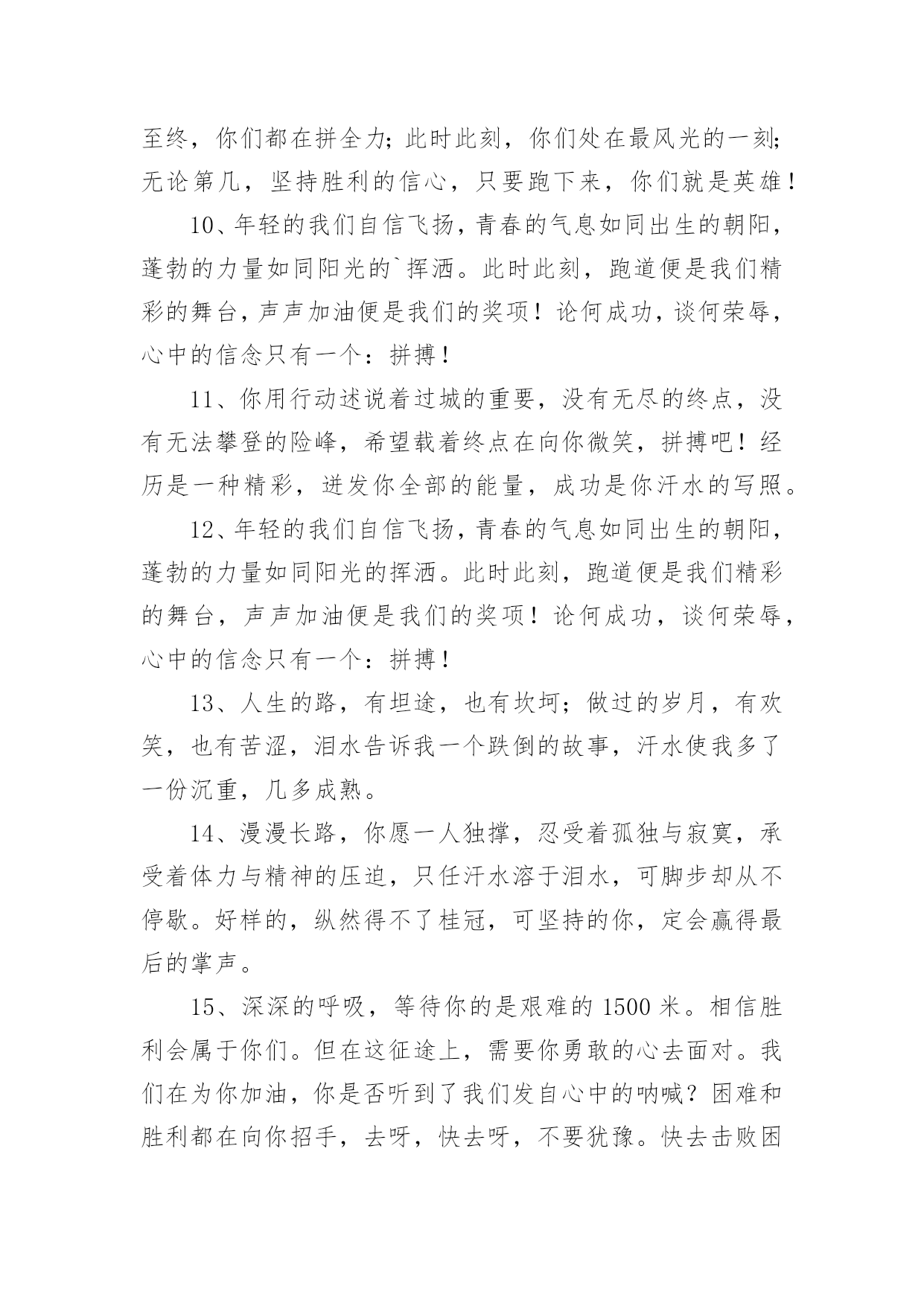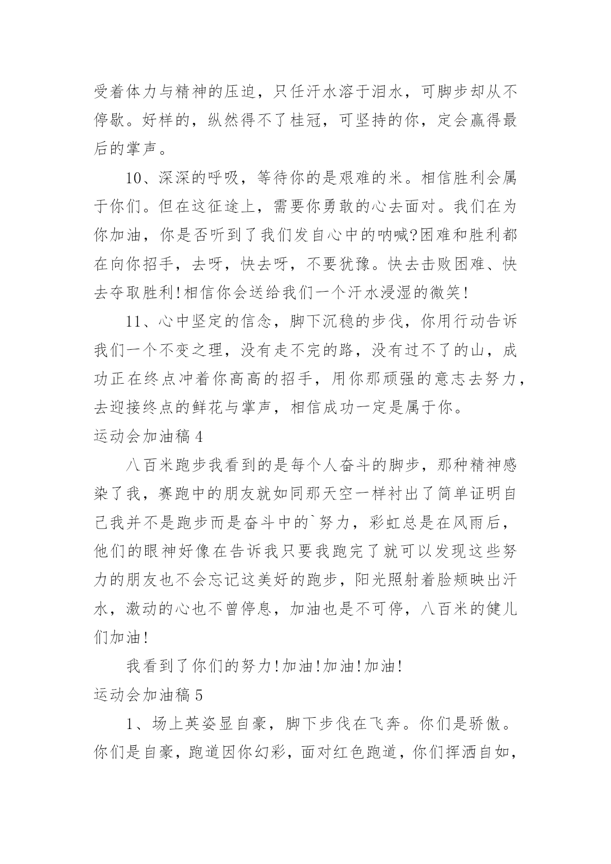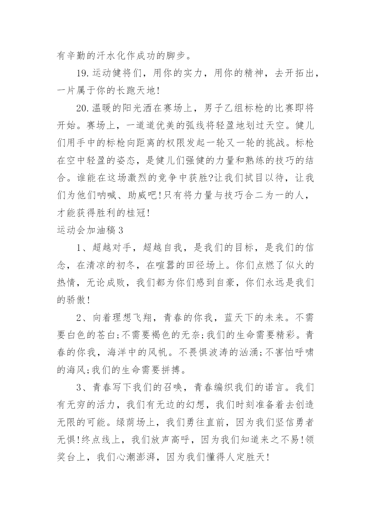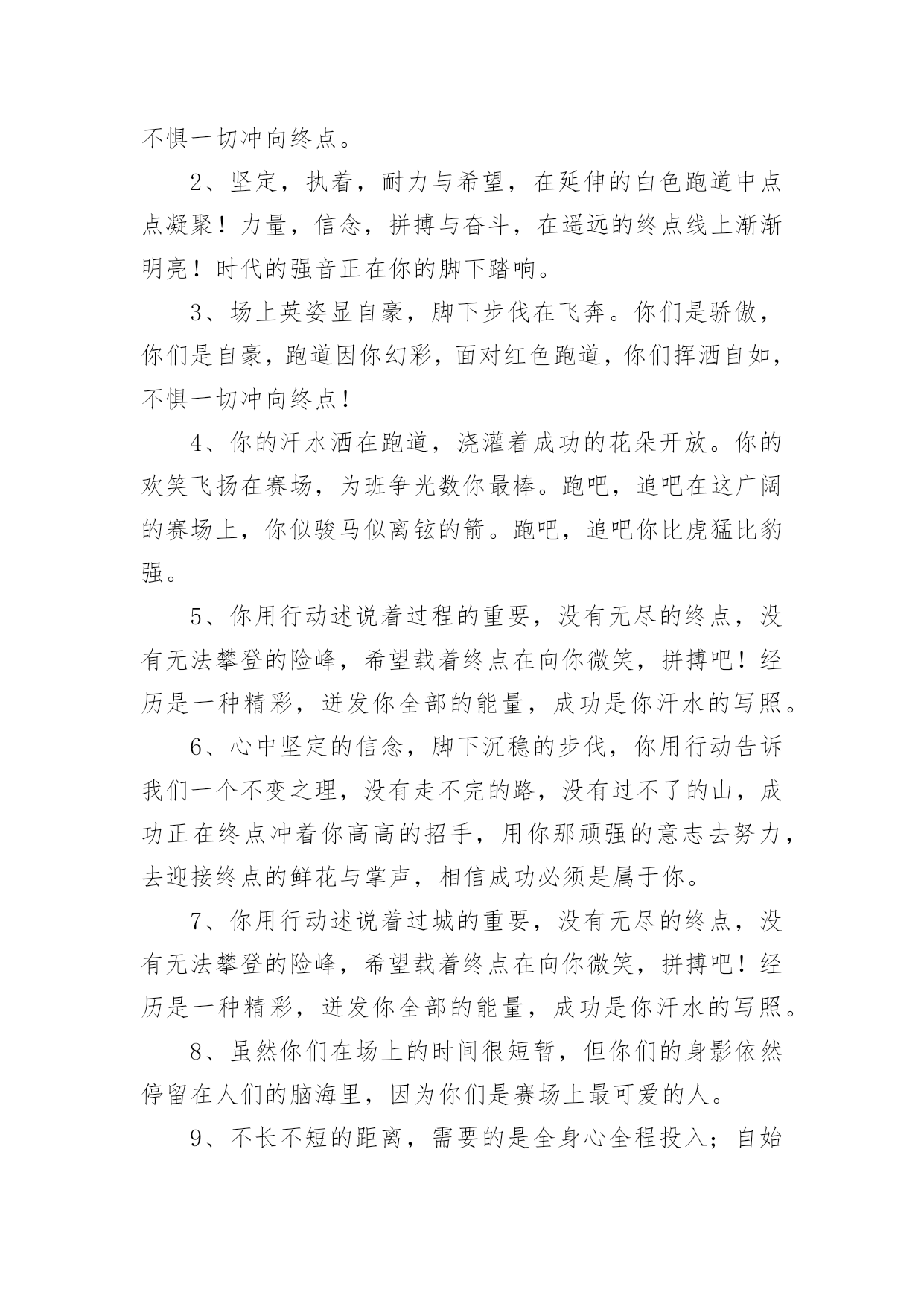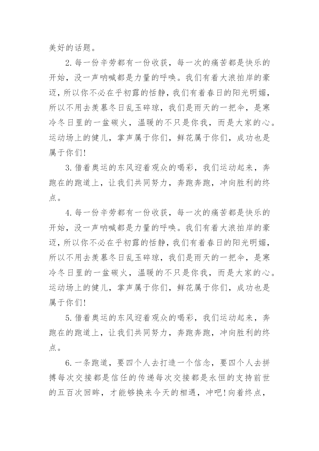 运动会加油稿(热门)运动会加油稿在社会发展不断提速的今天,我们用到加油稿的地方越来越多,借助加油稿可以活跃气氛,催人奋进。那要怎么写好加油稿呢?以下是小编为大家收集的运动会加油稿,仅供参考,欢迎大家阅读。运动会加油稿1远远的地方吹来一阵微风,夹着轻轻的私语。侧耳仔细听,那是同学们的加油声,裁判的枪声,就像一种音乐,为我校第xx届运动会伴奏的音乐。夏夜蛙虫的鸣唱,春晨鸟雀的.啾唧,这些自然的声音都不及一声枪响令人震惊,似乎身体里的血液都为之沸腾。我们怀着期待的心情,像每一个传说里的英雄一样,把梦想和汗水一起调和密封,然后潜心等待那注定的时刻。加油啊,xx班,我们或许会忘记童年生活的美好点滴,但我们不会忘记操场上有你那矫健的身影。运动会加油稿21.倒下的时候,生命又怎能屹立!歪歪斜斜的身影,又怎耐的住风雨的洗礼。你若有一个不屈的灵魂,脚下才会有一方坚实的土地。昨天的失败已经过去,胜利不仅仅是一个美好的话题。2.每一份辛劳都有一份收获,每一次的痛苦都是快乐的开始,没一声呐喊都是力量的呼唤。我们有着大浪拍岸的豪迈,所以你不必在乎初露的恬静,我们有着春日的阳光明媚,所以不用去羡慕冬日乱玉碎琼,我们是雨天的一把伞,是寒冷冬日里的一盆碳火,温暖的不只是你我,而是大家的心。运动场上的健儿,掌声属于你们,鲜花属于你们,成功也是属于你们!3.借着奥运的东风迎着观众的喝彩,我们运动起来,奔跑在的跑道上,让我们共同努力,奔跑奔跑,冲向胜利的终点。4.每一份辛劳都有一份收获,每一次的痛苦都是快乐的开始,没一声呐喊都是力量的呼唤。我们有着大浪拍岸的豪迈,所以你不必在乎初露的恬静,我们有着春日的阳光明媚,所以不用去羡慕冬日乱玉碎琼,我们是雨天的一把伞,是寒冷冬日里的一盆碳火,温暖的不只是你我,而是大家的心。运动场上的健儿,掌声属于你们,鲜花属于你们,成功也是属于你们!5.借着奥运的东风迎着观众的喝彩,我们运动起来,奔跑在的跑道上,让我们共同努力,奔跑奔跑,冲向胜利的终点。6.一条跑道,要四个人去打造一个信念,要四个人去拼搏每次交接都是信任的传递每次交接都是永恒的支持前世的五百次回眸,才能够换来今天的相遇,冲吧!向着终点,向着个四个人的共同目标,前进!7.今天的你们英姿飒爽,今天的你们朝气蓬勃,今天的你们一马当先。相信自己,你是最棒的!不要放弃,不要气馁。成功永远属于你们。100米运动员啊!加油啊!8.机会是什么?是不可错过的刹那间。呐喊是什么?是为那刹那间的真心祝愿。加油加油你肯定听到了那一声声呐喊你肯定看到了那双双期待的眼睛你肯定感受到了那发自内心的祝愿。9.不为掌声的诠释,不为刻意的征服,只有辛勤的汗水化作追求的脚步,心中坚定的信念,脚下沉稳的步伐,你用行动诉说着一个不变的真理,没有比脚更长的路,没有比人更高的山,希望在终点向你招手,努力吧用你坚韧不拔的毅志,去迎接终点的鲜花与掌声,相信成功属于你。10.有多少次挥汗如雨,伤痛曾添满记忆,只因为始终相信,去拼搏才能胜利。总在鼓舞自己,要成功就得努力。热血在赛场沸腾,巨人在赛场升起。相信自己,你将赢得胜利,创造奇迹;相信自己,梦想在你手中,这是你的天地。当一切过去,你们将是第一。相信自己,你们将超越极限,超越自己!相信自己,加油吧,健儿们,相信你自己。11.你的汗水洒在跑道,浇灌着成功的花朵开放。你的欢笑飞扬在赛场,为班争光数你最棒。跑吧,追吧在这广阔的赛场上,你似骏马似离铉的箭。跑吧,追吧你比虎猛比豹强8萧瑟的秋风,挡不住你们破竹的锐气,12.广阔的绿茵场,是为你们搭建的舞台。张扬吧,年轻的心,我们将为你永远喝彩!13.泰戈尔在诗中说,天空没有翅膀的影子,但我已飞过;艾青对朋友说,也许有人到达不了彼岸,但我们共同拥有大海。也许你们没有显赫的成绩,但运动场上留下了你们的足迹。也许你们没有奖品,但我们心中留下了你们拼搏的身影。所有的努力都是为了迎接这一刹那,所有的拼搏都是为了这一声令下。14.就像花儿准备了春、秋、冬,就是为了红透整个盛夏。就像雪花经历了春、夏、秋就是为了洁白整个严冬。蹲下,昂首,出发……轻轻的一抬脚,便牵动了全场的目光潇洒的迫挥挥手,便满足了那一份无言的等待。迎着朝阳,你们踏歌而去,背着希望,我们等待你们的归来。15.也许流星并不少见,但它燃烧的.刹那,留给人间最美丽的回忆!也许笑脸并不少见,但胜利的喜悦,总会留给世界精彩的一瞬!是的,那些曾经美妙的东西只有短短的一瞬间,但那却把最辉煌的一刻留给了人间。胜利,是每个人所追求的,胜利的喜悦,是胜利与重新开始的转折,胜利是新的开始!16.你用行动述说着过城的重要,没有无尽的终点,没有无法攀登的险峰,希望载着终点在向你微笑,拼搏吧!经历是一种精彩,迸发你全部的能量,成功是你汗水的写照。17.虽然你们在场上的时间很短暂,但你们的身影依然停留在人