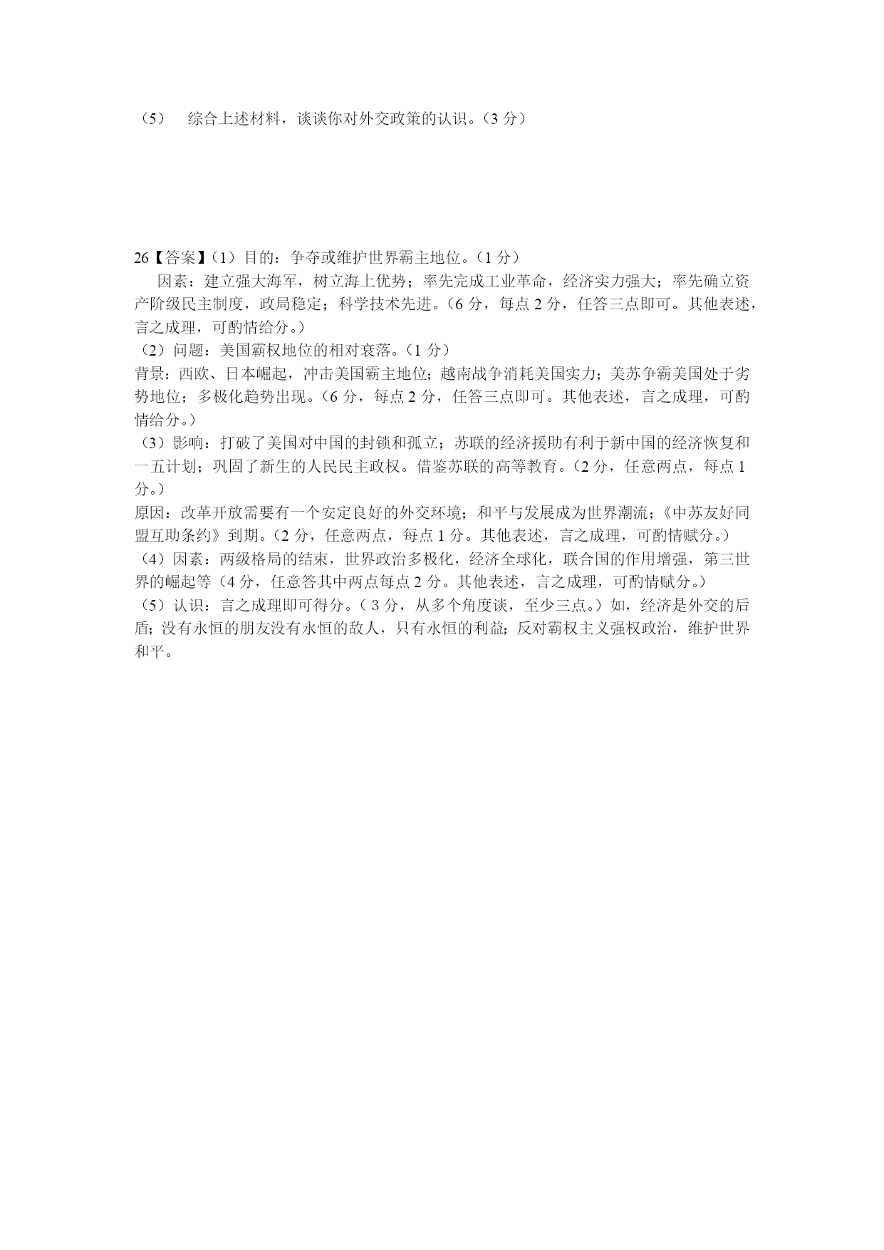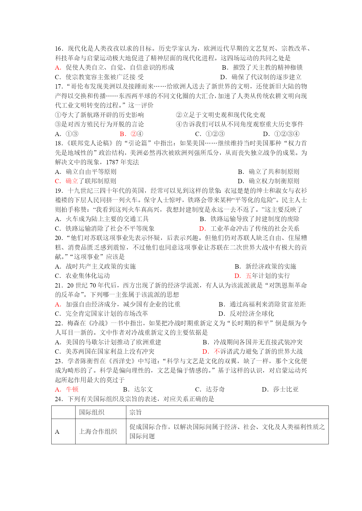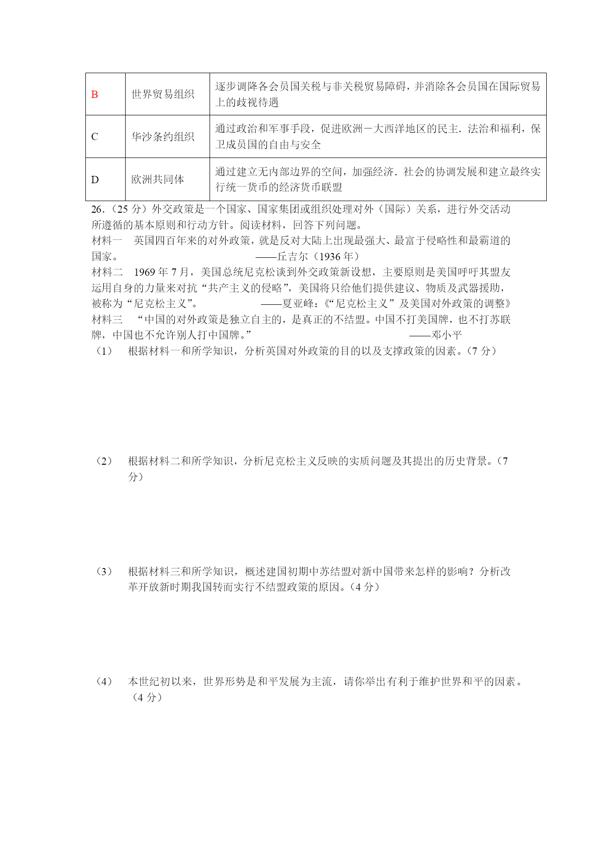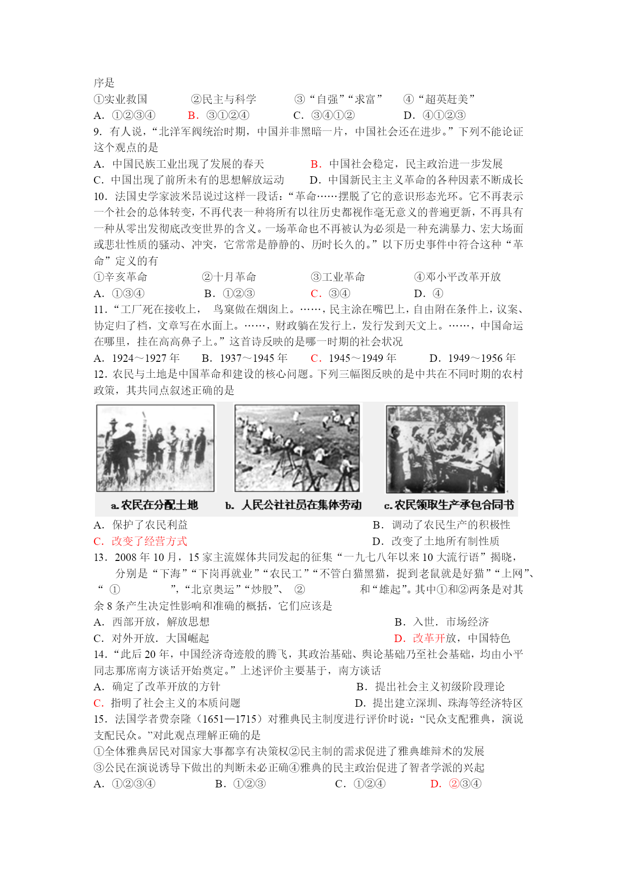 高考模拟训练二十1.右侧漫画《围剿公田》反映了春秋战国时期井田制的瓦解。“围剿公田”现象出现的根本原因是A.农民对井田制的破坏B.铁犁和牛耕的使用C.土地所有者间的矛盾斗争D.土地私有制的确立2.自秦汉至宋元,中国政治制度变革的总体趋势是A.地方政府的自主性逐渐被削弱B.国家行政权逐渐转移到君主手中C.宰相逐渐退出权力中心D.世卿世禄的贵族政治逐渐被打破3.“探寻中国经济政策演变之路”研究性学习小组在整理研究成果时,附了两幅描绘生产民俗的河北剪纸,借以说明中国古代的某种经济形态,同时他们还引用了与这一经济形态相对应的言论。这些言论不应包括A.“事末利及怠而贫者,举以为收孥”B.“上农除末,黔首是富”C.“闭门而为生之具以足,但家无井盐耳”D.“通工商之业,便渔盐之利”4.顾炎武认为:“王(阳明)学流背离孔门为学宗旨,不习六艺,不综当代之务,而专心于内,已非儒学之正宗。”材料反映了A.顾炎武意识到宋明理学的危机B.王阳明倡导“经世致用”C.顾炎武主张摒弃孔孟儒学D.王阳明深受西方思想影响5.陈旭麓先生说:“经历了英法联军之役后,士大夫们痛苦地名之曰:‘庚申之变’……中国社会中的人们已经体会到有一种不受欢迎,但又无法抗拒的变化正在发生。”“庚申之变”后20年中国社会的变化有①政府颁布“废止缠足”的法令②福州船政局的创办③西方民主思想的传入④中国民族资本主义的产生A.①③④B.①②④C.②③④D.①②③6.下图是我国近代民族资本主义工业发展趋势示意图,其中两次高潮期出现的共同原因是A.政府的支持B.有利的国际环境C.社会性质的改变D.民族独立的实现7.维新派指出,洋务运动“利未一见,弊已百出”的根本原因在于“变法不知本原”。维新派所讲的“本原”是A.专制制度B.工业经济C.传统儒家思想D.民主制度8.口号代表一种精神、一种希望,也曾使国人振奋。下面口号在中国历史上出现的先后顺序是①实业救国②民主与科学③“自强”“求富”④“超英赶美”A.①②③④B.③①②④C.③④①②D.④①②③9.有人说,“北洋军阀统治时期,中国并非黑暗一片,中国社会还在进步。”下列不能论证这个观点的是A.中国民族工业出现了发展的春天B.中国社会稳定,民主政治进一步发展C.中国出现了前所未有的思想解放运动D.中国新民主主义革命的各种因素不断成长10.法国史学家波米昂说过这样一段话:“革命……摆脱了它的意识形态光环。它不再表示一个社会的总体转变,不再代表一种将所有以往历史都视作毫无意义的普遍更新,不再具有一种从零出发彻底改变世界的含义。一场革命也不再被认为必须是一种充满暴力、宏大场面或悲壮性质的骚动、冲突,它常常是静静的、历时长久的。”以下历史事件中符合这种“革命”定义的有=1\*GB3①辛亥革命=2\*GB3②十月革命=3\*GB3③工业革命=4\*GB3④邓小平改革开放A.=1\*GB3①=3\*GB3③=4\*GB3④B.=1\*GB3①=2\*GB3②=3\*GB3③C.=3\*GB3③=4\*GB3④D.=4\*GB3④11.“工厂死在接收上,鸟窠做在烟囱上。……,民主涂在嘴巴上,自由附在条件上,议案、协定归了档,文章写在水面上。……,财政躺在发行上,发行发到天文上。……,中国命运在哪里,挂在高高鼻子上。”这首诗反映的是哪一时期的社会状况A.1924~1927年B.1937~1945年C.1945~1949年D.1949~1956年12.农民与土地是中国革命和建设的核心问题。下列三幅图反映的是中共在不同时期的农村政策,其共同点叙述正确的是A.保护了农民利益B.调动了农民生产的积极性C.改变了经营方式D.改变了土地所有制性质13.2008年10月,15家主流媒体共同发起的征集“一九七八年以来10大流行语”揭晓,分别是“下海”“下岗再就业”“农民工”“不管白猫黑猫,捉到老鼠就是好猫”“上网”、“①”,“北京奥运”“炒股”、②和“雄起”。其中①和②两条是对其余8条产生决定性影响和准确的概括,它们应该是A.西部开放,解放思想B.入世.市场经济C.对外开放.大国崛起D.改革开放,中国特色14.“此后20年,中国经济奇迹般的腾飞,其政治基础、舆论基础乃至社会基础,均由小平同志那席南方谈话开始奠定。”上述评价主要基于,南方谈话A.确定了改革开放的方针B.提出社会主义初级阶段理论C.指明了社会主义的本质问题D.提出建立深圳、珠海等经济特区15.法国学者费奈隆(1651—1715)对雅典民主制度进行评价时说:“民众支配雅典,演说支配民众。”对此观点理解正确的是①全体雅典居民对国