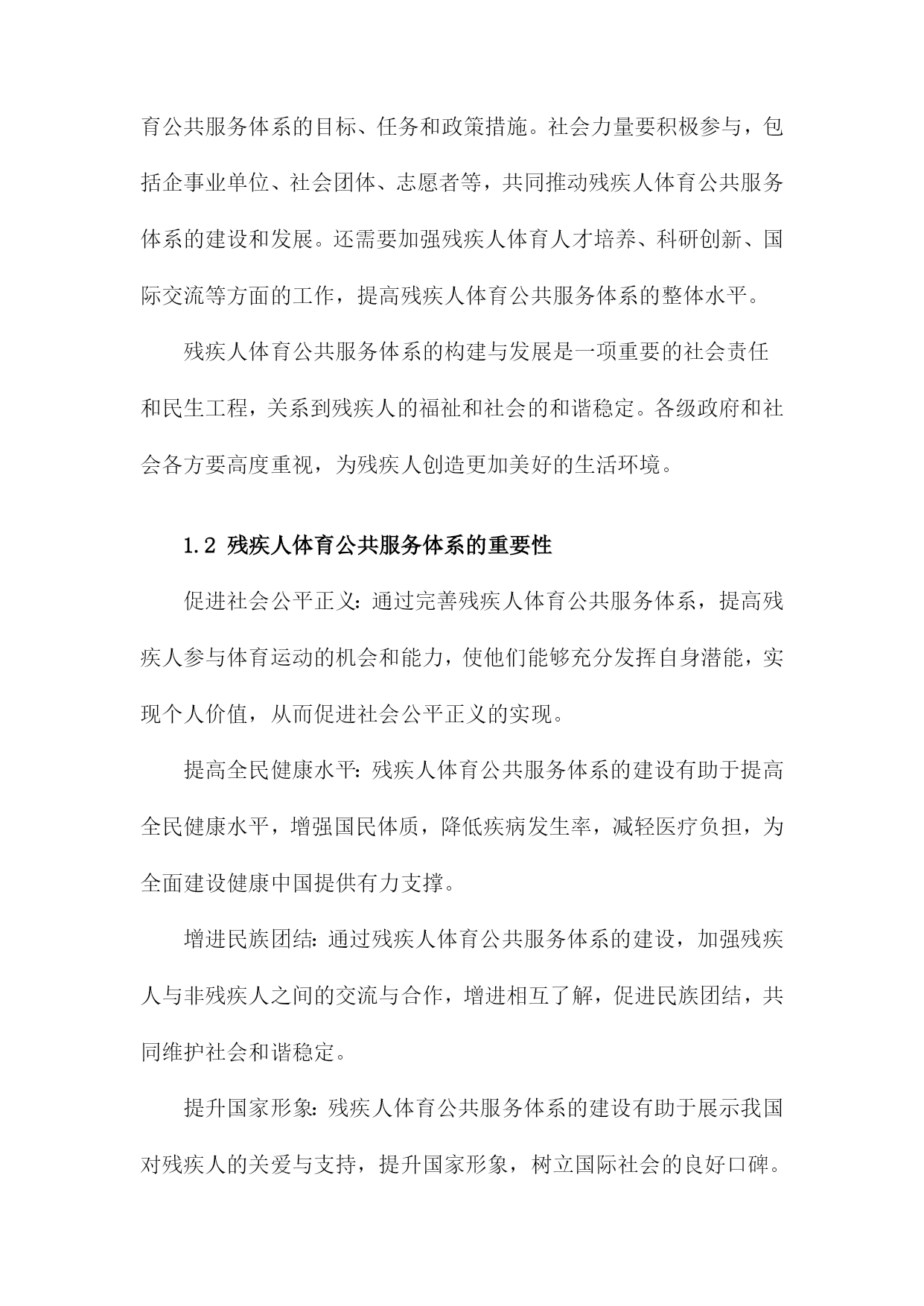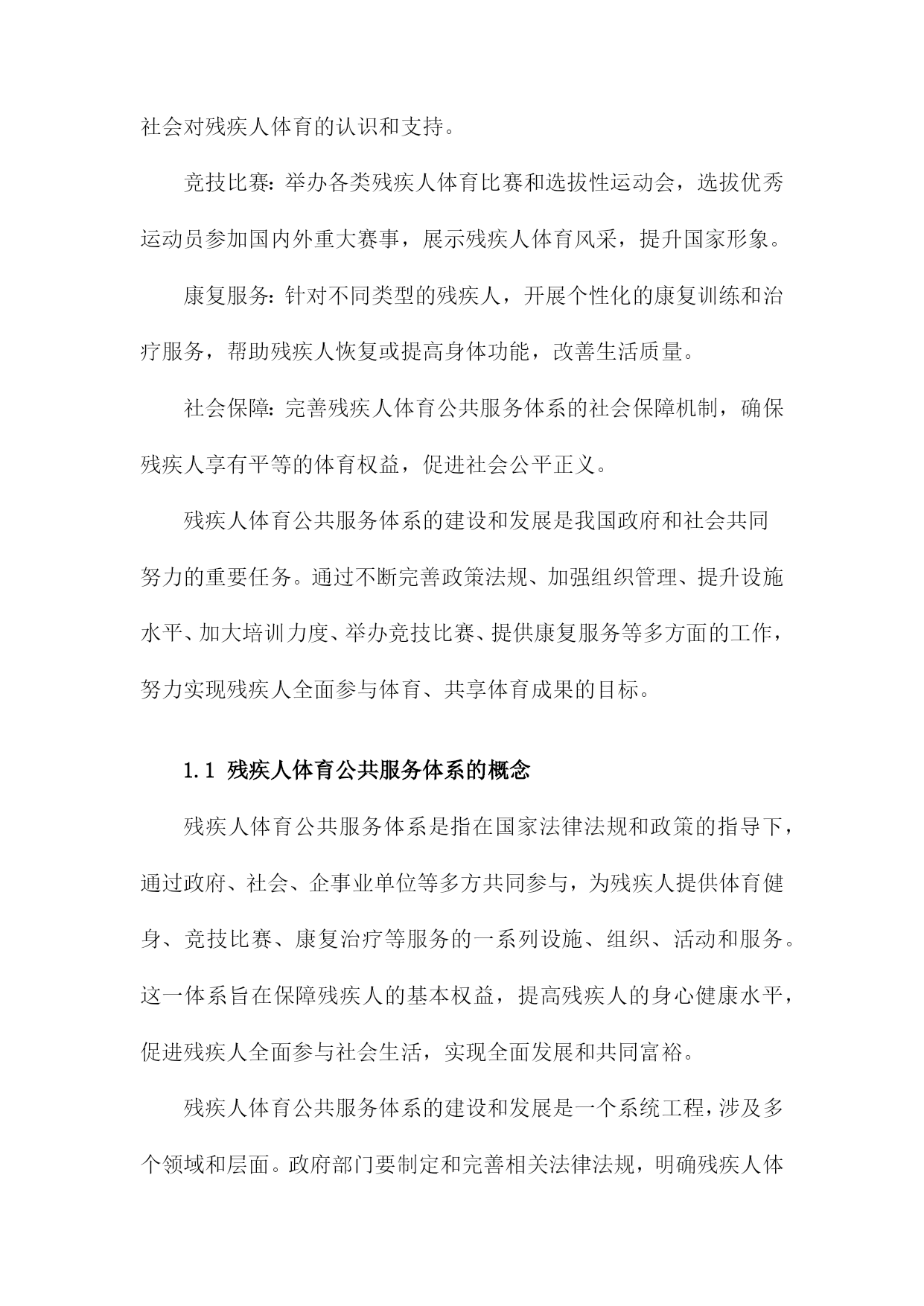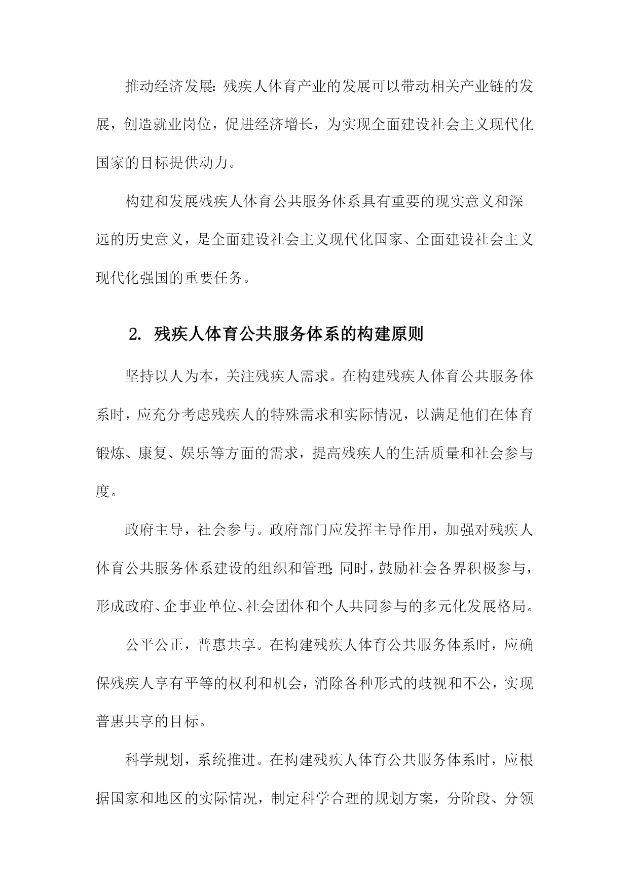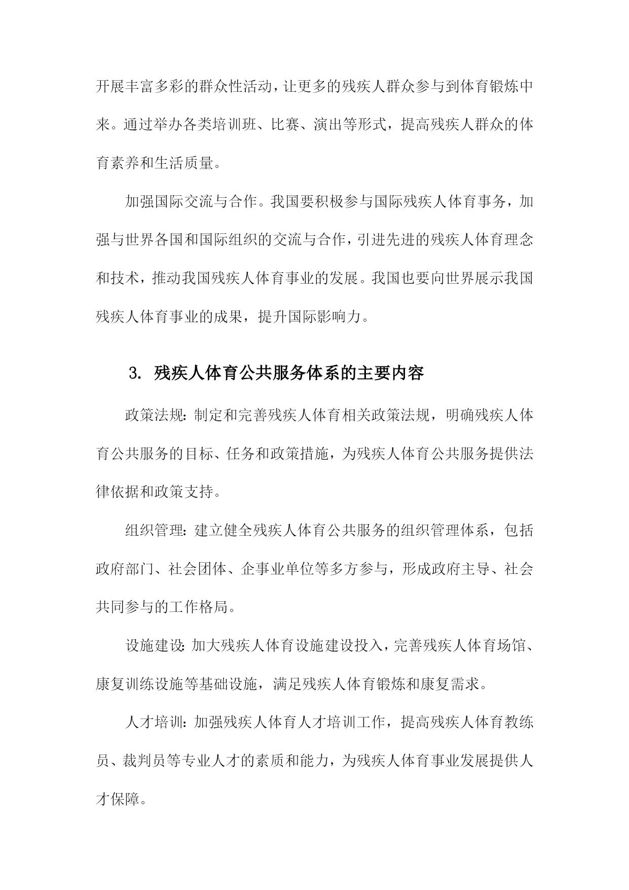 残疾人体育公共服务体系的构建与发展1.残疾人体育公共服务体系概述随着社会的发展和人们生活水平的提高,残疾人体育事业在我国得到了越来越多的关注。为了满足残疾人日益增长的体育需求,提高残疾人身体素质和生活质量,我国政府制定了一系列政策和措施,构建起了一个完善的残疾人体育公共服务体系。政策法规:政府部门制定了一系列关于残疾人体育的政策法规,明确了残疾人体育事业的发展目标、任务和政策措施,为残疾人体育公共服务体系的建设提供了法律依据。组织管理:各级政府成立了专门负责残疾人体育工作的机构,负责统筹协调、指导和管理残疾人体育公共服务工作。还成立了各类残疾人体育协会和社会组织,为残疾人提供专业的体育指导和服务。设施建设:政府投入大量资金,建设了一批残疾人体育场馆、康复训练中心等体育设施,为残疾人提供了良好的体育锻炼场所。还积极推广无障碍设施建设,确保残疾人在公共场所能够方便地参与体育活动。培训教育:通过开展残疾人体育培训班、技能竞赛等形式,提高残疾人的体育技能水平。还加强残疾人体育知识的普及宣传,提高全社会对残疾人体育的认识和支持。竞技比赛:举办各类残疾人体育比赛和选拔性运动会,选拔优秀运动员参加国内外重大赛事,展示残疾人体育风采,提升国家形象。康复服务:针对不同类型的残疾人,开展个性化的康复训练和治疗服务,帮助残疾人恢复或提高身体功能,改善生活质量。社会保障:完善残疾人体育公共服务体系的社会保障机制,确保残疾人享有平等的体育权益,促进社会公平正义。残疾人体育公共服务体系的建设和发展是我国政府和社会共同努力的重要任务。通过不断完善政策法规、加强组织管理、提升设施水平、加大培训力度、举办竞技比赛、提供康复服务等多方面的工作,努力实现残疾人全面参与体育、共享体育成果的目标。1.1残疾人体育公共服务体系的概念残疾人体育公共服务体系是指在国家法律法规和政策的指导下,通过政府、社会、企事业单位等多方共同参与,为残疾人提供体育健身、竞技比赛、康复治疗等服务的一系列设施、组织、活动和服务。这一体系旨在保障残疾人的基本权益,提高残疾人的身心健康水平,促进残疾人全面参与社会生活,实现全面发展和共同富裕。残疾人体育公共服务体系的建设和发展是一个系统工程,涉及多个领域和层面。政府部门要制定和完善相关法律法规,明确残疾人体育公共服务体系的目标、任务和政策措施。社会力量要积极参与,包括企事业单位、社会团体、志愿者等,共同推动残疾人体育公共服务体系的建设和发展。还需要加强残疾人体育人才培养、科研创新、国际交流等方面的工作,提高残疾人体育公共服务体系的整体水平。残疾人体育公共服务体系的构建与发展是一项重要的社会责任和民生工程,关系到残疾人的福祉和社会的和谐稳定。各级政府和社会各方要高度重视,为残疾人创造更加美好的生活环境。1.2残疾人体育公共服务体系的重要性促进社会公平正义:通过完善残疾人体育公共服务体系,提高残疾人参与体育运动的机会和能力,使他们能够充分发挥自身潜能,实现个人价值,从而促进社会公平正义的实现。提高全民健康水平:残疾人体育公共服务体系的建设有助于提高全民健康水平,增强国民体质,降低疾病发生率,减轻医疗负担,为全面建设健康中国提供有力支撑。增进民族团结:通过残疾人体育公共服务体系的建设,加强残疾人与非残疾人之间的交流与合作,增进相互了解,促进民族团结,共同维护社会和谐稳定。提升国家形象:残疾人体育公共服务体系的建设有助于展示我国对残疾人的关爱与支持,提升国家形象,树立国际社会的良好口碑。推动经济发展:残疾人体育产业的发展可以带动相关产业链的发展,创造就业岗位,促进经济增长,为实现全面建设社会主义现代化国家的目标提供动力。构建和发展残疾人体育公共服务体系具有重要的现实意义和深远的历史意义,是全面建设社会主义现代化国家、全面建设社会主义现代化强国的重要任务。2.残疾人体育公共服务体系的构建原则坚持以人为本,关注残疾人需求。在构建残疾人体育公共服务体系时,应充分考虑残疾人的特殊需求和实际情况,以满足他们在体育锻炼、康复、娱乐等方面的需求,提高残疾人的生活质量和社会参与度。政府主导,社会参与。政府部门应发挥主导作用,加强对残疾人体育公共服务体系建设的组织和管理;同时,鼓励社会各界积极参与,形成政府、企事业单位、社会团体和个人共同参与的多元化发展格局。公平公正,普惠共享。在构建残疾人体育公共服务体系时,应确保残疾人享有平等的权利和机会,消除各种形式的歧视和不公,实现普惠共享的目标。科学规划,系统推进。在构建残疾人体育公共服务体系时,应根据国家和地区的实际情况,制定科学合理的规划方案,分阶段、分领域、分项目推进工作,确保各项措施的有效实施。创新发展,持续改进。在构建残疾人体育公共服务体系的过程中,应不断探索创新的发