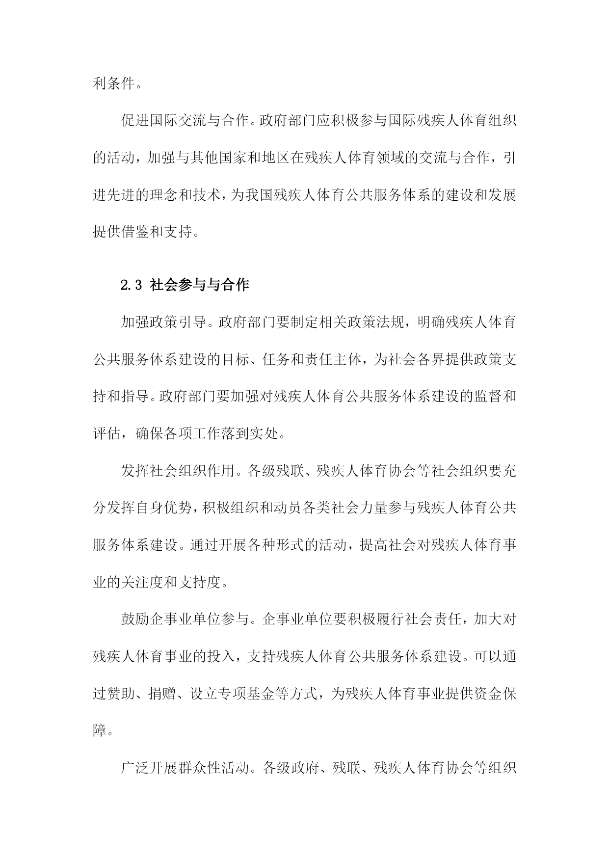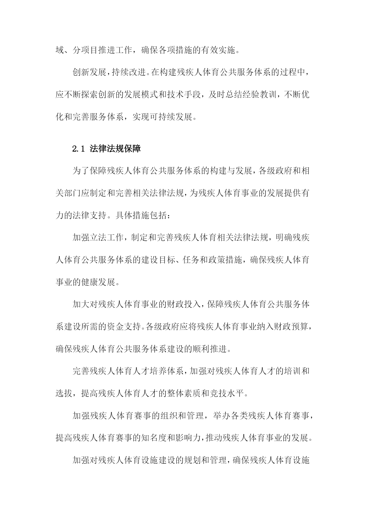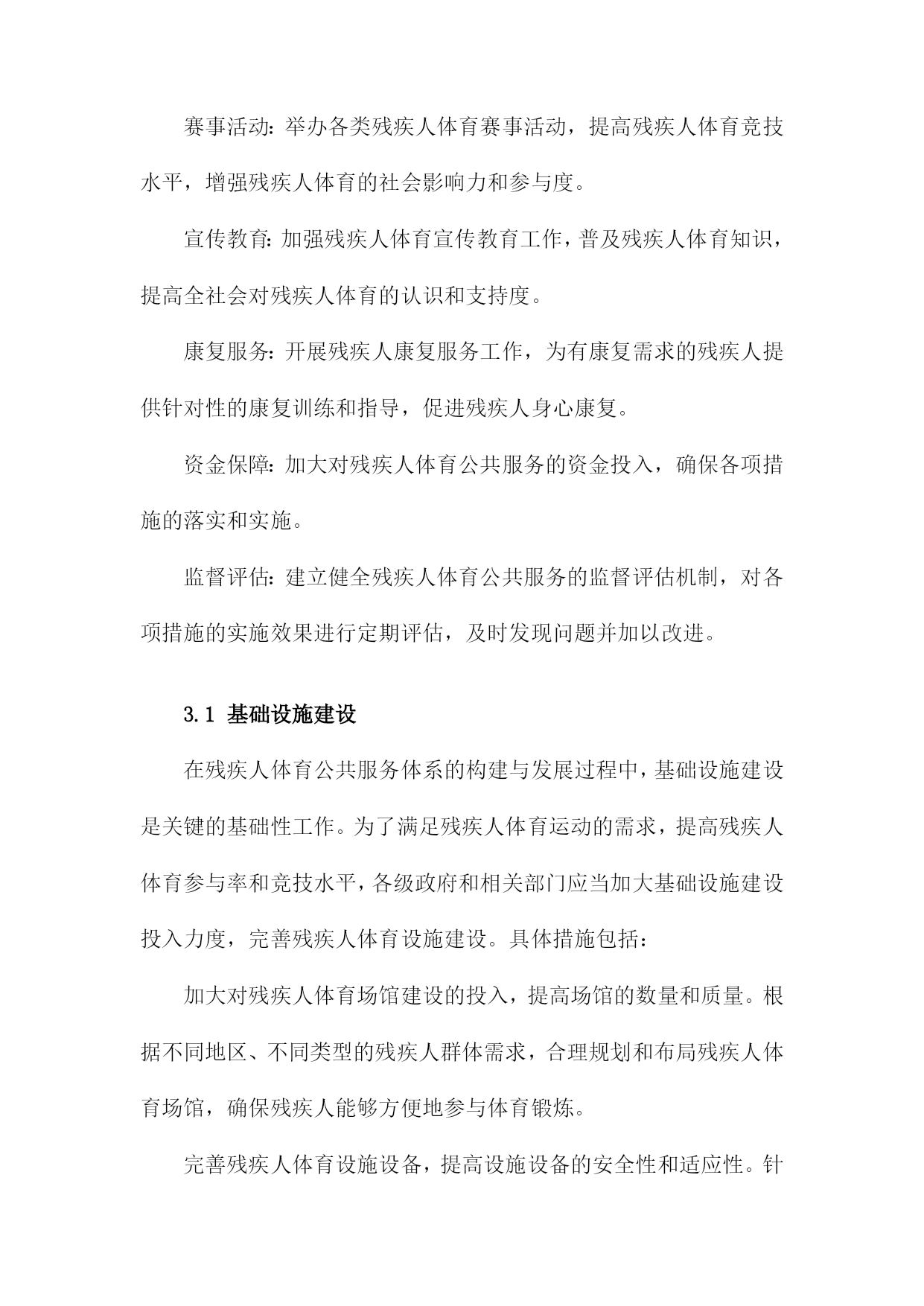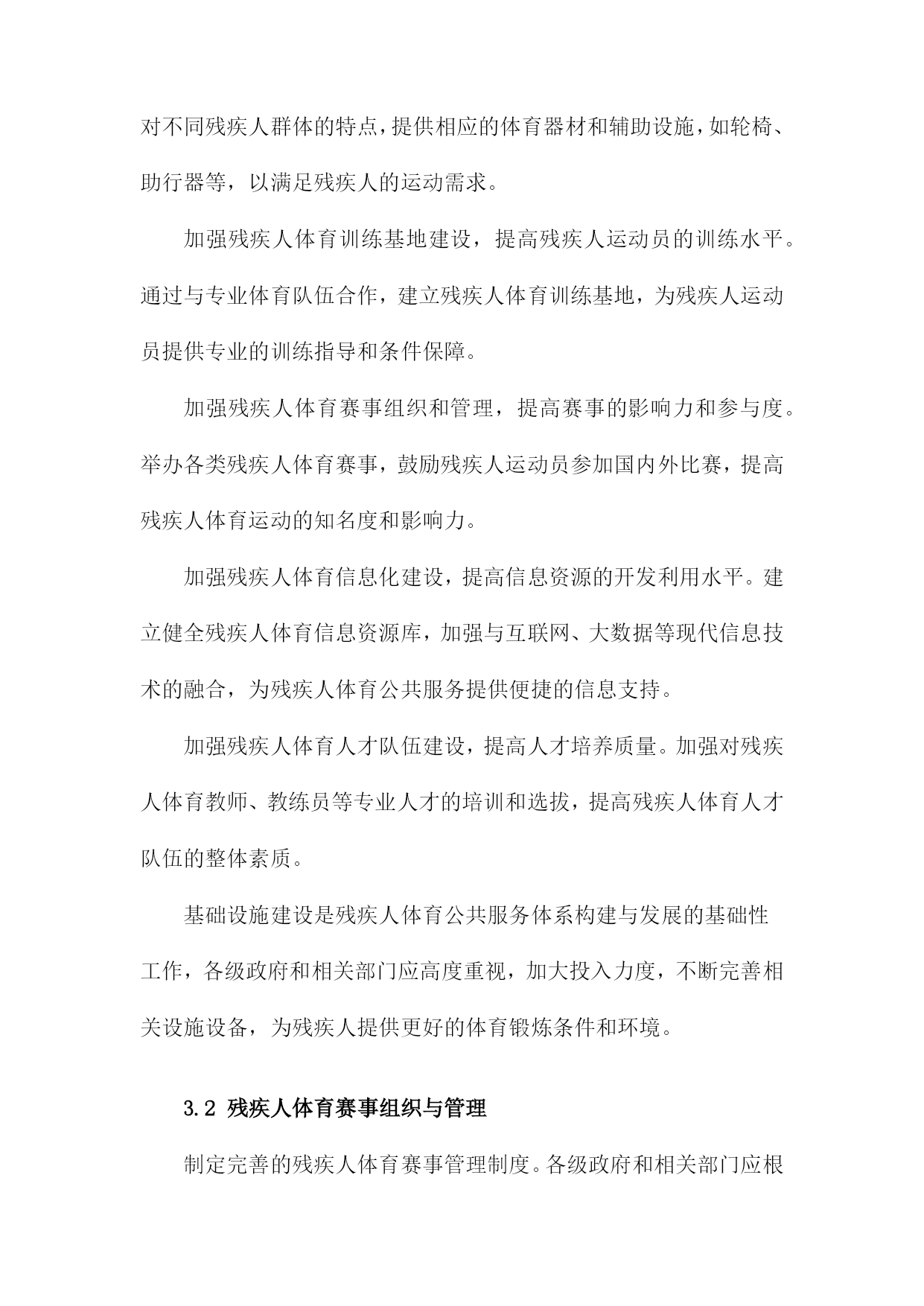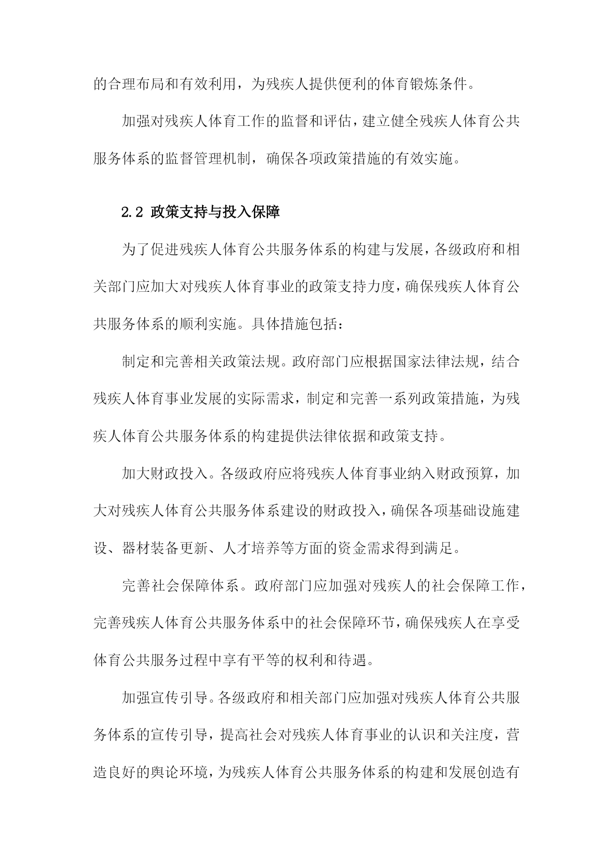 残疾人体育公共服务体系的构建与发展1.残疾人体育公共服务体系概述随着社会的发展和人们生活水平的提高,残疾人体育事业在我国得到了越来越多的关注。为了满足残疾人日益增长的体育需求,提高残疾人身体素质和生活质量,我国政府制定了一系列政策和措施,构建起了一个完善的残疾人体育公共服务体系。政策法规:政府部门制定了一系列关于残疾人体育的政策法规,明确了残疾人体育事业的发展目标、任务和政策措施,为残疾人体育公共服务体系的建设提供了法律依据。组织管理:各级政府成立了专门负责残疾人体育工作的机构,负责统筹协调、指导和管理残疾人体育公共服务工作。还成立了各类残疾人体育协会和社会组织,为残疾人提供专业的体育指导和服务。设施建设:政府投入大量资金,建设了一批残疾人体育场馆、康复训练中心等体育设施,为残疾人提供了良好的体育锻炼场所。还积极推广无障碍设施建设,确保残疾人在公共场所能够方便地参与体育活动。培训教育:通过开展残疾人体育培训班、技能竞赛等形式,提高残疾人的体育技能水平。还加强残疾人体育知识的普及宣传,提高全社会对残疾人体育的认识和支持。竞技比赛:举办各类残疾人体育比赛和选拔性运动会,选拔优秀运动员参加国内外重大赛事,展示残疾人体育风采,提升国家形象。康复服务:针对不同类型的残疾人,开展个性化的康复训练和治疗服务,帮助残疾人恢复或提高身体功能,改善生活质量。社会保障:完善残疾人体育公共服务体系的社会保障机制,确保残疾人享有平等的体育权益,促进社会公平正义。残疾人体育公共服务体系的建设和发展是我国政府和社会共同努力的重要任务。通过不断完善政策法规、加强组织管理、提升设施水平、加大培训力度、举办竞技比赛、提供康复服务等多方面的工作,努力实现残疾人全面参与体育、共享体育成果的目标。1.1残疾人体育公共服务体系的概念残疾人体育公共服务体系是指在国家法律法规和政策的指导下,通过政府、社会、企事业单位等多方共同参与,为残疾人提供体育健身、竞技比赛、康复治疗等服务的一系列设施、组织、活动和服务。这一体系旨在保障残疾人的基本权益,提高残疾人的身心健康水平,促进残疾人全面参与社会生活,实现全面发展和共同富裕。残疾人体育公共服务体系的建设和发展是一个系统工程,涉及多个领域和层面。政府部门要制定和完善相关法律法规,明确残疾人体育公共服务体系的目标、任务和政策措施。社会力量要积极参与,包括企事业单位、社会团体、志愿者等,共同推动残疾人体育公共服务体系的建设和发展。还需要加强残疾人体育人才培养、科研创新、国际交流等方面的工作,提高残疾人体育公共服务体系的整体水平。残疾人体育公共服务体系的构建与发展是一项重要的社会责任和民生工程,关系到残疾人的福祉和社会的和谐稳定。各级政府和社会各方要高度重视,为残疾人创造更加美好的生活环境。1.2残疾人体育公共服务体系的重要性促进社会公平正义:通过完善残疾人体育公共服务体系,提高残疾人参与体育运动的机会和能力,使他们能够充分发挥自身潜能,实现个人价值,从而促进社会公平正义的实现。提高全民健康水平:残疾人体育公共服务体系的建设有助于提高全民健康水平,增强国民体质,降低疾病发生率,减轻医疗负担,为全面建设健康中国提供有力支撑。增进民族团结:通过残疾人体育公共服务体系的建设,加强残疾人与非残疾人之间的交流与合作,增进相互了解,促进民族团结,共同维护社会和谐稳定。提升国家形象:残疾人体育公共服务体系的建设有助于展示我国对残疾人的关爱与支持,提升国家形象,树立国际社会的良好口碑。推动经济发展:残疾人体育产业的发展可以带动相关产业链的发展,创造就业岗位,促进经济增长,为实现全面建设社会主义现代化国家的目标提供动力。构建和发展残疾人体育公共服务体系具有重要的现实意义和深远的历史意义,是全面建设社会主义现代化国家、全面建设社会主义现代化强国的重要任务。2.残疾人体育公共服务体系的构建原则坚持以人为本,关注残疾人需求。在构建残疾人体育公共服务体系时,应充分考虑残疾人的特殊需求和实际情况,以满足他们在体育锻炼、康复、娱乐等方面的需求,提高残疾人的生活质量和社会参与度。政府主导,社会参与。政府部门应发挥主导作用,加强对残疾人体育公共服务体系建设的组织和管理;同时,鼓励社会各界积极参与,形成政府、企事业单位、社会团体和个人共同参与的多元化发展格局。公平公正,普惠共享。在构建残疾人体育公共服务体系时,应确保残疾人享有平等的权利和机会,消除各种形式的歧视和不公,实现普惠共享的目标。科学规划,系统推进。在构建残疾人体育公共服务体系时,应根据国家和地区的实际情况,制定科学合理的规划方案,分阶段、分领域、分项目推进工作,确保各项措施的有效实施。创新发展,持续改进。在构建残疾人体育公共服务体系的过程中,应不断探索创新的发
