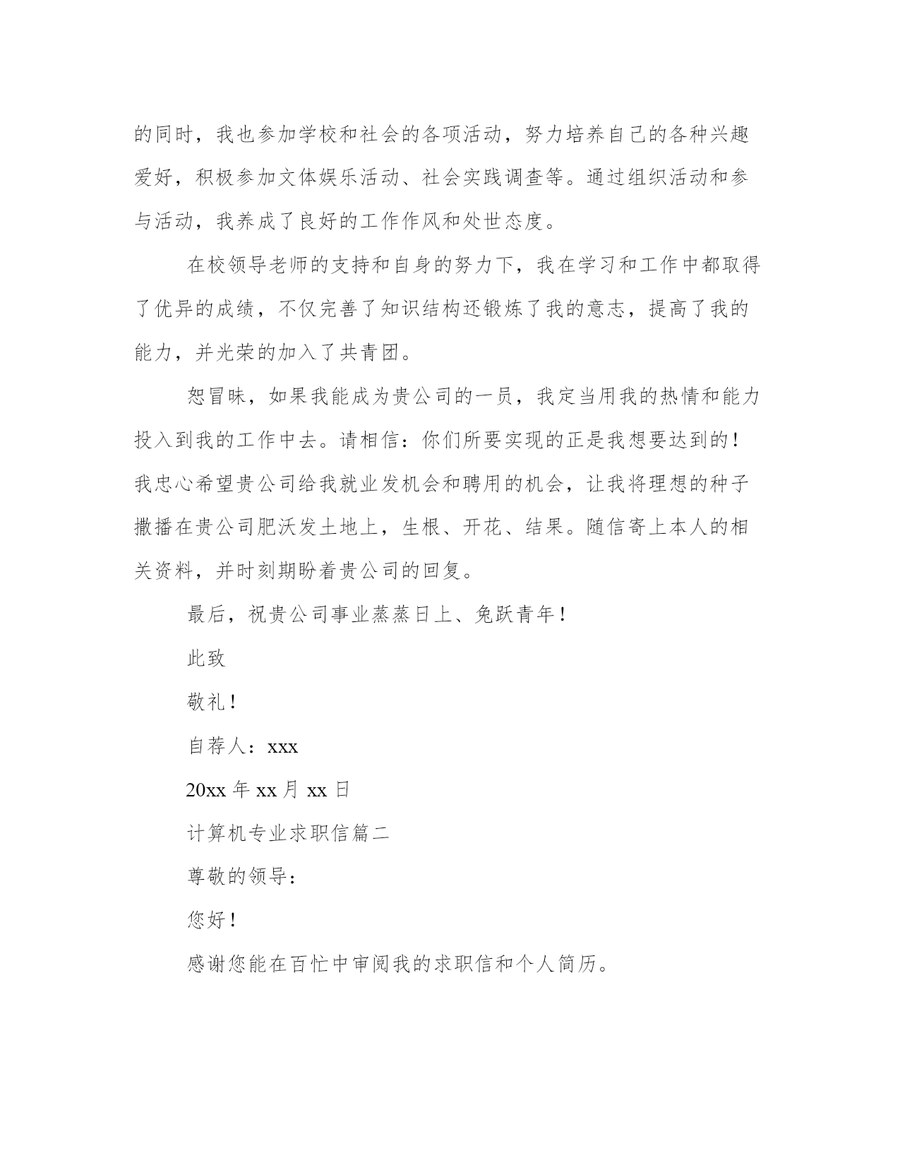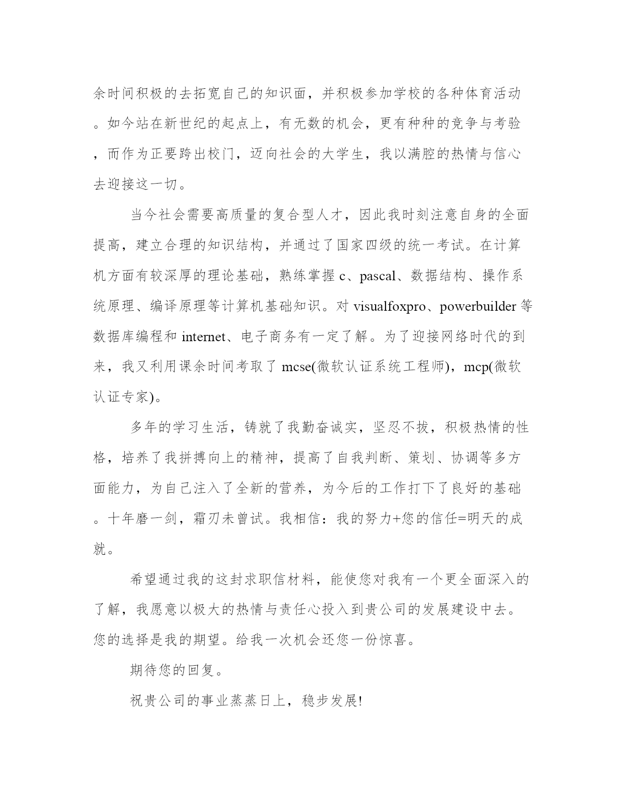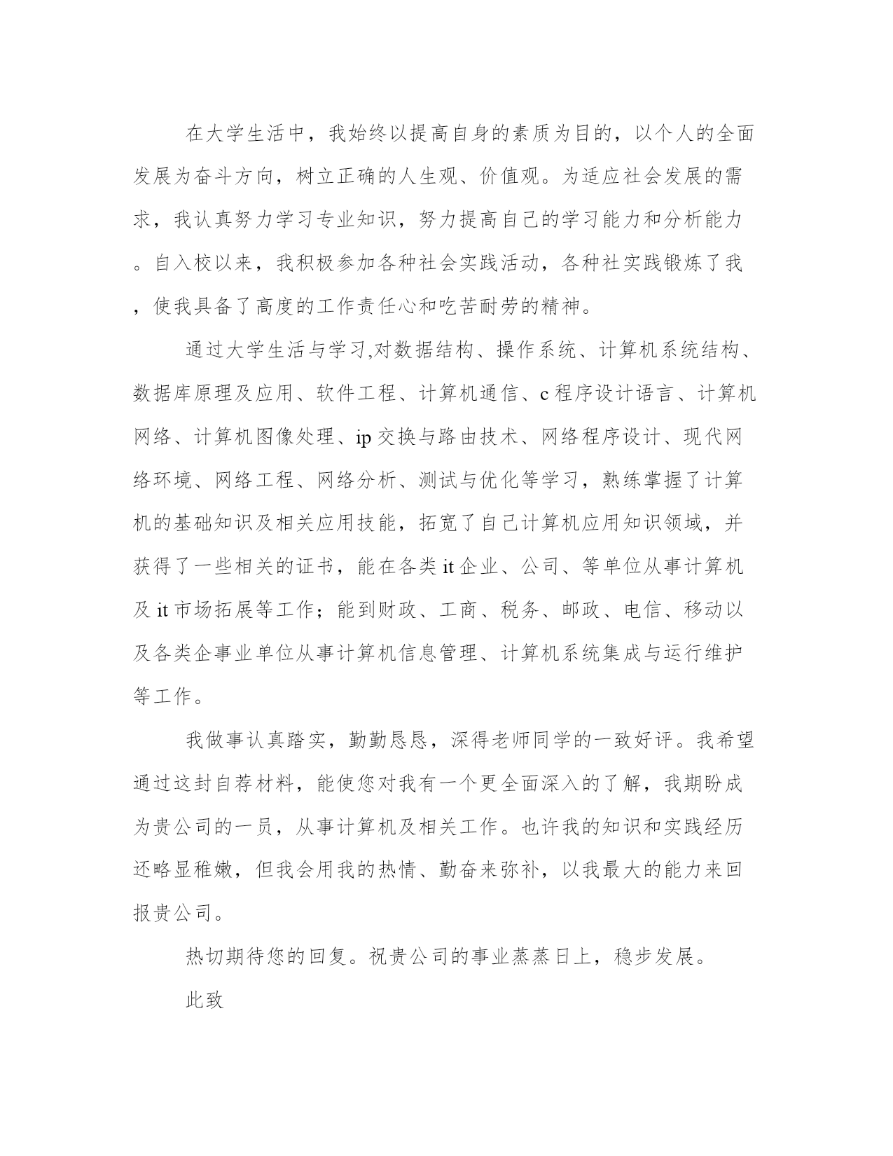 计算机专业求职信(通用12篇)总结是一个人不断进步的飞跃点,也是未来规划的引导。写总结时,要简明扼要,言之有物却不繁琐冗长。在此,我想分享一些关于这个话题的调查结果和数据。计算机专业求职信篇一尊敬的领导:您好!首先,感谢您在百忙之中抽出时间来翻阅我的求职信。我叫唐胜回,是国家重点职业中专,即安化县职业中专xx年中,我学习了本专业及相关专业的理论知识,并以优异的成绩完成了相关的课程,为以后的实践工作打下了坚实的专业基础。同时,我注重外语的学习,具有良好的英语听、说、读、写能力,并拥有了英语二级合格等级证书。在科技迅猛发展的今天,我紧跟科技发展的步伐,不断汲取新知识,熟练掌握了计算机的基本理论和应用技术,并顺利通过了国家计算机应用过级考试,拥有了计算机应用等级证书。且还拥有普通话二乙等级证书,现在我正在为了通过国家一乙在努力。二年来,我一直担任学生工作,致力于学生的自我管理和组织学生活动,曾先后担任校学生会女生部干部,女生部副部长、校学生会副主席等职务。并被评为“优秀学生会干部”三次。二年的学生工作培养了我的团队协助精神,提高了我的组织协调能力。在组织学生活动的同时,我也参加学校和社会的各项活动,努力培养自己的各种兴趣爱好,积极参加文体娱乐活动、社会实践调查等。通过组织活动和参与活动,我养成了良好的工作作风和处世态度。在校领导老师的支持和自身的努力下,我在学习和工作中都取得了优异的成绩,不仅完善了知识结构还锻炼了我的意志,提高了我的能力,并光荣的加入了共青团。恕冒昧,如果我能成为贵公司的一员,我定当用我的热情和能力投入到我的工作中去。请相信:你们所要实现的正是我想要达到的!我忠心希望贵公司给我就业发机会和聘用的机会,让我将理想的种子撒播在贵公司肥沃发土地上,生根、开花、结果。随信寄上本人的相关资料,并时刻期盼着贵公司的回复。最后,祝贵公司事业蒸蒸日上、兔跃青年!此致敬礼!自荐人:xxx20xx年xx月xx日计算机专业求职信篇二尊敬的领导:您好!感谢您能在百忙中审阅我的求职信和个人简历。我系xx学院20xx应届本科毕业生,所学专业为通信工程和计算机网络信息类的信息工程专业。面临择业,我满怀憧憬和期待:步入通信系统和计算机应用部门一直是我的梦想!在xx学院将近四年的专业学习和生活经历砺炼了我为实现梦想打下了坚实基础。现在我坦诚的向贵单位作自我推荐,并将我的简历材料呈上,敬请审阅!我毕业于一所年轻的学校,十六载寒窗苦读造就了自强不息的我。大学四年学习和生活短暂而充实,一千来个日日夜夜,我荡起智慧之舟,迎朝阳,送落霞,遨游于知识的海洋。我明白:现代社会,机遇与挑战并存;我懂得:只有不懈的努力才会有好的收获。正是凭着这种信念,我以乐观向上的进取精神,刻苦勤奋的学习态度,踏实肯干的工作作风,团队合作的处世原则,开拓进取,开拓创新,超越自我,力争成为一名博学求实和勤奋活跃的复合型人才!大学生活是我人生中最重要的一个阶段,是我探索人生,实践真理,发挥智慧,走向更加成熟的过程。在这期间我除了学习课本上的专业理论知识,还走出校门,来到社会的大舞台参加各种社会实践和实习,使我真正懂得了人生的意义,人生的价值。为以后的全职工作打下了坚实基础。我能够从事通信系统基站(机房)终端维护、通信线路传输、程控交换设备维护、计算机软硬件开发、计算机网络应用和计算机辅助设计等相关工作。我不仅有扎实的理论基础,而且有一定的实际操作能力以及吃苦耐劳团队协作精神。出生农民家庭,使我具备了勤奋、吃苦、务实、向上的精神和作风。农村生活铸就了我淳朴、诚实、善良的性格,培养了我不怕困苦挫折,顽强拼搏的奋斗精神。回首过去,是我勇于探索勤于求学的知识蕴积之路;展望未来,将是我乐于奉献于贵单位的事业开拓之途!“良禽择本而栖,贤臣择主而事”。尊敬的领导,雄鹰展翅急需一方天空,良马驰骋尚待一方路径。我仰慕已久贵单位所开创的业绩和远大的发展前景,深信我会用自己勤勉的汗水与同仁一道为贵公司的锦绣前程奋斗不息,奉献我的才智和热忱,我真诚期望成为其中一员。相信您的信任加我的实力将会为我们带来共同的成功!蒙阁下抽暇一顾次函,不胜感激!谨祝工作顺利!此致敬礼!姓名:x年x月x日。计算机专业求职信篇三尊敬的贵公司领导:您好!真诚地感谢您能够在百忙之中浏览这份求职材料。很荣幸有机会向您呈上我的个人资料.在此谨向各位领导作一自我推荐.现将自己的情况简要介绍如下:。我是*******学院的一名在校大学生,我所学的专业是计算机网络技术。在大学生活中,我始终以提高自身的素质为目的,以个人的全面发展为奋斗方向,树立正确的人生观、价值观。为适应社会发展的需求,我认真努力学习专业知识,努力提高自己的学习能力和分析能力。自入校以来,我积极参加各种社会实践活动,