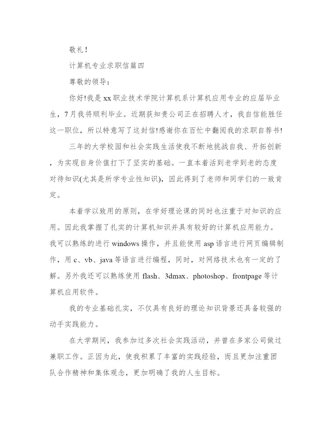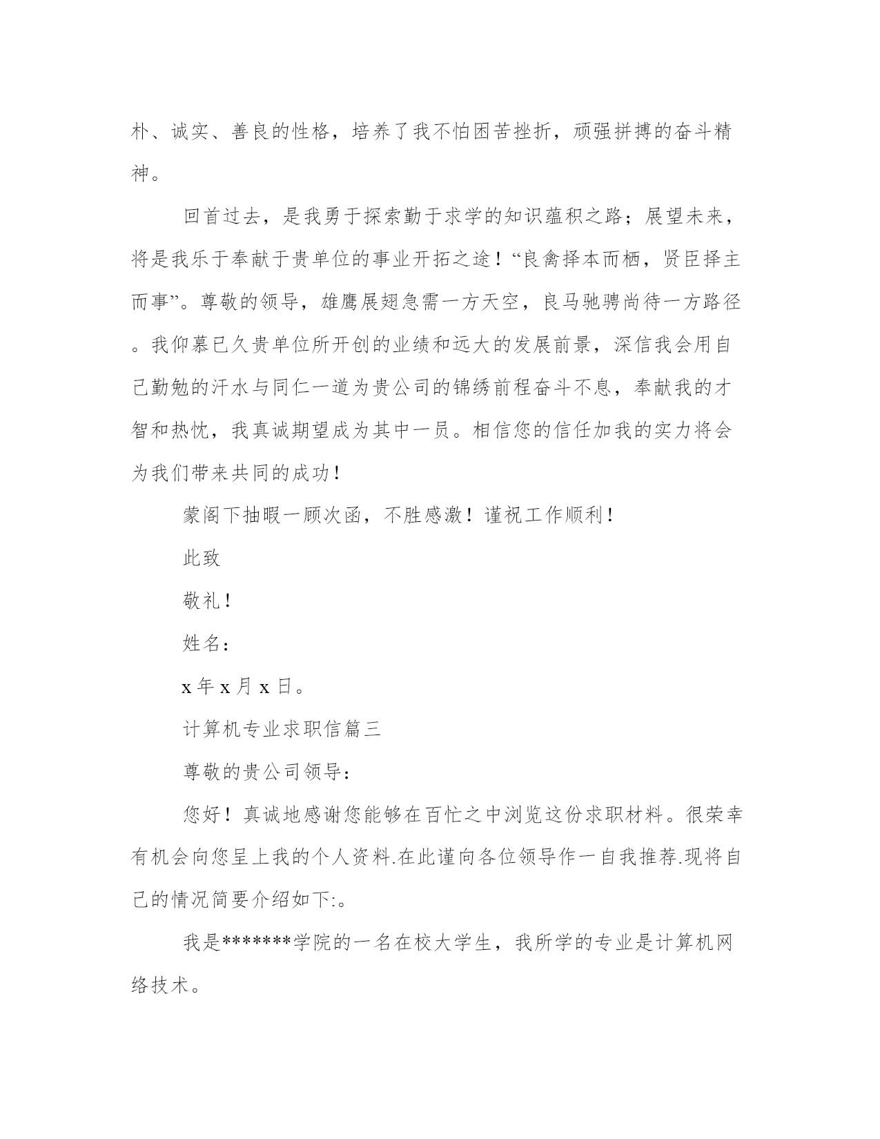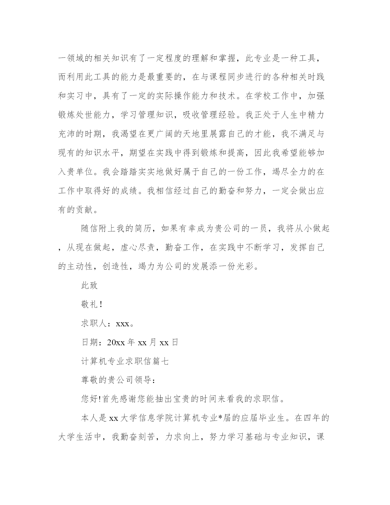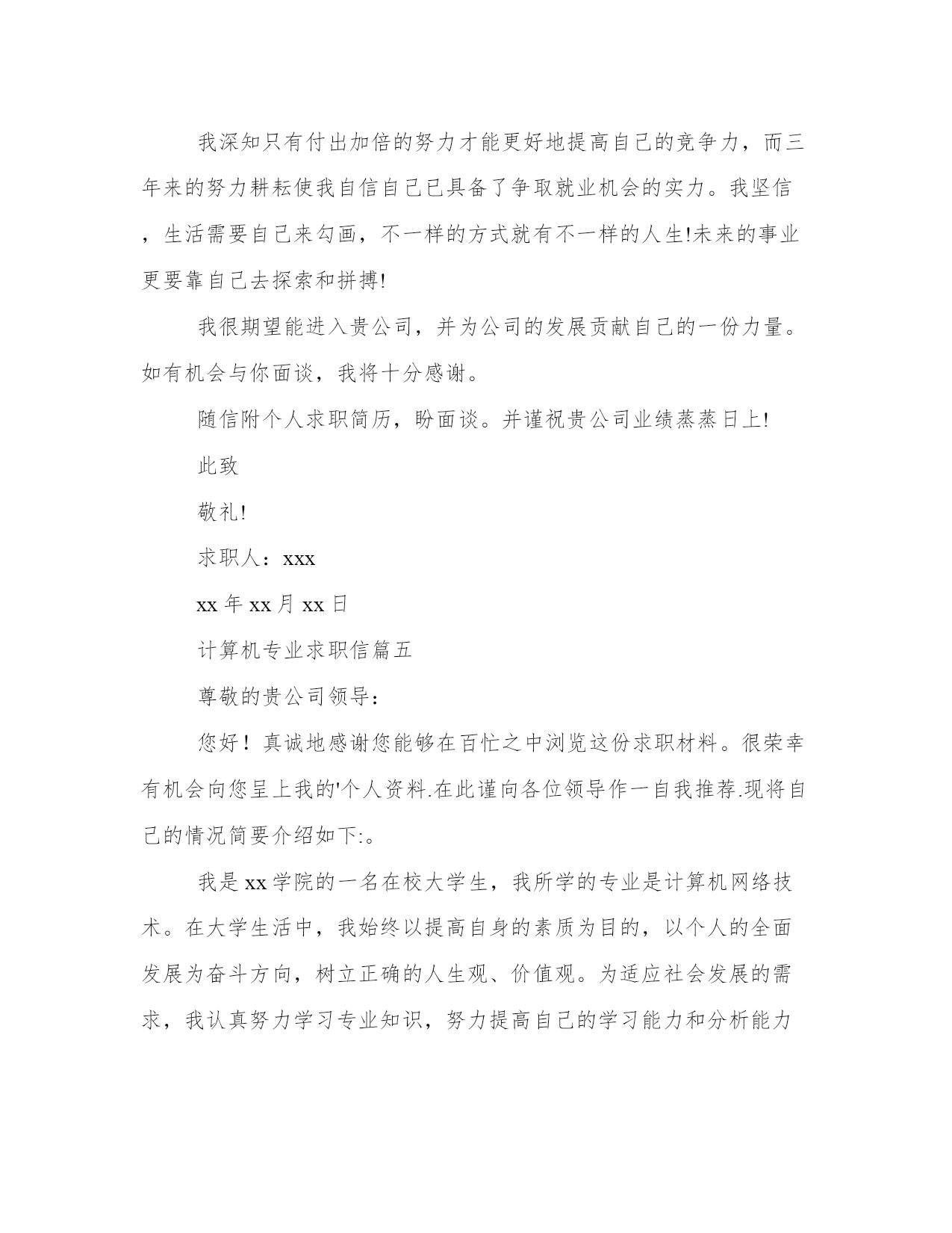 计算机专业求职信(通用12篇)总结是一个人不断进步的飞跃点,也是未来规划的引导。写总结时,要简明扼要,言之有物却不繁琐冗长。在此,我想分享一些关于这个话题的调查结果和数据。计算机专业求职信篇一尊敬的领导:您好!首先,感谢您在百忙之中抽出时间来翻阅我的求职信。我叫唐胜回,是国家重点职业中专,即安化县职业中专xx年中,我学习了本专业及相关专业的理论知识,并以优异的成绩完成了相关的课程,为以后的实践工作打下了坚实的专业基础。同时,我注重外语的学习,具有良好的英语听、说、读、写能力,并拥有了英语二级合格等级证书。在科技迅猛发展的今天,我紧跟科技发展的步伐,不断汲取新知识,熟练掌握了计算机的基本理论和应用技术,并顺利通过了国家计算机应用过级考试,拥有了计算机应用等级证书。且还拥有普通话二乙等级证书,现在我正在为了通过国家一乙在努力。二年来,我一直担任学生工作,致力于学生的自我管理和组织学生活动,曾先后担任校学生会女生部干部,女生部副部长、校学生会副主席等职务。并被评为“优秀学生会干部”三次。二年的学生工作培养了我的团队协助精神,提高了我的组织协调能力。在组织学生活动的同时,我也参加学校和社会的各项活动,努力培养自己的各种兴趣爱好,积极参加文体娱乐活动、社会实践调查等。通过组织活动和参与活动,我养成了良好的工作作风和处世态度。在校领导老师的支持和自身的努力下,我在学习和工作中都取得了优异的成绩,不仅完善了知识结构还锻炼了我的意志,提高了我的能力,并光荣的加入了共青团。恕冒昧,如果我能成为贵公司的一员,我定当用我的热情和能力投入到我的工作中去。请相信:你们所要实现的正是我想要达到的!我忠心希望贵公司给我就业发机会和聘用的机会,让我将理想的种子撒播在贵公司肥沃发土地上,生根、开花、结果。随信寄上本人的相关资料,并时刻期盼着贵公司的回复。最后,祝贵公司事业蒸蒸日上、兔跃青年!此致敬礼!自荐人:xxx20xx年xx月xx日计算机专业求职信篇二尊敬的领导:您好!感谢您能在百忙中审阅我的求职信和个人简历。我系xx学院20xx应届本科毕业生,所学专业为通信工程和计算机网络信息类的信息工程专业。面临择业,我满怀憧憬和期待:步入通信系统和计算机应用部门一直是我的梦想!在xx学院将近四年的专业学习和生活经历砺炼了我为实现梦想打下了坚实基础。现在我坦诚的向贵单位作自我推荐,并将我的简历材料呈上,敬请审阅!我毕业于一所年轻的学校,十六载寒窗苦读造就了自强不息的我。大学四年学习和生活短暂而充实,一千来个日日夜夜,我荡起智慧之舟,迎朝阳,送落霞,遨游于知识的海洋。我明白:现代社会,机遇与挑战并存;我懂得:只有不懈的努力才会有好的收获。正是凭着这种信念,我以乐观向上的进取精神,刻苦勤奋的学习态度,踏实肯干的工作作风,团队合作的处世原则,开拓进取,开拓创新,超越自我,力争成为一名博学求实和勤奋活跃的复合型人才!大学生活是我人生中最重要的一个阶段,是我探索人生,实践真理,发挥智慧,走向更加成熟的过程。在这期间我除了学习课本上的专业理论知识,还走出校门,来到社会的大舞台参加各种社会实践和实习,使我真正懂得了人生的意义,人生的价值。为以后的全职工作打下了坚实基础。我能够从事通信系统基站(机房)终端维护、通信线路传输、程控交换设备维护、计算机软硬件开发、计算机网络应用和计算机辅助设计等相关工作。我不仅有扎实的理论基础,而且有一定的实际操作能力以及吃苦耐劳团队协作精神。出生农民家庭,使我具备了勤奋、吃苦、务实、向上的精神和作风。农村生活铸就了我淳朴、诚实、善良的性格,培养了我不怕困苦挫折,顽强拼搏的奋斗精神。回首过去,是我勇于探索勤于求学的知识蕴积之路;展望未来,将是我乐于奉献于贵单位的事业开拓之途!“良禽择本而栖,贤臣择主而事”。尊敬的领导,雄鹰展翅急需一方天空,良马驰骋尚待一方路径。我仰慕已久贵单位所开创的业绩和远大的发展前景,深信我会用自己勤勉的汗水与同仁一道为贵公司的锦绣前程奋斗不息,奉献我的才智和热忱,我真诚期望成为其中一员。相信您的信任加我的实力将会为我们带来共同的成功!蒙阁下抽暇一顾次函,不胜感激!谨祝工作顺利!此致敬礼!姓名:x年x月x日。计算机专业求职信篇三尊敬的贵公司领导:您好!真诚地感谢您能够在百忙之中浏览这份求职材料。很荣幸有机会向您呈上我的个人资料.在此谨向各位领导作一自我推荐.现将自己的情况简要介绍如下:。我是*******学院的一名在校大学生,我所学的专业是计算机网络技术。在大学生活中,我始终以提高自身的素质为目的,以个人的全面发展为奋斗方向,树立正确的人生观、价值观。为适应社会发展的需求,我认真努力学习专业知识,努力提高自己的学习能力和分析能力。自入校以来,我积极参加各种社会实践活动,