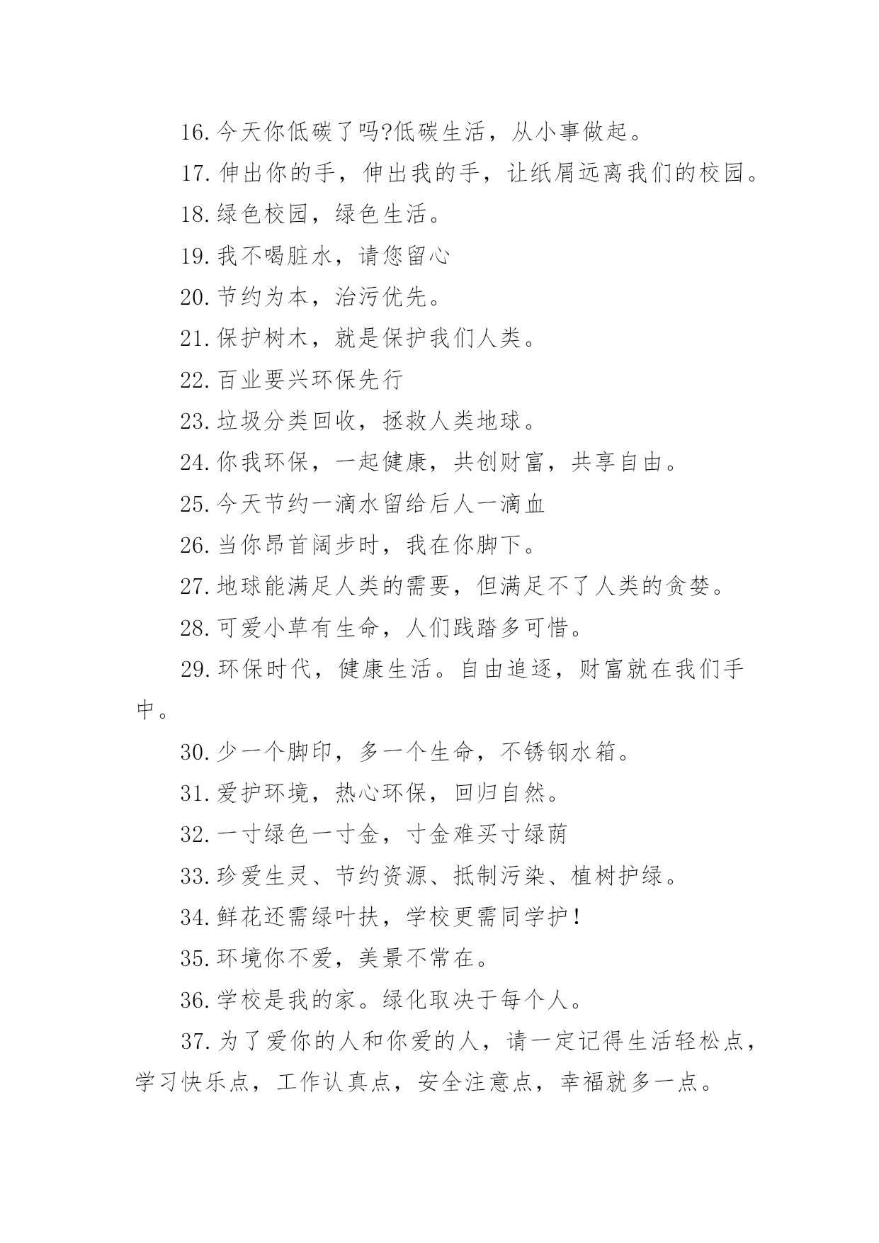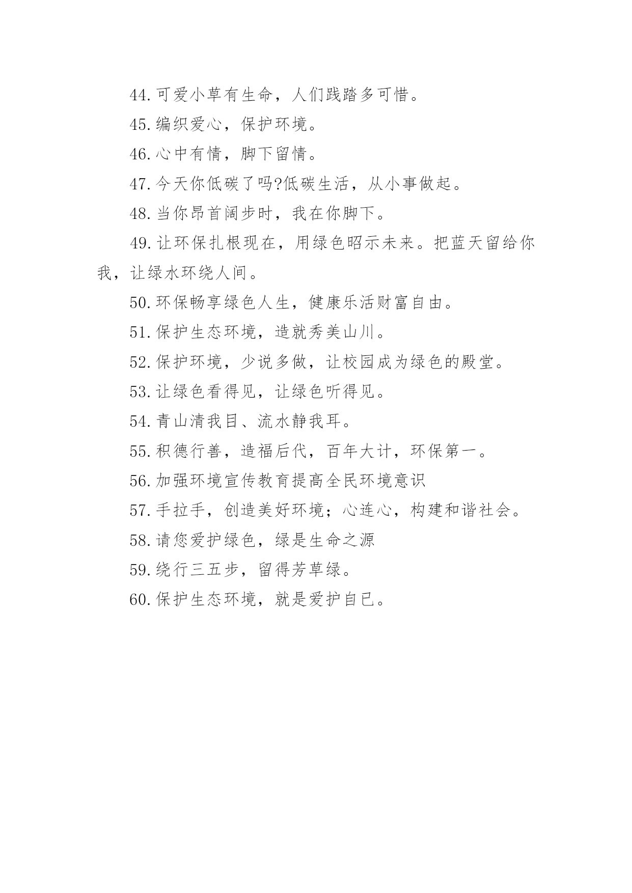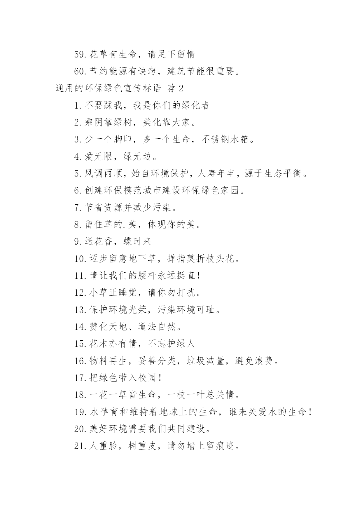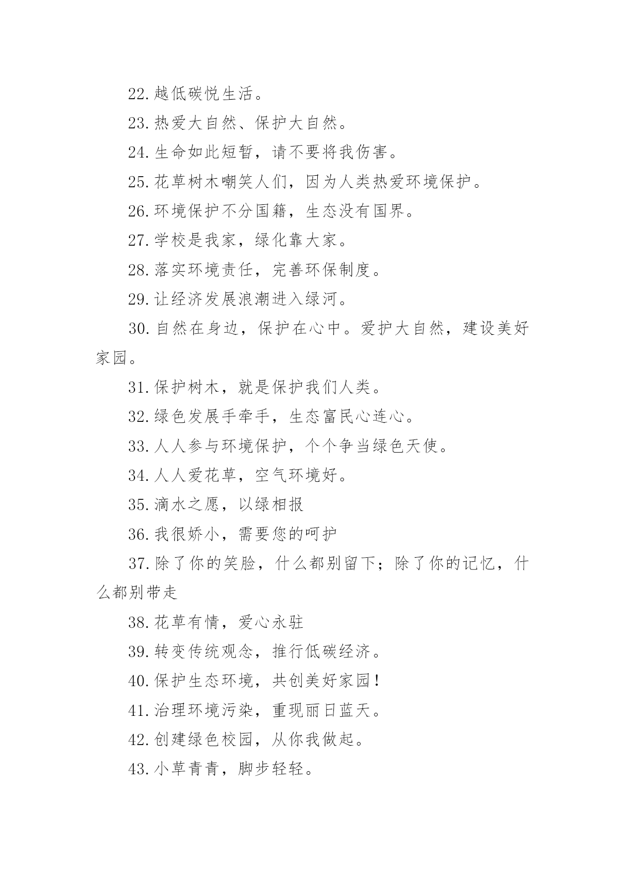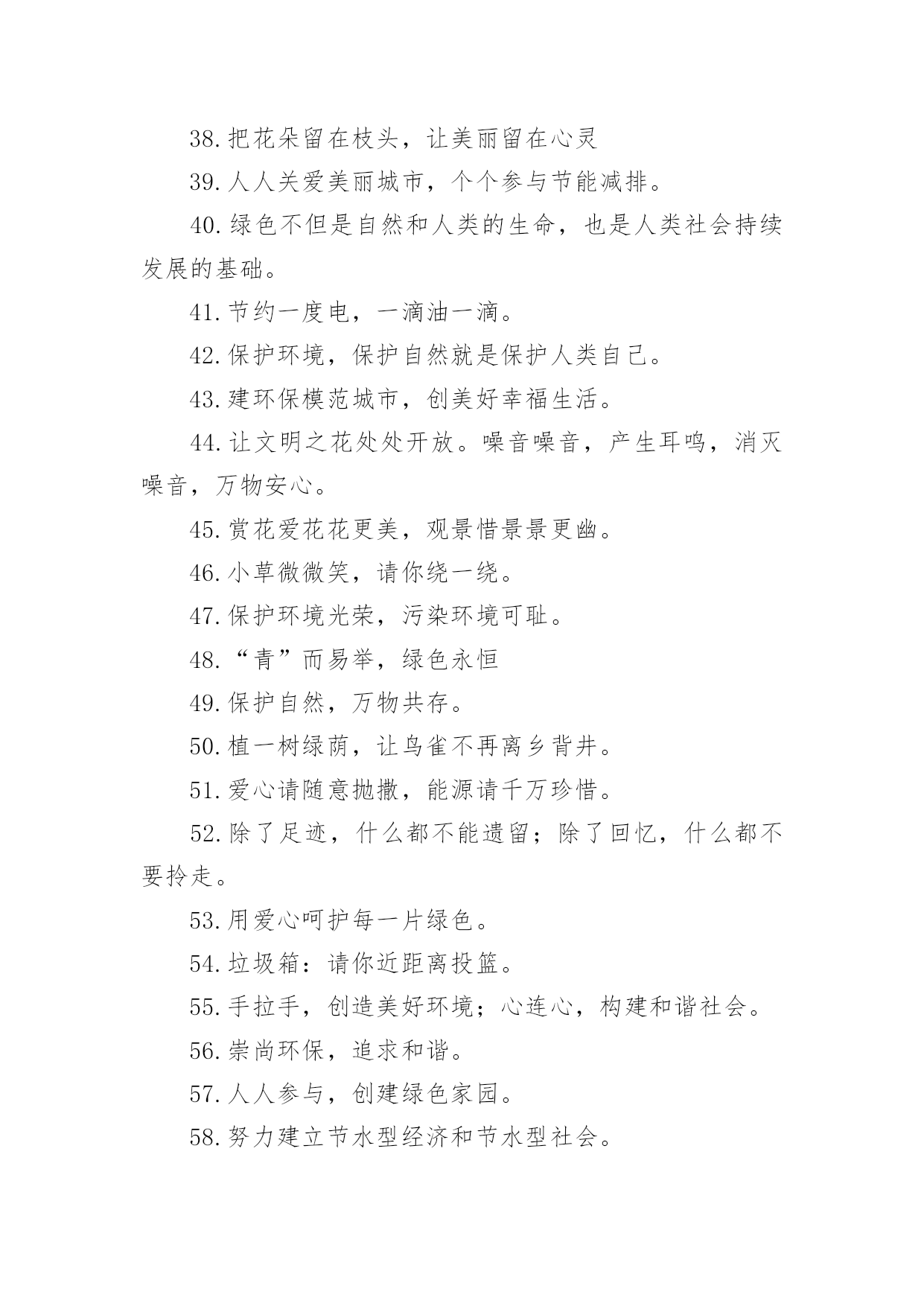的环保绿色宣传标语荐通用的环保绿色宣传标语荐在生活、工作和学习中,大家都接触过比较经典的标语吧,标语起着警示人们的作用。那什么样的标语才具有启发意义呢?下面是小编整理的通用的环保绿色宣传标语荐,仅供参考,大家一起来看看吧。通用的环保绿色宣传标语荐11.生命如此短暂,请不要将我伤害。2.让绿色看得见,让绿色听得见。3.别伤害我,我也歌词健全的身体4.捡起一张纸,创造一个美的环境。5.请您爱护绿色,绿是生命之源6.花草树木嘲笑人们,因为人类热爱环境保护。7.保护蓝天碧水,建我绿色家园。8.幸福生活不只在于丰衣足食,也在于碧水蓝天。9.人造环境,环境育人。10.大路随你走,别踩在我头。11.低碳新时尚,中国是积极的。12.节能做得好,朝朝无烦恼。13.美化生活,净化心灵。14.不要让白色的面纱罩在我绿色的笑颜上。15.美我校园重在每一举动。16.今天你低碳了吗?低碳生活,从小事做起。17.伸出你的手,伸出我的手,让纸屑远离我们的校园。18.绿色校园,绿色生活。19.我不喝脏水,请您留心20.节约为本,治污优先。21.保护树木,就是保护我们人类。22.百业要兴环保先行23.垃圾分类回收,拯救人类地球。24.你我环保,一起健康,共创财富,共享自由。25.今天节约一滴水留给后人一滴血26.当你昂首阔步时,我在你脚下。27.地球能满足人类的需要,但满足不了人类的贪婪。28.可爱小草有生命,人们践踏多可惜。29.环保时代,健康生活。自由追逐,财富就在我们手中。30.少一个脚印,多一个生命,不锈钢水箱。31.爱护环境,热心环保,回归自然。32.一寸绿色一寸金,寸金难买寸绿荫33.珍爱生灵、节约资源、抵制污染、植树护绿。34.鲜花还需绿叶扶,学校更需同学护!35.环境你不爱,美景不常在。36.学校是我的家。绿化取决于每个人。37.为了爱你的人和你爱的人,请一定记得生活轻松点,学习快乐点,工作认真点,安全注意点,幸福就多一点。38.把花朵留在枝头,让美丽留在心灵39.人人关爱美丽城市,个个参与节能减排。40.绿色不但是自然和人类的生命,也是人类社会持续发展的基础。41.节约一度电,一滴油一滴。42.保护环境,保护自然就是保护人类自己。43.建环保模范城市,创美好幸福生活。44.让文明之花处处开放。噪音噪音,产生耳鸣,消灭噪音,万物安心。45.赏花爱花花更美,观景惜景景更幽。46.小草微微笑,请你绕一绕。47.保护环境光荣,污染环境可耻。48.“青”而易举,绿色永恒49.保护自然,万物共存。50.植一树绿荫,让鸟雀不再离乡背井。51.爱心请随意抛撒,能源请千万珍惜。52.除了足迹,什么都不能遗留;除了回忆,什么都不要拎走。53.用爱心呵护每一片绿色。54.垃圾箱:请你近距离投篮。55.手拉手,创造美好环境;心连心,构建和谐社会。56.崇尚环保,追求和谐。57.人人参与,创建绿色家园。58.努力建立节水型经济和节水型社会。59.花草有生命,请足下留情60.节约能源有诀窍,建筑节能很重要。通用的环保绿色宣传标语荐21.不要踩我,我是你们的绿化者2.乘阴靠绿树,美化靠大家。3.少一个脚印,多一个生命,不锈钢水箱。4.爱无限,绿无边。5.风调雨顺,始自环境保护,人寿年丰,源于生态平衡。6.创建环保模范城市建设环保绿色家园。7.节省资源并减少污染。8.留住草的.美,体现你的美。9.送花香,蝶时来10.迈步留意地下草,掸指莫折枝头花。11.请让我们的腰杆永远挺直!12.小草正睡觉,请你勿打扰。13.保护环境光荣,污染环境可耻。14.赞化天地、道法自然。15.花木亦有情,不忘护绿人16.物料再生,妥善分类,垃圾减量,避免浪费。17.把绿色带入校园!18.一花一草皆生命,一枝一叶总关情。19.水孕育和维持着地球上的生命,谁来关爱水的生命!20.美好环境需要我们共同建设。21.人重脸,树重皮,请勿墙上留痕迹。22.越低碳悦生活。23.热爱大自然、保护大自然。24.生命如此短暂,请不要将我伤害。25.花草树木嘲笑人们,因为人类热爱环境保护。26.环境保护不分国籍,生态没有国界。27.学校是我家,绿化靠大家。28.落实环境责任,完善环保制度。29.让经济发展浪潮进入绿河。30.自然在身边,保护在心中。爱护大自然,建设美好家园。31.保护树木,就是保护我们人类。32.绿色发展手牵手,生态富民心连心。33.人人参与环境保护,个个争当绿色天使。34.人人爱花草,空气环境好。35.滴水之愿,以绿相报36.我很娇小,需要您的呵护37.除了你的笑脸,什么都别留下;除了你的记忆,什么都别带走38.花草有情,爱心永驻39.转变传统观念,推行低碳经济。40.保护生态环境,共创美好家园!41.治理环境污染,重现丽日蓝天。42.创建绿色校园,从你我做起。43.小草青青,脚步轻轻。44.可爱