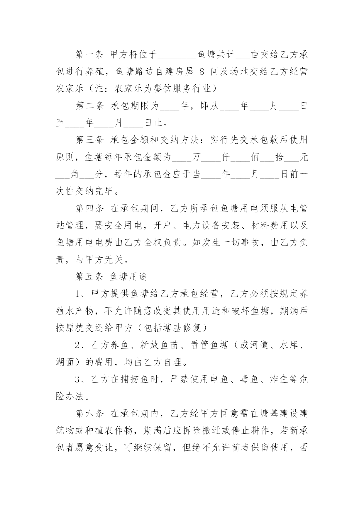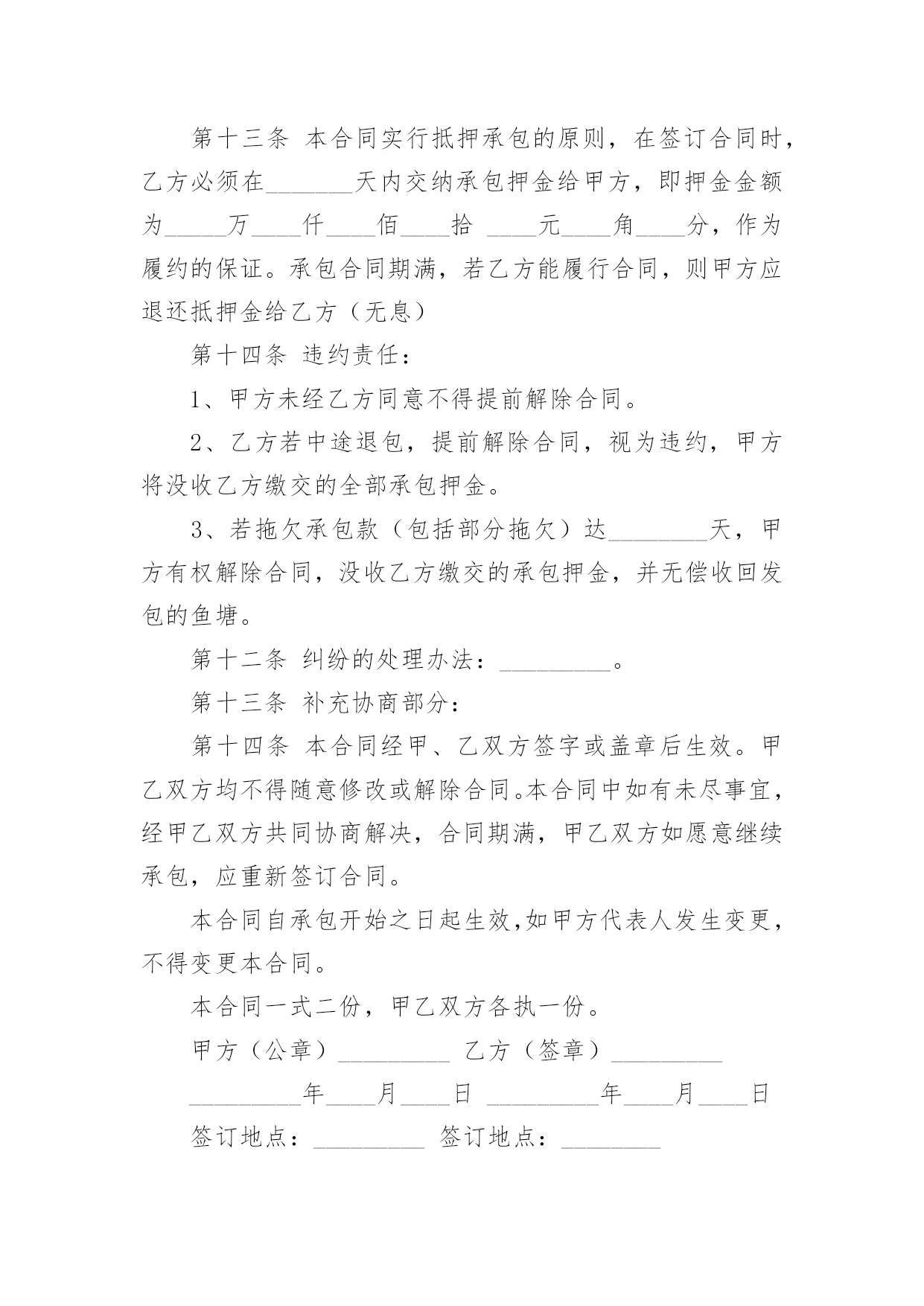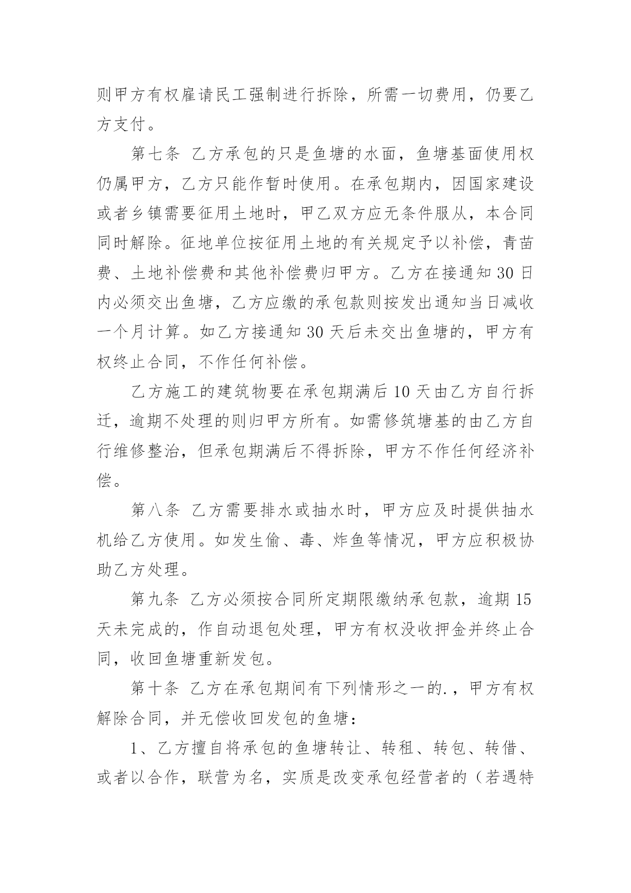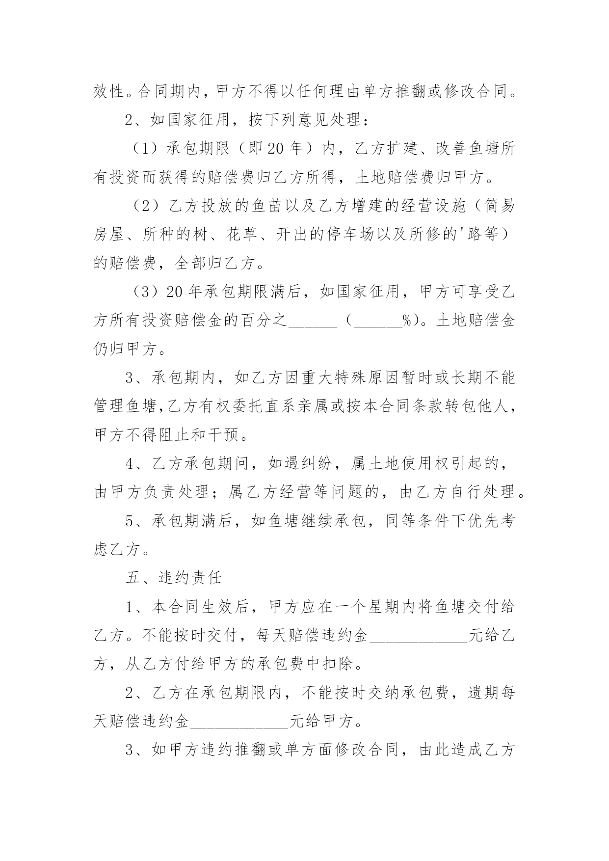 鱼塘承包经营合同鱼塘承包经营合同范本(精选8篇)随着法律法规不断完善,人们越发重视合同,能够利用到合同的场合越来越多,它可以保护民事法律关系。那么大家知道正规的合同书怎么写吗?下面是小编收集整理的鱼塘承包经营合同范本(精选8篇),仅供参考,欢迎大家阅读。鱼塘承包经营合同1甲方(发包方):___________现住址:___________乙方(承包方):___________现住址:___________因乙方的生产需要,为了更加提高经济效益,故需充分利用水资源,现就甲方自行所有的一口鱼塘,经甲乙双方认真协商订立本合同书,以供双方共同遵守。一、甲方发包的鱼塘座落及面积:该塘座落于:___________,面积约___________亩。二、承包期限:本协议承包期限为年,即从20__年__月__日起到20__年__月__日止。三、承包金额和付款方式:1、合同的`总金额为:___________元。2、付款方式为:A、20__年__月__日付款___________元(第一次付款)。B、20__年__月__日前付款___________元(第二次付款)。四、承包期间,鱼塘边不能栽种树木。五、在承包期间,其塘塍、便的管理由乙方负责。如遇不可抗拒的自然灾害(地震、特大洪涝等)造成该鱼塍、便倒塌,修复由甲方负责,甲方因修复鱼塘便耽误乙方使用,如不减乙方当年承包金,其合同期限顺延一年。六、在承包期间,塘内的蓄水由乙方负责管理,用水甲方负责安排,其塘内的最高水位以本塘常年平水缺为限,最低水位以塘中心60公分内。七、乙方需要排水、抽水时,如发现水质有毒、污染物等情况,甲方应积极协助乙方处理。八、承包期间,乙方不得随意改变该鱼塘的使用性质,不准建永久性建筑物。否则,在承包期满,将自动拆除。九、承包期间,乙方不得随意转租他人。十、本合同自承包开始之日起生效,甲乙双方均不得修改或解除本协议。如甲方代表发生变更,不得变更本合同。本合同如有未尽事宜,经甲乙双方共同协商,作出补充规定。补充规定同本合同具有同等法律效力。合同期满,在同等条件下,乙方有优先权。如甲乙双方双方愿意继续承包,应重新签订合同。本合同一式两份,甲乙双方各执一份(合同副本一式份,各存一份。甲方(发包方):___________乙方(承包方):___________代表:___________代表:___________日期__年__月__日日期:__年__月__日鱼塘承包经营合同2发包方(简称甲方):______________________________承包方(简称乙方):______________________________为搞活经济,充分提高资源的利用率,甲乙双方就承包鱼塘事项经协商一致,达成以下协议,共同遵守。一、承包项目甲方提供________________________,由乙方承包。鱼塘范围:______________________________。二、承包期限从____________年________月________日起至____________年________月________日止,共______年。三、乙方支付承包费用事项1、第一年,即____________年由乙方一次性付给甲方叁仟元,甲方作为补偿费付给原承包人;第二年、第三年,鉴于处于建塘阶段,乙方只付给甲方承包费每年伍佰元。从第四年即____________年起,乙方每年向甲方交纳承包费贰仟伍佰元整。2、付款时间:每年______月______日作为付款时间。四、特殊情况的处理1、承包期间,如甲方法人更换,不得影响此合同的有效性。合同期内,甲方不得以任何理由单方推翻或修改合同。2、如国家征用,按下列意见处理:(1)承包期限(即20年)内,乙方扩建、改善鱼塘所有投资而获得的赔偿费归乙方所得,土地赔偿费归甲方。(2)乙方投放的鱼苗以及乙方增建的经营设施(简易房屋、所种的树、花草、开出的停车场以及所修的'路等)的赔偿费,全部归乙方。(3)20年承包期限满后,如国家征用,甲方可享受乙方所有投资赔偿金的百分之______(______%)。土地赔偿金仍归甲方。3、承包期内,如乙方因重大特殊原因暂时或长期不能管理鱼塘,乙方有权委托直系亲属或按本合同条款转包他人,甲方不得阻止和干预。4、乙方承包期问,如遇纠纷,属土地使用权引起的,由甲方负责处理;属乙方经营等问题的,由乙方自行处理。5、承包期满后,如鱼塘继续承包,同等条件下优先考虑乙方。五、违约责任1、本合同生效后,甲方应在一个星期内将鱼塘交付给乙方。不能按时交付,每天赔偿违约金____________元给乙方,从乙方付给甲方的承包费中扣除。2、乙方在承包期限内,不能按时交纳承包费,遗期每天赔偿违约金____________元给甲方。3、如甲方违约