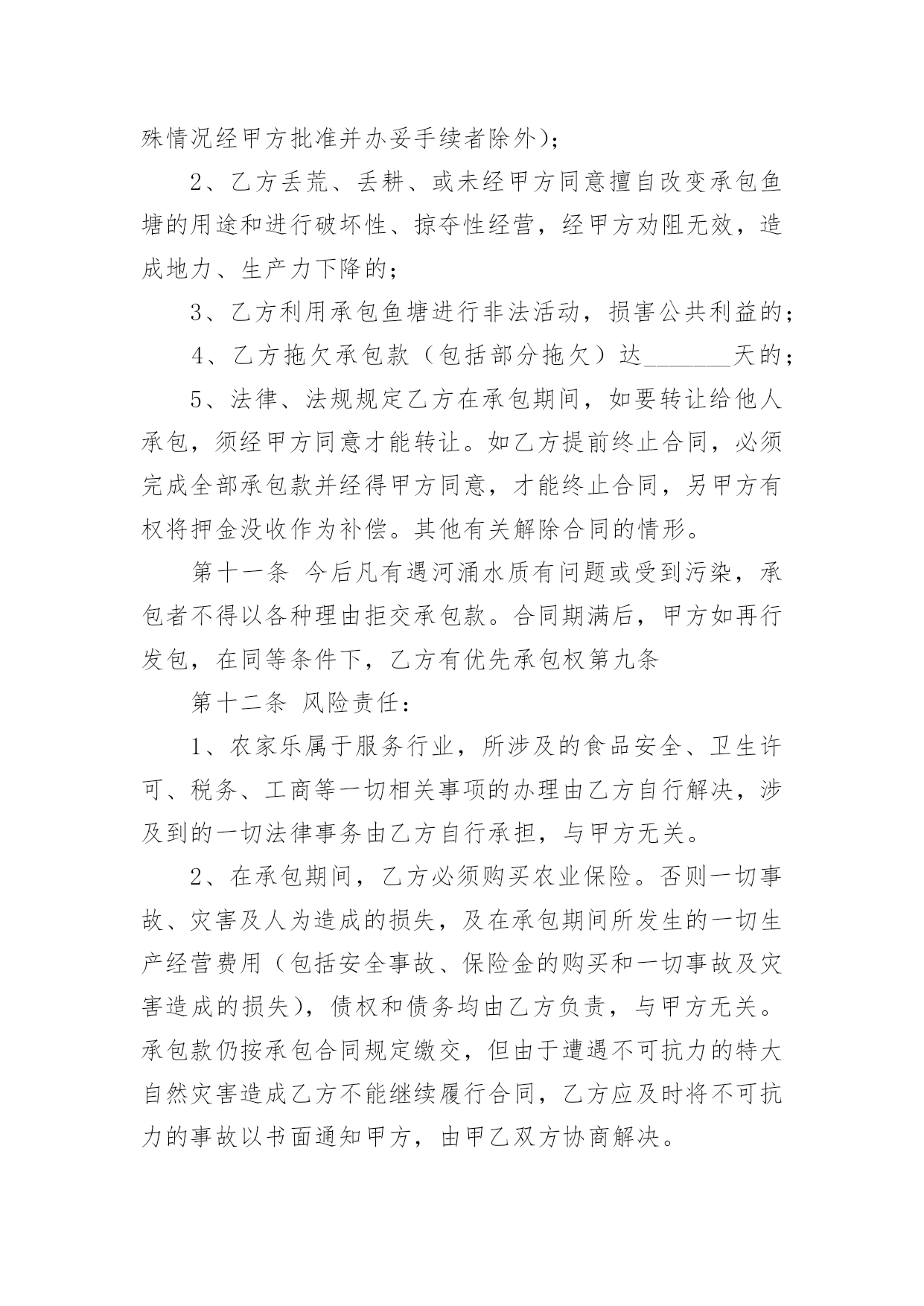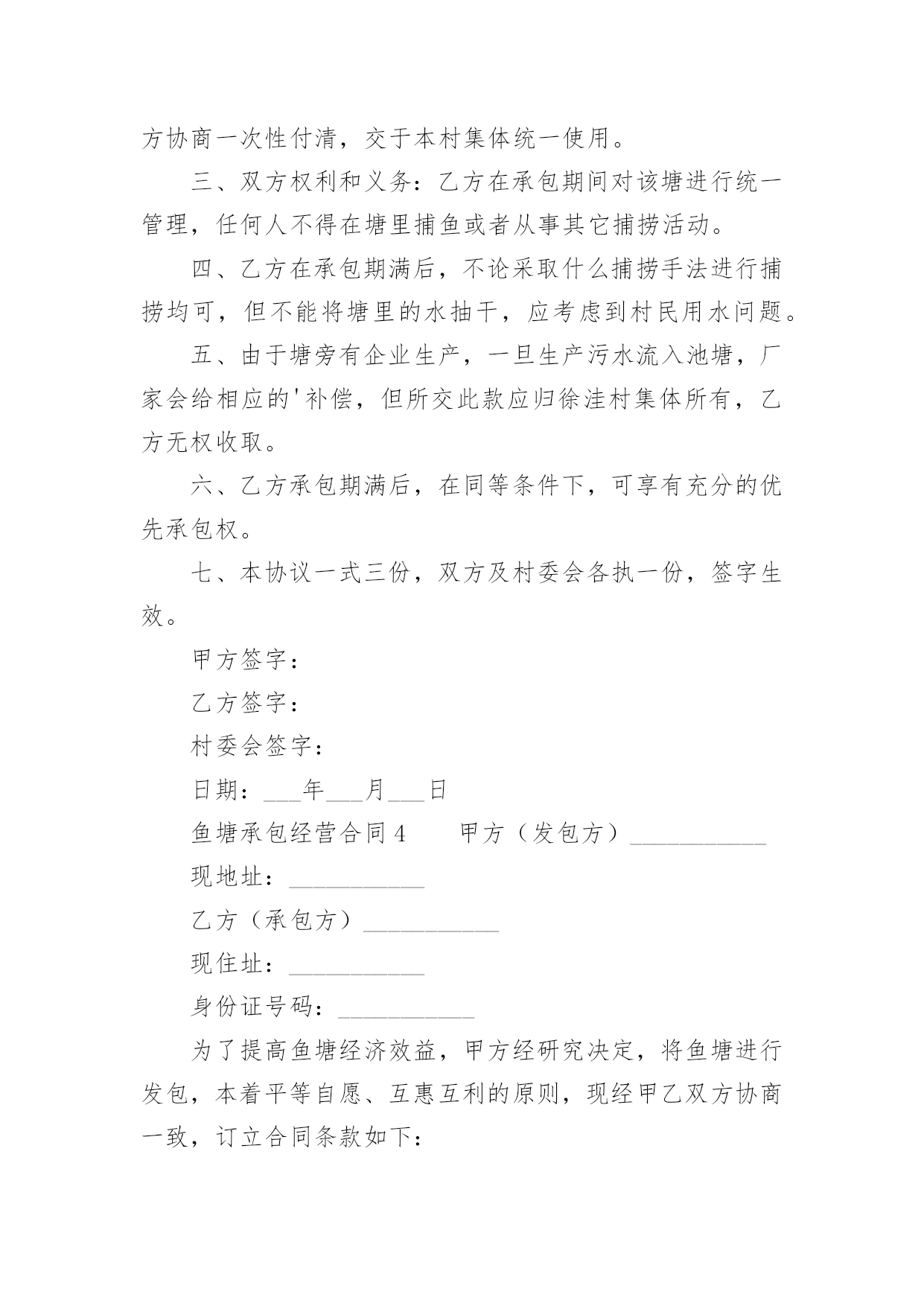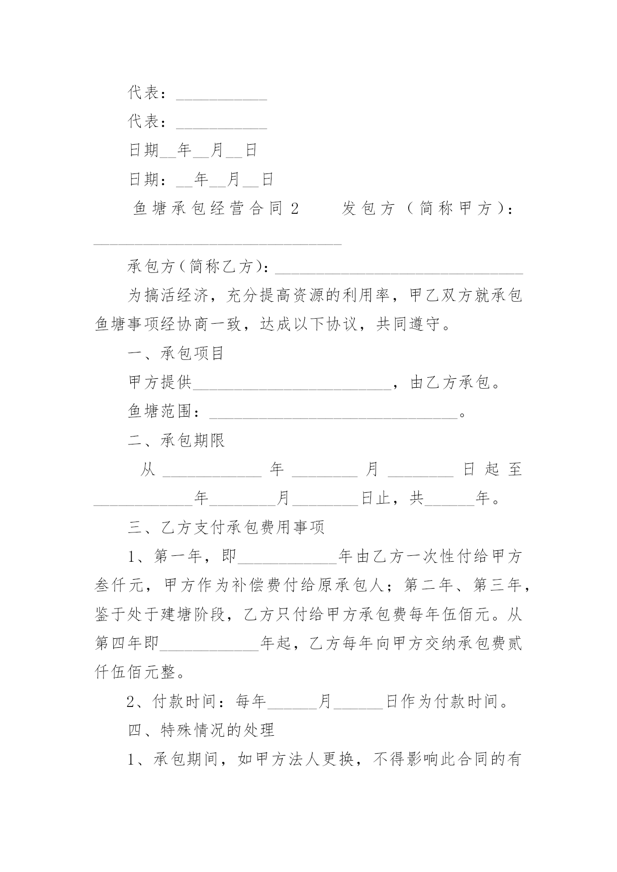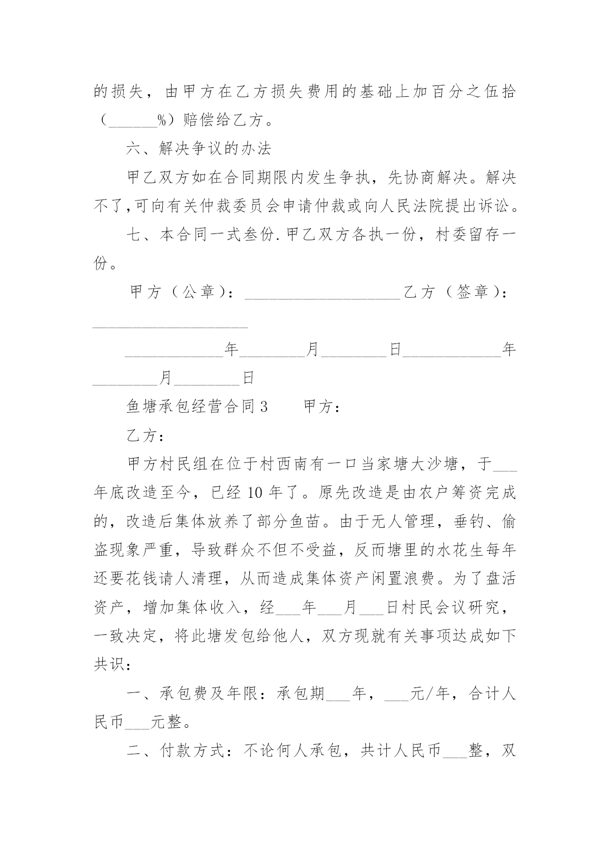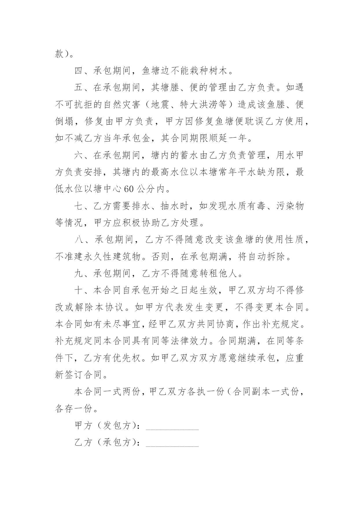 鱼塘承包经营合同鱼塘承包经营合同范本(精选8篇)随着法律法规不断完善,人们越发重视合同,能够利用到合同的场合越来越多,它可以保护民事法律关系。那么大家知道正规的合同书怎么写吗?下面是小编收集整理的鱼塘承包经营合同范本(精选8篇),仅供参考,欢迎大家阅读。鱼塘承包经营合同1甲方(发包方):___________现住址:___________乙方(承包方):___________现住址:___________因乙方的生产需要,为了更加提高经济效益,故需充分利用水资源,现就甲方自行所有的一口鱼塘,经甲乙双方认真协商订立本合同书,以供双方共同遵守。一、甲方发包的鱼塘座落及面积:该塘座落于:___________,面积约___________亩。二、承包期限:本协议承包期限为年,即从20__年__月__日起到20__年__月__日止。三、承包金额和付款方式:1、合同的`总金额为:___________元。2、付款方式为:A、20__年__月__日付款___________元(第一次付款)。B、20__年__月__日前付款___________元(第二次付款)。四、承包期间,鱼塘边不能栽种树木。五、在承包期间,其塘塍、便的管理由乙方负责。如遇不可抗拒的自然灾害(地震、特大洪涝等)造成该鱼塍、便倒塌,修复由甲方负责,甲方因修复鱼塘便耽误乙方使用,如不减乙方当年承包金,其合同期限顺延一年。六、在承包期间,塘内的蓄水由乙方负责管理,用水甲方负责安排,其塘内的最高水位以本塘常年平水缺为限,最低水位以塘中心60公分内。七、乙方需要排水、抽水时,如发现水质有毒、污染物等情况,甲方应积极协助乙方处理。八、承包期间,乙方不得随意改变该鱼塘的使用性质,不准建永久性建筑物。否则,在承包期满,将自动拆除。九、承包期间,乙方不得随意转租他人。十、本合同自承包开始之日起生效,甲乙双方均不得修改或解除本协议。如甲方代表发生变更,不得变更本合同。本合同如有未尽事宜,经甲乙双方共同协商,作出补充规定。补充规定同本合同具有同等法律效力。合同期满,在同等条件下,乙方有优先权。如甲乙双方双方愿意继续承包,应重新签订合同。本合同一式两份,甲乙双方各执一份(合同副本一式份,各存一份。甲方(发包方):___________乙方(承包方):___________代表:___________代表:___________日期__年__月__日日期:__年__月__日鱼塘承包经营合同2发包方(简称甲方):______________________________承包方(简称乙方):______________________________为搞活经济,充分提高资源的利用率,甲乙双方就承包鱼塘事项经协商一致,达成以下协议,共同遵守。一、承包项目甲方提供________________________,由乙方承包。鱼塘范围:______________________________。二、承包期限从____________年________月________日起至____________年________月________日止,共______年。三、乙方支付承包费用事项1、第一年,即____________年由乙方一次性付给甲方叁仟元,甲方作为补偿费付给原承包人;第二年、第三年,鉴于处于建塘阶段,乙方只付给甲方承包费每年伍佰元。从第四年即____________年起,乙方每年向甲方交纳承包费贰仟伍佰元整。2、付款时间:每年______月______日作为付款时间。四、特殊情况的处理1、承包期间,如甲方法人更换,不得影响此合同的有效性。合同期内,甲方不得以任何理由单方推翻或修改合同。2、如国家征用,按下列意见处理:(1)承包期限(即20年)内,乙方扩建、改善鱼塘所有投资而获得的赔偿费归乙方所得,土地赔偿费归甲方。(2)乙方投放的鱼苗以及乙方增建的经营设施(简易房屋、所种的树、花草、开出的停车场以及所修的'路等)的赔偿费,全部归乙方。(3)20年承包期限满后,如国家征用,甲方可享受乙方所有投资赔偿金的百分之______(______%)。土地赔偿金仍归甲方。3、承包期内,如乙方因重大特殊原因暂时或长期不能管理鱼塘,乙方有权委托直系亲属或按本合同条款转包他人,甲方不得阻止和干预。4、乙方承包期问,如遇纠纷,属土地使用权引起的,由甲方负责处理;属乙方经营等问题的,由乙方自行处理。5、承包期满后,如鱼塘继续承包,同等条件下优先考虑乙方。五、违约责任1、本合同生效后,甲方应在一个星期内将鱼塘交付给乙方。不能按时交付,每天赔偿违约金____________元给乙方,从乙方付给甲方的承包费中扣除。2、乙方在承包期限内,不能按时交纳承包费,遗期每天赔偿违约金____________元给甲方。3、如甲方违约