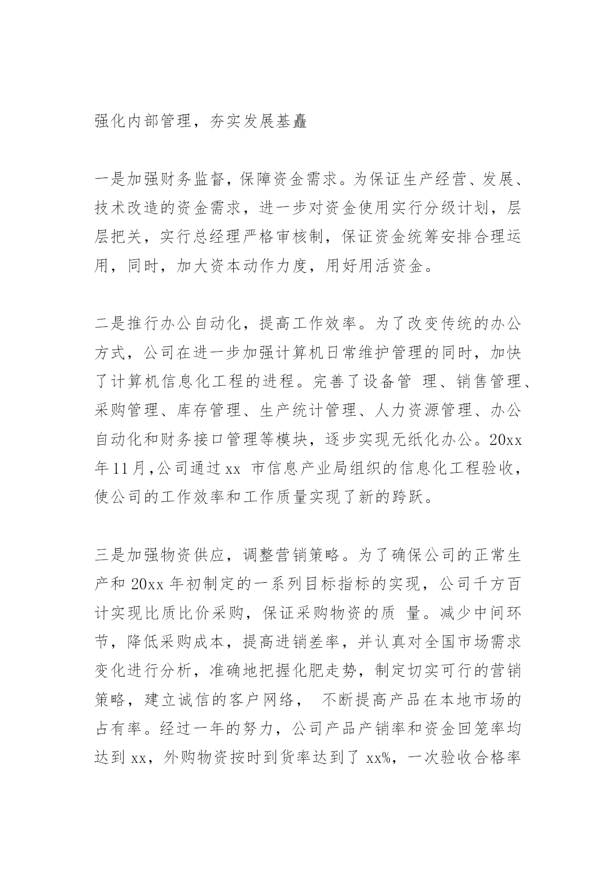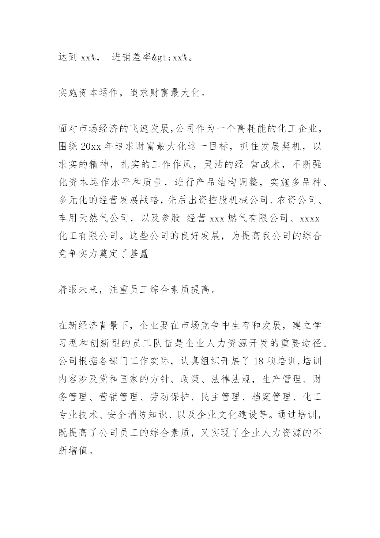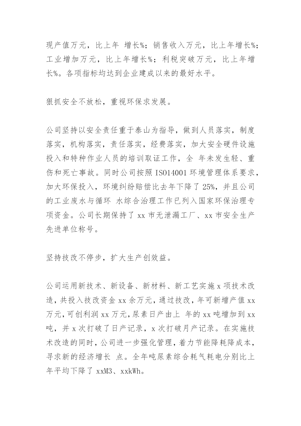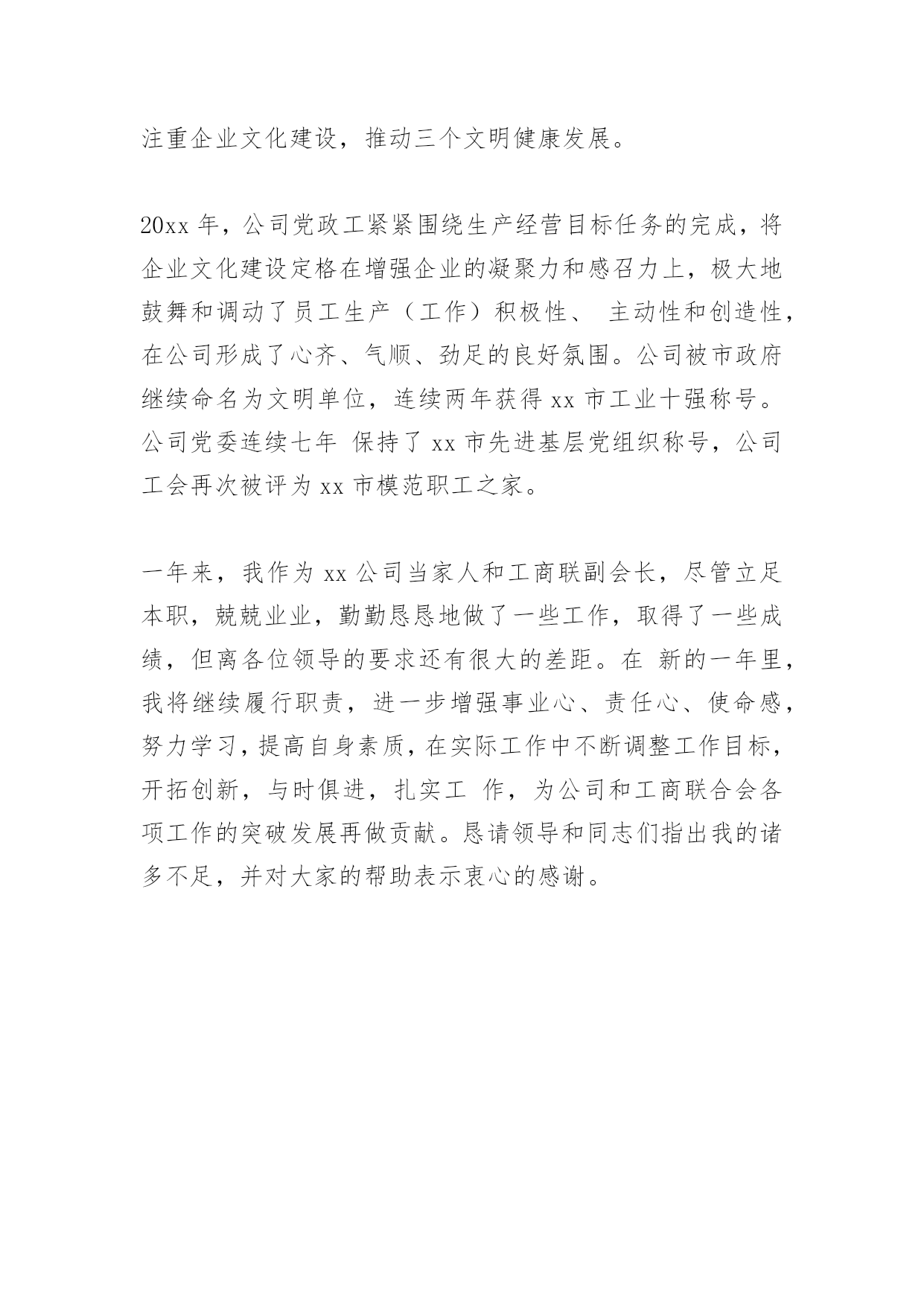 工商联副会长的述职报告我自担任工商联副会长以来,在市委市府的正确领导下,在市人大、市政协和各级部门的关心和支持下,在工商联领导和同志们的帮助下,通过自身不懈努力,坚持以邓小平理论和三个代表的重要思想为指导,认真贯彻落实党的十六届三中全会精神,坚持工商联工作统战性、经济性、民间性的统一,不断强化学习,提高认识,认真履行参政议政和民主监督职能,服从领导,积极为xx的经济发展建言献策。并紧紧围绕市委市府的中心工作,把自身企业的发展和全市的发展紧密结合起来,把个人富裕与全市人民的共同富裕结合起来,诚实守信、依法纳税,明确自己的社会地位和社会责任,不断壮大企业实力,积极主动回报社会,积极参加工商联举行的各种活动,服从安排,主动协助会长工作,完成会长办公会安排的各项任务。倡导和参与公益事业,向贫困地区捐资助学,扶贫济困。为xx社会稳定、构建和谐社会尽一份微薄之力,创造性的开展各项工作,圆满的完成了各项任务。在认真履行工商联副会长职能的同时,狠抓xx公司的建设与发展,取得了一定的成绩。20xx年,我带领公司全体员工齐心协力,顽强进取,充分发扬忠诚、团结、求实、创新的企业精神,大力倡导精、细、实、高、新的管理理念,同心同德,真抓实干,全年共生产尿素吨,比上年增长%;实现产值万元,比上年增长%;销售收入万元,比上年增长%;工业增加万元,比上年增长%;利税突破万元,比上年增长%。各项指标均达到企业建成以来的最好水平。狠抓安全不放松,重视环保求发展。公司坚持以安全责任重于泰山为指导,做到人员落实,制度落实,机构落实,责任落实,经费落实,加大安全硬件设施投入和特种作业人员的培训取证工作,全年未发生轻、重伤和死亡事故。同时公司按照ISO14001环境管理体系要求,加大环保投入,环境纠纷赔偿比去年下降了25%,并且公司的工业废水与循环水综合治理工作已列入国家环保治理专项资金。公司长期保持了xx市无泄漏工厂、xx市安全生产先进单位称号。坚持技改不停步,扩大生产创效益。公司运用新技术、新设备、新材料、新工艺实施x项技术改造,共投入技改资金xx余万元,通过技改,年可新增产值xx万元,可创利润xx万元,尿素日产由上年的xx吨增加到xx吨,并x次打破了日产记录,x次打破月产记录。在实施技术改造的同时,公司进一步强化管理,着力节能降耗降成本,寻求新的经济增长点。全年吨尿素综合耗气耗电分别比上年平均下降了xxM3、xxkWh。强化内部管理,夯实发展基矗一是加强财务监督,保障资金需求。为保证生产经营、发展、技术改造的资金需求,进一步对资金使用实行分级计划,层层把关,实行总经理严格审核制,保证资金统筹安排合理运用,同时,加大资本动作力度,用好用活资金。二是推行办公自动化,提高工作效率。为了改变传统的办公方式,公司在进一步加强计算机日常维护管理的同时,加快了计算机信息化工程的进程。完善了设备管理、销售管理、采购管理、库存管理、生产统计管理、人力资源管理、办公自动化和财务接口管理等模块,逐步实现无纸化办公。20xx年11月,公司通过xx市信息产业局组织的信息化工程验收,使公司的工作效率和工作质量实现了新的跨跃。三是加强物资供应,调整营销策略。为了确保公司的正常生产和20xx年初制定的一系列目标指标的实现,公司千方百计实现比质比价采购,保证采购物资的质量。减少中间环节,降低采购成本,提高进销差率,并认真对全国市场需求变化进行分析,准确地把握化肥走势,制定切实可行的营销策略,建立诚信的客户网络,不断提高产品在本地市场的占有率。经过一年的努力,公司产品产销率和资金回笼率均达到xx,外购物资按时到货率达到了xx%,一次验收合格率达到xx%,进销差率>xx%。实施资本运作,追求财富最大化。面对市场经济的飞速发展,公司作为一个高耗能的化工企业,围绕20xx年追求财富最大化这一目标,抓住发展契机,以求实的精神,扎实的工作作风,灵活的经营战术,不断强化资本运作水平和质量,进行产品结构调整,实施多品种、多元化的经营发展战略,先后出资控股机械公司、农资公司、车用天然气公司,以及参股经营xxx燃气有限公司、xxxx化工有限公司。这些公司的良好发展,为提高我公司的综合竞争实力奠定了基矗着眼未来,注重员工综合素质提高。在新经济背景下,企业要在市场竞争中生存和发展,建立学习型和创新型的员工队伍是企业人力资源开发的重要途径。公司根据各部门工作实际,认真组织开展了18项培训,培训内容涉及党和国家的方针、政策、法律法规,生产管理、财务管理、营销管理、劳动保护、民主管理、档案管理、化工专业技术、安全消防知识、以及企业文化建设等。通过培训,既提高了公司员工的综合素质,又实现了企业人力资源的不断增值。注重企业文化建设,推动三个文明健康发展。20xx年,公司党政工紧紧围绕生产经营目标任务的完成,将企业文化建