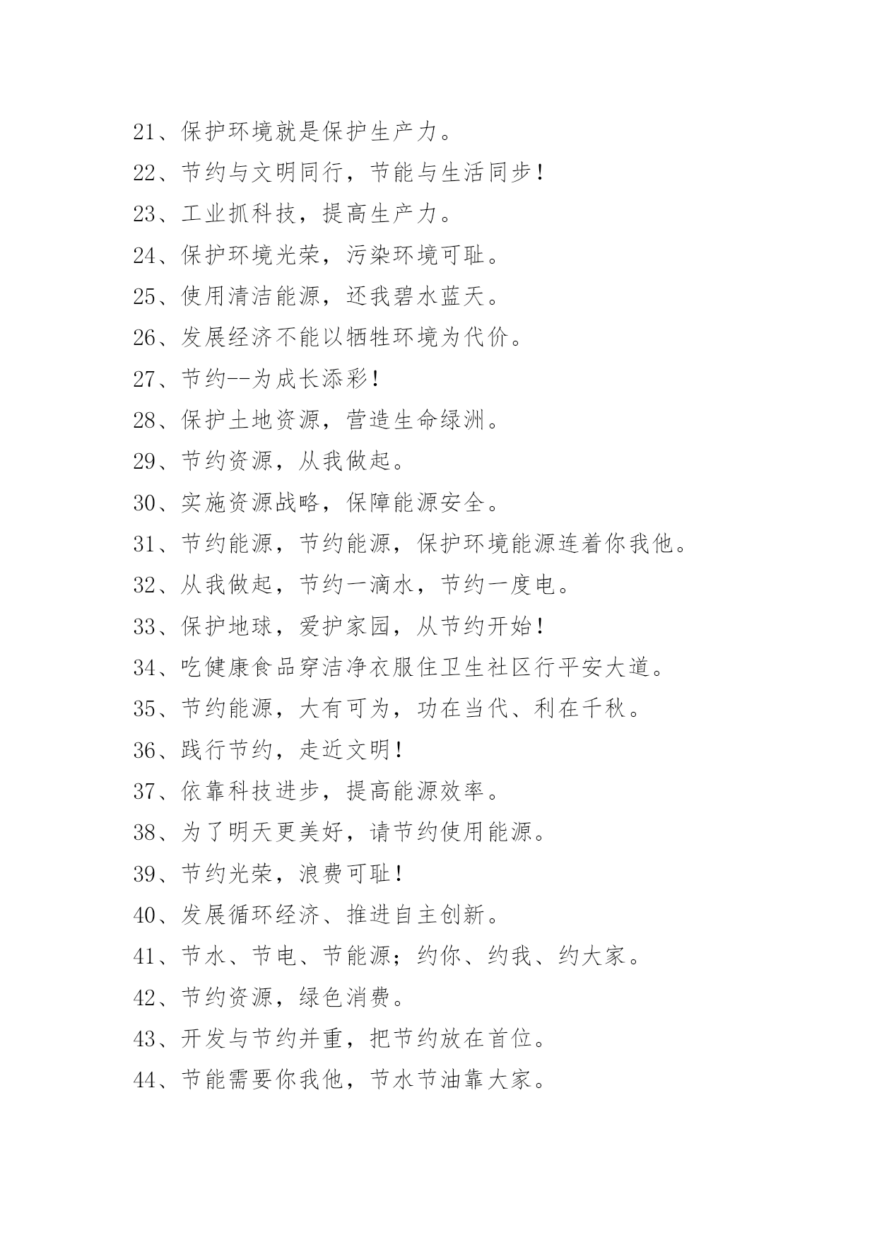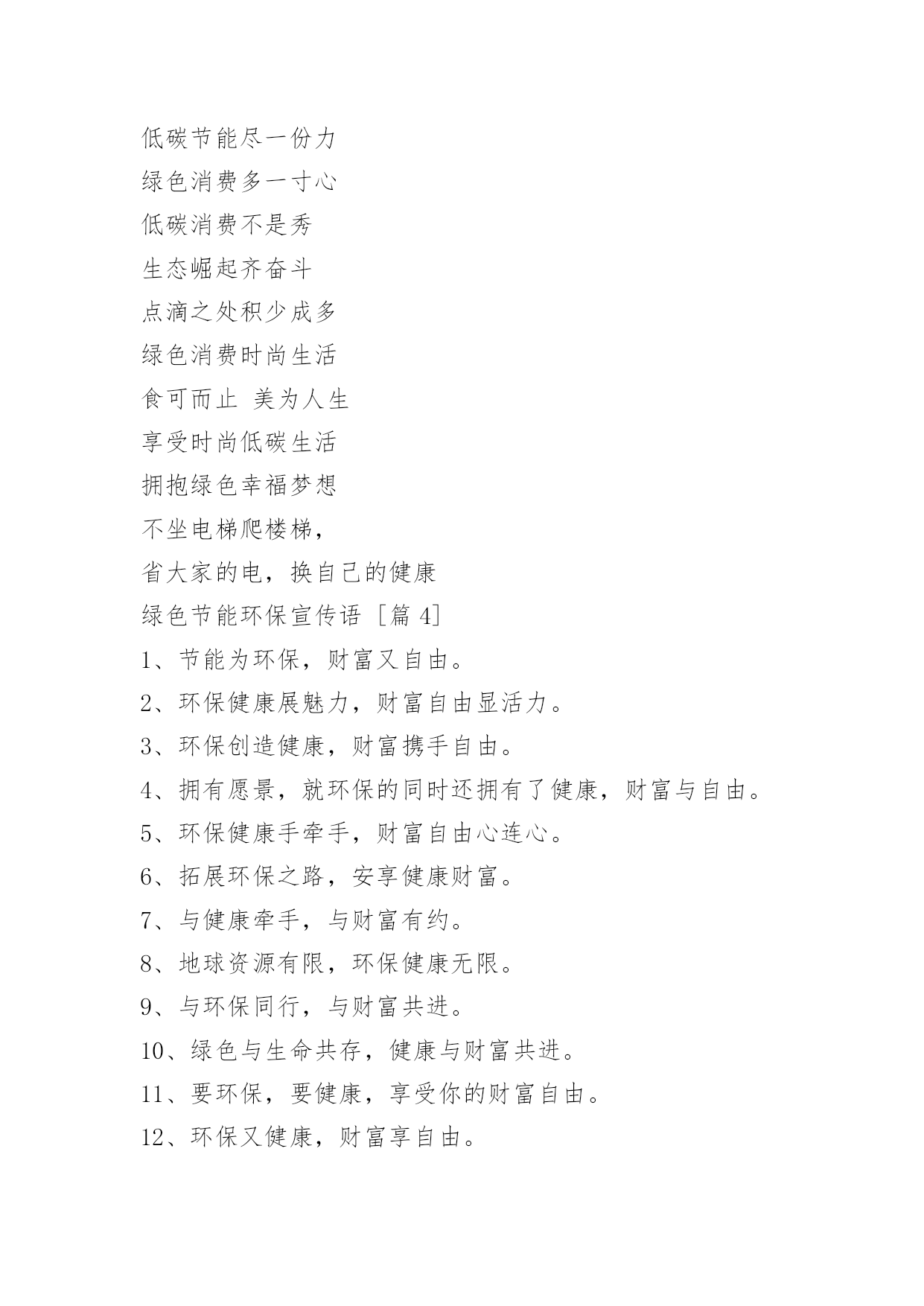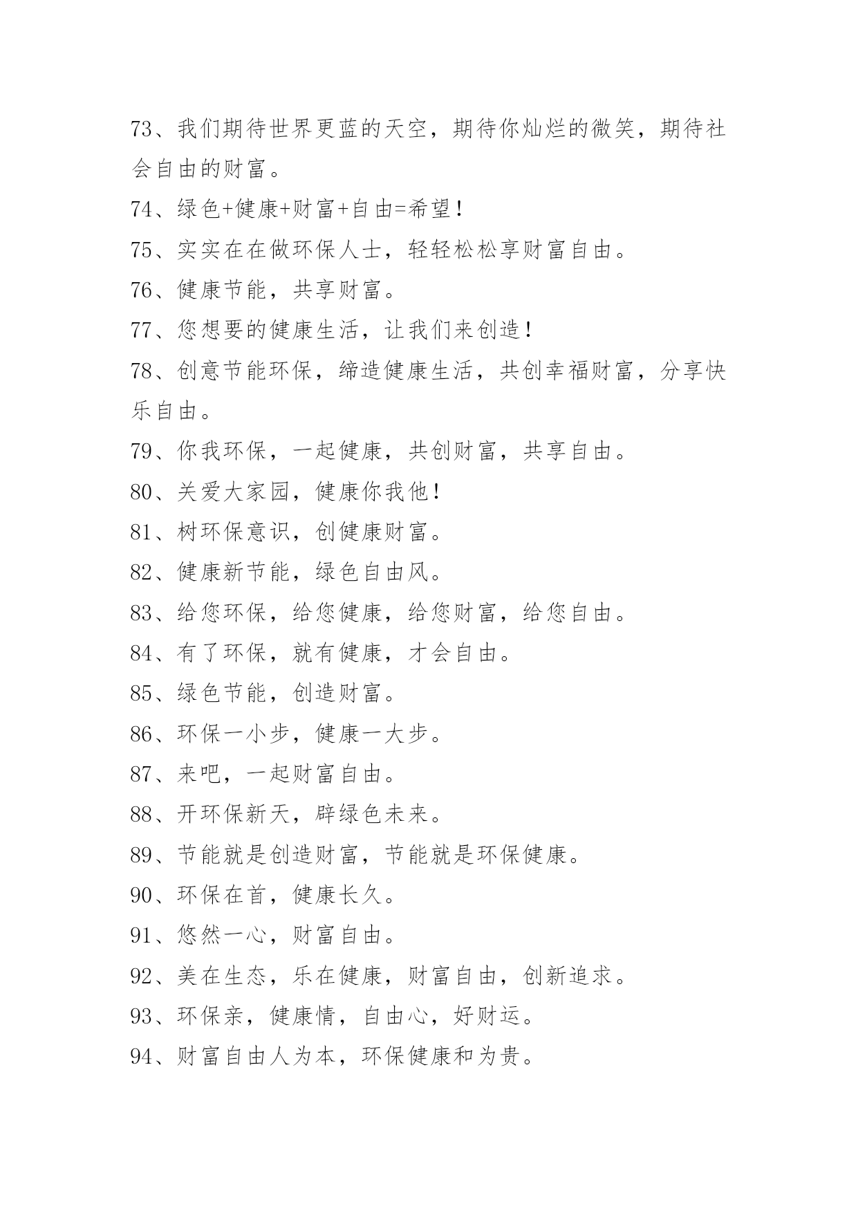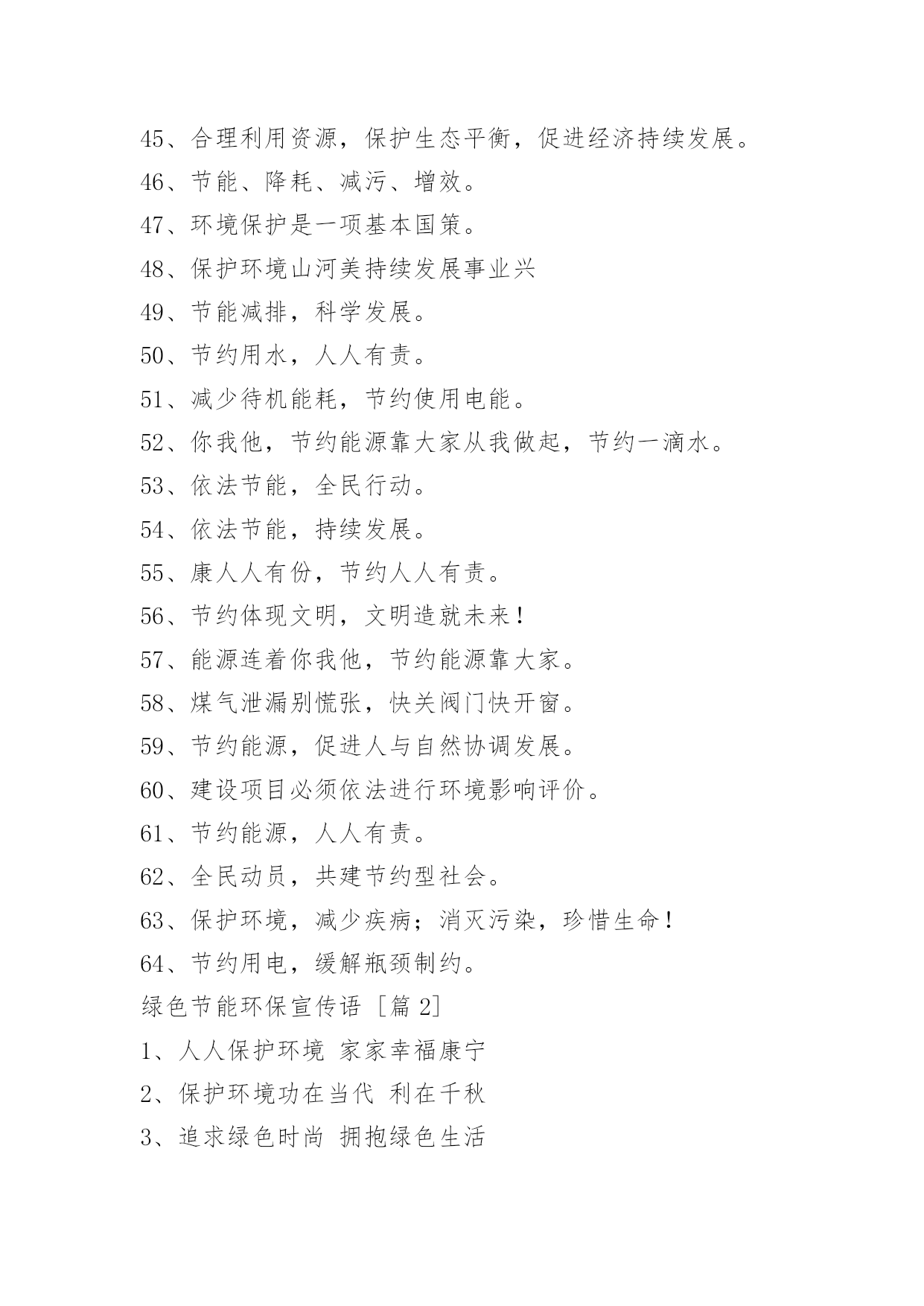 绿色节能环保宣传语绿色节能环保宣传语1、打造绿色校园,共创美好家园!2、节约点滴能源,造福千秋万代!3、浪费资源、殃及后代,节约资源、造福子孙。4、节约是传统美德,节约是生存智慧!5、勤俭节约,勤俭节约,绿色消费。6、节约能源、保护环境,功在当代、利在千秋。7、节约光荣,浪费可耻。8、合理利用自然资源,防止环境污染和生态破坏。9、使用节电产品,倡导绿色消费。10、垃圾分类,举手之劳,让我们从现在做起吧。11、推广节能灯具,倡导绿色照明。12、提倡科学用电,营造节能社会。13、发展循环经济,推行清洁生产。14、节约能源,保护资源,保护环境。15、绿色照明,节约用电。16、建设节约型学校,培养高素质公民!17、合理使用能源,提高能源利用效率。18、别让可爱的生灵在我们这一代人手中消失。19、搞好节能评估,倡导科学用能。20、安全与健康同在,节能与生态齐美。21、保护环境就是保护生产力。22、节约与文明同行,节能与生活同步!23、工业抓科技,提高生产力。24、保护环境光荣,污染环境可耻。25、使用清洁能源,还我碧水蓝天。26、发展经济不能以牺牲环境为代价。27、节约--为成长添彩!28、保护土地资源,营造生命绿洲。29、节约资源,从我做起。30、实施资源战略,保障能源安全。31、节约能源,节约能源,保护环境能源连着你我他。32、从我做起,节约一滴水,节约一度电。33、保护地球,爱护家园,从节约开始!34、吃健康食品穿洁净衣服住卫生社区行平安大道。35、节约能源,大有可为,功在当代、利在千秋。36、践行节约,走近文明!37、依靠科技进步,提高能源效率。38、为了明天更美好,请节约使用能源。39、节约光荣,浪费可耻!40、发展循环经济、推进自主创新。41、节水、节电、节能源;约你、约我、约大家。42、节约资源,绿色消费。43、开发与节约并重,把节约放在首位。44、节能需要你我他,节水节油靠大家。45、合理利用资源,保护生态平衡,促进经济持续发展。46、节能、降耗、减污、增效。47、环境保护是一项基本国策。48、保护环境山河美持续发展事业兴49、节能减排,科学发展。50、节约用水,人人有责。51、减少待机能耗,节约使用电能。52、你我他,节约能源靠大家从我做起,节约一滴水。53、依法节能,全民行动。54、依法节能,持续发展。55、康人人有份,节约人人有责。56、节约体现文明,文明造就未来!57、能源连着你我他,节约能源靠大家。58、煤气泄漏别慌张,快关阀门快开窗。59、节约能源,促进人与自然协调发展。60、建设项目必须依法进行环境影响评价。61、节约能源,人人有责。62、全民动员,共建节约型社会。63、保护环境,减少疾病;消灭污染,珍惜生命!64、节约用电,缓解瓶颈制约。绿色节能环保宣传语[篇2]1、人人保护环境家家幸福康宁2、保护环境功在当代利在千秋3、追求绿色时尚拥抱绿色生活4、保护生态环境造就秀美铜都5、人类靠环境生存环境靠人类保护6、关爱生命健康倡导环保时尚7、珍爱生命保护环境造福人类8、让地球远离污染让绿色走进家园9、保护碧水蓝天营造绿色家园10、争做环保使者共创绿色文明11、保护环境做一个文明的现代人12、树立环境保护意识建设绿色文明家园13、保护生态环境实现持续发展14、净化环境治污染保护生态讲文明15、倡环境保护之风走持续发展之路16、绿色消费,健康人生17、生态富民,环保先行绿色节能环保宣传语[篇3]适度点菜不丢面子合理膳食不长肚子节一滴水远离干旱降一度电告别雾霾中华饮食历史悠久祖训节俭代代相传擦亮洗衣“小窗口”服务行业“大民生”低碳节能尽一份力绿色消费多一寸心低碳消费不是秀生态崛起齐奋斗点滴之处积少成多绿色消费时尚生活食可而止美为人生享受时尚低碳生活拥抱绿色幸福梦想不坐电梯爬楼梯,省大家的电,换自己的健康绿色节能环保宣传语[篇4]1、节能为环保,财富又自由。2、环保健康展魅力,财富自由显活力。3、环保创造健康,财富携手自由。4、拥有愿景,就环保的同时还拥有了健康,财富与自由。5、环保健康手牵手,财富自由心连心。6、拓展环保之路,安享健康财富。7、与健康牵手,与财富有约。8、地球资源有限,环保健康无限。9、与环保同行,与财富共进。10、绿色与生命共存,健康与财富共进。11、要环保,要健康,享受你的财富自由。12、环保又健康,财富享自由。13、除了你的记忆什么也别留下,除了你的脚印什么也别带走。14、怀着激情的信心而来,带着财富的自由而归。15、环保的,就是世界的!16、环保无关财富,健康畅享自由。17、蓝天白云享健康,创造财富悦自由!18、节能环保缔造健康生活,健康生活成就财富自由。19、把你的苦痛当做我的苦痛,才能与你共荣。20、环保与健康常在,财富与自由共存。21、健康环保,生活美好。22、环保同行,财富共赢。2