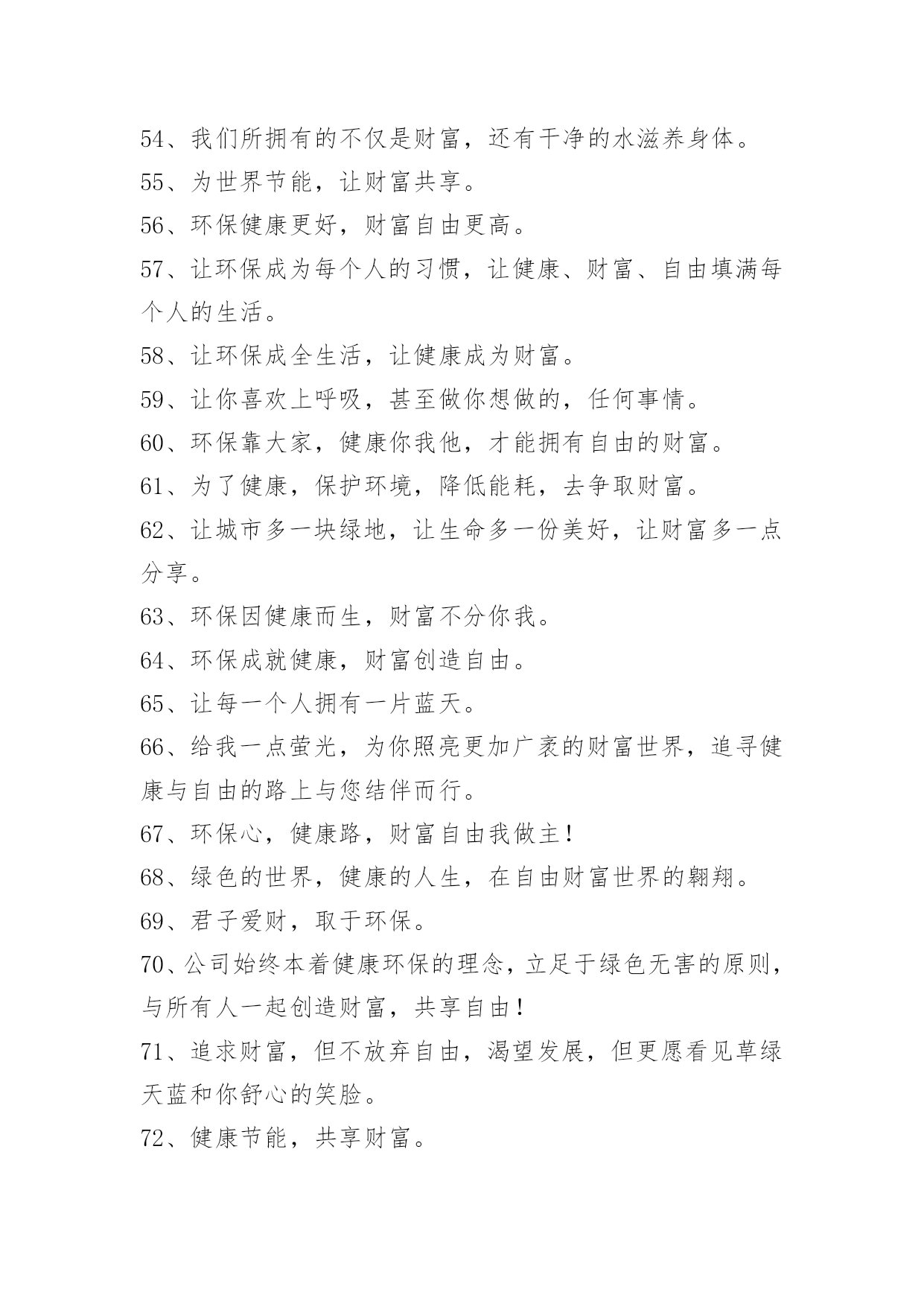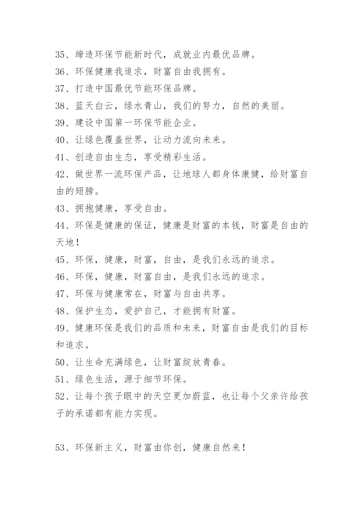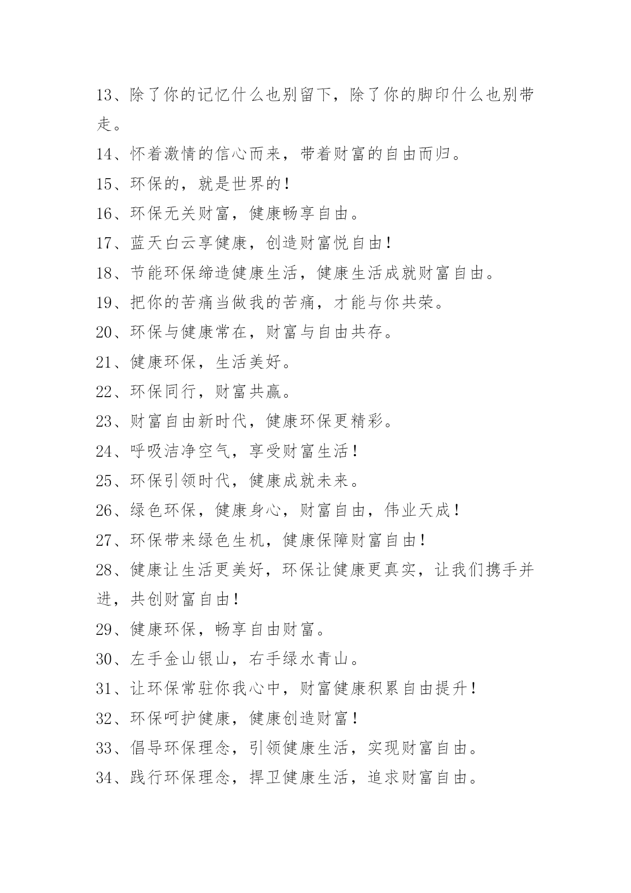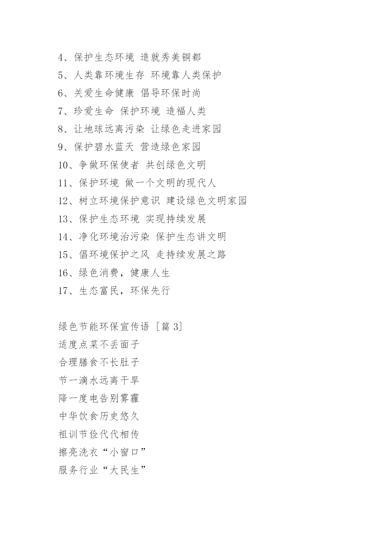 绿色节能环保宣传语绿色节能环保宣传语1、打造绿色校园,共创美好家园!2、节约点滴能源,造福千秋万代!3、浪费资源、殃及后代,节约资源、造福子孙。4、节约是传统美德,节约是生存智慧!5、勤俭节约,勤俭节约,绿色消费。6、节约能源、保护环境,功在当代、利在千秋。7、节约光荣,浪费可耻。8、合理利用自然资源,防止环境污染和生态破坏。9、使用节电产品,倡导绿色消费。10、垃圾分类,举手之劳,让我们从现在做起吧。11、推广节能灯具,倡导绿色照明。12、提倡科学用电,营造节能社会。13、发展循环经济,推行清洁生产。14、节约能源,保护资源,保护环境。15、绿色照明,节约用电。16、建设节约型学校,培养高素质公民!17、合理使用能源,提高能源利用效率。18、别让可爱的生灵在我们这一代人手中消失。19、搞好节能评估,倡导科学用能。20、安全与健康同在,节能与生态齐美。21、保护环境就是保护生产力。22、节约与文明同行,节能与生活同步!23、工业抓科技,提高生产力。24、保护环境光荣,污染环境可耻。25、使用清洁能源,还我碧水蓝天。26、发展经济不能以牺牲环境为代价。27、节约--为成长添彩!28、保护土地资源,营造生命绿洲。29、节约资源,从我做起。30、实施资源战略,保障能源安全。31、节约能源,节约能源,保护环境能源连着你我他。32、从我做起,节约一滴水,节约一度电。33、保护地球,爱护家园,从节约开始!34、吃健康食品穿洁净衣服住卫生社区行平安大道。35、节约能源,大有可为,功在当代、利在千秋。36、践行节约,走近文明!37、依靠科技进步,提高能源效率。38、为了明天更美好,请节约使用能源。39、节约光荣,浪费可耻!40、发展循环经济、推进自主创新。41、节水、节电、节能源;约你、约我、约大家。42、节约资源,绿色消费。43、开发与节约并重,把节约放在首位。44、节能需要你我他,节水节油靠大家。45、合理利用资源,保护生态平衡,促进经济持续发展。46、节能、降耗、减污、增效。47、环境保护是一项基本国策。48、保护环境山河美持续发展事业兴49、节能减排,科学发展。50、节约用水,人人有责。51、减少待机能耗,节约使用电能。52、你我他,节约能源靠大家从我做起,节约一滴水。53、依法节能,全民行动。54、依法节能,持续发展。55、康人人有份,节约人人有责。56、节约体现文明,文明造就未来!57、能源连着你我他,节约能源靠大家。58、煤气泄漏别慌张,快关阀门快开窗。59、节约能源,促进人与自然协调发展。60、建设项目必须依法进行环境影响评价。61、节约能源,人人有责。62、全民动员,共建节约型社会。63、保护环境,减少疾病;消灭污染,珍惜生命!64、节约用电,缓解瓶颈制约。绿色节能环保宣传语[篇2]1、人人保护环境家家幸福康宁2、保护环境功在当代利在千秋3、追求绿色时尚拥抱绿色生活4、保护生态环境造就秀美铜都5、人类靠环境生存环境靠人类保护6、关爱生命健康倡导环保时尚7、珍爱生命保护环境造福人类8、让地球远离污染让绿色走进家园9、保护碧水蓝天营造绿色家园10、争做环保使者共创绿色文明11、保护环境做一个文明的现代人12、树立环境保护意识建设绿色文明家园13、保护生态环境实现持续发展14、净化环境治污染保护生态讲文明15、倡环境保护之风走持续发展之路16、绿色消费,健康人生17、生态富民,环保先行绿色节能环保宣传语[篇3]适度点菜不丢面子合理膳食不长肚子节一滴水远离干旱降一度电告别雾霾中华饮食历史悠久祖训节俭代代相传擦亮洗衣“小窗口”服务行业“大民生”低碳节能尽一份力绿色消费多一寸心低碳消费不是秀生态崛起齐奋斗点滴之处积少成多绿色消费时尚生活食可而止美为人生享受时尚低碳生活拥抱绿色幸福梦想不坐电梯爬楼梯,省大家的电,换自己的健康绿色节能环保宣传语[篇4]1、节能为环保,财富又自由。2、环保健康展魅力,财富自由显活力。3、环保创造健康,财富携手自由。4、拥有愿景,就环保的同时还拥有了健康,财富与自由。5、环保健康手牵手,财富自由心连心。6、拓展环保之路,安享健康财富。7、与健康牵手,与财富有约。8、地球资源有限,环保健康无限。9、与环保同行,与财富共进。10、绿色与生命共存,健康与财富共进。11、要环保,要健康,享受你的财富自由。12、环保又健康,财富享自由。13、除了你的记忆什么也别留下,除了你的脚印什么也别带走。14、怀着激情的信心而来,带着财富的自由而归。15、环保的,就是世界的!16、环保无关财富,健康畅享自由。17、蓝天白云享健康,创造财富悦自由!18、节能环保缔造健康生活,健康生活成就财富自由。19、把你的苦痛当做我的苦痛,才能与你共荣。20、环保与健康常在,财富与自由共存。21、健康环保,生活美好。22、环保同行,财富共赢。2