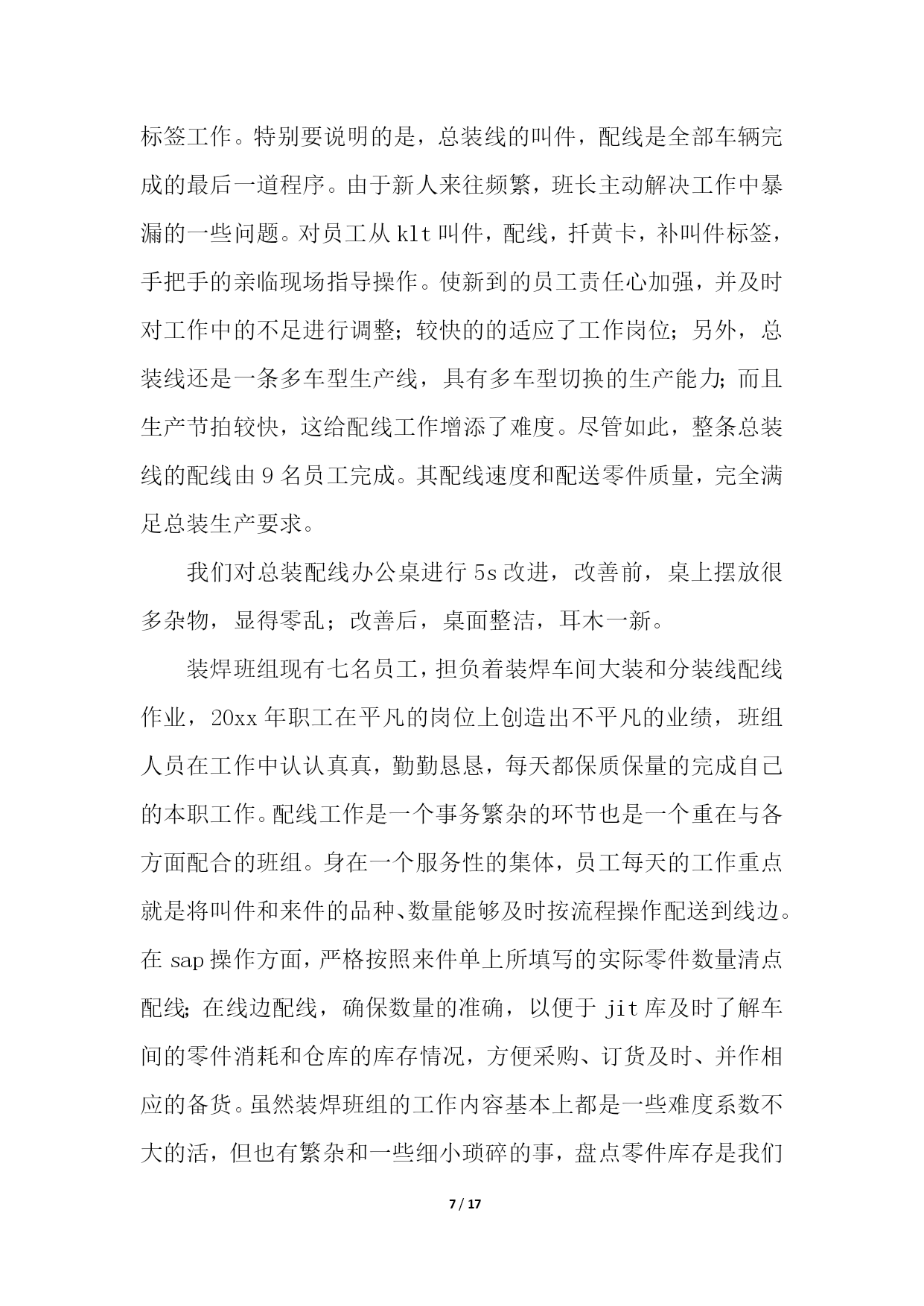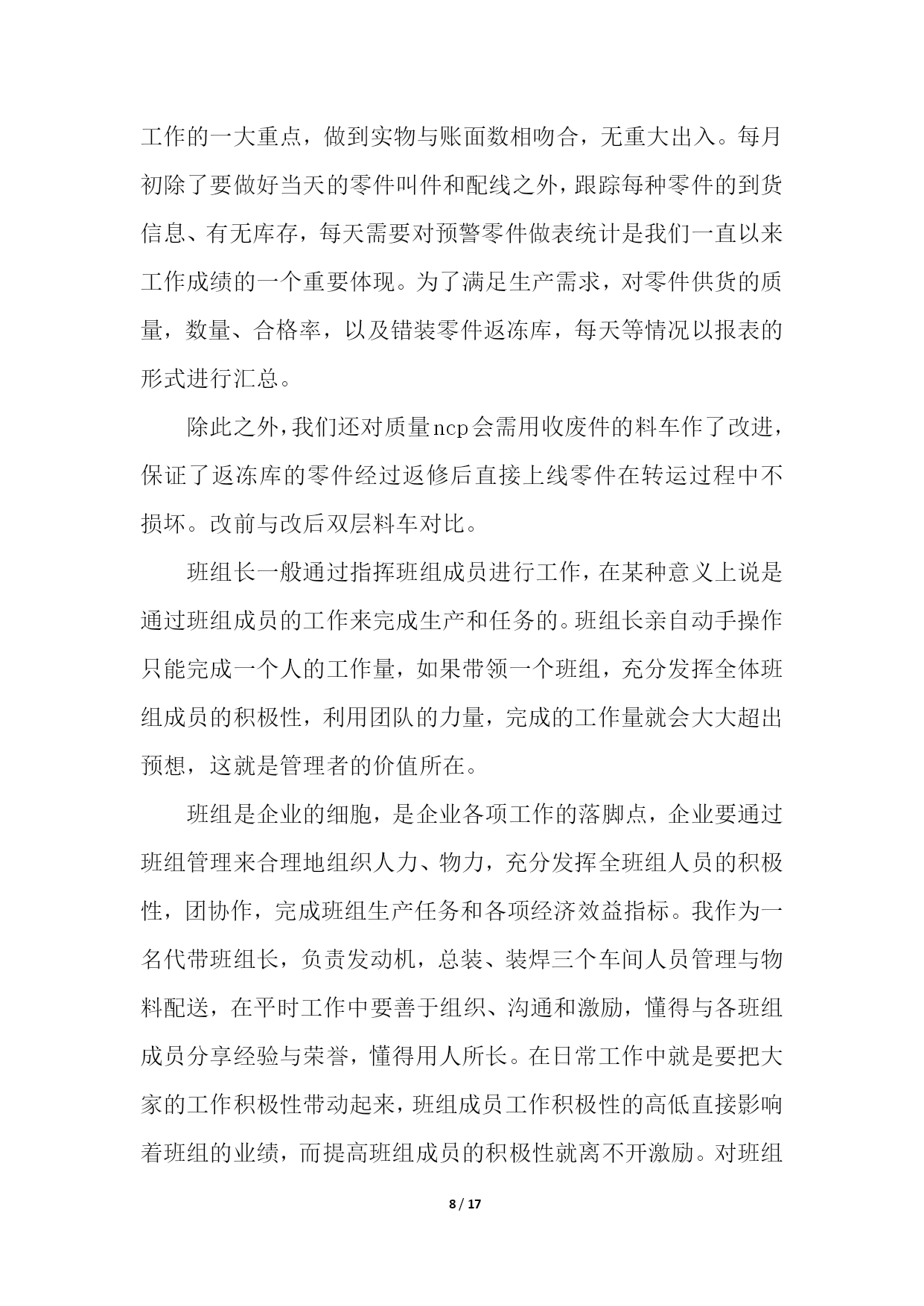 PAGE17/NUMPAGES17物流部年终工作总结物流部年终工作总结1(一)如何提高员工的工作效率:告诉员工明确的目标和要求,提供必要的资源,解决员工无法克服的困难,对完成任务的员工给予奖励。(二)如何强化和提升员工的责任感。各班组的激励权限掌握在现场主管手中,强化质量意识和质量考核的经济岗位责任制,提高统计工作效率,建立公认的激励标准(员工考核:效率40、质量40、配合度20、出勤状况),加强技能考核和计件工资的规范化、科学化,改变员工的不良惰性和习惯。(三)如何培养全才:一线员工在完成自己的工作后,可以不经同意,利用15%的工作时间去做个人感兴趣的事情(其他岗位技能学习),让员工走出狭隘的专业分工,适应各种工作的需要,在更大范围内发挥作用,可以加强员工之间的互助合作,克服岗位之间的不平衡和由此造成的劳动浪费。为了保证全面完成任务,常见的形式是在一个综合生产小组中,某一工种的员工也为小组中的其他工种工作,盒成型焊接的员工不仅知道如何焊接盒,还知道如何焊接图纸和底座,抛光盒并组装它们。某些设备的操作员也为其他不同的设备工作。比如数控人员不仅要会激光切割机,还要会数控冲床,数控折弯机等设备操作。设备操作员也做定量分析工作。基本生产员工也是辅助工。辅助人员和做各种辅助工作等。培养全面型人才的操作方法:1。根据培训计划,按照计划对作业基准和作业指导书的内容逐一进行培训和指导。2.完成初始培训指导后,拜访操作人员,加深对操作基准和操作顺序培训内容的理解,然后利用中间休息或加班(下班后)的时间,由班长指导实际操作。3.当有班长或其他全能负责人时,可以安排学生与操作人员一起进行实际操作,提高操作的准确性,规范操作顺序,同时掌握正确的操作方法。4.当受训者掌握了正确的操作方法,能达到自己的操作基准,有正常的操作速度时,可以安排进行独立操作,使其逐渐熟练,达到一定程度的操作稳定性,并持续一段时间,期间班长要进行确认。5.评估学员的培训效果。检查操作方法是否与操作指令的顺序方法一致,是否有不正确的操作动作,如果有,及时纠正;对成品进行确认检验。(四)成本意识的培养:从小的角度来说,比如跑一辆车可以做一件事,或者适当安排几件事,开车出去可以同时做很多事。用过的复印纸,不重要的文件反面可以重复使用。休息时关灯。空调不超过一定温度的不得使用。掉在地上的材料可以随时捡起来。一个小时能完成的工作,一定时间能完成,不耽误。从大的角度看管理:有没有富余人员?现有人员所做的工作是否可以减少。协调工作一次是否可以,不需要经常协调或者不同层次的请示,浪费时间和精力。生产中频繁更换品种也是浪费时间。材料仓库积压过多往往是资金周转困难的主要原因。生产现场积压的材料或半成品也是资金积压,占用生产流程空间。质量成本高的主要原因是质量差或修理产品多的比率高,质量成本中的高故障成本往往是企业亏损的主要原因。采购不当等管理层面一定要时刻关注并寻求改善的途径。回收用过的剩余材料是一线操作人员直接素养的见证。一个完整产品的使用部位,毛刺或多余材料没有清理干净,直接导致下一道工序或客户的施工进度和公司的声誉。(e)基层管理人员和一线操作人员的班组长工资如何构成;组长基本工资核定内容:基本工资(满勤正常、不加班、业绩中等的工资的40%~60%)为班长津贴组长浮动工资核定内容:绩效工资任务绩效指个人和部门任务完成情况:工作质量日常工作通过率、客户满意度、责任行为到位率。作业数量——单位时间内完成的工作总量(有效载荷、超额或提前);工作事故一般责任事故的频率。管理绩效(管理者角色和行为到位的程度):纪律——服从领导指挥,遵纪守法,有效的管理控制;组织意识——横向沟通、妥协与合作。团队建设——下属团队和谐进取。忠诚——维护(不是非法侵占)公司利益,积极预防和解决问题。工作创新——对稳步提高部门或组织未来绩效的工作贡献。班组长浮动工资的考核依据:任务占工资标准的60%,其中班组产量(出货数量)定额为40%,质量为20%;节能降耗占工资标准的10%,其中节能5%,创收降耗5%;管理占工资标准的30%,其中考勤8%,制度执行10%,健康安全5%,纪律4%,综合评价3%。一线员工基本工资核定内容:技能50%;工作的重要性是15%;年资15%;工作环境1物流部年终工作总结2光阴似箭,日月如梭。转眼间20xx年就要过去了。回顾一年来,我感到自己在工作、生活、学习等各方面的收获令人欣慰。那些大家朝夕相处、日日夜夜奋战在生产第一线的场景仍历历在目。20xx年在工段领导的帮助与支持下,配线工段b班经过全班员工的共同努力,齐心协力,在保证安生生产的基础上顺利完成了配线工段交给的各项工作任务。现对一年来的所做工作分几个方面总如下:一、安全方面:一年来,针对各种各样的现象和问题,我们在设备使用
