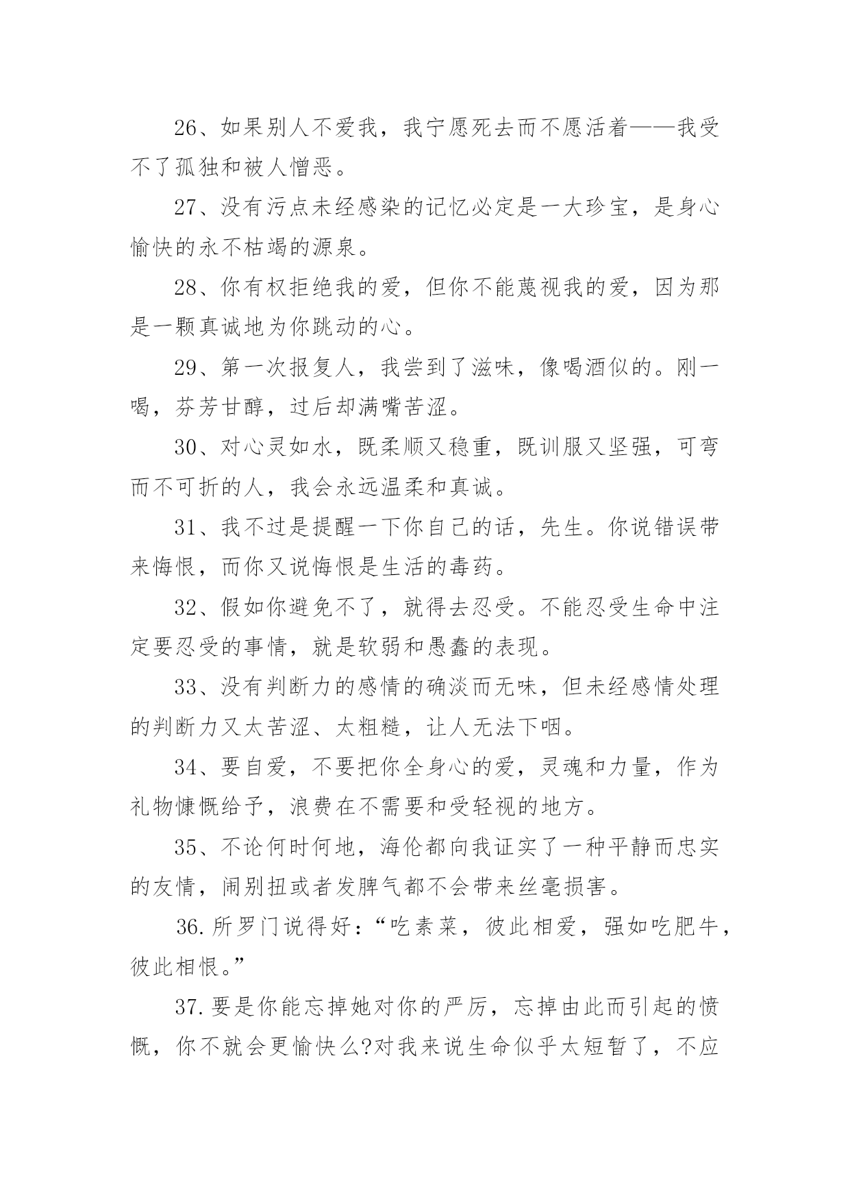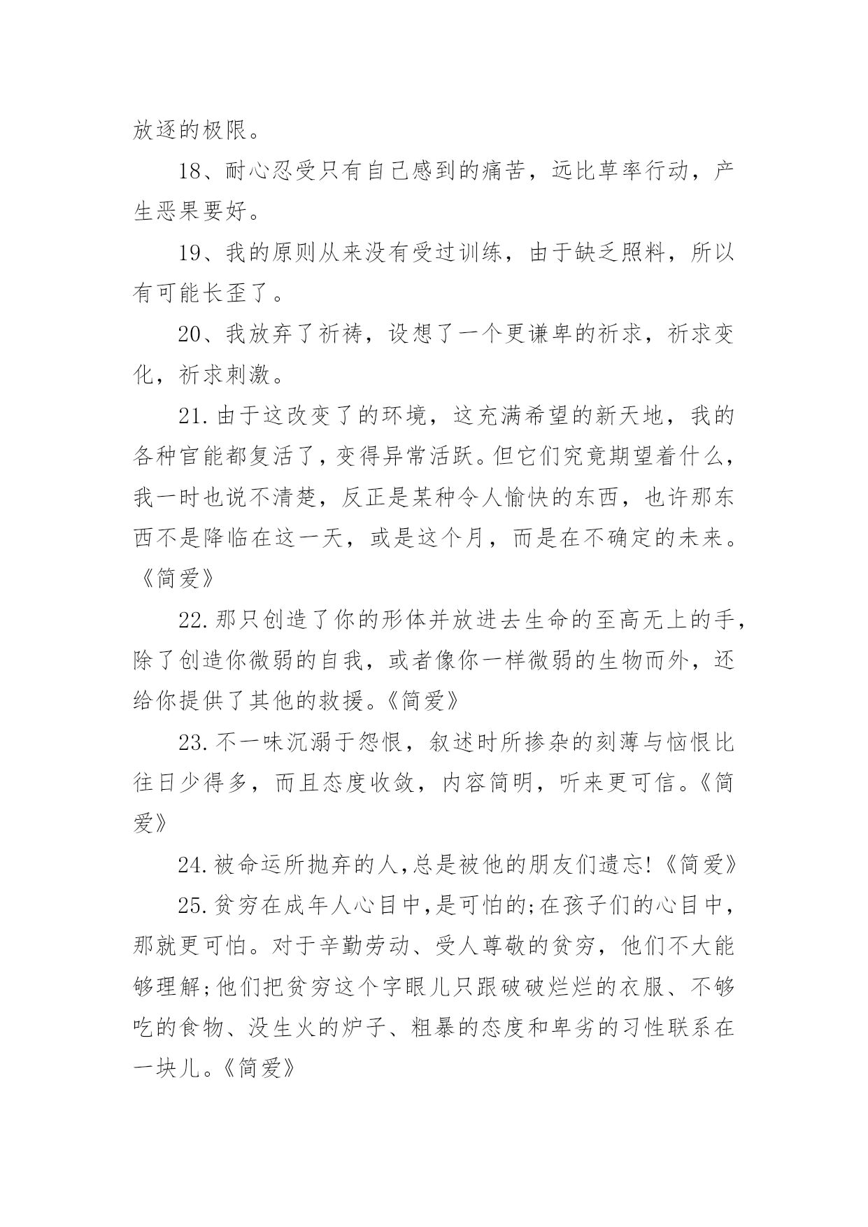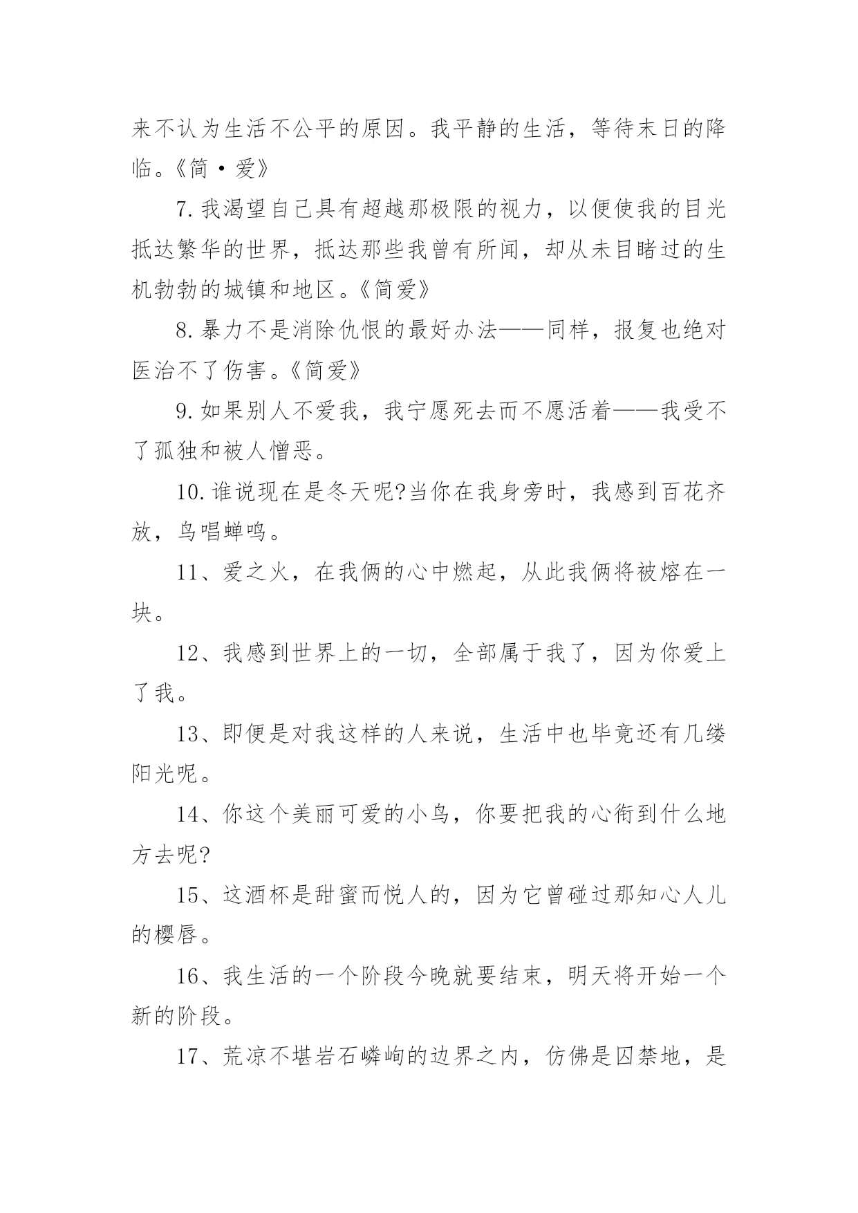 简爱经典生活爱情语录简爱经典生活爱情语录1.假如你避免不了,就得去忍受。不能忍受生命中注定要忍受的事情,就是软弱和愚蠢的表现。《简爱》2.你以为我会无足轻重的留在这里吗?你以为我是一架没有感情的机器人吗?你以为我贫穷、低微、不美、缈小,我就没有灵魂,没有心吗?你想错了,我和你有一样多的灵魂,一样充实的心。如果上帝赐予我一点美,许多钱,我就要你难以离开我,就象我现在难以离开你一样。我现在不是以社会生活和习俗的准则和你说话,而是我的心灵同你的心灵讲话。《简爱》3.即使整个世界恨你,并且相信你很坏,只要你自己问心无愧,知道你是清白的,你就不会没有朋友。《简爱》4.我无法控制自己的眼睛,忍不住要去看他,就像口干舌燥的人明知水里有毒却还要喝一样。我本来无意去爱他,我也曾努力的掐掉爱的萌芽,但当我又见到他时,心底的爱又复活了。《简爱》5.我越是孤独,越是没有朋友,越是没有支持,我就得越尊重我自己。6.生命太短暂了,不应该用来记恨。人生在世,谁都会有错误,但我们很快会死去。我们的罪过将会随我们的身体一起消失,只留下精神的火花。这就是我从来不想报复,从来不认为生活不公平的原因。我平静的生活,等待末日的降临。《简·爱》7.我渴望自己具有超越那极限的视力,以便使我的目光抵达繁华的世界,抵达那些我曾有所闻,却从未目睹过的生机勃勃的城镇和地区。《简爱》8.暴力不是消除仇恨的最好办法——同样,报复也绝对医治不了伤害。《简爱》9.如果别人不爱我,我宁愿死去而不愿活着——我受不了孤独和被人憎恶。10.谁说现在是冬天呢?当你在我身旁时,我感到百花齐放,鸟唱蝉鸣。11、爱之火,在我俩的心中燃起,从此我俩将被熔在一块。12、我感到世界上的一切,全部属于我了,因为你爱上了我。13、即便是对我这样的人来说,生活中也毕竟还有几缕阳光呢。14、你这个美丽可爱的小鸟,你要把我的心衔到什么地方去呢?15、这酒杯是甜蜜而悦人的,因为它曾碰过那知心人儿的樱唇。16、我生活的一个阶段今晚就要结束,明天将开始一个新的阶段。17、荒凉不堪岩石嶙峋的边界之内,仿佛是囚禁地,是放逐的极限。18、耐心忍受只有自己感到的痛苦,远比草率行动,产生恶果要好。19、我的原则从来没有受过训练,由于缺乏照料,所以有可能长歪了。20、我放弃了祈祷,设想了一个更谦卑的祈求,祈求变化,祈求刺激。21.由于这改变了的环境,这充满希望的新天地,我的各种官能都复活了,变得异常活跃。但它们究竟期望着什么,我一时也说不清楚,反正是某种令人愉快的东西,也许那东西不是降临在这一天,或是这个月,而是在不确定的未来。《简爱》22.那只创造了你的形体并放进去生命的至高无上的手,除了创造你微弱的自我,或者像你一样微弱的生物而外,还给你提供了其他的救援。《简爱》23.不一味沉溺于怨恨,叙述时所掺杂的刻薄与恼恨比往日少得多,而且态度收敛,内容简明,听来更可信。《简爱》24.被命运所抛弃的人,总是被他的朋友们遗忘!《简爱》25.贫穷在成年人心目中,是可怕的;在孩子们的心目中,那就更可怕。对于辛勤劳动、受人尊敬的贫穷,他们不大能够理解;他们把贫穷这个字眼儿只跟破破烂烂的衣服、不够吃的食物、没生火的炉子、粗暴的态度和卑劣的习性联系在一块儿。《简爱》26、如果别人不爱我,我宁愿死去而不愿活着——我受不了孤独和被人憎恶。27、没有污点未经感染的记忆必定是一大珍宝,是身心愉快的永不枯竭的源泉。28、你有权拒绝我的爱,但你不能蔑视我的爱,因为那是一颗真诚地为你跳动的心。29、第一次报复人,我尝到了滋味,像喝酒似的。刚一喝,芬芳甘醇,过后却满嘴苦涩。30、对心灵如水,既柔顺又稳重,既训服又坚强,可弯而不可折的人,我会永远温柔和真诚。31、我不过是提醒一下你自己的话,先生。你说错误带来悔恨,而你又说悔恨是生活的毒药。32、假如你避免不了,就得去忍受。不能忍受生命中注定要忍受的事情,就是软弱和愚蠢的表现。33、没有判断力的感情的确淡而无味,但未经感情处理的判断力又太苦涩、太粗糙,让人无法下咽。34、要自爱,不要把你全身心的爱,灵魂和力量,作为礼物慷慨给予,浪费在不需要和受轻视的地方。35、不论何时何地,海伦都向我证实了一种平静而忠实的友情,闹别扭或者发脾气都不会带来丝毫损害。36.所罗门说得好:“吃素菜,彼此相爱,强如吃肥牛,彼此相恨。”37.要是你能忘掉她对你的严厉,忘掉由此而引起的愤慨,你不就会更愉快么?对我来说生命似乎太短暂了,不应用来结仇记恨。《简·爱》38.悔恨是生活的毒药。39.像橡树般一寸寸成长起来的友情,要比像瓜蔓般突然蹿起来的友情更为可靠。40.我最害怕的莫过于闲散怠惰,没事可干,无所作为,官能陷于麻痹状态。身体闲置不用,精神就备感苦闷。