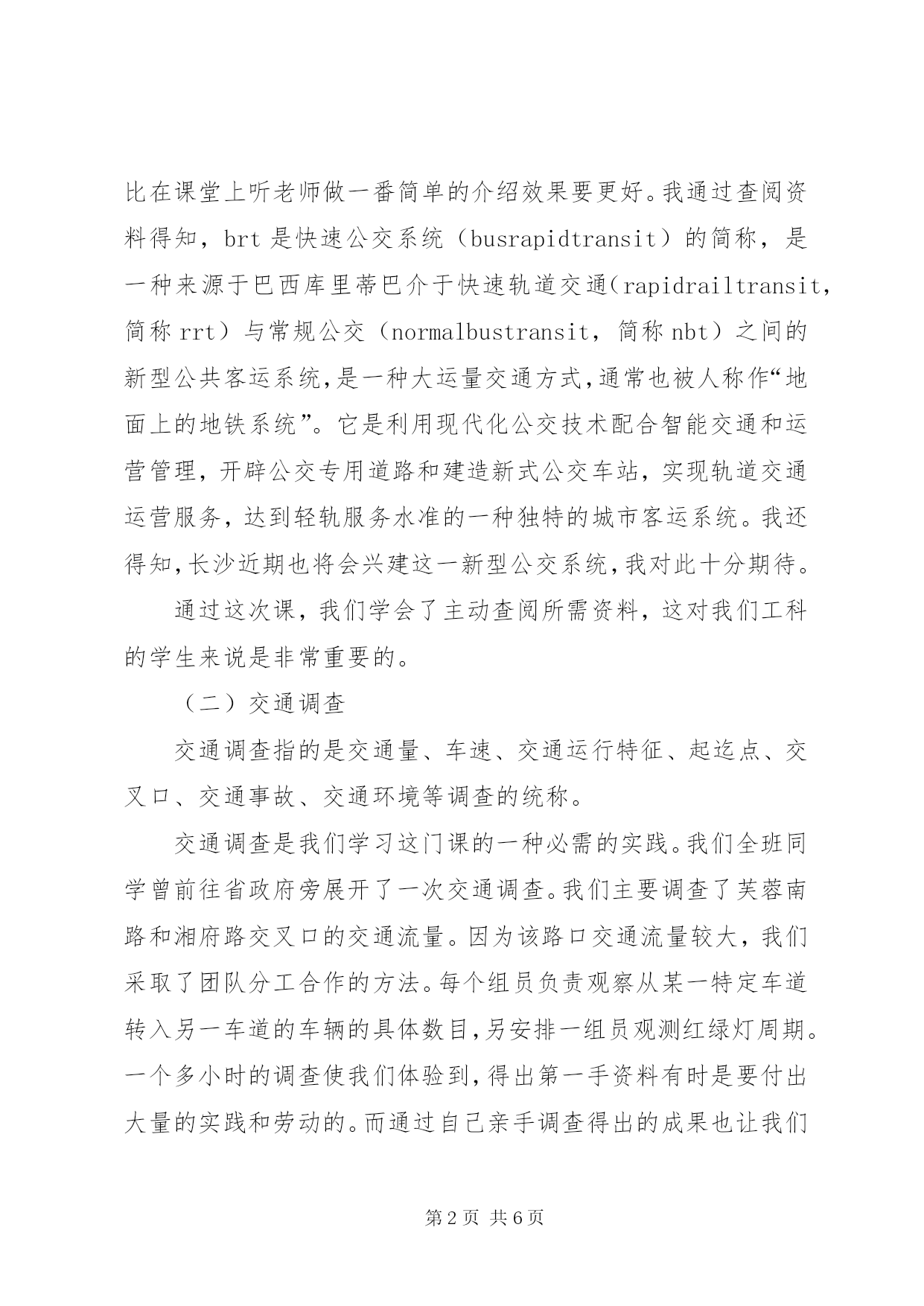 第PAGE\*Arabic\*MERGEFORMAT6页共NUMPAGES\*MERGEFORMAT6页交通工程学习心得1《交通工程总论》学习心得这学期我们学了《交通工程总论》这门新的课程,通过学习这门课程我对本专业有了一个较为清晰的认识。交通工程学是研究交通发生、发展、分布、运行与停住规律,探讨交通调查、规划、设计、监控、营运、管理、安全的理论、方法以及有关设施、装备、法律和法规,协调道路交通中人、车、路与环境之间的相互关系,使道路交通更加安全,高效、快捷、舒适和美观、方便经济的一门工程技术科学。在短短的八次课中,李老师着重给我们讲了交通特性分析、交通调查、交通流理论、交通规划和交通管理等内容。很多概念(像交通特性、交通量、交通流、道路通行能力等)我们以前偶有听说过,但不是很了解,通过这门课的学习,我们对这些较为专业的词汇的了解也从感性阶段上升到了理性阶段。在老师讲的这些内容中,我对新型交通,交通调查和交通管理尤其有兴趣。(一)新型交通在一次课上,老师跟我们介绍了brt(快速公交系统)这一新型公共客运系统。多名同学发言参与了介绍自己见过的brt形式。但同时也有很多同学并没有见过这一系统。于是老师让我们自己动手查资料并作为作业写一篇brt的简介。我觉得这种讲课方式很好的激发了我们的学习主动性,自己动手查询得到的东西比在课堂上听老师做一番简单的介绍效果要更好。我通过查阅资料得知,brt是快速公交系统(busrapidtransit)的简称,是一种来源于巴西库里蒂巴介于快速轨道交通(rapidrailtransit,简称rrt)与常规公交(normalbustransit,简称nbt)之间的新型公共客运系统,是一种大运量交通方式,通常也被人称作“地面上的地铁系统”。它是利用现代化公交技术配合智能交通和运营管理,开辟公交专用道路和建造新式公交车站,实现轨道交通运营服务,达到轻轨服务水准的一种独特的城市客运系统。我还得知,长沙近期也将会兴建这一新型公交系统,我对此十分期待。通过这次课,我们学会了主动查阅所需资料,这对我们工科的学生来说是非常重要的。(二)交通调查交通调查指的是交通量、车速、交通运行特征、起迄点、交叉口、交通事故、交通环境等调查的统称。交通调查是我们学习这门课的一种必需的实践。我们全班同学曾前往省政府旁展开了一次交通调查。我们主要调查了芙蓉南路和湘府路交叉口的交通流量。因为该路口交通流量较大,我们采取了团队分工合作的方法。每个组员负责观察从某一特定车道转入另一车道的车辆的具体数目,另安排一组员观测红绿灯周期。一个多小时的调查使我们体验到,得出第一手资料有时是要付出大量的实践和劳动的。而通过自己亲手调查得出的成果也让我们很有成就感。通过这次调查结果,我们得出了如下结论。省政府及XX县区政府的南移及相关机构的搬离对带动XX市南部的发展及促进长株潭整体化的进程起到了很大的促进作用。车水马龙,呈现出一片繁花似锦的新气象。同时,从统计数据及观测表明,芙蓉南路对于新省政府片区的交通疏导起到了主导作用。但是南北直行的车辆数较多,东西直行的车辆很少,红灯停放时间过长,绿灯通行时间过于紧凑,建议可以稍微调整时间间隔,以提高此区域的交通,争取做到尽善尽美。总的来说,此区域道路通行能力较佳,基本不会出现大规模的阻碍现象。八车道的道路对大流量的交通也提供了重大的保障,车辆能够基本保持平稳流畅通行,对于长沙的民生建设都有着很重大的促进作用,同时顺畅的交通也为经济的迅速发展提供了坚强的后盾。通过这次调查,我们也认识到了团队合作的重要性。在调查过程和后期数据处理中,我们因为团队分工合作节省了不少时间。(三)交通管理和控制结合所学和自己的一些调查及经历,我觉得长沙的公交管理和控制并不尽如人意,没有很好的兼顾乘客安全、方便、舒适的交通需求心理。导致长沙的公交服务水平不高。作为长沙理工大学云塘校区的一名学生,我对长沙的公交服务现状有几点体会:一,公交资源分布不均。我们校区的同学外出十分不便,过长沙理工大学云塘校区站的只有702一路车,似乎无论什么时候出去都很拥挤。而有的站点的公交车奇多,很多时候我们都看到车上只有几个乘客。二,公交车的电子报站系统建设还很不全面,有时侯只是司机师傅用长沙话扯着嗓子喊一声某某站有下没,这对外地来长沙读书或者务工的人员造成了很大的不便。三,公交车上缺乏必要的服务和安全设施,而长沙公交车上的安全应急设施残缺不全,很多车上的紧急逃生锤都不见了。至于服务设施,我觉得公交车上至少应该向乘客提供方便袋,以方便晕车的乘客,这一举措不仅成本低廉,而且体现着一种无微不至的人文关怀。我觉得导致长沙公交服务水平不高和公交工作人员服务意识不强的原因是多方面的。其中公共交通的管理和控制不当要对此负很大部分的责任。城市公共交通是