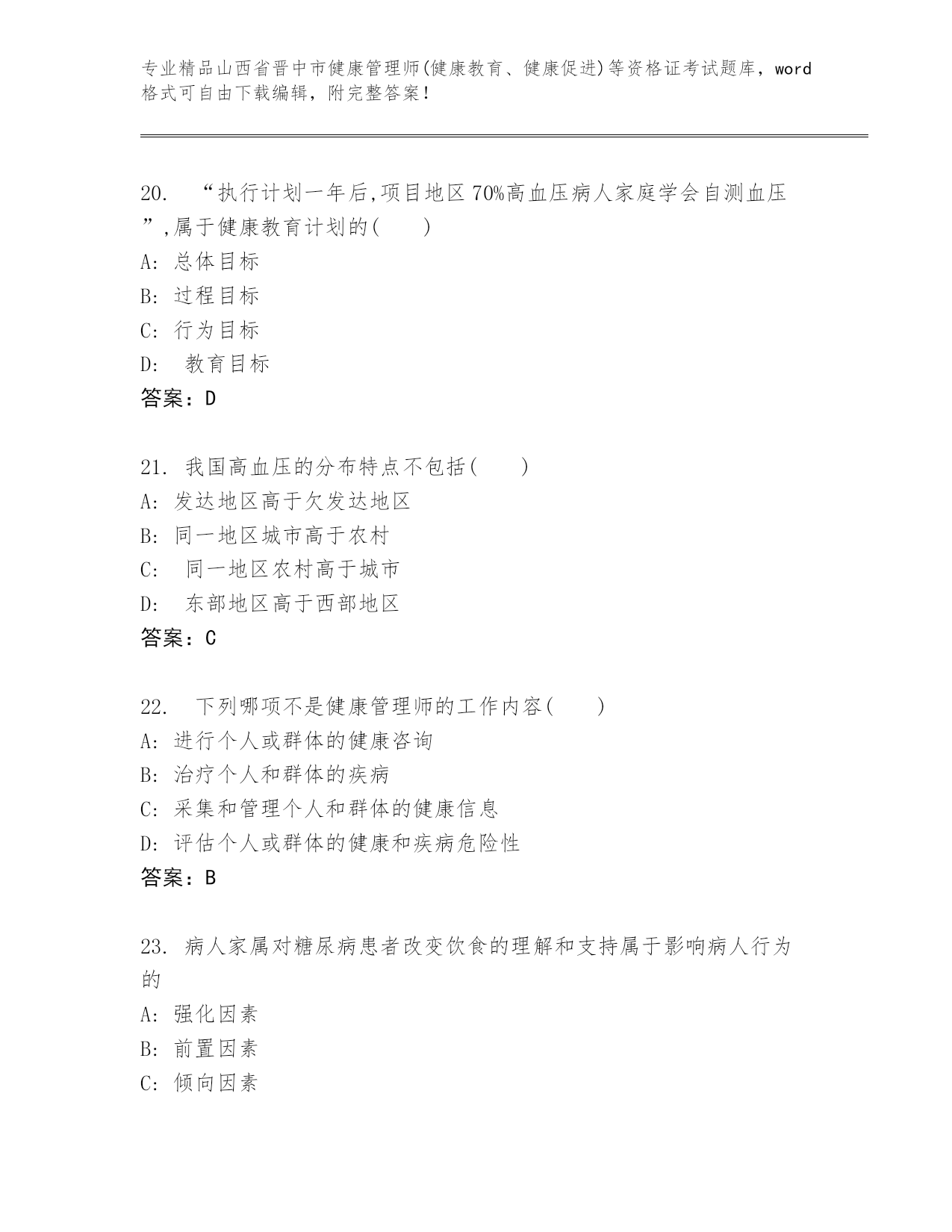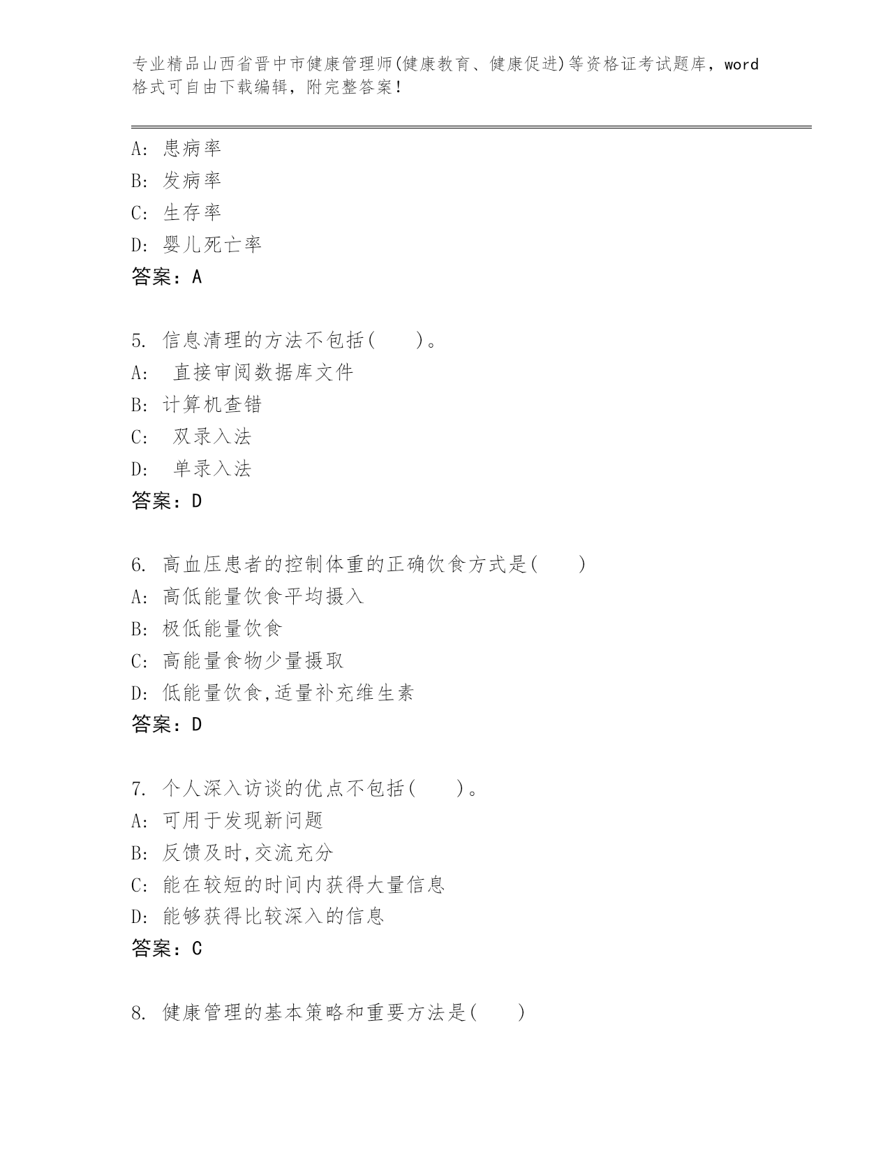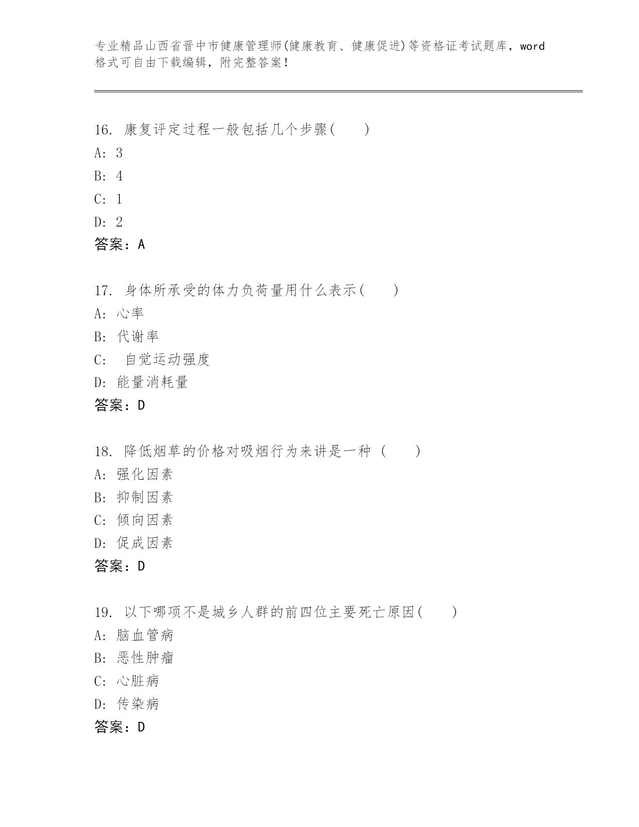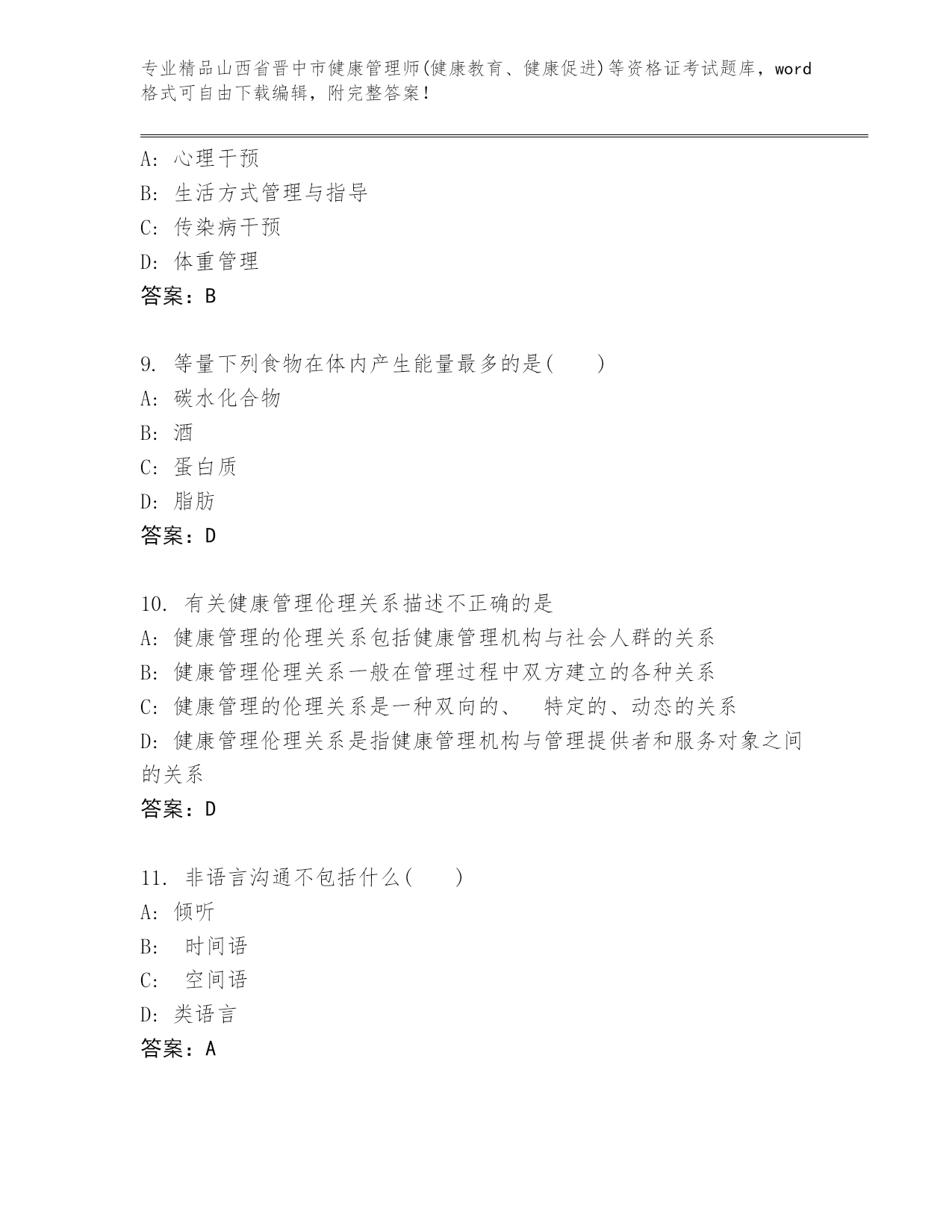 山西省晋中市健康管理师(健康教育、健康促进)等资格证考试完整题库【B卷】.docx