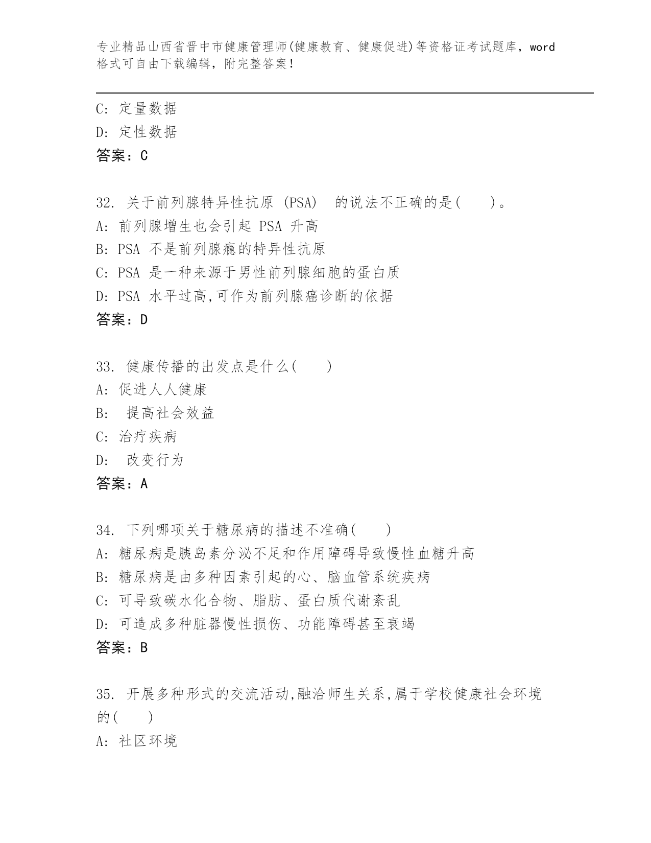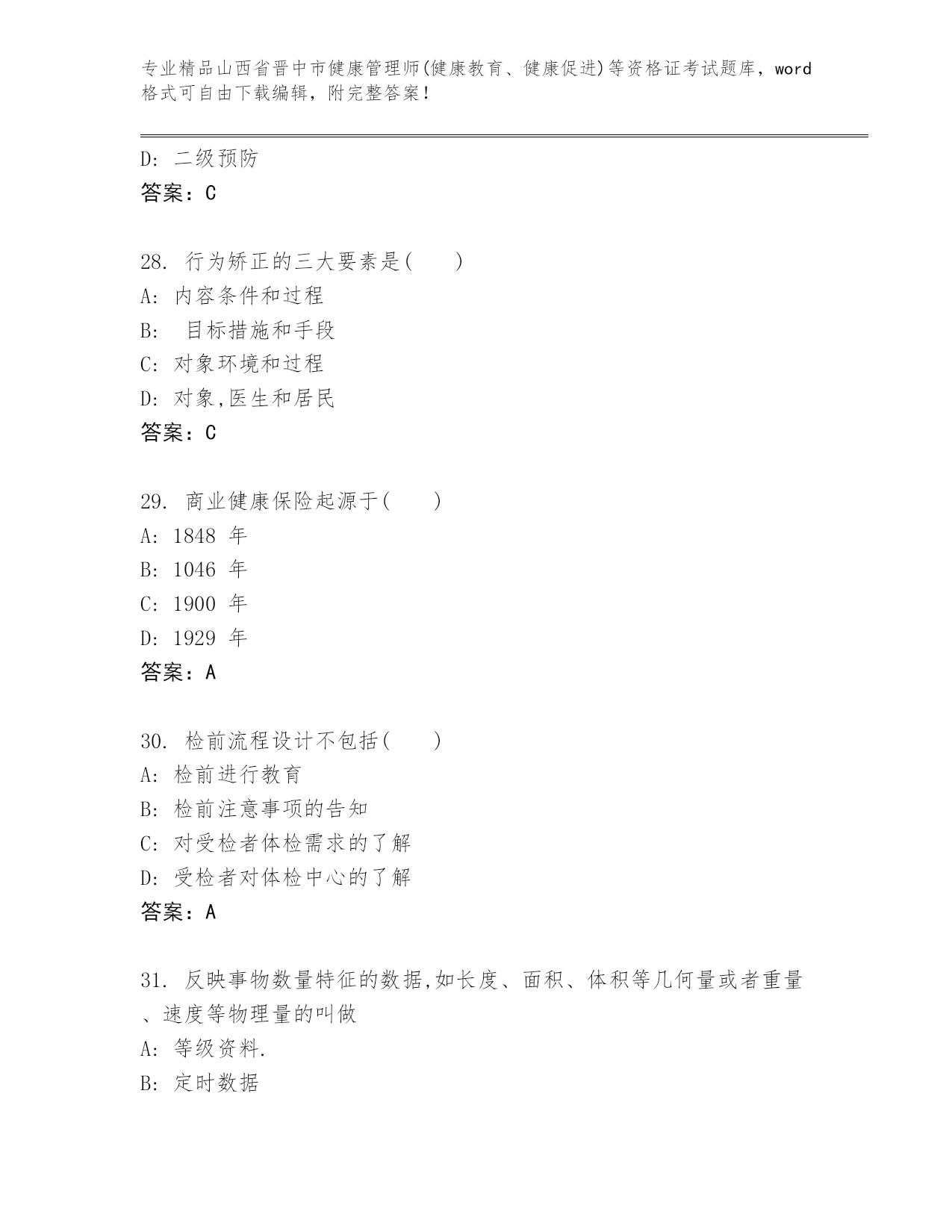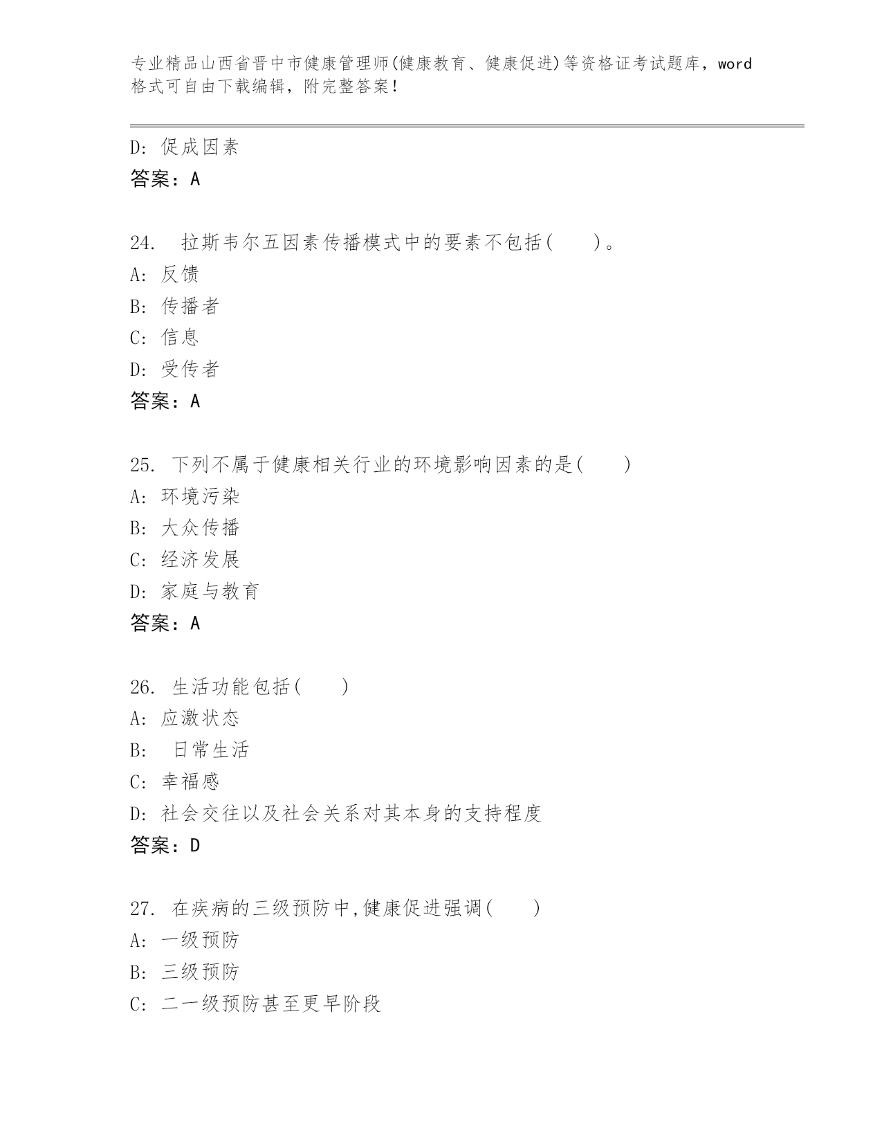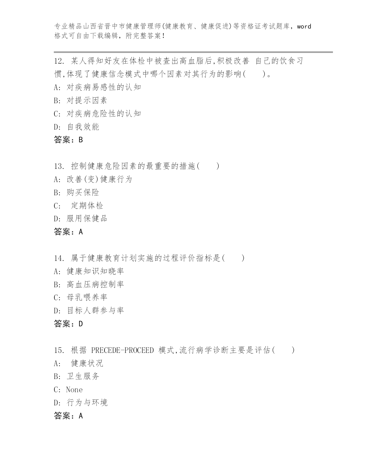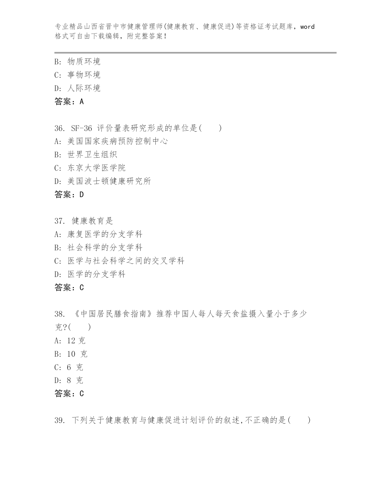 山西省晋中市健康管理师(健康教育、健康促进)等资格证考试完整题库【B卷】.docx