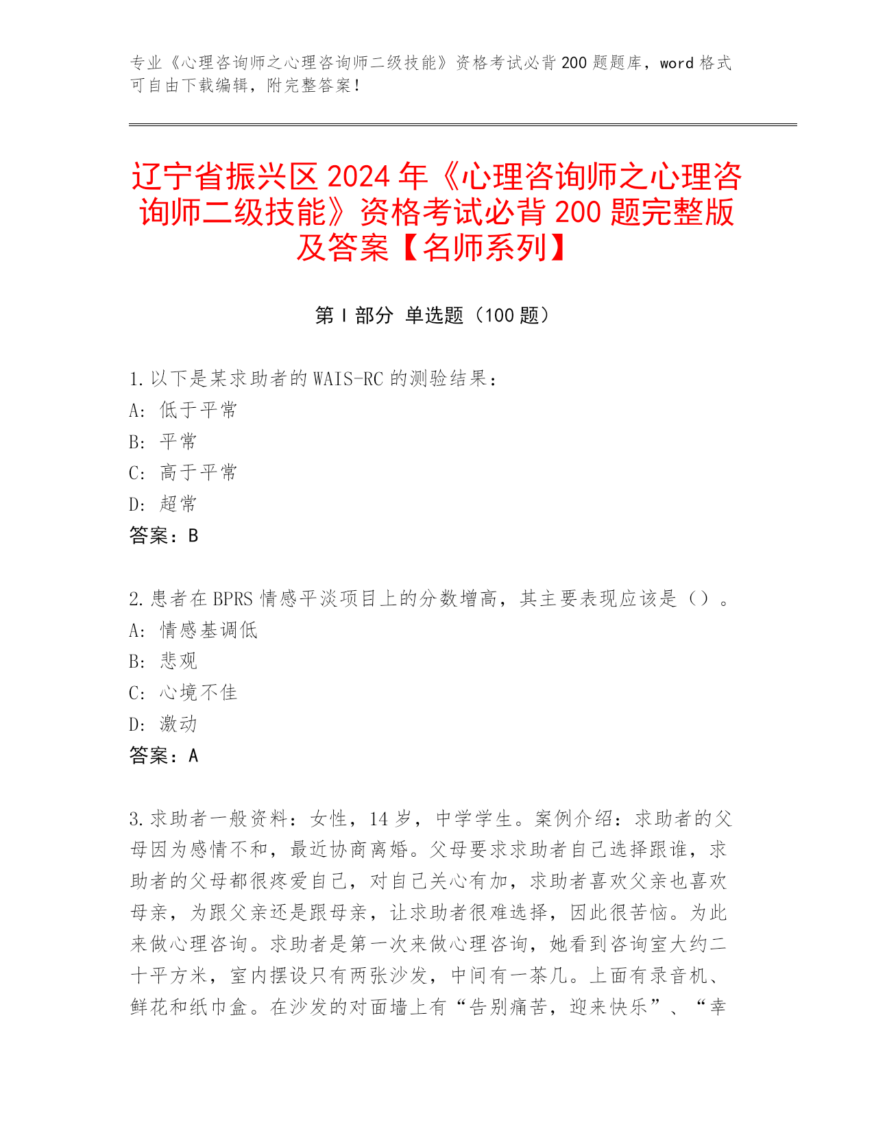 辽宁省黑山县2024《心理咨询师之心理咨询师二级技能》资格考试必背200题内部题库【名师系列】