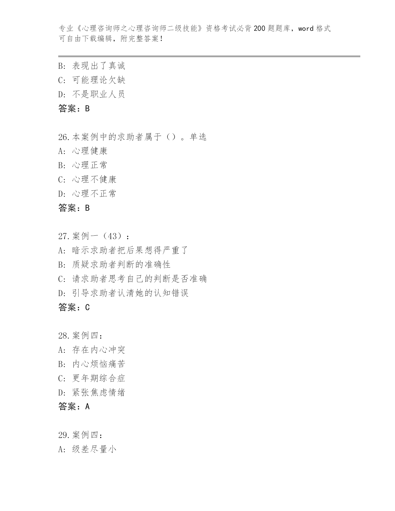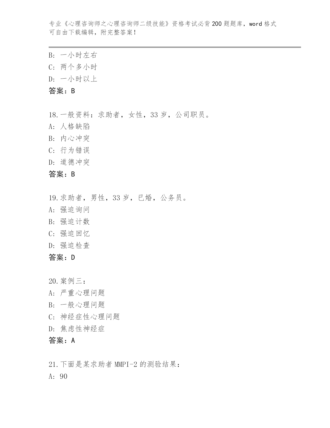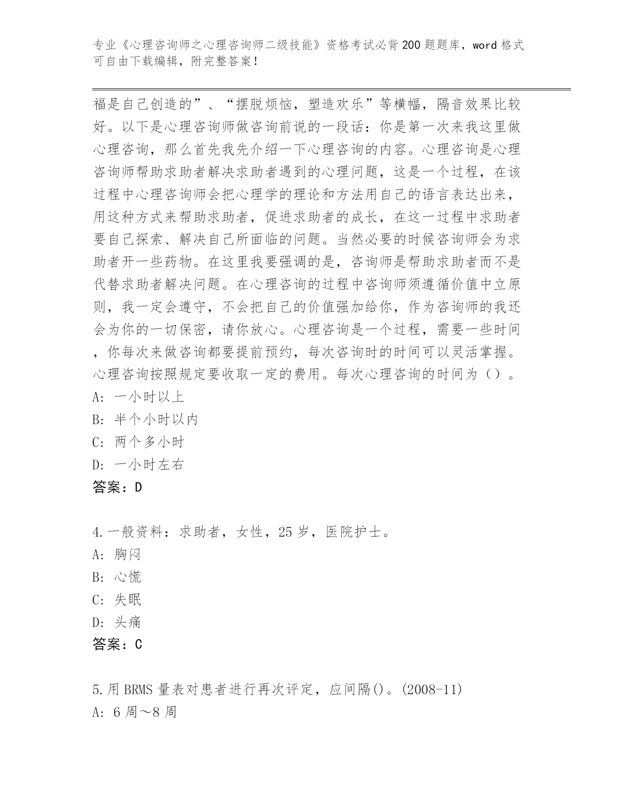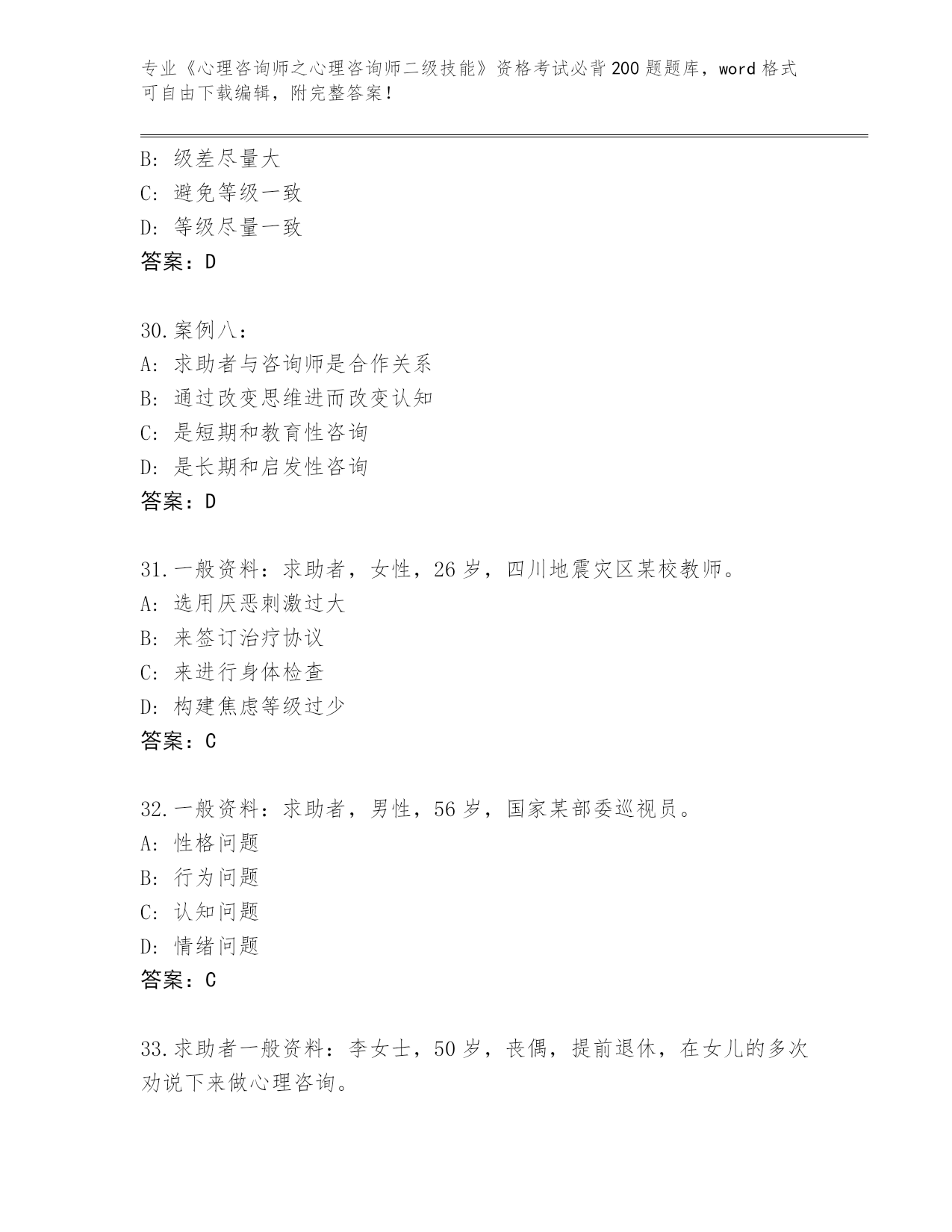 重庆市北碚区整理《心理咨询师之心理咨询师二级技能》资格考试必背200题完整版及答案【名师系列】