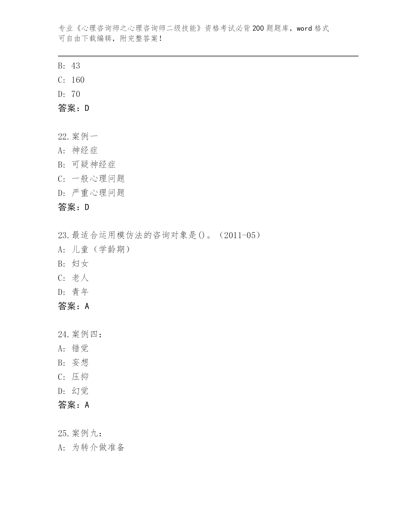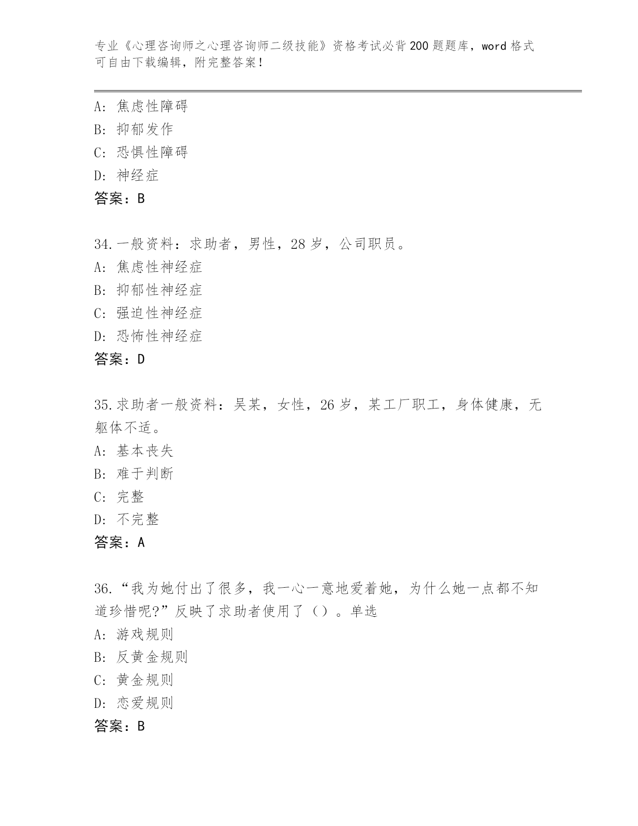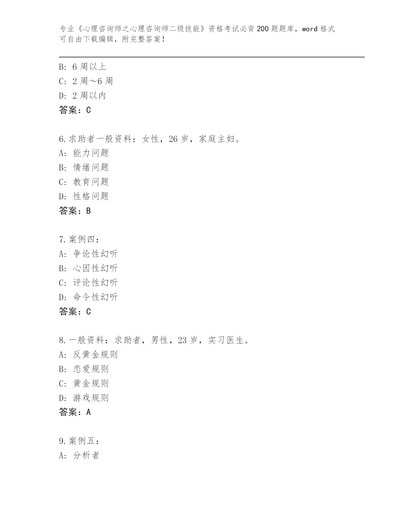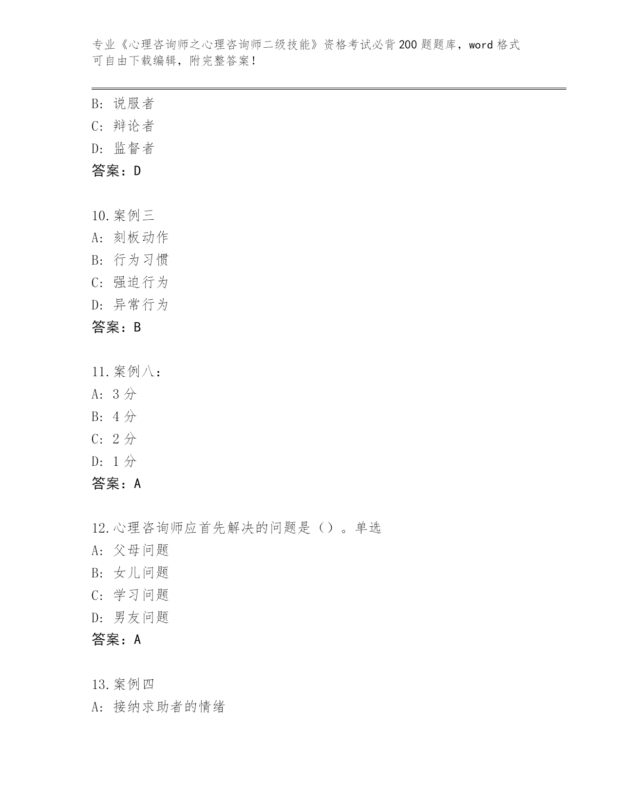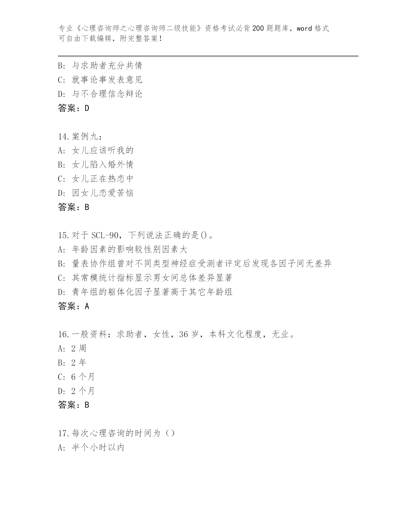 重庆市北碚区整理《心理咨询师之心理咨询师二级技能》资格考试必背200题完整版及答案【名师系列】