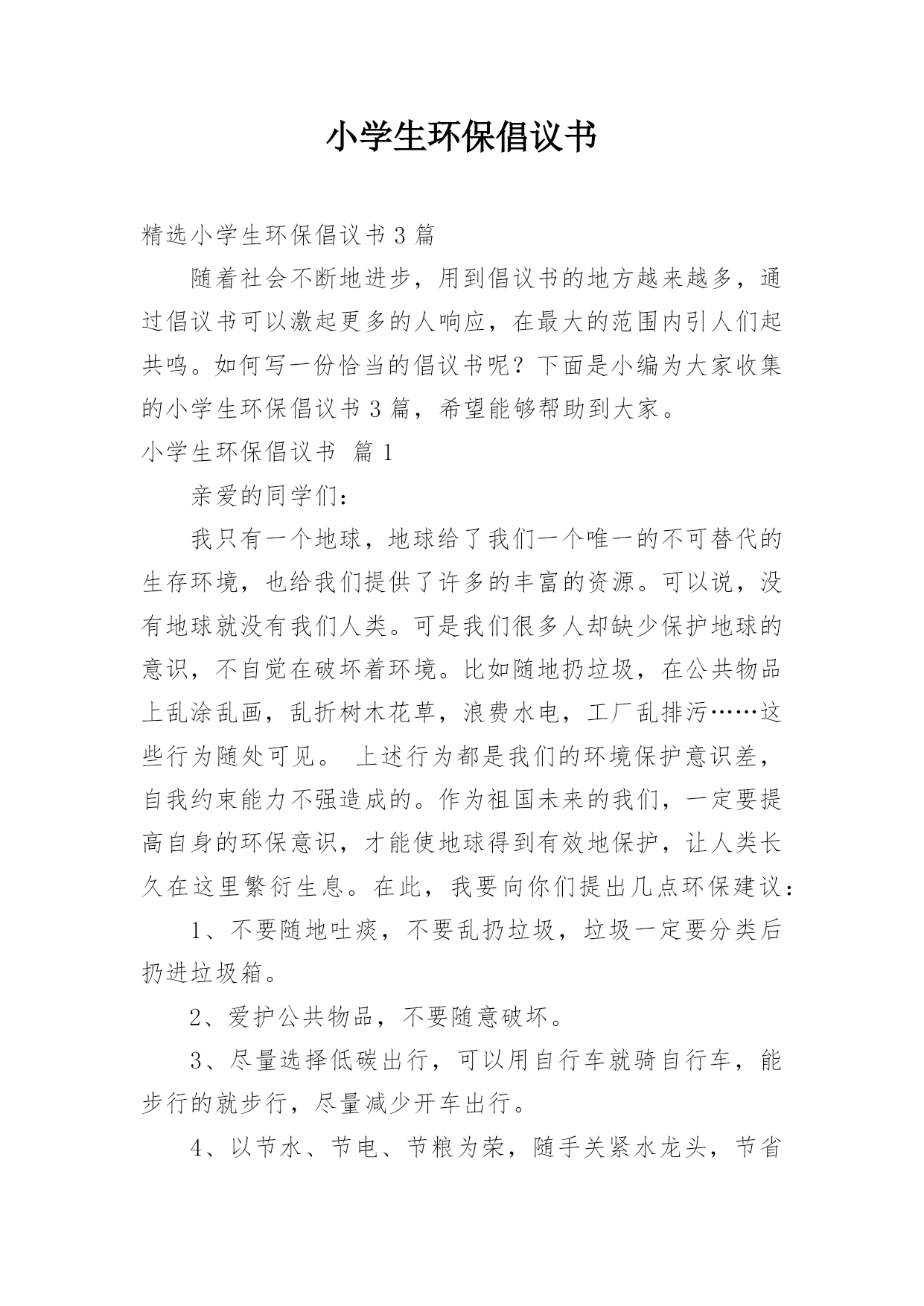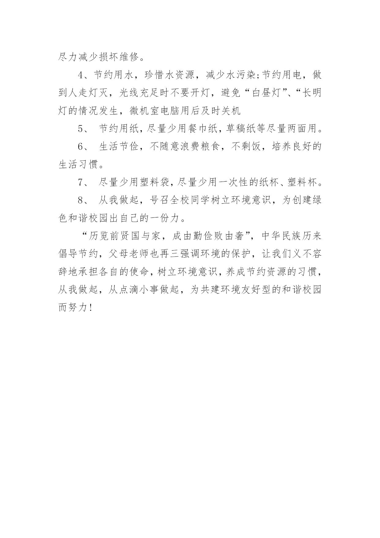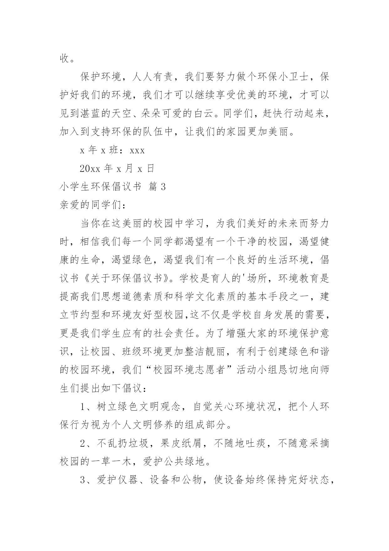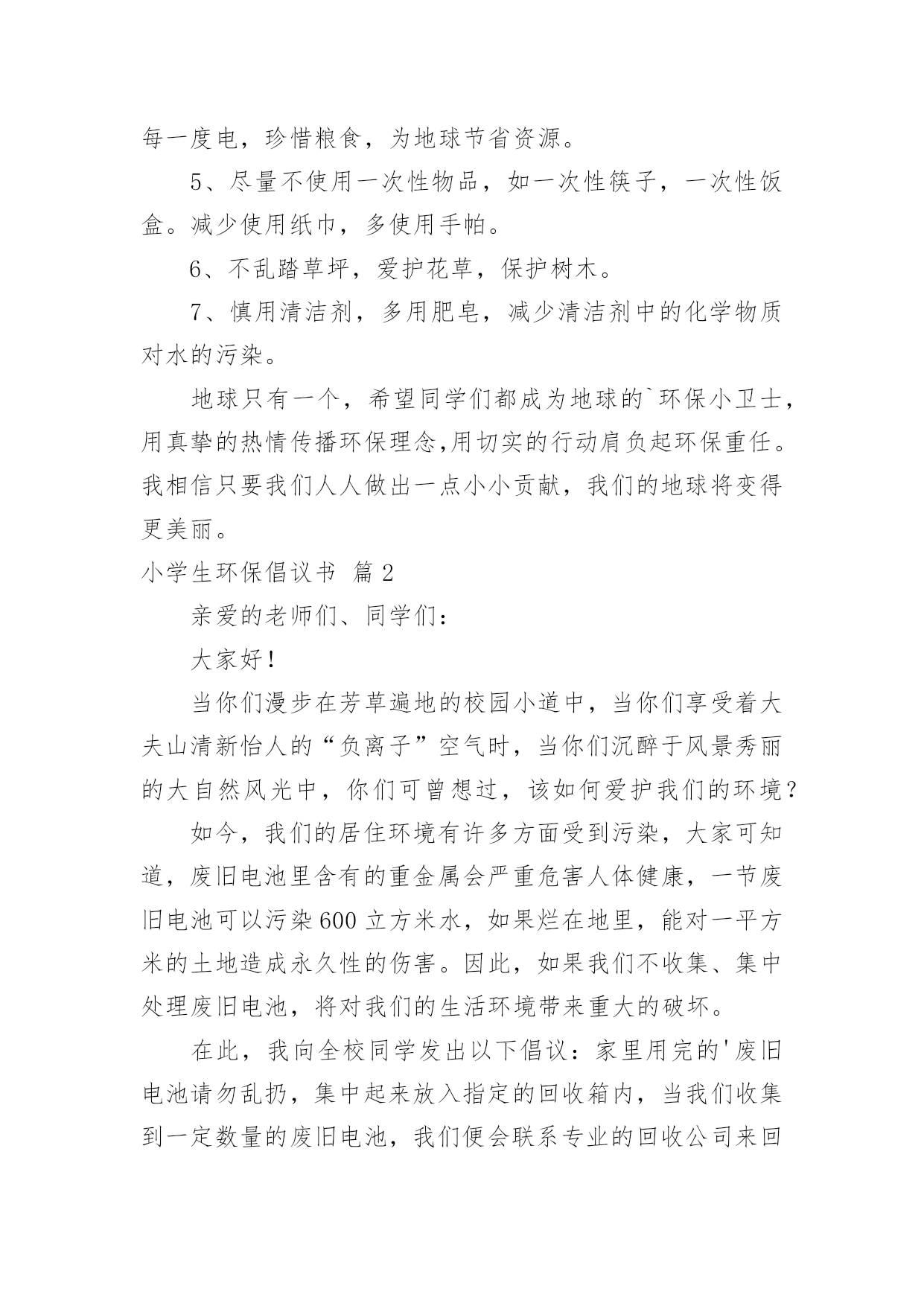 小学生环保倡议书精选小学生环保倡议书3篇随着社会不断地进步,用到倡议书的地方越来越多,通过倡议书可以激起更多的人响应,在最大的范围内引人们起共鸣。如何写一份恰当的倡议书呢?下面是小编为大家收集的小学生环保倡议书3篇,希望能够帮助到大家。小学生环保倡议书篇1亲爱的同学们:我只有一个地球,地球给了我们一个唯一的不可替代的生存环境,也给我们提供了许多的丰富的资源。可以说,没有地球就没有我们人类。可是我们很多人却缺少保护地球的意识,不自觉在破坏着环境。比如随地扔垃圾,在公共物品上乱涂乱画,乱折树木花草,浪费水电,工厂乱排污……这些行为随处可见。上述行为都是我们的环境保护意识差,自我约束能力不强造成的。作为祖国未来的我们,一定要提高自身的环保意识,才能使地球得到有效地保护,让人类长久在这里繁衍生息。在此,我要向你们提出几点环保建议:1、不要随地吐痰,不要乱扔垃圾,垃圾一定要分类后扔进垃圾箱。2、爱护公共物品,不要随意破坏。3、尽量选择低碳出行,可以用自行车就骑自行车,能步行的就步行,尽量减少开车出行。4、以节水、节电、节粮为荣,随手关紧水龙头,节省每一度电,珍惜粮食,为地球节省资源。5、尽量不使用一次性物品,如一次性筷子,一次性饭盒。减少使用纸巾,多使用手帕。6、不乱踏草坪,爱护花草,保护树木。7、慎用清洁剂,多用肥皂,减少清洁剂中的化学物质对水的污染。地球只有一个,希望同学们都成为地球的`环保小卫士,用真挚的热情传播环保理念,用切实的行动肩负起环保重任。我相信只要我们人人做出一点小小贡献,我们的地球将变得更美丽。小学生环保倡议书篇2亲爱的老师们、同学们:大家好!当你们漫步在芳草遍地的校园小道中,当你们享受着大夫山清新怡人的“负离子”空气时,当你们沉醉于风景秀丽的大自然风光中,你们可曾想过,该如何爱护我们的环境?如今,我们的居住环境有许多方面受到污染,大家可知道,废旧电池里含有的重金属会严重危害人体健康,一节废旧电池可以污染600立方米水,如果烂在地里,能对一平方米的土地造成永久性的伤害。因此,如果我们不收集、集中处理废旧电池,将对我们的生活环境带来重大的破坏。在此,我向全校同学发出以下倡议:家里用完的'废旧电池请勿乱扔,集中起来放入指定的回收箱内,当我们收集到一定数量的废旧电池,我们便会联系专业的回收公司来回收。保护环境,人人有责,我们要努力做个环保小卫士,保护好我们的环境,我们才可以继续享受优美的环境,才可以见到湛蓝的天空、朵朵可爱的白云。同学们,赶快行动起来,加入到支持环保的队伍中,让我们的家园更加美丽。x年x班:xxx20xx年x月x日小学生环保倡议书篇3亲爱的同学们:当你在这美丽的校园中学习,为我们美好的未来而努力时,相信我们每一个同学都渴望有一个干净的校园,渴望健康的生命,渴望绿色,渴望我们有一个良好的生活环境,倡议书《关于环保倡议书》。学校是育人的'场所,环境教育是提高我们思想道德素质和科学文化素质的基本手段之一,建立节约型和环境友好型校园,这不仅是学校自身发展的需要,更是我们学生应有的社会责任。为了增强大家的环境保护意识,让校园、班级环境更加整洁靓丽,有利于创建绿色和谐的校园环境,我们“校园环境志愿者”活动小组恳切地向师生们提出如下倡议:1、树立绿色文明观念,自觉关心环境状况,把个人环保行为视为个人文明修养的组成部分。2、不乱扔垃圾,果皮纸屑,不随地吐痰,不随意采摘校园的一草一木,爱护公共绿地。3、爱护仪器、设备和公物,使设备始终保持完好状态,尽力减少损坏维修。4、节约用水,珍惜水资源,减少水污染;节约用电,做到人走灯灭,光线充足时不要开灯,避免“白昼灯”、“长明灯的情况发生,微机室电脑用后及时关机5、节约用纸,尽量少用餐巾纸,草稿纸等尽量两面用。6、生活节俭,不随意浪费粮食,不剩饭,培养良好的生活习惯。7、尽量少用塑料袋,尽量少用一次性的纸杯、塑料杯。8、从我做起,号召全校同学树立环境意识,为创建绿色和谐校园出自己的一份力。“历览前贤国与家,成由勤俭败由奢”,中华民族历来倡导节约,父母老师也再三强调环境的保护,让我们义不容辞地承担各自的使命,树立环境意识,养成节约资源的习惯,从我做起,从点滴小事做起,为共建环境友好型的和谐校园而努力!