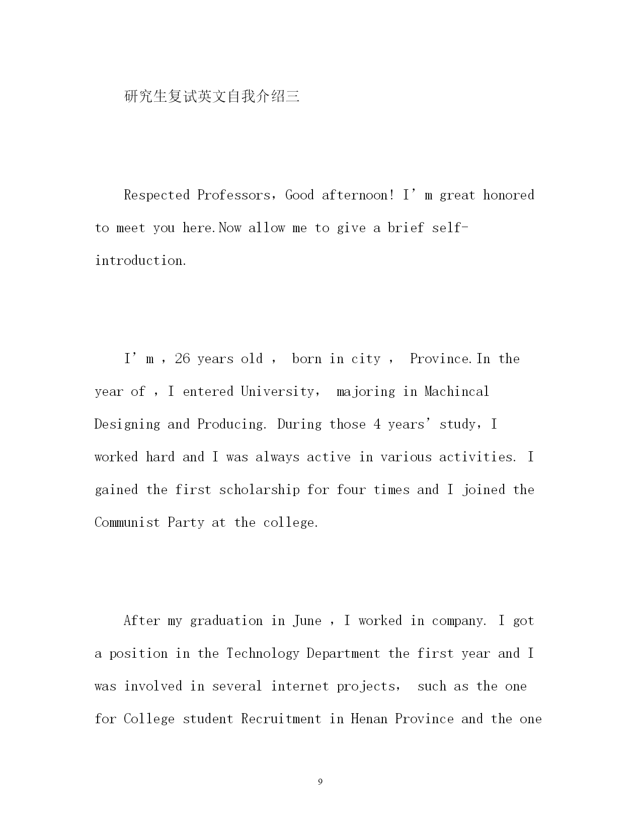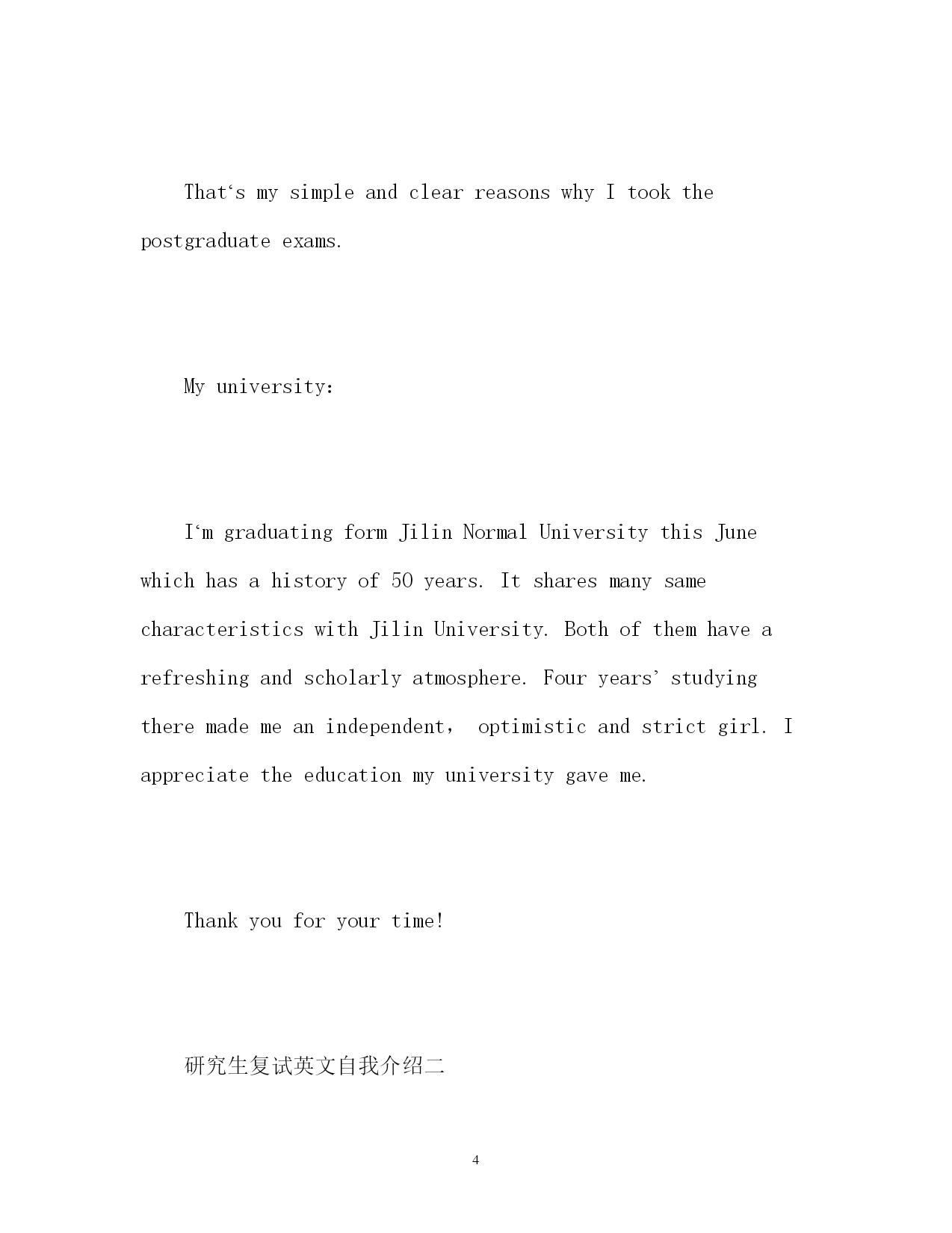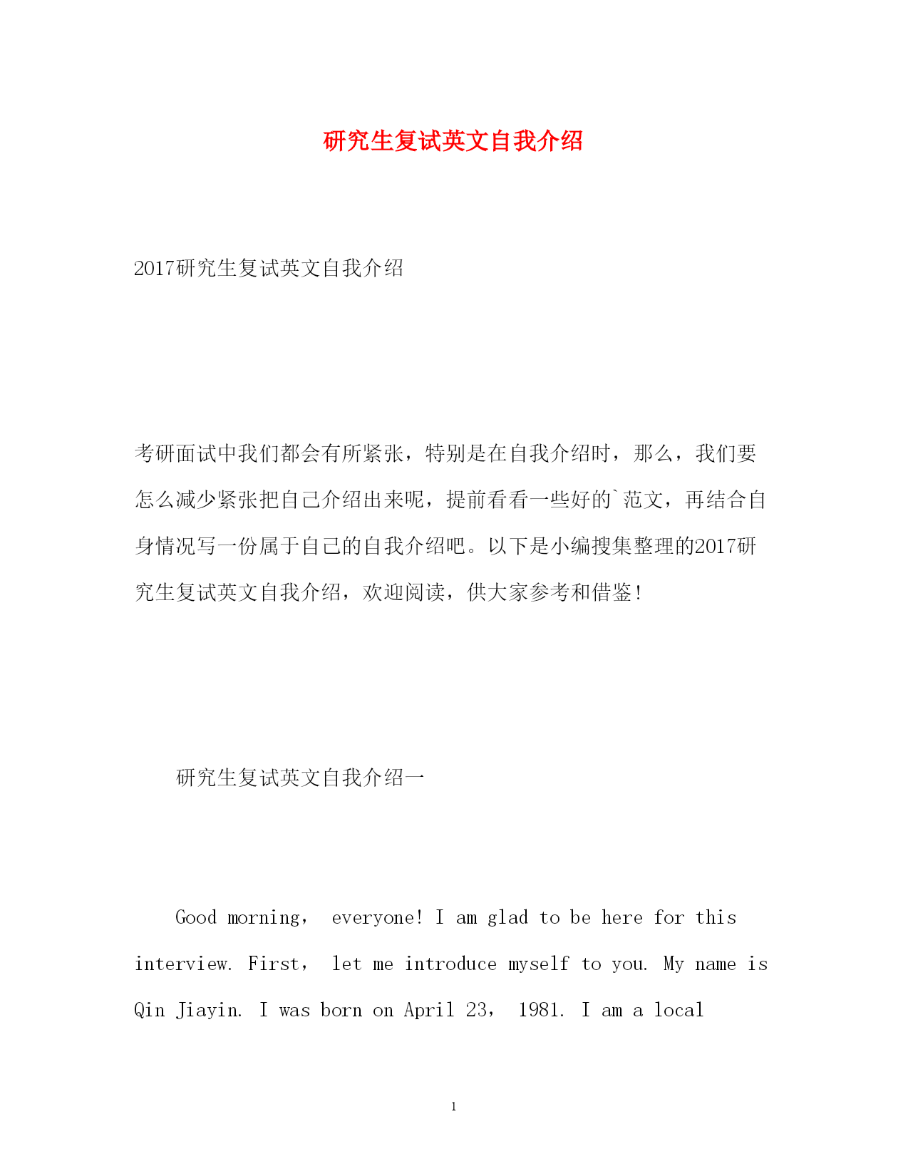 此资料由网络收集而来,如有侵权请告知上传者立即删除。资料共分享,我们负责传递知识。PAGEPAGE15研究生复试英文自我介绍2017研究生复试英文自我介绍考研面试中我们都会有所紧张,特别是在自我介绍时,那么,我们要怎么减少紧张把自己介绍出来呢,提前看看一些好的`范文,再结合自身情况写一份属于自己的自我介绍吧。以下是小编搜集整理的2017研究生复试英文自我介绍,欢迎阅读,供大家参考和借鉴!研究生复试英文自我介绍一Goodmorning,everyone!Iamgladtobehereforthisinterview.First,letmeintroducemyselftoyou.MynameisQinJiayin.IwasbornonApril23,1981.Iamalocalperson.IamgraduatingfromJilinNormalUniversitythisJune.ImajorinChineseliterature.IhopeIcouldgettheopportunitytofinishmypostgraduatecoursesinJilinUniversitywhichIhavedesiredforalongtime.IhavetheconfidencebecauseIhavesuchability!Iamagirlwhoisfervent,outgoingandcreative.Atthesametime,IthinkIamquickinmindandcarefulineverything.Iamlookingforwardtomypostgraduatestudiesandlife.Iwillsoonprovethatyourdecisionofchoosingmeisthewisest.Thankyouforgivingmesuchavaluableopportunity!Reasonsfortakingpostgraduateexams:Firstofall,Ilovemymajor.ChineseliteratureisthesymbolofthestartofChineseliterarymodernization.Itplaysanimportantpartinmodernizationofourcitizens‘thoughts.What’smore,modernliteratureisveryclosetoourdailylifeanditcandeeplyreflectthestylesandfeaturesofoursociety.Iamfascinatedbythegreatmasters‘refreshingorwarmorprofoundstylesaswell.ButIamnoteasilysatisfiedwithsuchsuperficialknowledge.IhopeIcouldhaveabetterunderstandinginmodernliteraturebystudyingfurther.Thisisaveryimportantreasonformetotakethepostgraduateexams.Next,Ilovethefeelingintheuniversity.Itisfullofyouthfulspirit.AndIamdeeplyattractedbythescholarlyatmosphere.Andthemostimportant,it‘smygreathonortoopenmyearstoyourteaching.Finally,Iwanttotalkaboutaverypracticalproblem.Thatismydreamofbecomingateacherintheuniversity.Iwanttorealizemydreamandmakemyselftobeawell-qualifiedperson.Ithinkthepostgraduatestudiescanenrichmyknowledgeandmakemecompetentinmyfuturejob.That‘smysimpleandclearreasonswhyItookthepostgraduateexams.Myuniversity:I‘mgraduatingformJilinNormalUniversitythisJunewhichhasahistoryof50years.ItsharesmanysamecharacteristicswithJilinUniversity.Bo