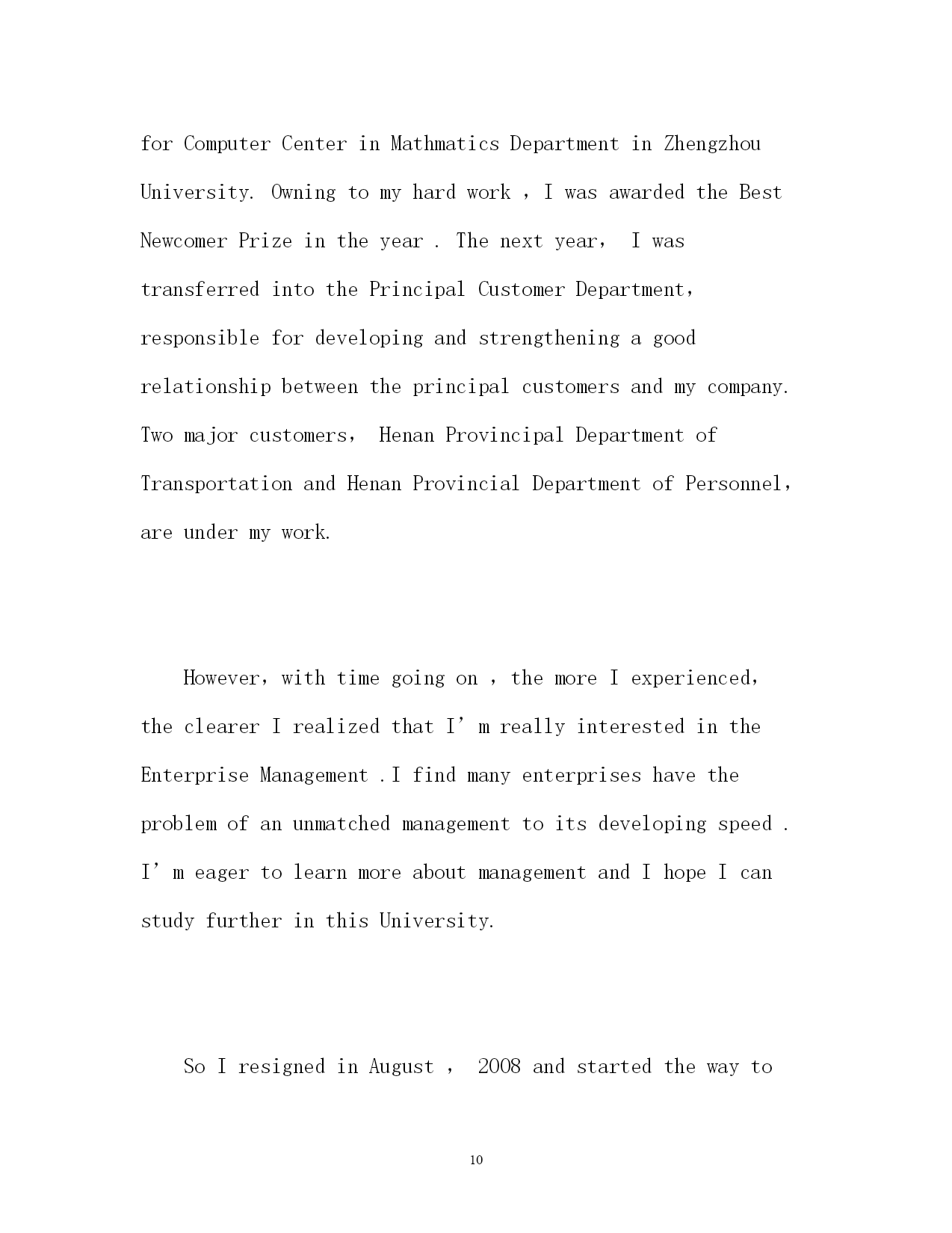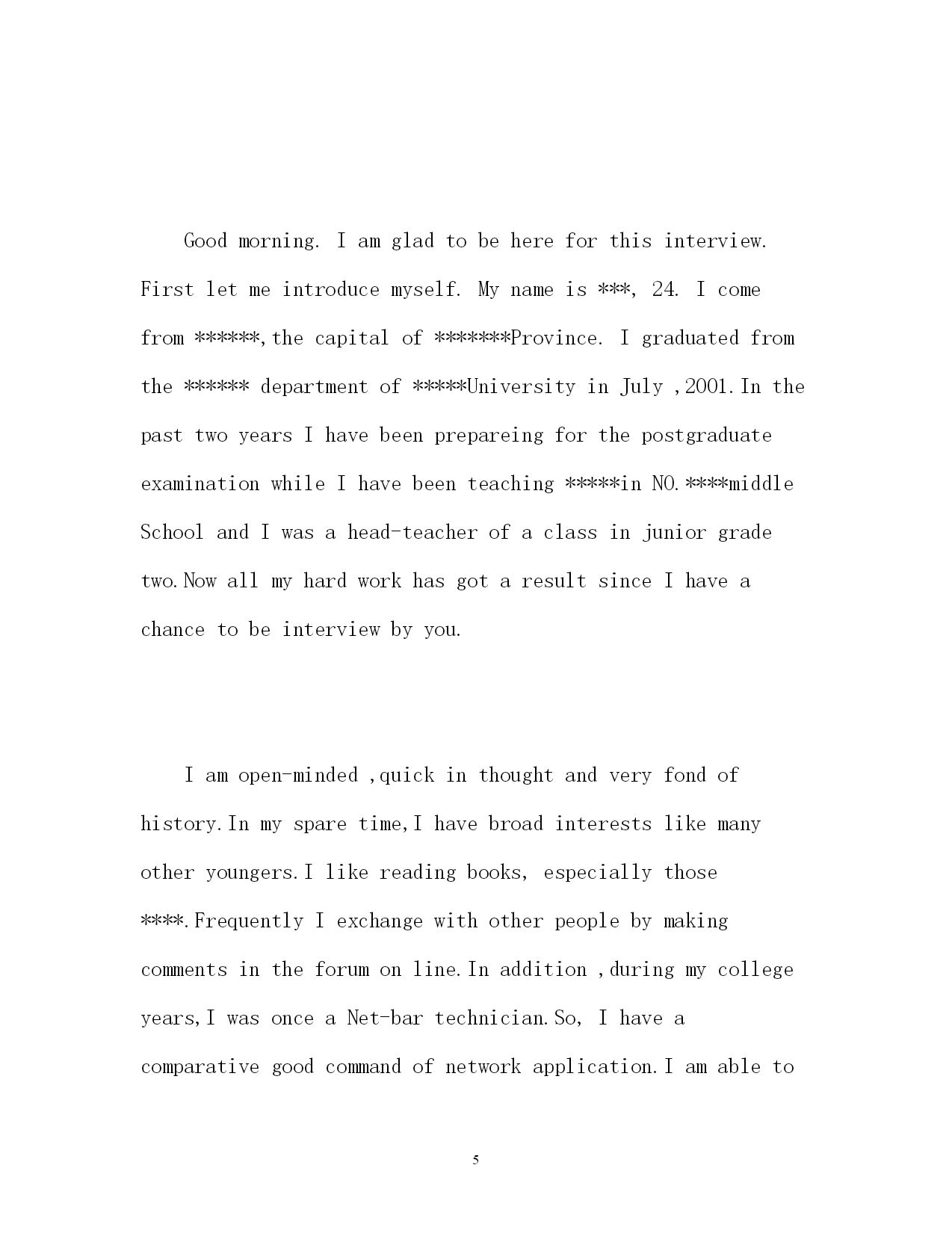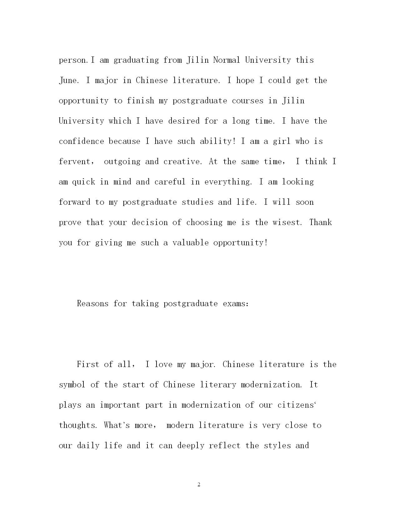 此资料由网络收集而来,如有侵权请告知上传者立即删除。资料共分享,我们负责传递知识。PAGEPAGE15研究生复试英文自我介绍2017研究生复试英文自我介绍考研面试中我们都会有所紧张,特别是在自我介绍时,那么,我们要怎么减少紧张把自己介绍出来呢,提前看看一些好的`范文,再结合自身情况写一份属于自己的自我介绍吧。以下是小编搜集整理的2017研究生复试英文自我介绍,欢迎阅读,供大家参考和借鉴!研究生复试英文自我介绍一Goodmorning,everyone!Iamgladtobehereforthisinterview.First,letmeintroducemyselftoyou.MynameisQinJiayin.IwasbornonApril23,1981.Iamalocalperson.IamgraduatingfromJilinNormalUniversitythisJune.ImajorinChineseliterature.IhopeIcouldgettheopportunitytofinishmypostgraduatecoursesinJilinUniversitywhichIhavedesiredforalongtime.IhavetheconfidencebecauseIhavesuchability!Iamagirlwhoisfervent,outgoingandcreative.Atthesametime,IthinkIamquickinmindandcarefulineverything.Iamlookingforwardtomypostgraduatestudiesandlife.Iwillsoonprovethatyourdecisionofchoosingmeisthewisest.Thankyouforgivingmesuchavaluableopportunity!Reasonsfortakingpostgraduateexams:Firstofall,Ilovemymajor.ChineseliteratureisthesymbolofthestartofChineseliterarymodernization.Itplaysanimportantpartinmodernizationofourcitizens‘thoughts.What’smore,modernliteratureisveryclosetoourdailylifeanditcandeeplyreflectthestylesandfeaturesofoursociety.Iamfascinatedbythegreatmasters‘refreshingorwarmorprofoundstylesaswell.ButIamnoteasilysatisfiedwithsuchsuperficialknowledge.IhopeIcouldhaveabetterunderstandinginmodernliteraturebystudyingfurther.Thisisaveryimportantreasonformetotakethepostgraduateexams.Next,Ilovethefeelingintheuniversity.Itisfullofyouthfulspirit.AndIamdeeplyattractedbythescholarlyatmosphere.Andthemostimportant,it‘smygreathonortoopenmyearstoyourteaching.Finally,Iwanttotalkaboutaverypracticalproblem.Thatismydreamofbecomingateacherintheuniversity.Iwanttorealizemydreamandmakemyselftobeawell-qualifiedperson.Ithinkthepostgraduatestudiescanenrichmyknowledgeandmakemecompetentinmyfuturejob.That‘smysimpleandclearreasonswhyItookthepostgraduateexams.Myuniversity:I‘mgraduatingformJilinNormalUniversitythisJunewhichhasahistoryof50years.ItsharesmanysamecharacteristicswithJilinUniversity.Bo