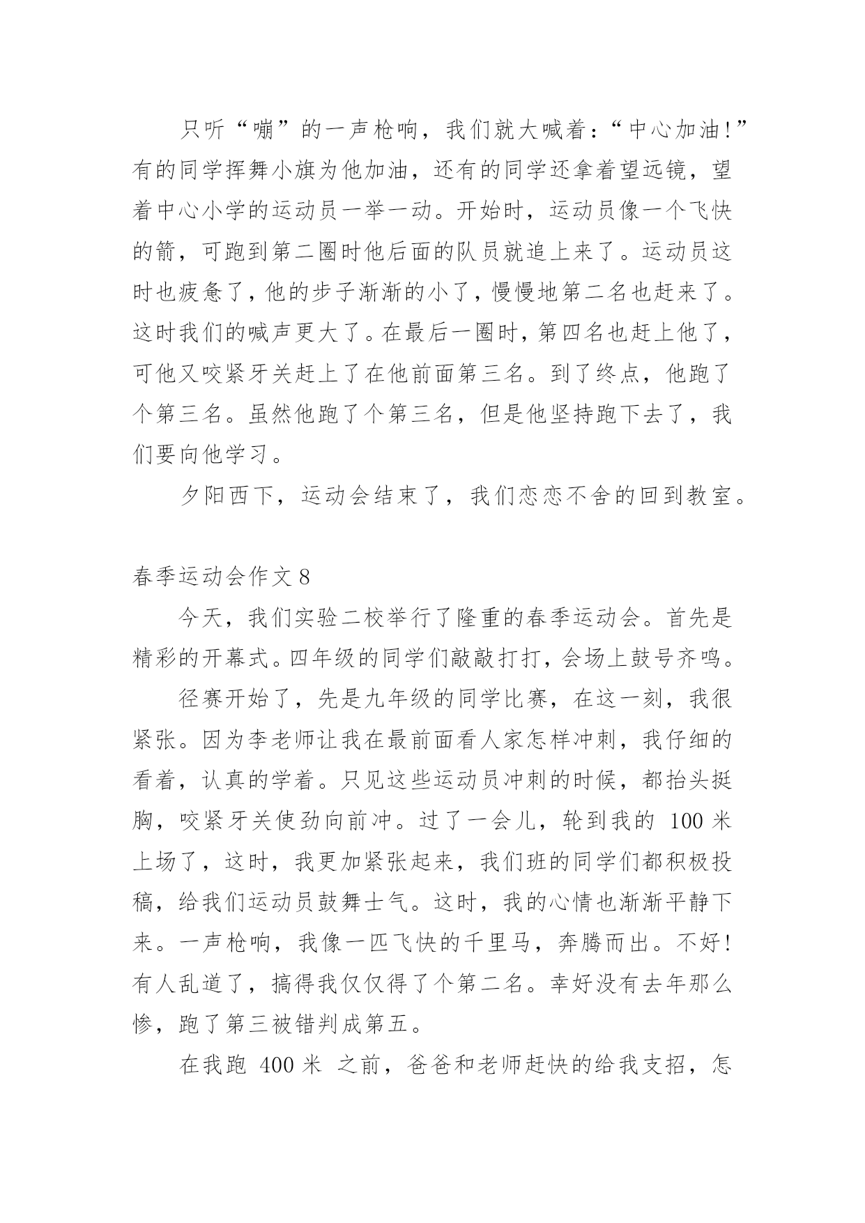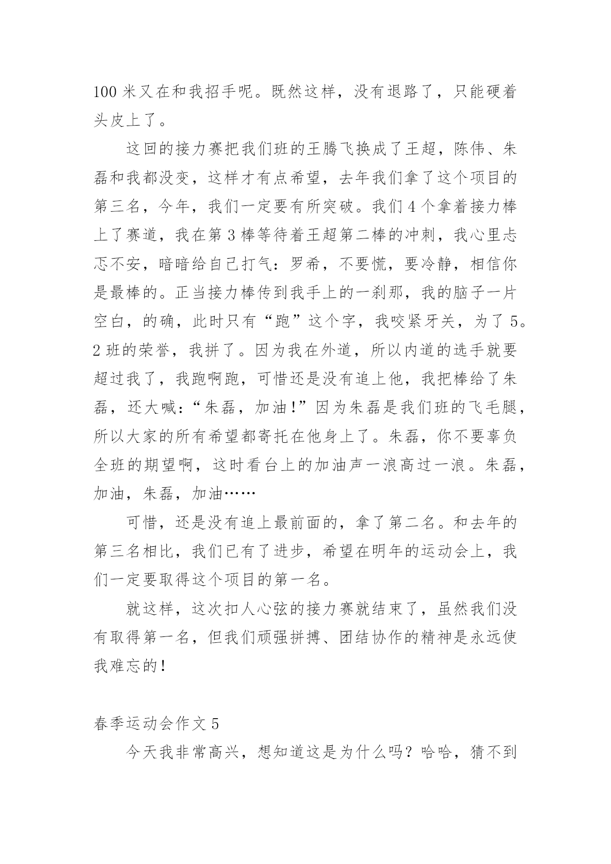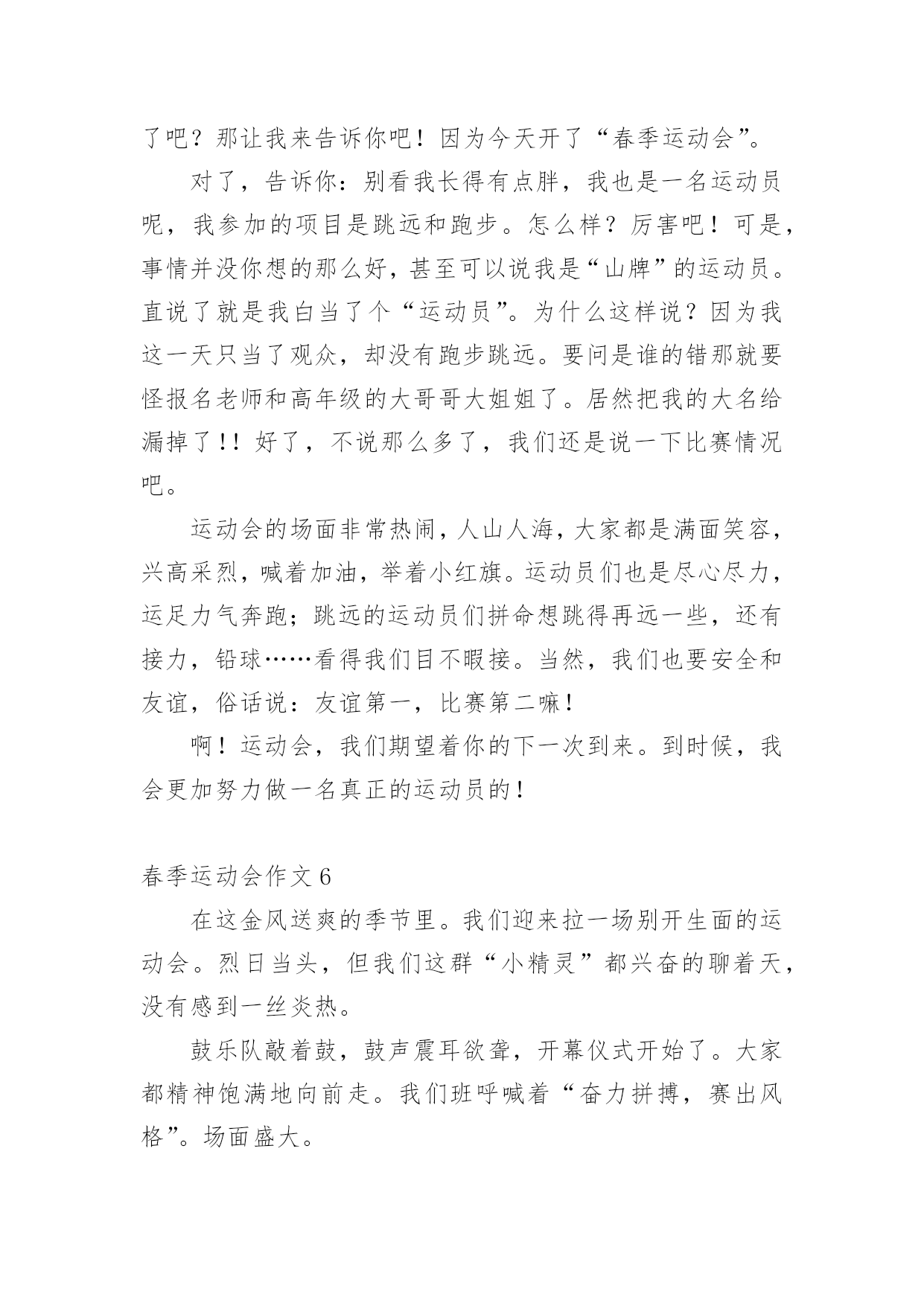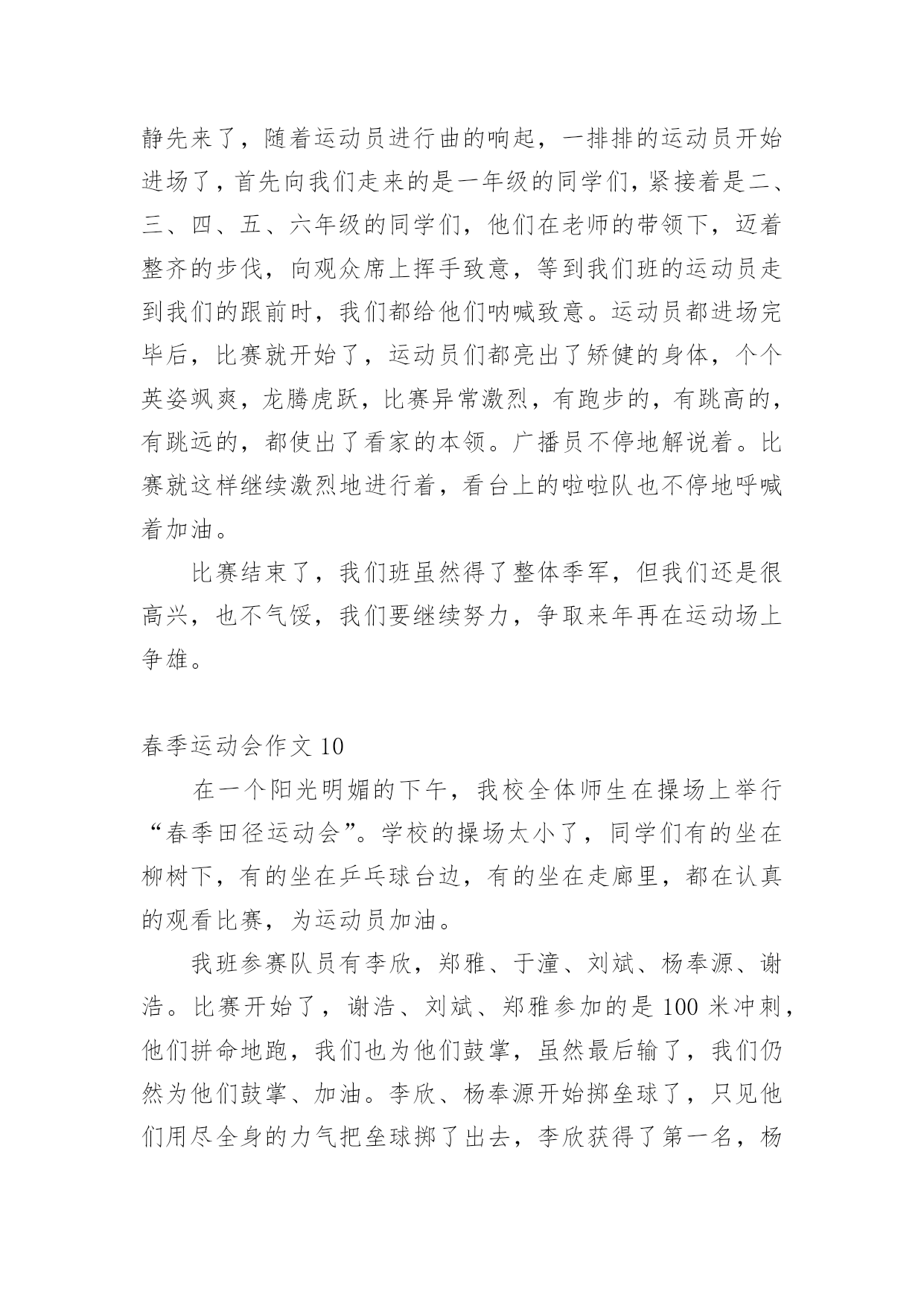 春季运动会作文春季运动会作文1今天,是3月里最高兴的一天,因为今天是春季运动会。我来到学校,好多同学已经来了。他们拿着座垫、水,一副整装待发的样子;再看看运动员,他们信心十足、精神饱满,一看就知道“万事俱备,只欠东风”了。同学们都到齐了,老师也来了。我们离开教室,排着整齐的队伍,有秩序的进入操场。操场上已经有很多别班的同学,我们站好后,校长讲了一段话,比赛正式开始了。老师点名了,“飞毛腿”张恒宇站在起跑线上,看起来胸有成竹。只听“砰——”的一声,张恒宇弦的箭一样飞驰向终点线。我们异口同声的喊:“加油!加油!”张恒宇听了,跑得更快了,快到终点时,我的心都提到嗓子眼了,生怕别人超越他……终于到终点了,耶!张恒宇第一名。我们真为他骄傲。紧接着是女子跑步,又听到“砰——”的一声,我们班的韩莉丽跑得飞快,一下子就把别人甩了好几米,看来我们班势在必得。接着是扔垒球,遂柠扔了20多米,我们特别高兴,怪不得我们班被称为“体育班级”……运动会在精彩的比赛中结束了,我们恋恋不舍地离开了操场。春季运动会作文2四月三日,在我校举行了春季田径运动会。今天天气晴朗,操场上高大挺拔的杨树刚刚吐出嫩绿的叶子,小花园里的桃树也开出了可爱的花朵。8:30分,伴随着运动员进行曲我们迈着整齐有力的步伐,走着方队进入操场。检阅完毕后,张校长宣布“20xx年春季田径运动会现在开始。”只见操场上的运动员们个个摩拳擦掌、蓄势待发。操场边上的同学们整齐地围成一圈观看比赛,就连附近的幼儿园的小朋友也来加油助阵了。周围的观众们热血沸腾,比赛场面紧张而又激烈地进行着。在最吸引人的400米跑步当中,我们三。三班派出的是贺梦瑀和王伟杰两位素有“飞毛腿”之称的“大将”,老师对他们非常放心。比赛开始了,他们两人犹如离弦之箭一样冲了出去。运动员们你追我赶,谁也不让谁,时间一秒一秒过去了,终点就在眼前,精疲力尽的他们再次听到我们的呐喊声浑身有了无穷的力量,向终点冲去,最终他们取得了第一名和第二名的好成绩!我们沸腾了,操场上沸腾了!春季运动会在团结和友爱的气氛中接近了尾声。西落的太阳洒在我们兴奋的脸上脸上,我们都在期盼下次运动会早点到来。春季运动会作文3星期五,阳光明媚,万里无云,可就是火辣辣的太阳特别烦人。就在今天,我们举行了“第六届春季运动会”。一大早,同学们有的在为自己加油鼓劲儿,有的在做最后一次练习,老师们有的在安排场地,有的在说:“我们班肯定能拿到第一!”老师和同学们忙的不亦乐乎,霎时间,操场上变得热闹非凡。操场上突然响起熟悉声,那是“运动进行曲”。我们有条有序的排好了队。每个人都迈着自己矫健的身姿和轻快的步伐向前走去,雄赳赳,气昂昂。开幕式一结束,操场上便乱了起来,有的再告诉某些运动员快点去跑步,有的'在和别人谈起了游戏,有的在跟自己的敌人说:“我一定会超过你的。”只听裁判员“砰”的一声枪响,比赛开始了。我大吃一惊,那是全校永争第一的一个同学,他的外号叫作“小飞机”。不过我们班的人不甘示弱,加速了起来,想超过他,可是还是让他得了第一。到了下午,我们的跑步健将胡绚瑜来了,他加足了劲儿,以飞机般的速度,超过了他,获得了第一。紧接着,我们班又获得了第一,一个、两个、三个……最后,我们获得了全班第一,得到了一张奖状,这不仅是一张普通的奖状,而是一张用我们班运动员汗水挣来的奖状。春季运动会作文4今年的运动会我们大部分都还是原来的项目,你瞧,4×100米又在和我招手呢。既然这样,没有退路了,只能硬着头皮上了。这回的接力赛把我们班的王腾飞换成了王超,陈伟、朱磊和我都没变,这样才有点希望,去年我们拿了这个项目的第三名,今年,我们一定要有所突破。我们4个拿着接力棒上了赛道,我在第3棒等待着王超第二棒的冲刺,我心里忐忑不安,暗暗给自己打气:罗希,不要慌,要冷静,相信你是最棒的。正当接力棒传到我手上的一刹那,我的脑子一片空白,的确,此时只有“跑”这个字,我咬紧牙关,为了5。2班的荣誉,我拼了。因为我在外道,所以内道的选手就要超过我了,我跑啊跑,可惜还是没有追上他,我把棒给了朱磊,还大喊:“朱磊,加油!”因为朱磊是我们班的飞毛腿,所以大家的所有希望都寄托在他身上了。朱磊,你不要辜负全班的期望啊,这时看台上的加油声一浪高过一浪。朱磊,加油,朱磊,加油……可惜,还是没有追上最前面的,拿了第二名。和去年的第三名相比,我们已有了进步,希望在明年的运动会上,我们一定要取得这个项目的第一名。就这样,这次扣人心弦的接力赛就结束了,虽然我们没有取得第一名,但我们顽强拼搏、团结协作的精神是永远使我难忘的!春季运动会作文5今天我非常高兴,想知道这是为什么吗?哈哈,猜不到了吧?那让我来告诉你吧!因为今天开了“春季运动会”。对了,告诉你:别看我长得有点胖,我也是一名运动员呢,我参加的项目是跳远和跑步。怎么样?厉害吧!可是,事情