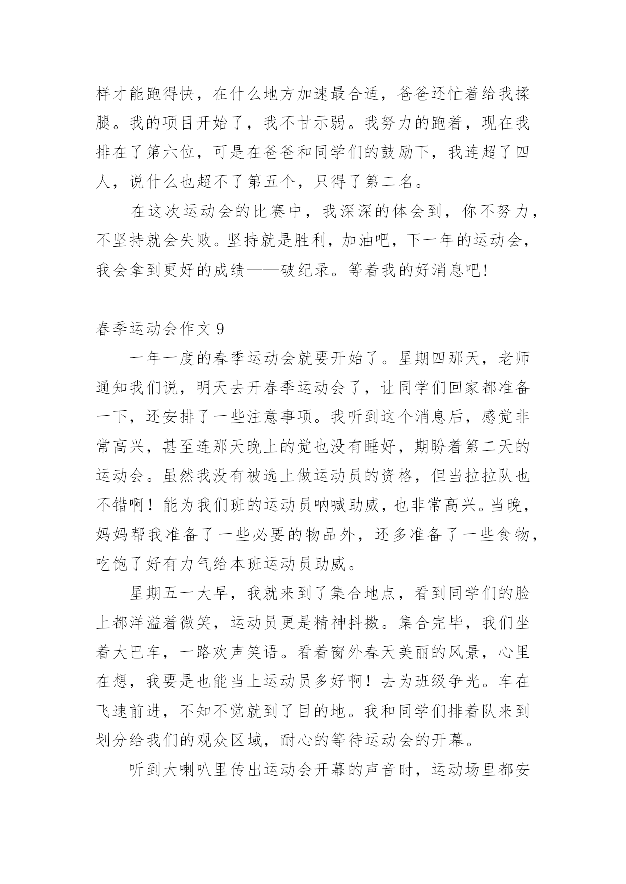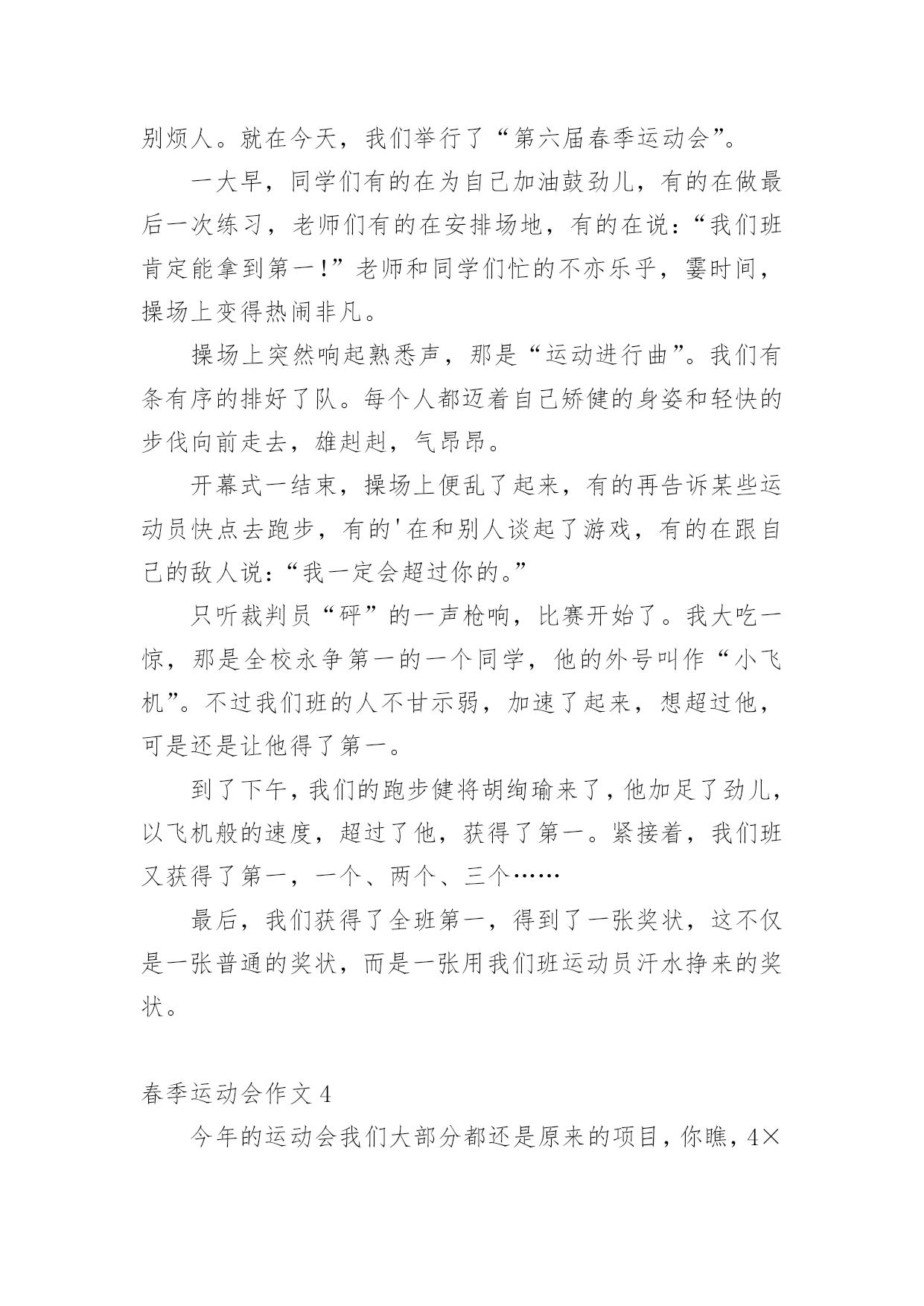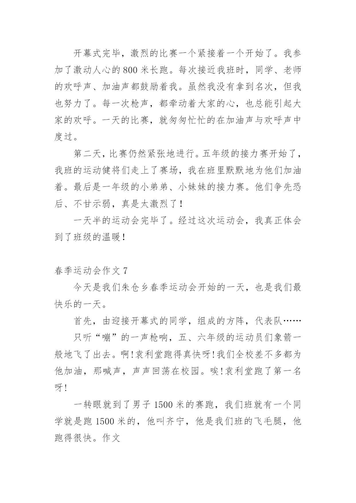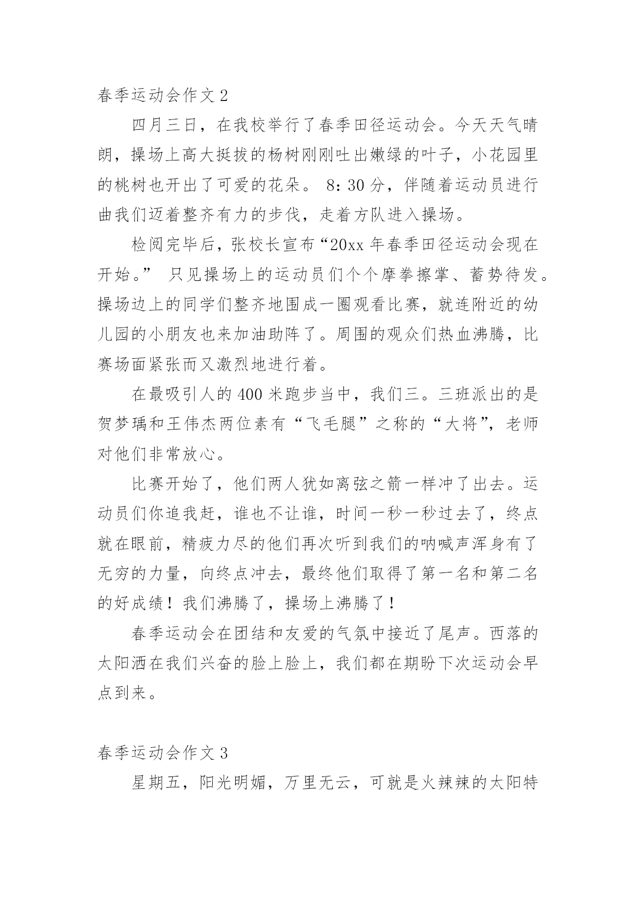 春季运动会作文春季运动会作文1今天,是3月里最高兴的一天,因为今天是春季运动会。我来到学校,好多同学已经来了。他们拿着座垫、水,一副整装待发的样子;再看看运动员,他们信心十足、精神饱满,一看就知道“万事俱备,只欠东风”了。同学们都到齐了,老师也来了。我们离开教室,排着整齐的队伍,有秩序的进入操场。操场上已经有很多别班的同学,我们站好后,校长讲了一段话,比赛正式开始了。老师点名了,“飞毛腿”张恒宇站在起跑线上,看起来胸有成竹。只听“砰——”的一声,张恒宇弦的箭一样飞驰向终点线。我们异口同声的喊:“加油!加油!”张恒宇听了,跑得更快了,快到终点时,我的心都提到嗓子眼了,生怕别人超越他……终于到终点了,耶!张恒宇第一名。我们真为他骄傲。紧接着是女子跑步,又听到“砰——”的一声,我们班的韩莉丽跑得飞快,一下子就把别人甩了好几米,看来我们班势在必得。接着是扔垒球,遂柠扔了20多米,我们特别高兴,怪不得我们班被称为“体育班级”……运动会在精彩的比赛中结束了,我们恋恋不舍地离开了操场。春季运动会作文2四月三日,在我校举行了春季田径运动会。今天天气晴朗,操场上高大挺拔的杨树刚刚吐出嫩绿的叶子,小花园里的桃树也开出了可爱的花朵。8:30分,伴随着运动员进行曲我们迈着整齐有力的步伐,走着方队进入操场。检阅完毕后,张校长宣布“20xx年春季田径运动会现在开始。”只见操场上的运动员们个个摩拳擦掌、蓄势待发。操场边上的同学们整齐地围成一圈观看比赛,就连附近的幼儿园的小朋友也来加油助阵了。周围的观众们热血沸腾,比赛场面紧张而又激烈地进行着。在最吸引人的400米跑步当中,我们三。三班派出的是贺梦瑀和王伟杰两位素有“飞毛腿”之称的“大将”,老师对他们非常放心。比赛开始了,他们两人犹如离弦之箭一样冲了出去。运动员们你追我赶,谁也不让谁,时间一秒一秒过去了,终点就在眼前,精疲力尽的他们再次听到我们的呐喊声浑身有了无穷的力量,向终点冲去,最终他们取得了第一名和第二名的好成绩!我们沸腾了,操场上沸腾了!春季运动会在团结和友爱的气氛中接近了尾声。西落的太阳洒在我们兴奋的脸上脸上,我们都在期盼下次运动会早点到来。春季运动会作文3星期五,阳光明媚,万里无云,可就是火辣辣的太阳特别烦人。就在今天,我们举行了“第六届春季运动会”。一大早,同学们有的在为自己加油鼓劲儿,有的在做最后一次练习,老师们有的在安排场地,有的在说:“我们班肯定能拿到第一!”老师和同学们忙的不亦乐乎,霎时间,操场上变得热闹非凡。操场上突然响起熟悉声,那是“运动进行曲”。我们有条有序的排好了队。每个人都迈着自己矫健的身姿和轻快的步伐向前走去,雄赳赳,气昂昂。开幕式一结束,操场上便乱了起来,有的再告诉某些运动员快点去跑步,有的'在和别人谈起了游戏,有的在跟自己的敌人说:“我一定会超过你的。”只听裁判员“砰”的一声枪响,比赛开始了。我大吃一惊,那是全校永争第一的一个同学,他的外号叫作“小飞机”。不过我们班的人不甘示弱,加速了起来,想超过他,可是还是让他得了第一。到了下午,我们的跑步健将胡绚瑜来了,他加足了劲儿,以飞机般的速度,超过了他,获得了第一。紧接着,我们班又获得了第一,一个、两个、三个……最后,我们获得了全班第一,得到了一张奖状,这不仅是一张普通的奖状,而是一张用我们班运动员汗水挣来的奖状。春季运动会作文4今年的运动会我们大部分都还是原来的项目,你瞧,4×100米又在和我招手呢。既然这样,没有退路了,只能硬着头皮上了。这回的接力赛把我们班的王腾飞换成了王超,陈伟、朱磊和我都没变,这样才有点希望,去年我们拿了这个项目的第三名,今年,我们一定要有所突破。我们4个拿着接力棒上了赛道,我在第3棒等待着王超第二棒的冲刺,我心里忐忑不安,暗暗给自己打气:罗希,不要慌,要冷静,相信你是最棒的。正当接力棒传到我手上的一刹那,我的脑子一片空白,的确,此时只有“跑”这个字,我咬紧牙关,为了5。2班的荣誉,我拼了。因为我在外道,所以内道的选手就要超过我了,我跑啊跑,可惜还是没有追上他,我把棒给了朱磊,还大喊:“朱磊,加油!”因为朱磊是我们班的飞毛腿,所以大家的所有希望都寄托在他身上了。朱磊,你不要辜负全班的期望啊,这时看台上的加油声一浪高过一浪。朱磊,加油,朱磊,加油……可惜,还是没有追上最前面的,拿了第二名。和去年的第三名相比,我们已有了进步,希望在明年的运动会上,我们一定要取得这个项目的第一名。就这样,这次扣人心弦的接力赛就结束了,虽然我们没有取得第一名,但我们顽强拼搏、团结协作的精神是永远使我难忘的!春季运动会作文5今天我非常高兴,想知道这是为什么吗?哈哈,猜不到了吧?那让我来告诉你吧!因为今天开了“春季运动会”。对了,告诉你:别看我长得有点胖,我也是一名运动员呢,我参加的项目是跳远和跑步。怎么样?厉害吧!可是,事情