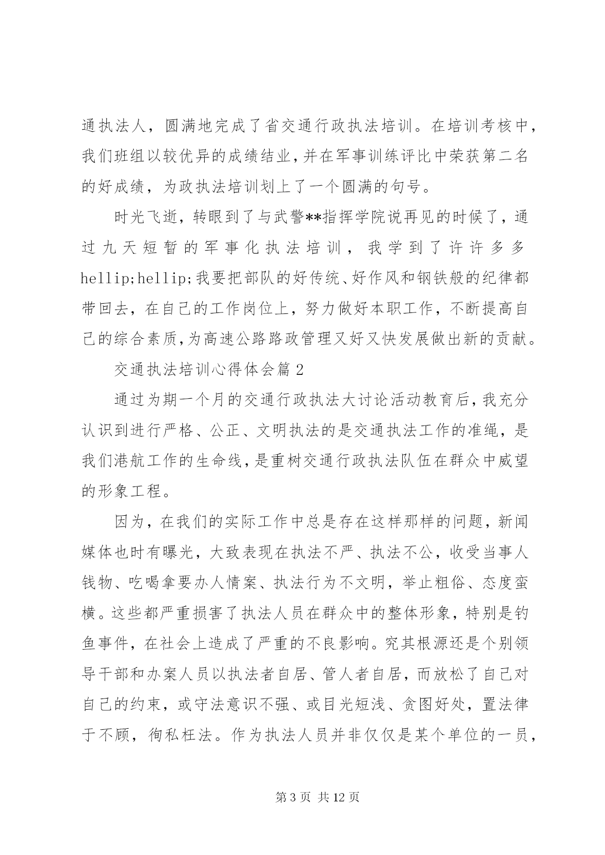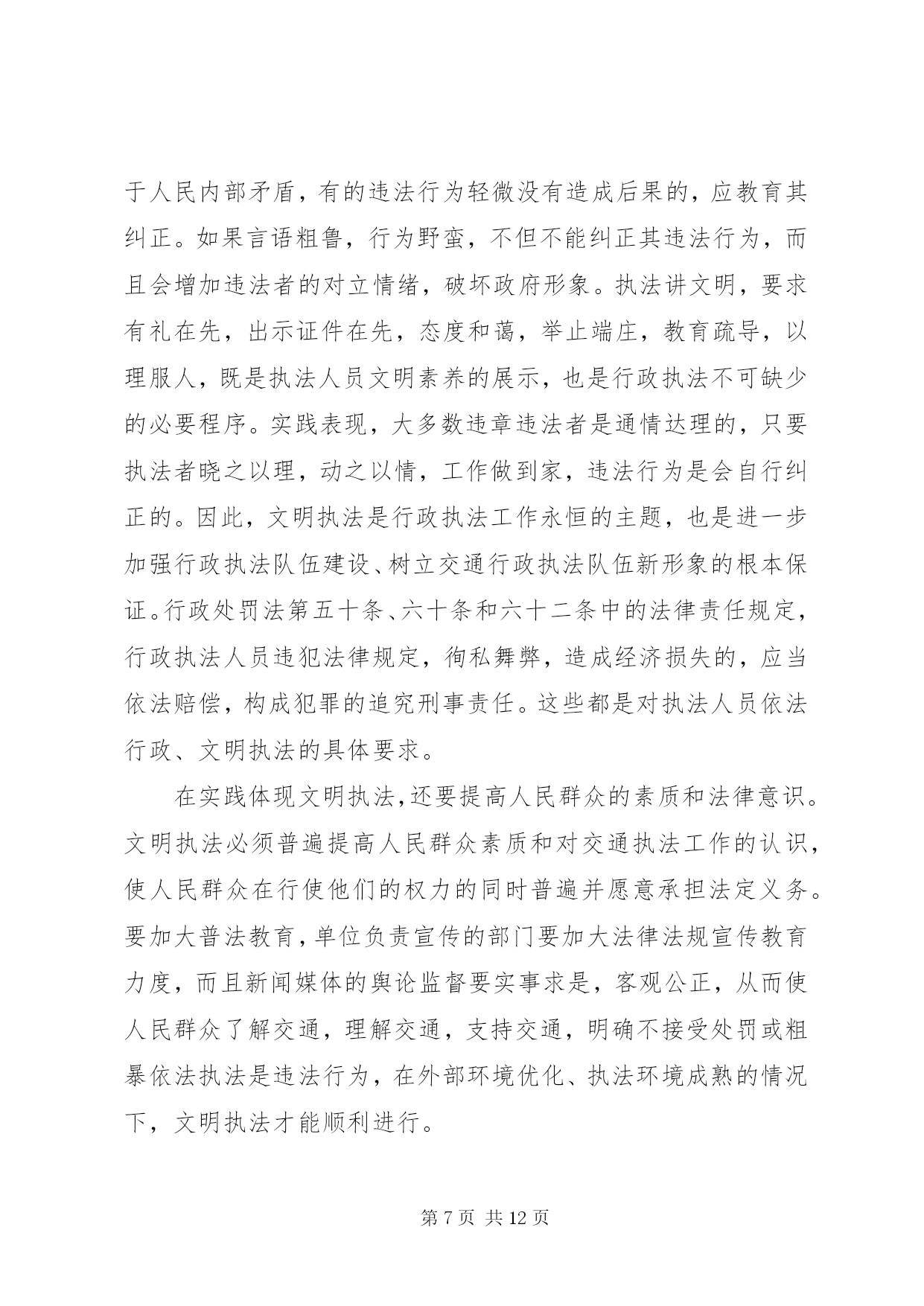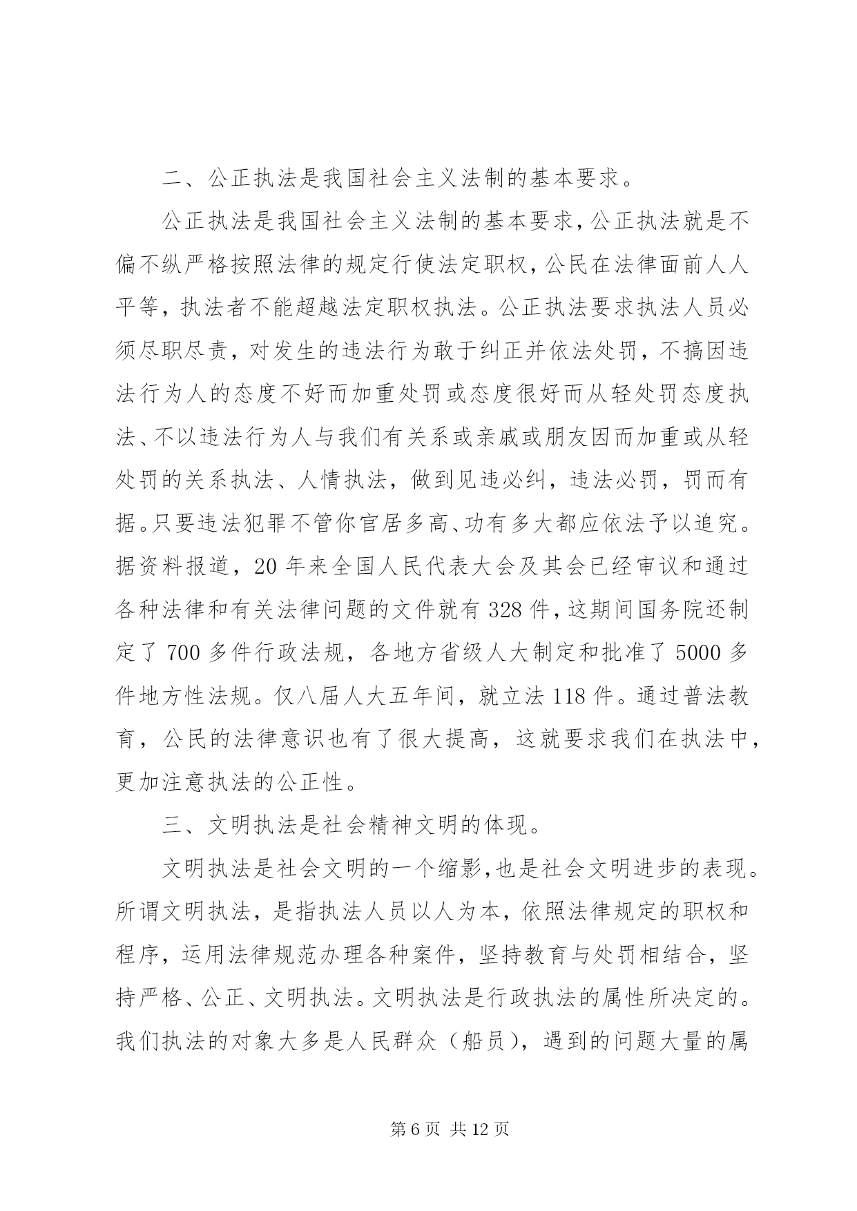 第PAGE\*Arabic\*MERGEFORMAT12页共NUMPAGES\*MERGEFORMAT12页交通执法培训心得体会交通执法培训心得体会篇1为提高交通行政执法队伍的整体素质和业务水平,改变工作作风,营造和谐执法的氛围,塑造交通执法的新形象,建立一支勤政、廉洁、务实、高效的交通行政执法队伍,省交通厅于2011年3月10日至18日在武警**指挥学院举办全省交通行政执法第二期培训班。10日上午,**路政大队培训人员怀着激动、带着期盼的心情来到交通执法培训基地----武警**指挥学院。下午在学校礼堂召开了**省交通行政执法培训开学动员大会,省交通厅党组成员王兆飞副厅长,厅机关有关处室及厅直有关单位的领导,以及武警**指挥学院副院长钟志锋等领导出席了大会。会上王兆飞副厅长及各处领导一一作了重要讲话,阐明本次培训的任务与目的,分析了**交通面临的困难与挑战,指出交通执法队伍存在的问题与不足,强调交通执法队伍建设的重要性和紧迫性。军营生活,熟悉而又陌生,伴随着朝升夕落的太阳,执法培训紧张而有序地进行着,早操、内务整理、军事训练、理论知识学习、集训hellip;hellip;学员们克服了天气炎热、训练项目多、强度大的困难,以饱满的精神、认真的态度,督促自己坚持从稍息、立正做起,从积极参与整理班级内务的小事做起,把培训学习的每一天都作为自己学习锻炼的机会,把培训作为工作学习生活的一个新的起点,把战胜困难作为超越自我的途径,把挑战作为磨练意志的手段,促进自己不断成长进步。坚持树立不畏艰苦愈磨愈勇长期作战的思想意识,为在今后的工作中不断地磨练、实践,把自己培养成为一名符合新时期要求的合格的交通行政执法者而努力。大家还认真系统的学习了《**省交通行政处罚自由裁量权基准制度》、《交通执法行为规范》、《道路运输行政执法》、《公路法》和《行政处罚法》等交通行政执法相关法律法规,促进我们在行使交通行政处罚权力过程中,严格做到有法可依、有法必依,执法必严,违法必究和文明执法,为我们开展执法工作奠定了坚实的法律基础。操场上,宿舍里,随处可见学员们刻苦训练、认真学习的身影。训练,固然是艰苦的,但看到领导、教官们为我们无怨无悔的付出,我的苦和累顿时烟消云散。小小的单人床,四四方方的豆腐块,还有每天准时的号角、哨声,这一切的一切,无不让我朝着一个真正的、合格的硬汉的目标出发。集体的生活有苦也有甜,蚊子是多了点,隔壁床的兄弟鼾声是大了点,训练难免风吹日晒雨淋,但我们收获了集体的荣誉感,学会了什么是团结,什么是严明的纪律,什么是严格的要求,什么是严谨的作风,这样的收获,正是我执法工作中所需要的。本着对单位负责,对培训班负责,对自己负责的态度,用行动证明自己是一个有严明纪律观念的军人,用行动实践着厅党组打造交通执法新形象的合格交通执法人,圆满地完成了省交通行政执法培训。在培训考核中,我们班组以较优异的成绩结业,并在军事训练评比中荣获第二名的好成绩,为政执法培训划上了一个圆满的句号。时光飞逝,转眼到了与武警**指挥学院说再见的时候了,通过九天短暂的军事化执法培训,我学到了许许多多hellip;hellip;我要把部队的好传统、好作风和钢铁般的纪律都带回去,在自己的工作岗位上,努力做好本职工作,不断提高自己的综合素质,为高速公路路政管理又好又快发展做出新的贡献。交通执法培训心得体会篇2通过为期一个月的交通行政执法大讨论活动教育后,我充分认识到进行严格、公正、文明执法的是交通执法工作的准绳,是我们港航工作的生命线,是重树交通行政执法队伍在群众中威望的形象工程。因为,在我们的实际工作中总是存在这样那样的问题,新闻媒体也时有曝光,大致表现在执法不严、执法不公,收受当事人钱物、吃喝拿要办人情案、执法行为不文明,举止粗俗、态度蛮横。这些都严重损害了执法人员在群众中的整体形象,特别是钓鱼事件,在社会上造成了严重的不良影响。究其根源还是个别领导干部和办案人员以执法者自居、管人者自居,而放松了自己对自己的约束,或守法意识不强、或目光短浅、贪图好处,置法律于不顾,徇私枉法。作为执法人员并非仅仅是某个单位的一员,在群众眼里,你是执法者,是代表了最具权威的法律在行使职权,是为人民排忧解难的,是群众的保护神,因而我们的言行举止是否文明、有无严格公正、文明执法就显得尤为重要。县委、县政府对有关问题十分重视,针对为什么执法、如何执法问题都有相关指导性文章和制定相应的内部规定;就严格、公正、文明执法进行法制教育和有关学习,比如我们集中参加了县委、县政府交通行政执法大讨论活动动员大会,思想道德专题讲座,行政执法知识专题讲座等,我们自己所里也进行了动员大会,开展了社会主义荣辱观教育,学习郑九万先进事迹,学习文明礼仪手册,并重新学习了《中华人民共和国内河交通安全管理条例》、《