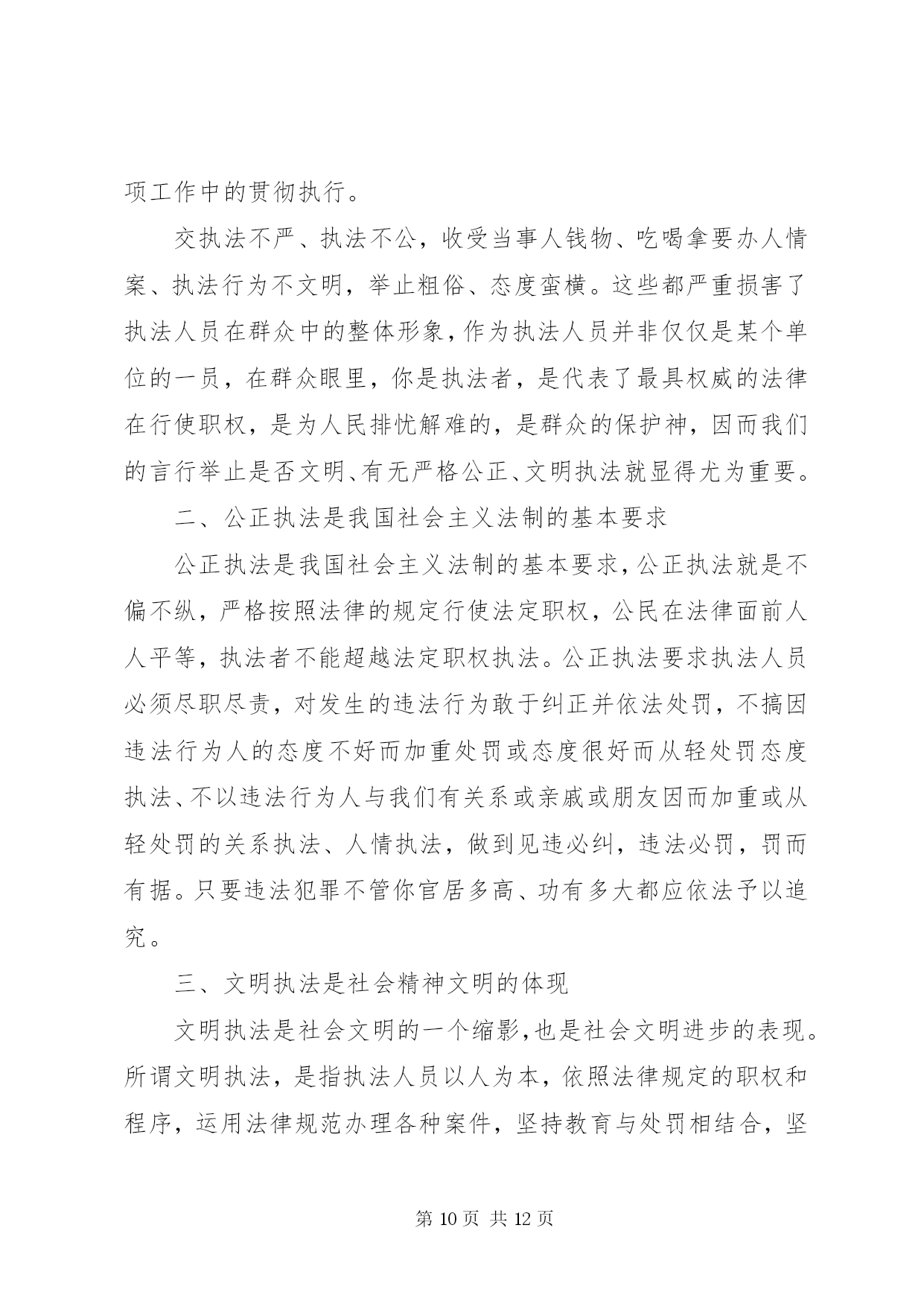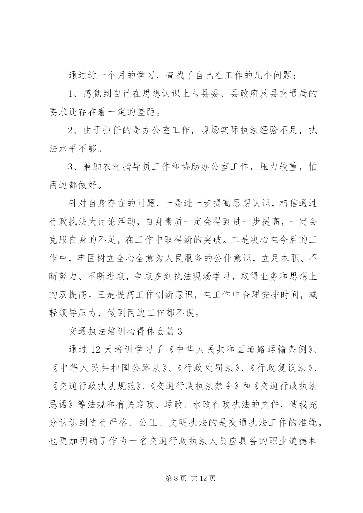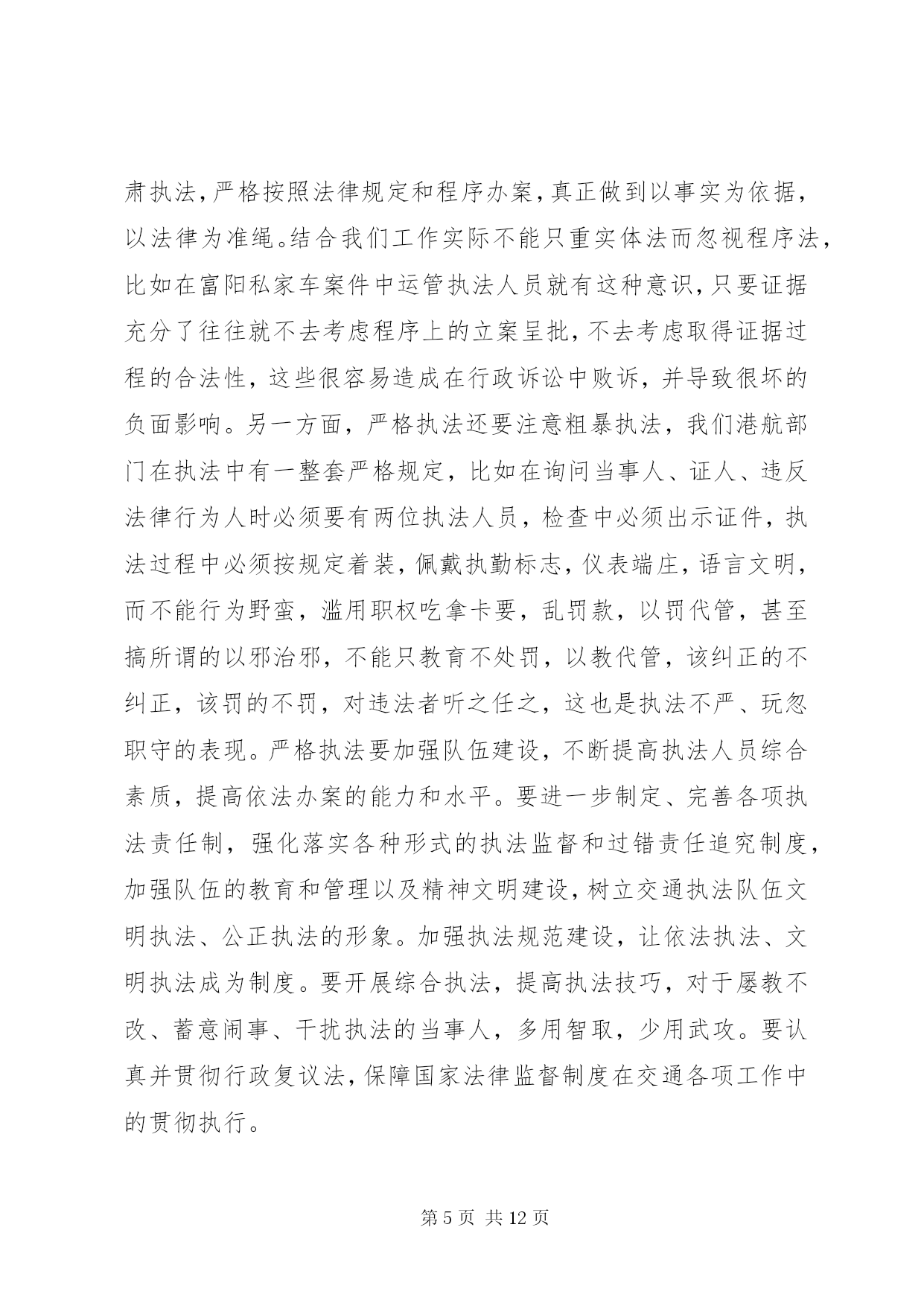 第PAGE\*Arabic\*MERGEFORMAT12页共NUMPAGES\*MERGEFORMAT12页交通执法培训心得体会交通执法培训心得体会篇1为提高交通行政执法队伍的整体素质和业务水平,改变工作作风,营造和谐执法的氛围,塑造交通执法的新形象,建立一支勤政、廉洁、务实、高效的交通行政执法队伍,省交通厅于2011年3月10日至18日在武警**指挥学院举办全省交通行政执法第二期培训班。10日上午,**路政大队培训人员怀着激动、带着期盼的心情来到交通执法培训基地----武警**指挥学院。下午在学校礼堂召开了**省交通行政执法培训开学动员大会,省交通厅党组成员王兆飞副厅长,厅机关有关处室及厅直有关单位的领导,以及武警**指挥学院副院长钟志锋等领导出席了大会。会上王兆飞副厅长及各处领导一一作了重要讲话,阐明本次培训的任务与目的,分析了**交通面临的困难与挑战,指出交通执法队伍存在的问题与不足,强调交通执法队伍建设的重要性和紧迫性。军营生活,熟悉而又陌生,伴随着朝升夕落的太阳,执法培训紧张而有序地进行着,早操、内务整理、军事训练、理论知识学习、集训hellip;hellip;学员们克服了天气炎热、训练项目多、强度大的困难,以饱满的精神、认真的态度,督促自己坚持从稍息、立正做起,从积极参与整理班级内务的小事做起,把培训学习的每一天都作为自己学习锻炼的机会,把培训作为工作学习生活的一个新的起点,把战胜困难作为超越自我的途径,把挑战作为磨练意志的手段,促进自己不断成长进步。坚持树立不畏艰苦愈磨愈勇长期作战的思想意识,为在今后的工作中不断地磨练、实践,把自己培养成为一名符合新时期要求的合格的交通行政执法者而努力。大家还认真系统的学习了《**省交通行政处罚自由裁量权基准制度》、《交通执法行为规范》、《道路运输行政执法》、《公路法》和《行政处罚法》等交通行政执法相关法律法规,促进我们在行使交通行政处罚权力过程中,严格做到有法可依、有法必依,执法必严,违法必究和文明执法,为我们开展执法工作奠定了坚实的法律基础。操场上,宿舍里,随处可见学员们刻苦训练、认真学习的身影。训练,固然是艰苦的,但看到领导、教官们为我们无怨无悔的付出,我的苦和累顿时烟消云散。小小的单人床,四四方方的豆腐块,还有每天准时的号角、哨声,这一切的一切,无不让我朝着一个真正的、合格的硬汉的目标出发。集体的生活有苦也有甜,蚊子是多了点,隔壁床的兄弟鼾声是大了点,训练难免风吹日晒雨淋,但我们收获了集体的荣誉感,学会了什么是团结,什么是严明的纪律,什么是严格的要求,什么是严谨的作风,这样的收获,正是我执法工作中所需要的。本着对单位负责,对培训班负责,对自己负责的态度,用行动证明自己是一个有严明纪律观念的军人,用行动实践着厅党组打造交通执法新形象的合格交通执法人,圆满地完成了省交通行政执法培训。在培训考核中,我们班组以较优异的成绩结业,并在军事训练评比中荣获第二名的好成绩,为政执法培训划上了一个圆满的句号。时光飞逝,转眼到了与武警**指挥学院说再见的时候了,通过九天短暂的军事化执法培训,我学到了许许多多hellip;hellip;我要把部队的好传统、好作风和钢铁般的纪律都带回去,在自己的工作岗位上,努力做好本职工作,不断提高自己的综合素质,为高速公路路政管理又好又快发展做出新的贡献。交通执法培训心得体会篇2通过为期一个月的交通行政执法大讨论活动教育后,我充分认识到进行严格、公正、文明执法的是交通执法工作的准绳,是我们港航工作的生命线,是重树交通行政执法队伍在群众中威望的形象工程。因为,在我们的实际工作中总是存在这样那样的问题,新闻媒体也时有曝光,大致表现在执法不严、执法不公,收受当事人钱物、吃喝拿要办人情案、执法行为不文明,举止粗俗、态度蛮横。这些都严重损害了执法人员在群众中的整体形象,特别是钓鱼事件,在社会上造成了严重的不良影响。究其根源还是个别领导干部和办案人员以执法者自居、管人者自居,而放松了自己对自己的约束,或守法意识不强、或目光短浅、贪图好处,置法律于不顾,徇私枉法。作为执法人员并非仅仅是某个单位的一员,在群众眼里,你是执法者,是代表了最具权威的法律在行使职权,是为人民排忧解难的,是群众的保护神,因而我们的言行举止是否文明、有无严格公正、文明执法就显得尤为重要。县委、县政府对有关问题十分重视,针对为什么执法、如何执法问题都有相关指导性文章和制定相应的内部规定;就严格、公正、文明执法进行法制教育和有关学习,比如我们集中参加了县委、县政府交通行政执法大讨论活动动员大会,思想道德专题讲座,行政执法知识专题讲座等,我们自己所里也进行了动员大会,开展了社会主义荣辱观教育,学习郑九万先进事迹,学习文明礼仪手册,并重新学习了《中华人民共和国内河交通安全管理条例》、《