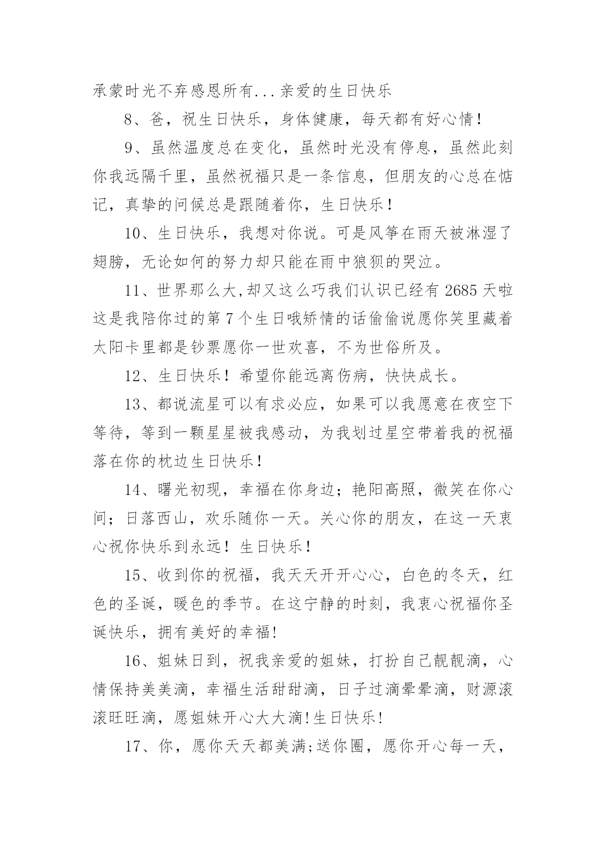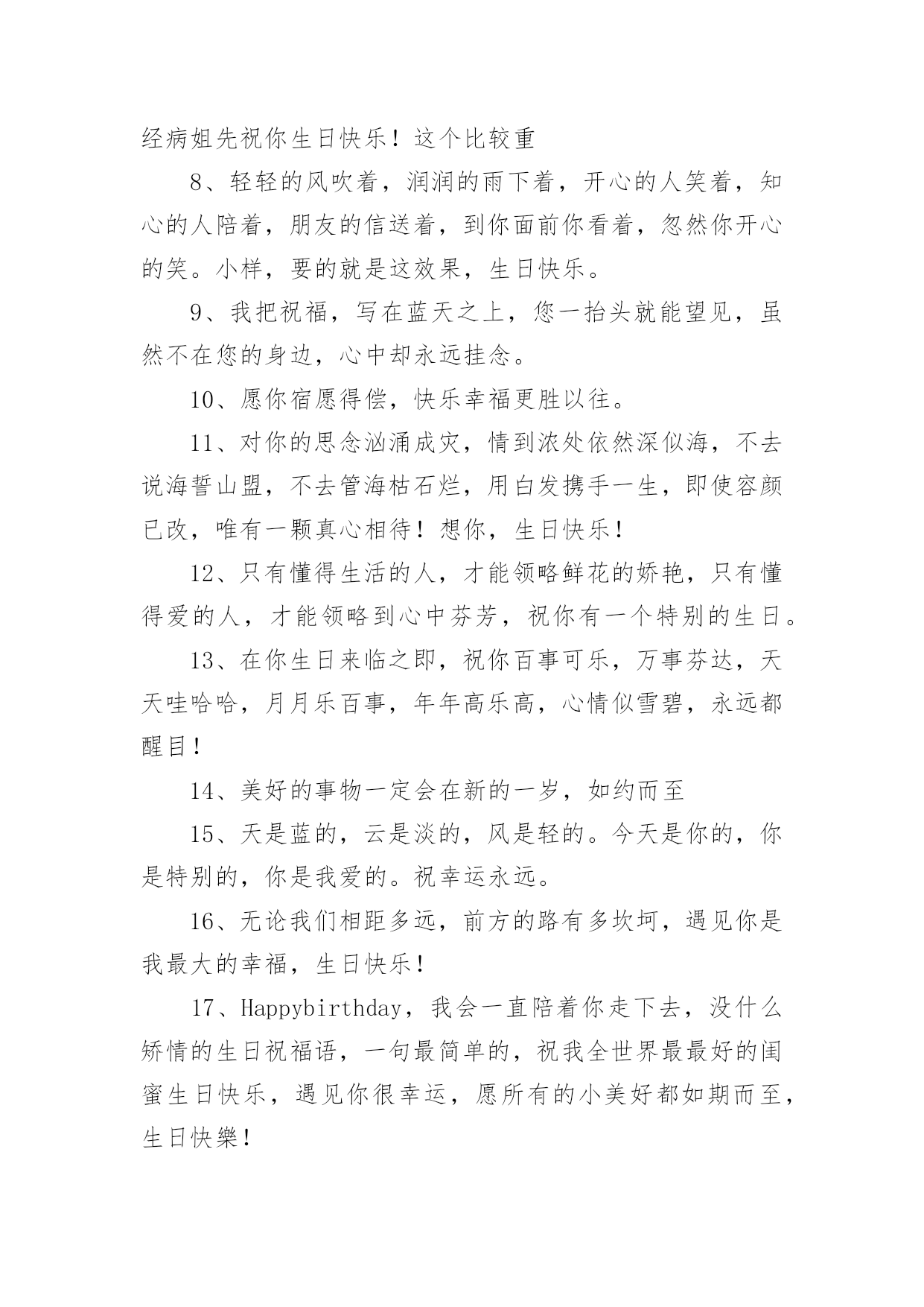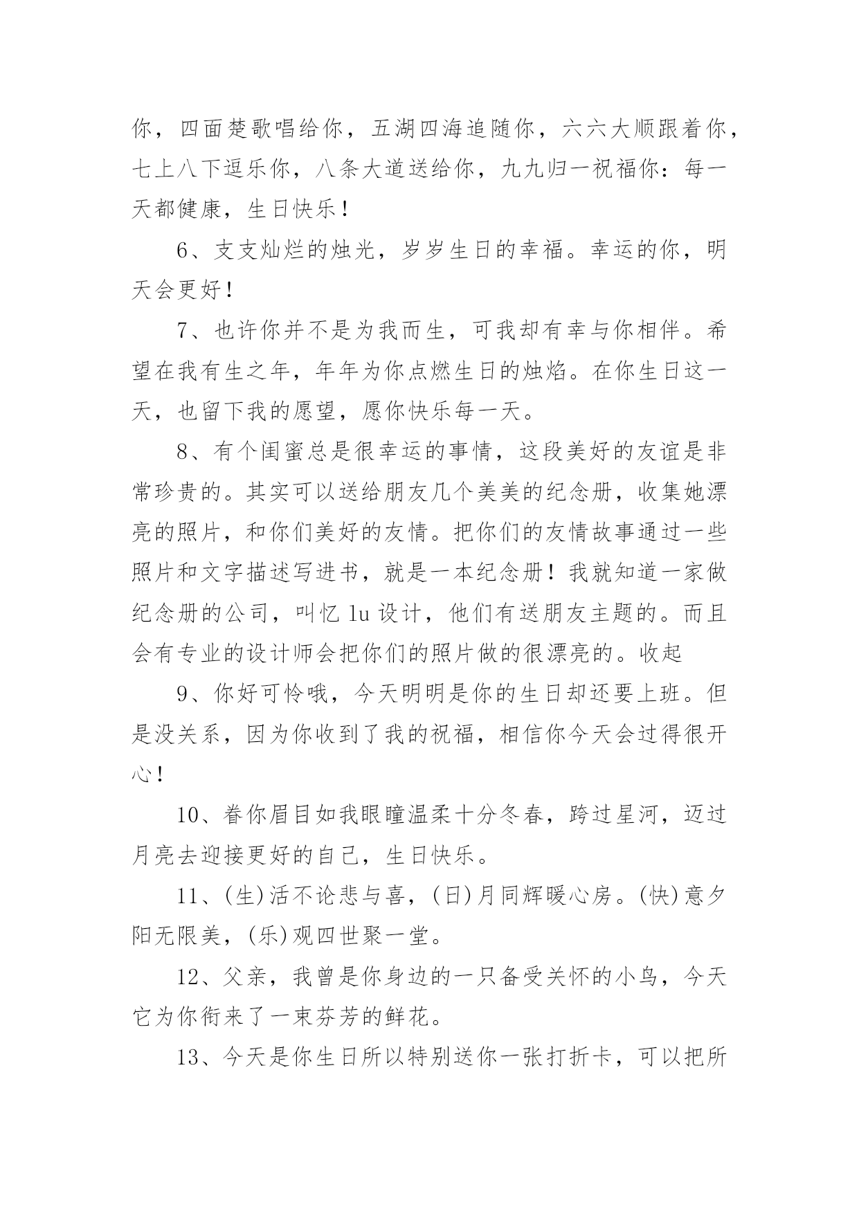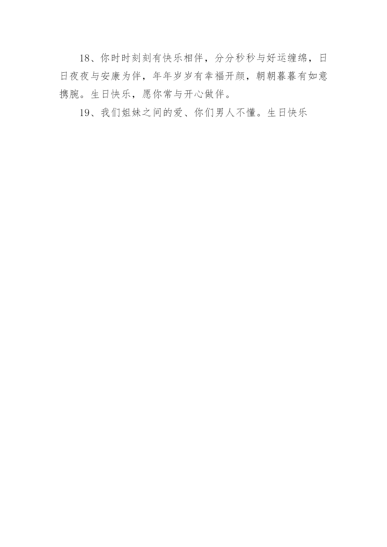 闺蜜生日发朋友圈文案闺蜜生日发朋友圈文案在日常学习、工作或生活中,大家都看到过文案吧,文案用以记录学习、生活中有意义,特别是有纪念意义的事情。你知道什么样的文案才有创意吗?下面是小编整理的闺蜜生日发朋友圈文案,欢迎阅读,希望大家能够喜欢。闺蜜生日发朋友圈文案11、想念的话,说也说不完,关怀的心,永远不改变。祝你生日快乐心肝宝贝。愿所有的快乐、所有的幸福、所有的温馨、所有的好运围绕在您身边。生日快乐!健康!幸福!希望你每天都开开心心。2、张灯结彩迎财神,福禄寿喜财神到,不要你说一句话,福气财喜到你家。愿你,张开财富大,进天下财富,生意红火发发发,数钱数到乐开花。3、生日祝福送给你,好运幸运缠着你,快乐幸福陪着你,吉祥平安恋着你,家人朋友疼着你,上帝保佑你。祝你生日快乐,年年有今朝,岁岁都健康。4、父亲的爱,是春天里的一缕阳光,和煦地照耀在我的身上;是夏日里的一丝凉风,吹散了我心中的烦热;是秋日里的一串串硕果,指引着我走向成功;是冬天里的一把火,温暖着我那颗冰冷的心。父亲的爱,无处不在。5、一条短信发给你,两朵鲜花献给你,三生有幸认识你,四面楚歌唱给你,五湖四海追随你,六六大顺跟着你,七上八下逗乐你,八条大道送给你,九九归一祝福你:每一天都健康,生日快乐!6、支支灿烂的烛光,岁岁生日的幸福。幸运的你,明天会更好!7、也许你并不是为我而生,可我却有幸与你相伴。希望在我有生之年,年年为你点燃生日的烛焰。在你生日这一天,也留下我的愿望,愿你快乐每一天。8、有个闺蜜总是很幸运的事情,这段美好的友谊是非常珍贵的。其实可以送给朋友几个美美的纪念册,收集她漂亮的照片,和你们美好的友情。把你们的友情故事通过一些照片和文字描述写进书,就是一本纪念册!我就知道一家做纪念册的公司,叫忆lu设计,他们有送朋友主题的。而且会有专业的设计师会把你们的照片做的很漂亮的。收起9、你好可怜哦,今天明明是你的生日却还要上班。但是没关系,因为你收到了我的祝福,相信你今天会过得很开心!10、眷你眉目如我眼瞳温柔十分冬春,跨过星河,迈过月亮去迎接更好的自己,生日快乐。11、(生)活不论悲与喜,(日)月同辉暖心房。(快)意夕阳无限美,(乐)观四世聚一堂。12、父亲,我曾是你身边的一只备受关怀的小鸟,今天它为你衔来了一束芬芳的鲜花。13、今天是你生日所以特别送你一张打折卡,可以把所有不开心的过去统统打成零折,再送你一张购物返卷,希望我的祝福换来你的幸福,生日快乐。14、虽然最近好忙,但再忙也要陪你过生日,无敌闺蜜在一起好嗨,一起喝酒,一起八卦。有你在身边,真的是好欢乐。15、每一行歪斜的脚印,成为远去的记忆。而人生的道路,还在足下。十八岁,生命开始奋斗坚强。我祝你大步迈上新的征程,留下一串闪光的足迹!生日快乐。16、为什么妈妈都不喜欢媳妇,而奶奶都喜欢孙媳妇?因为,敌人的敌人就是朋友。钞票不是万能的,有时还需要信用卡。老天爷,你能把这几天要下的雨存储起来吗,等到军训时再还我!上帝把智慧洒满人间,唯独给你撑了把伞。找男朋友的要求不高,跟女孩子讲过话的不要。我六月过生日,妈妈五月过生日,小时候我就特别佩服妈妈,一个月就能把我生下来。只因为在人群中多看了你几眼,从此便瞎了眼。请关心一下身边的吃货,可能她一不留神就撑死了。熊孩子叠了只千纸鹤扔到我脸上,他说他在玩愤怒的小鸟,这孩子真可爱,不对!他意思是说我是猪吗?闺蜜说她喜欢私人空间,男友就送她一座豪宅。我说我喜欢海,你就一直浪。17、最精彩的不是实现梦想瞬间,而是坚持的过程,祝你生日快乐。18、用我满怀的爱恋,祝你的.十八岁生日,在此特别的时刻,我想告诉你,是你使我的生活有了意义,我对你的爱无法用言语表达。我将与你共度生命的每一天。十八岁生日快乐!19、生命是一种喜悦,愿你的生活,永远充满喜悦,祝生日快乐!20、别挥霍你的二十几岁,爱你所爱,行你所行,顺从己心,无问西东。愿时光不负努力,青春不负己!闺蜜生日发朋友圈文案21、今天工资拼到手,决定请你大鱼大肉,KTV找美女伴奏,桌上摆满名烟名酒,一次请你high个够,愿你每天斗金不离手,愿你每天生活乐悠悠,愿你生命与天共长寿,愿快乐幸福时刻将你守候,虽然生日祝福简陋,爱你之心时刻胸中有,生日快乐。2、暖暖的烛光里,有我的思绪与期盼,纵然相隔太远太远,仍送去无限想念及祝福。3、爸爸,献上我的谢意,为了这么多年来您对我付出的耐心和爱心。4、你的生日到啦?天呐,我差点忘记!因为岁月没有在你脸上留下任何痕迹,沧桑没有在你气质上打下丝毫折扣。尽管,日历告诉我:你又成熟了一年,生日快乐。5、献上我对你的爱,祝你生日布满温馨,感谢你一直以来对我的关怀和照顾,祝我锦绣的乐观的热情的健康自信的布满活力的你生日快乐!6、愿所有美好温暖与你如期而至愿你活成自己想要的样子愿你能够做自己的小公主别人的大魔王