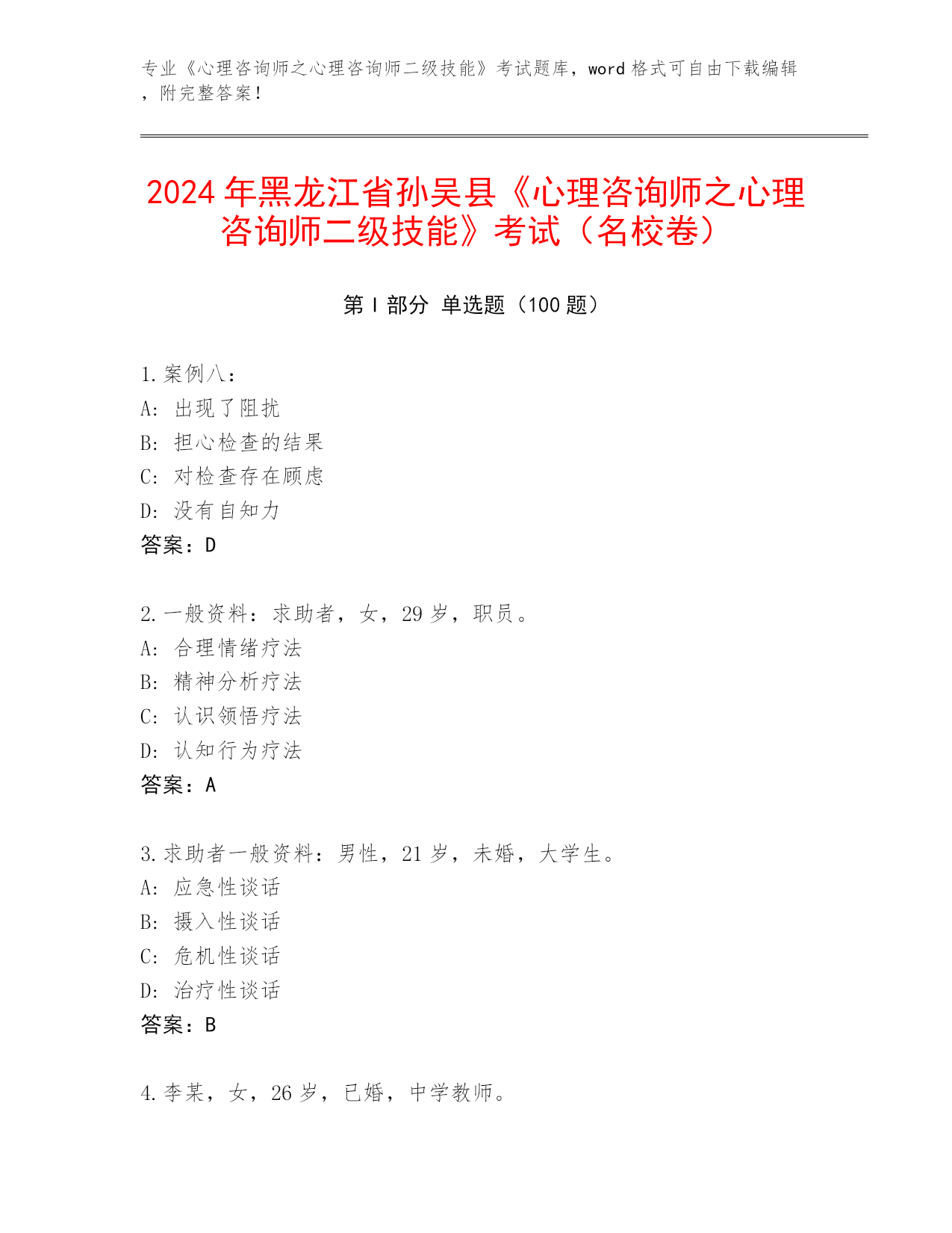 2024年黑龙江省孙吴县《心理咨询师之心理咨询师二级技能》考试(名校卷)