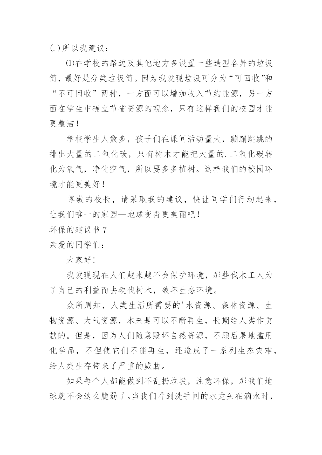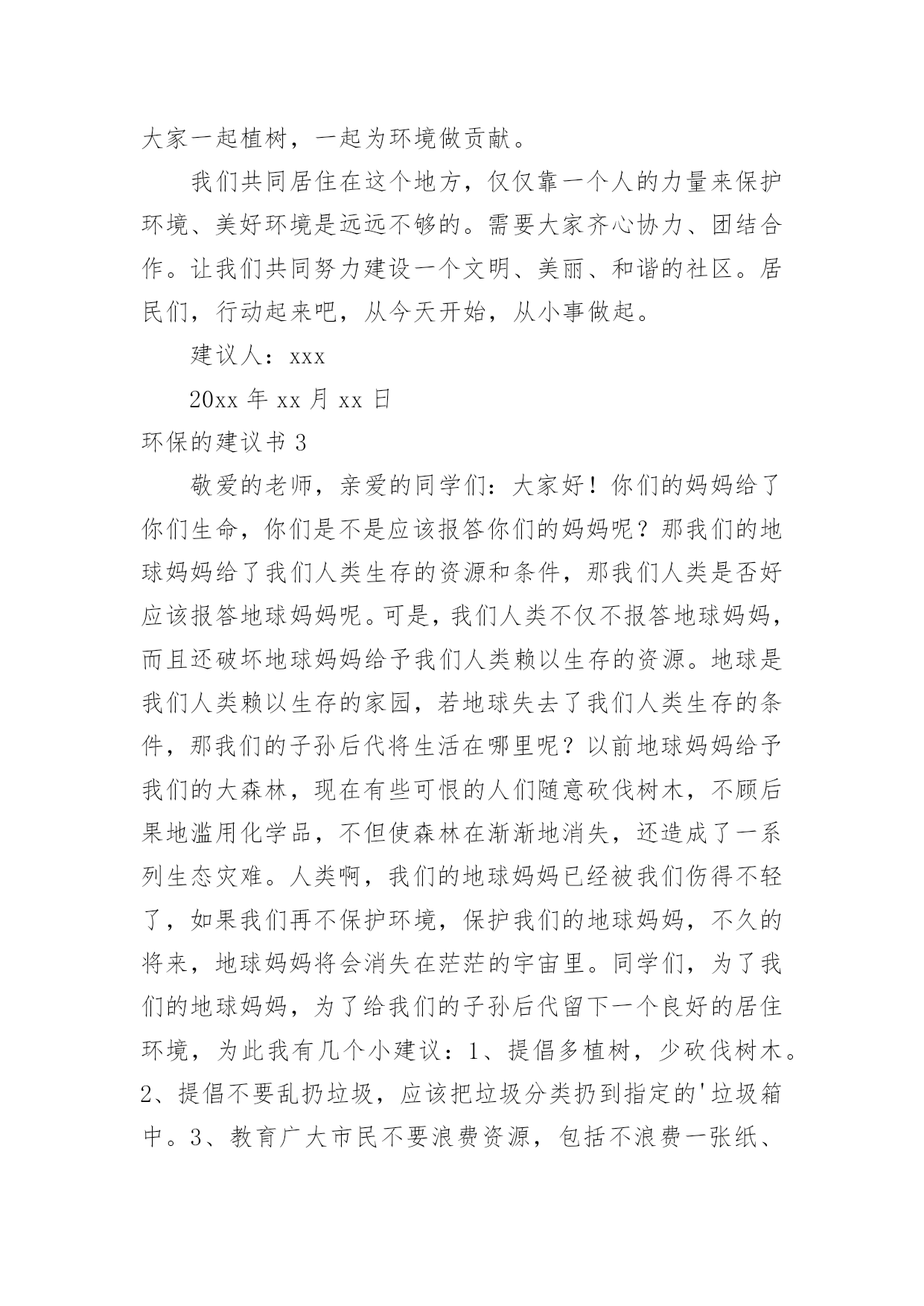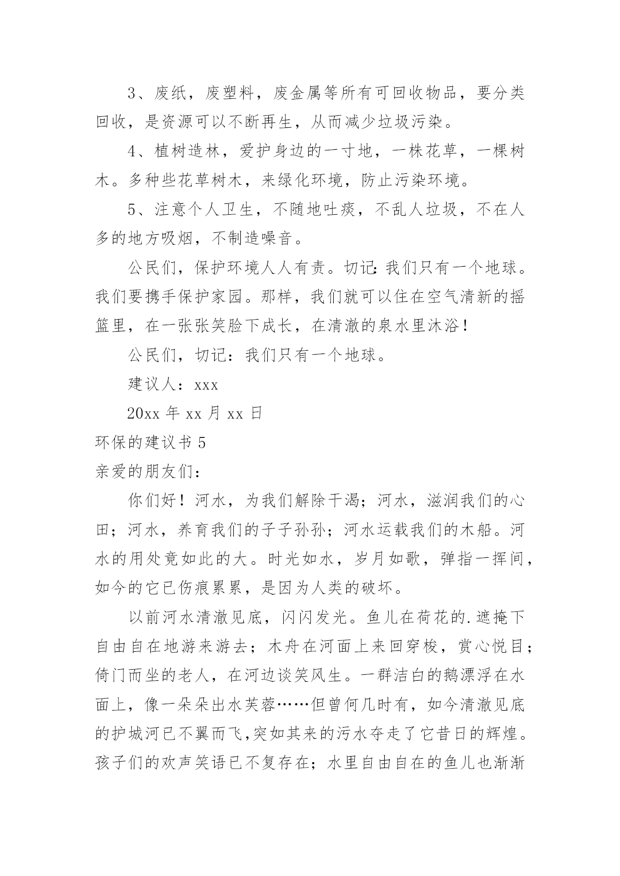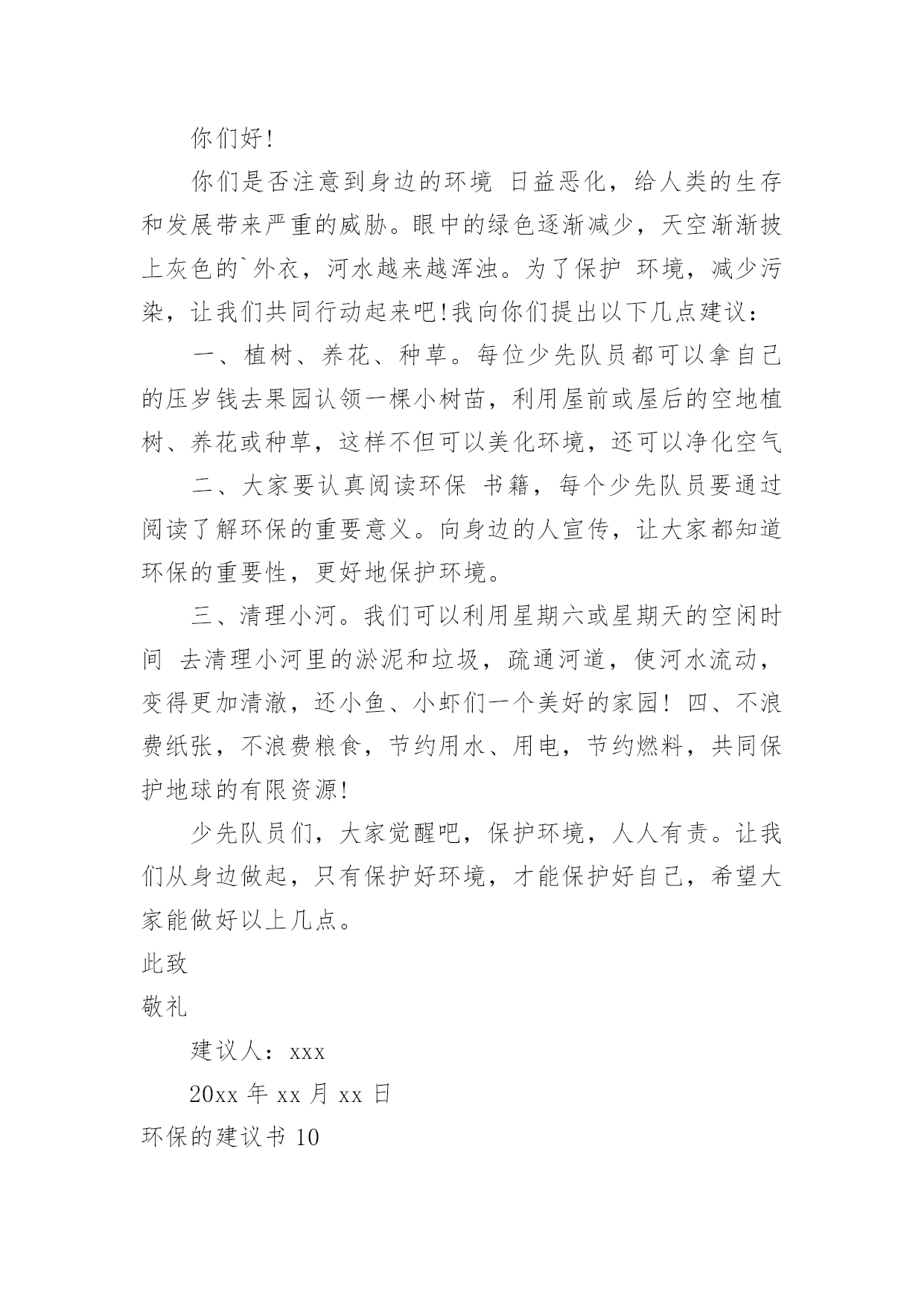 环保的建议书环保的建议书在生活中,越来越多人会去使用建议书,使用正确的写作思路书写建议书会更加事半功倍。为了让您在写建议书时更加简单方便,下面是小编收集整理的环保的建议书,仅供参考,欢迎大家阅读。环保的建议书1尊敬的小区居民:我是在北海小学读书的一名小学生。我从小就在这里居住,这里的环境变化我看得一清二楚我们这里大多数都贴着“请节约用水”、“请节约用电”的字样。,虽然这些都要我们做的',但是老年人比我们更积极,把家里能省的都省了,而我们却不节约,经常浪费。我有几条建议:1、每个人节省一些水,洗澡水冲厕所;洗脸的水可以洗脚,洗完脚又可以浇花。2、每天做到不浪费水,把可以用的水循环使用。3、洗手的时候,看见旁边的水龙头开着或滴着水,可以帮忙把它关掉。如果每个人都做到以上这些,那么每年可以节省几十吨水,节省出来的水又可以给那些干旱地区,真是一举两得所以我们要尽可能地节水,想想那些干旱地区的人们,喝不到水,多么苦呀!此致敬礼!建议人:xxx20xx年xx月xx日环保的建议书2亲爱的居民们:环境的优劣决定着我们生活质量的好坏。环境是我们赖以生存的条件。因此,保护环境是我们的责任。我发现近日来,我们周边的环境遭到了破坏。我发现垃圾随处可见,花园中、河流中、街道上都可以看见垃圾的影子。河流也因此从最初的纯净到现在的发黑、发臭。我还发现人们随地扔垃圾、吐痰等坏习惯。为了我们沐浴在花草树木的芬芳之中,为了我们的身体健康,为了我们生活在干净整洁的环境中。我向居民们提出以下建议,希望居民能采纳。1、养成良好的习惯,不随地扔垃圾、不随地吐痰。把垃圾分成可回收和不可回收。把垃圾扔到指定的垃圾处理处。不要把垃圾扔到河流中,不要把污水排放到河流中。2、看到破坏环境的行为,应及时制止。3、从日常生活中的小事做起。不使用一次性塑料类物品,节约用水。洗完菜的.水可以用来冲马桶,洗完米的水可以用来浇花,及时关掉水龙头。4、多参加社区活动,积极宣传环境保护的知识。组织大家一起植树,一起为环境做贡献。我们共同居住在这个地方,仅仅靠一个人的力量来保护环境、美好环境是远远不够的。需要大家齐心协力、团结合作。让我们共同努力建设一个文明、美丽、和谐的社区。居民们,行动起来吧,从今天开始,从小事做起。建议人:xxx20xx年xx月xx日环保的建议书3敬爱的老师,亲爱的同学们:大家好!你们的妈妈给了你们生命,你们是不是应该报答你们的妈妈呢?那我们的地球妈妈给了我们人类生存的资源和条件,那我们人类是否好应该报答地球妈妈呢。可是,我们人类不仅不报答地球妈妈,而且还破坏地球妈妈给予我们人类赖以生存的资源。地球是我们人类赖以生存的家园,若地球失去了我们人类生存的条件,那我们的子孙后代将生活在哪里呢?以前地球妈妈给予我们的大森林,现在有些可恨的人们随意砍伐树木,不顾后果地滥用化学品,不但使森林在渐渐地消失,还造成了一系列生态灾难。人类啊,我们的地球妈妈已经被我们伤得不轻了,如果我们再不保护环境,保护我们的地球妈妈,不久的将来,地球妈妈将会消失在茫茫的宇宙里。同学们,为了我们的地球妈妈,为了给我们的子孙后代留下一个良好的居住环境,为此我有几个小建议:1、提倡多植树,少砍伐树木。2、提倡不要乱扔垃圾,应该把垃圾分类扔到指定的'垃圾箱中。3、教育广大市民不要浪费资源,包括不浪费一张纸、一滴水。4、加强环保宣传,形成良好的环保氛围。作为地球的小主人,改善地球环境和节约资源,是我们义不容辞的责任和义务。希望同学们能够一起保护我们的地球妈妈!育才一小六(6)班孙乔楠XX年十一月十九日环保的建议书4地球村的小公民们:我们赖以生存的地球只有一个,它多么需要我们的保护啊!可是,有些小公民非但不听,还肆意的把污水,废弃,餐桌上被丢弃的食物,堆积如山的一次性筷子,哗哗流淌的自来水浪费掉,扔掉。这样的画面真是触目惊心。地球,这位人类的母亲,生命的摇篮。曾是那样美丽,那么壮观。但现在,却被一些来路不明的`垃圾压得喘不过气。一点一点,随着时间下沉。我们为了自己的利益,不惜乱采乱挖,随意排放污染物……于是,一座座挺拔的山变秃了,一条条清澈的河水变黑了……地球母亲正在痛苦的呻吟。如果地球被污染,我们的生命将会毁在自己手上。作为地球上的一员,我们有责任,有义务来保护地球。从小事做起,从身边做起。保护我们的家园,让我们的地球恢复原来的面貌。因此,我建议:1、尽量少用一次性类物品,减少白色污染,自备购物袋和篮子。2、不管在生活中,学习中,还是工作中,都要节约资源。用水,用电,要节制。杜绝各种浪费迹象,消费也要节俭一点。3、废纸,废塑料,废金属等所有可回收物品,要分类回收,是资源可以不断再生,从而减少垃圾污染。4、植树造林,爱护身边的一寸地,一株花草,一棵树木。多种些花草树木,来绿化环境,防止污染环境。5、注意个人卫生,不随