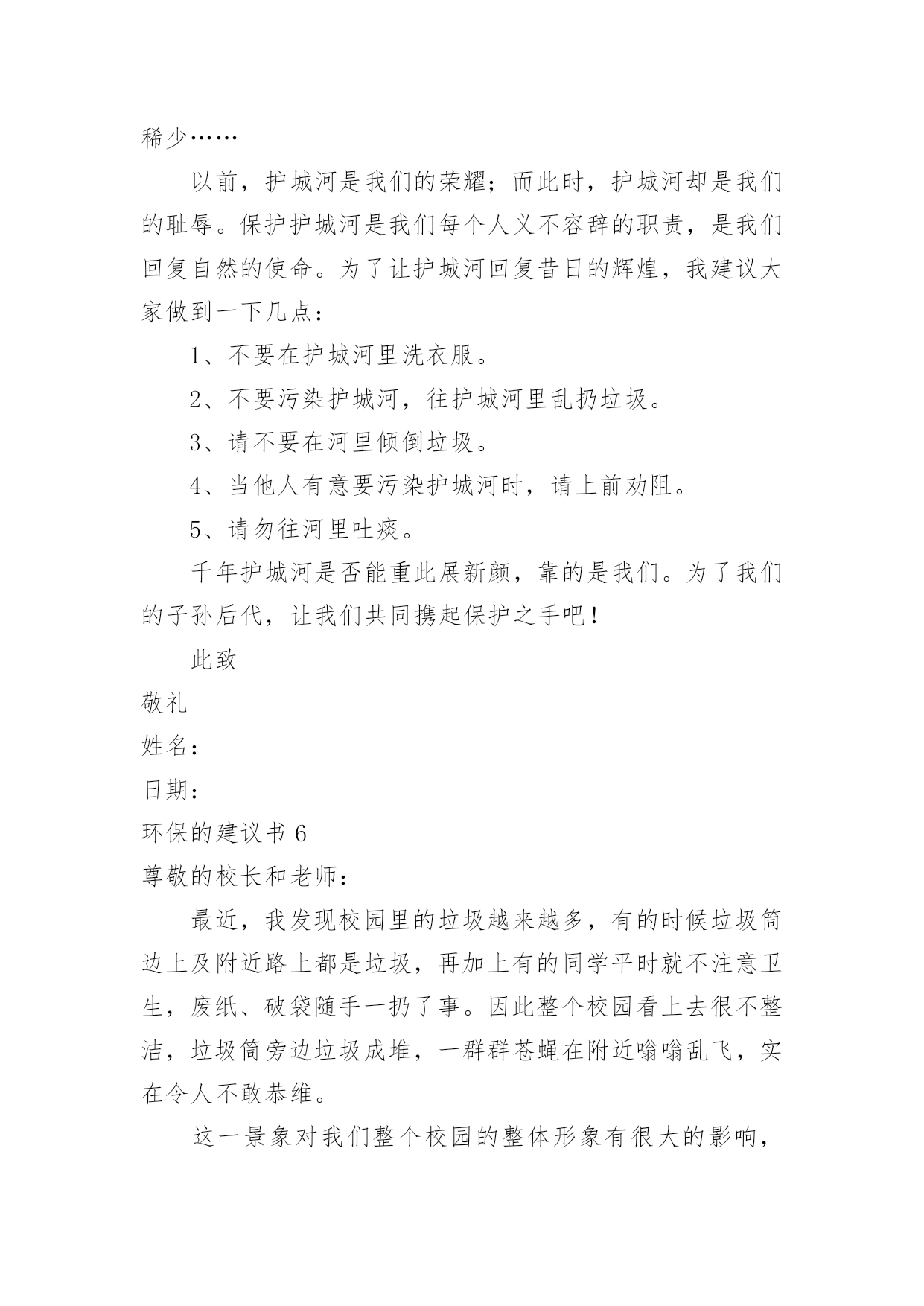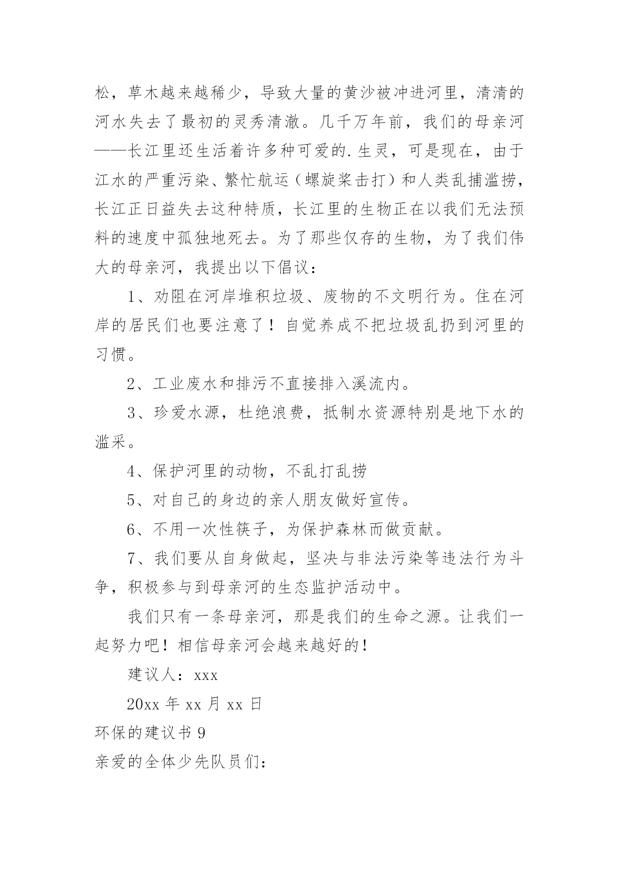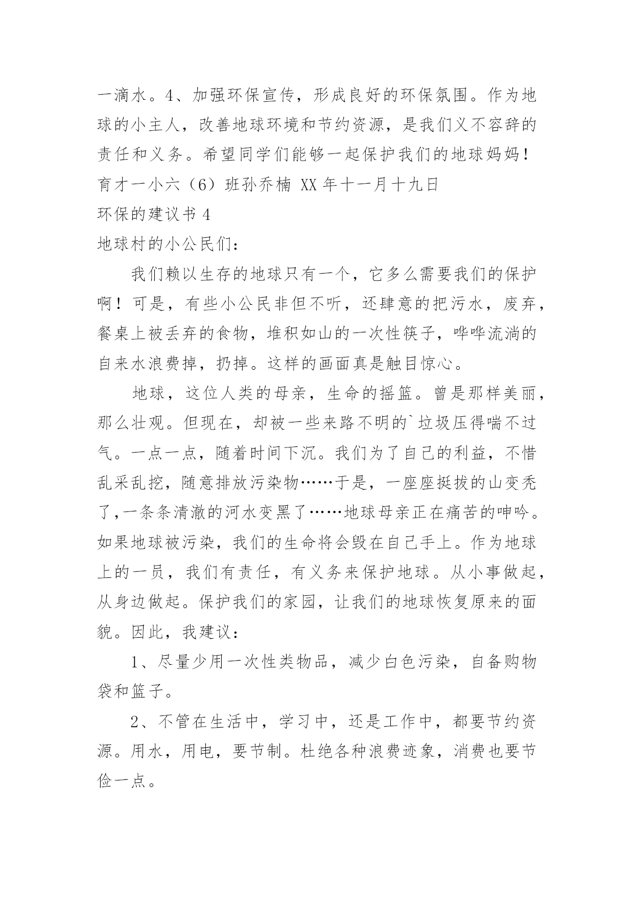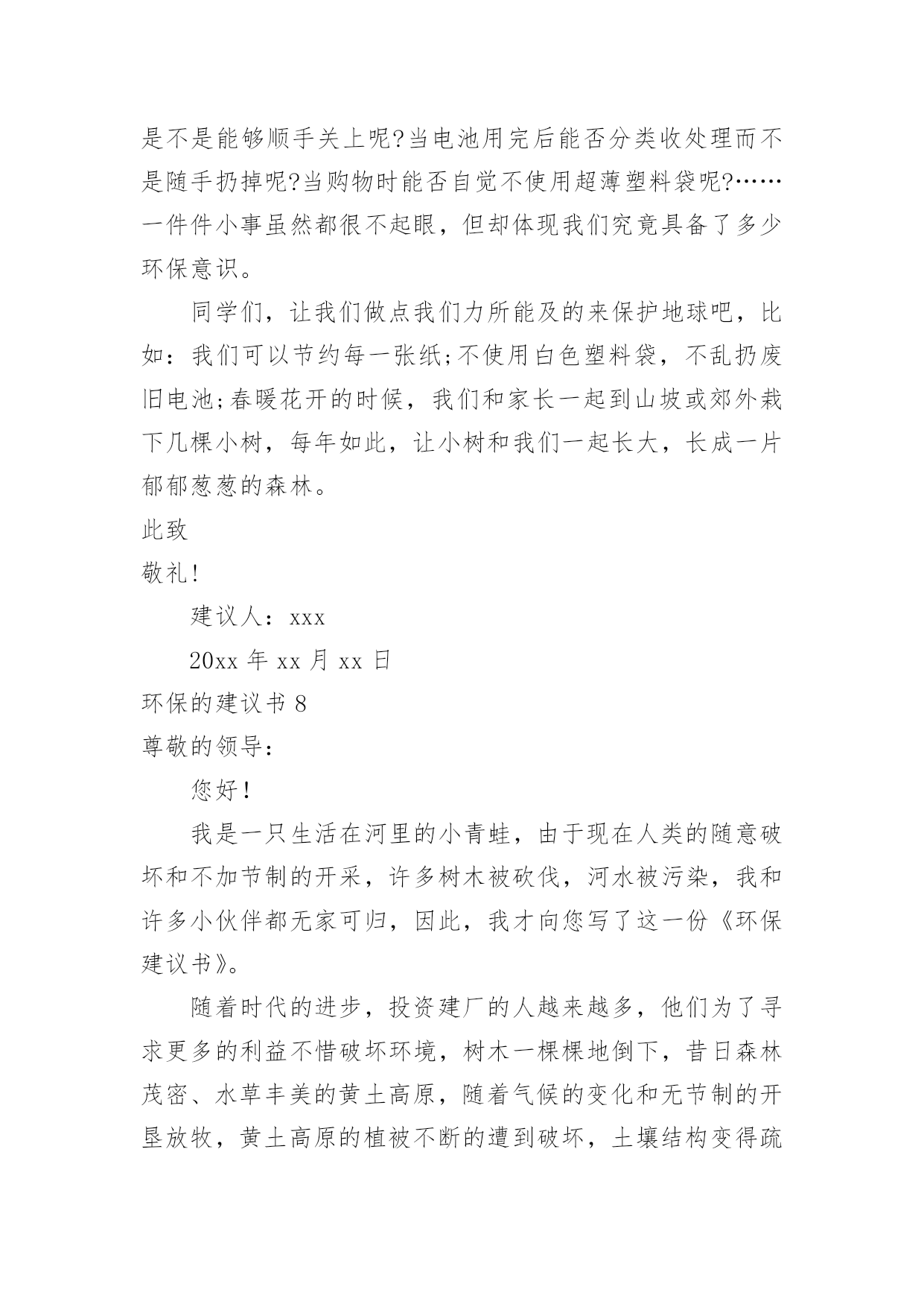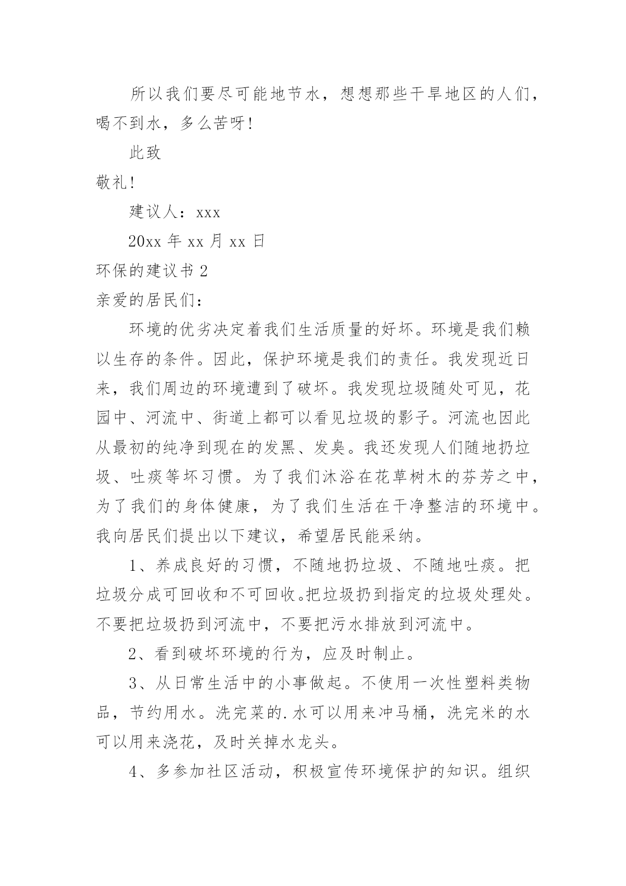 环保的建议书环保的建议书在生活中,越来越多人会去使用建议书,使用正确的写作思路书写建议书会更加事半功倍。为了让您在写建议书时更加简单方便,下面是小编收集整理的环保的建议书,仅供参考,欢迎大家阅读。环保的建议书1尊敬的小区居民:我是在北海小学读书的一名小学生。我从小就在这里居住,这里的环境变化我看得一清二楚我们这里大多数都贴着“请节约用水”、“请节约用电”的字样。,虽然这些都要我们做的',但是老年人比我们更积极,把家里能省的都省了,而我们却不节约,经常浪费。我有几条建议:1、每个人节省一些水,洗澡水冲厕所;洗脸的水可以洗脚,洗完脚又可以浇花。2、每天做到不浪费水,把可以用的水循环使用。3、洗手的时候,看见旁边的水龙头开着或滴着水,可以帮忙把它关掉。如果每个人都做到以上这些,那么每年可以节省几十吨水,节省出来的水又可以给那些干旱地区,真是一举两得所以我们要尽可能地节水,想想那些干旱地区的人们,喝不到水,多么苦呀!此致敬礼!建议人:xxx20xx年xx月xx日环保的建议书2亲爱的居民们:环境的优劣决定着我们生活质量的好坏。环境是我们赖以生存的条件。因此,保护环境是我们的责任。我发现近日来,我们周边的环境遭到了破坏。我发现垃圾随处可见,花园中、河流中、街道上都可以看见垃圾的影子。河流也因此从最初的纯净到现在的发黑、发臭。我还发现人们随地扔垃圾、吐痰等坏习惯。为了我们沐浴在花草树木的芬芳之中,为了我们的身体健康,为了我们生活在干净整洁的环境中。我向居民们提出以下建议,希望居民能采纳。1、养成良好的习惯,不随地扔垃圾、不随地吐痰。把垃圾分成可回收和不可回收。把垃圾扔到指定的垃圾处理处。不要把垃圾扔到河流中,不要把污水排放到河流中。2、看到破坏环境的行为,应及时制止。3、从日常生活中的小事做起。不使用一次性塑料类物品,节约用水。洗完菜的.水可以用来冲马桶,洗完米的水可以用来浇花,及时关掉水龙头。4、多参加社区活动,积极宣传环境保护的知识。组织大家一起植树,一起为环境做贡献。我们共同居住在这个地方,仅仅靠一个人的力量来保护环境、美好环境是远远不够的。需要大家齐心协力、团结合作。让我们共同努力建设一个文明、美丽、和谐的社区。居民们,行动起来吧,从今天开始,从小事做起。建议人:xxx20xx年xx月xx日环保的建议书3敬爱的老师,亲爱的同学们:大家好!你们的妈妈给了你们生命,你们是不是应该报答你们的妈妈呢?那我们的地球妈妈给了我们人类生存的资源和条件,那我们人类是否好应该报答地球妈妈呢。可是,我们人类不仅不报答地球妈妈,而且还破坏地球妈妈给予我们人类赖以生存的资源。地球是我们人类赖以生存的家园,若地球失去了我们人类生存的条件,那我们的子孙后代将生活在哪里呢?以前地球妈妈给予我们的大森林,现在有些可恨的人们随意砍伐树木,不顾后果地滥用化学品,不但使森林在渐渐地消失,还造成了一系列生态灾难。人类啊,我们的地球妈妈已经被我们伤得不轻了,如果我们再不保护环境,保护我们的地球妈妈,不久的将来,地球妈妈将会消失在茫茫的宇宙里。同学们,为了我们的地球妈妈,为了给我们的子孙后代留下一个良好的居住环境,为此我有几个小建议:1、提倡多植树,少砍伐树木。2、提倡不要乱扔垃圾,应该把垃圾分类扔到指定的'垃圾箱中。3、教育广大市民不要浪费资源,包括不浪费一张纸、一滴水。4、加强环保宣传,形成良好的环保氛围。作为地球的小主人,改善地球环境和节约资源,是我们义不容辞的责任和义务。希望同学们能够一起保护我们的地球妈妈!育才一小六(6)班孙乔楠XX年十一月十九日环保的建议书4地球村的小公民们:我们赖以生存的地球只有一个,它多么需要我们的保护啊!可是,有些小公民非但不听,还肆意的把污水,废弃,餐桌上被丢弃的食物,堆积如山的一次性筷子,哗哗流淌的自来水浪费掉,扔掉。这样的画面真是触目惊心。地球,这位人类的母亲,生命的摇篮。曾是那样美丽,那么壮观。但现在,却被一些来路不明的`垃圾压得喘不过气。一点一点,随着时间下沉。我们为了自己的利益,不惜乱采乱挖,随意排放污染物……于是,一座座挺拔的山变秃了,一条条清澈的河水变黑了……地球母亲正在痛苦的呻吟。如果地球被污染,我们的生命将会毁在自己手上。作为地球上的一员,我们有责任,有义务来保护地球。从小事做起,从身边做起。保护我们的家园,让我们的地球恢复原来的面貌。因此,我建议:1、尽量少用一次性类物品,减少白色污染,自备购物袋和篮子。2、不管在生活中,学习中,还是工作中,都要节约资源。用水,用电,要节制。杜绝各种浪费迹象,消费也要节俭一点。3、废纸,废塑料,废金属等所有可回收物品,要分类回收,是资源可以不断再生,从而减少垃圾污染。4、植树造林,爱护身边的一寸地,一株花草,一棵树木。多种些花草树木,来绿化环境,防止污染环境。5、注意个人卫生,不随