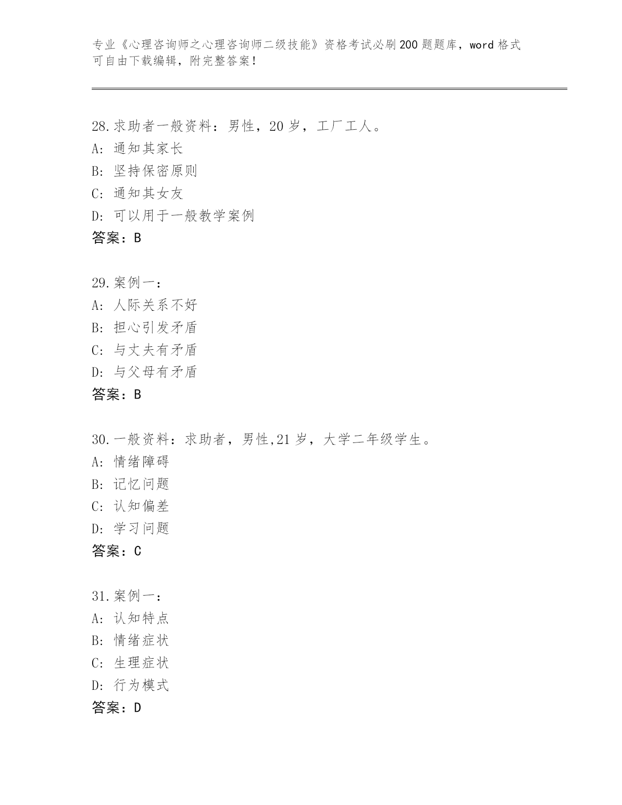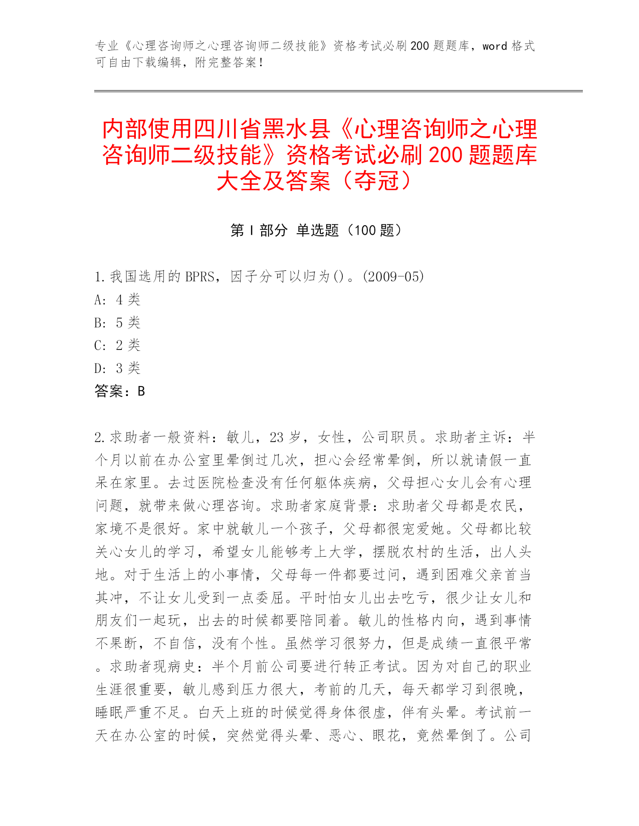 四川省黑水县《心理咨询师之心理咨询师二级技能》资格考试必刷200题内部题库有答案解析