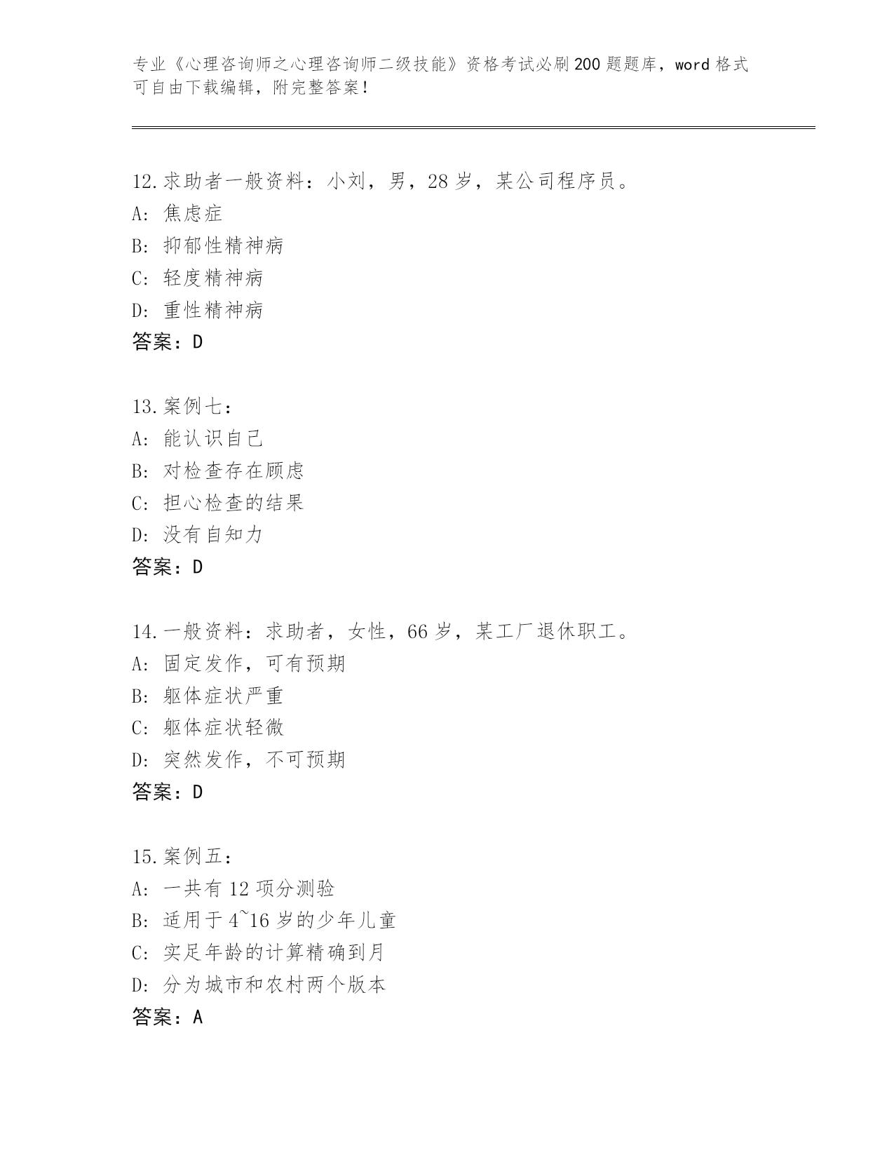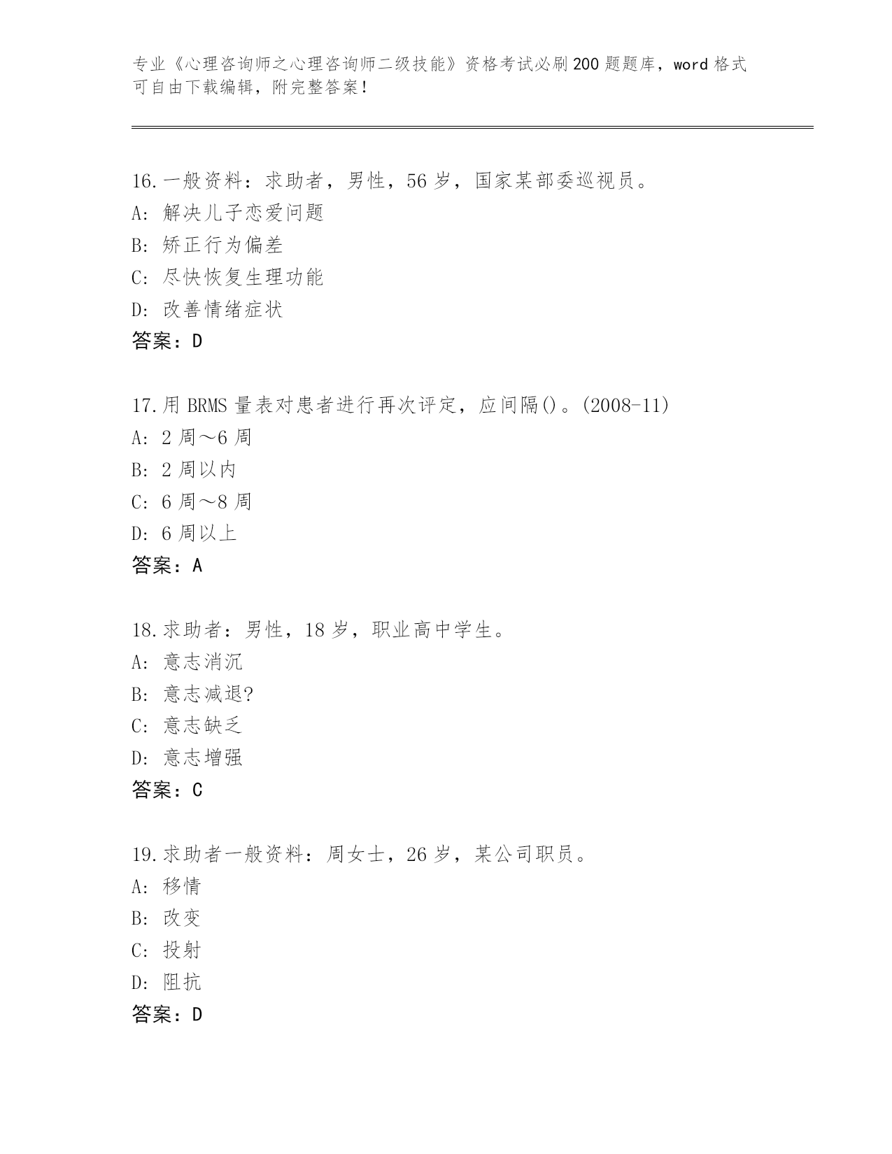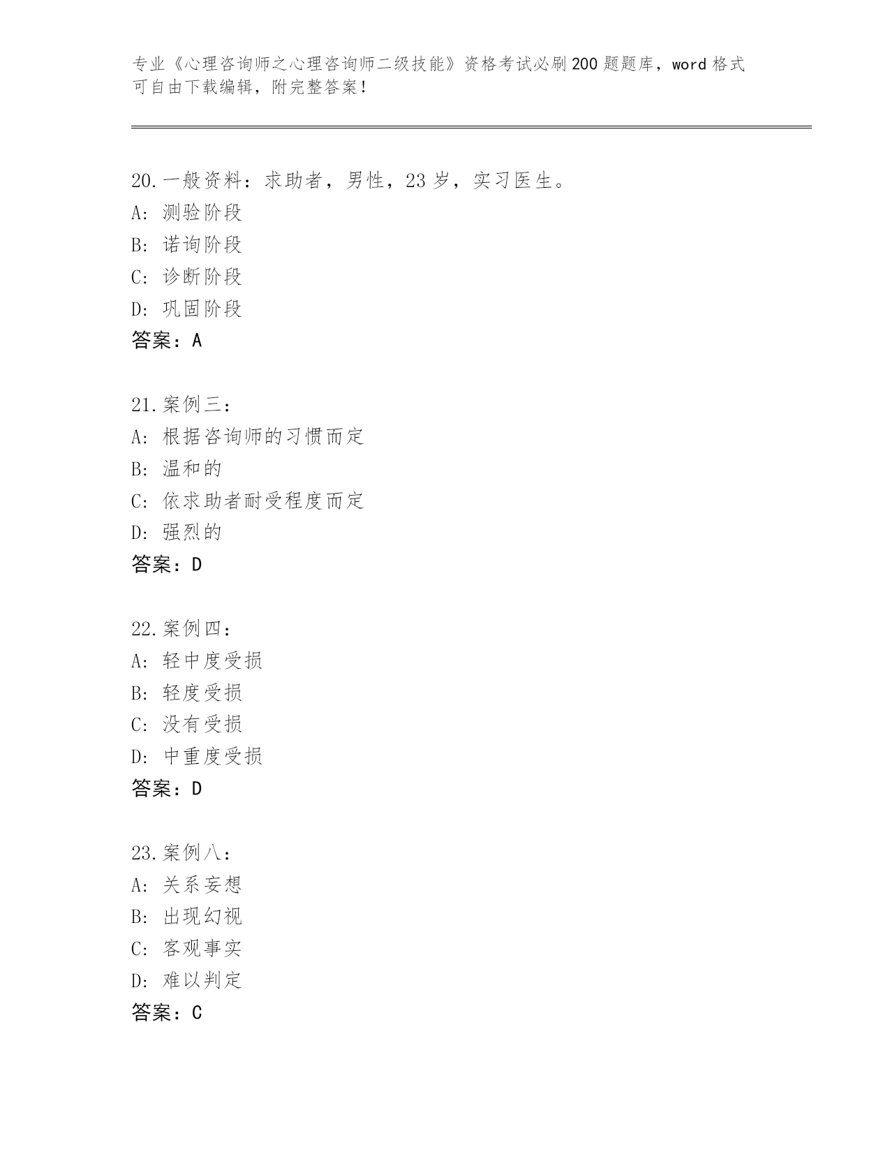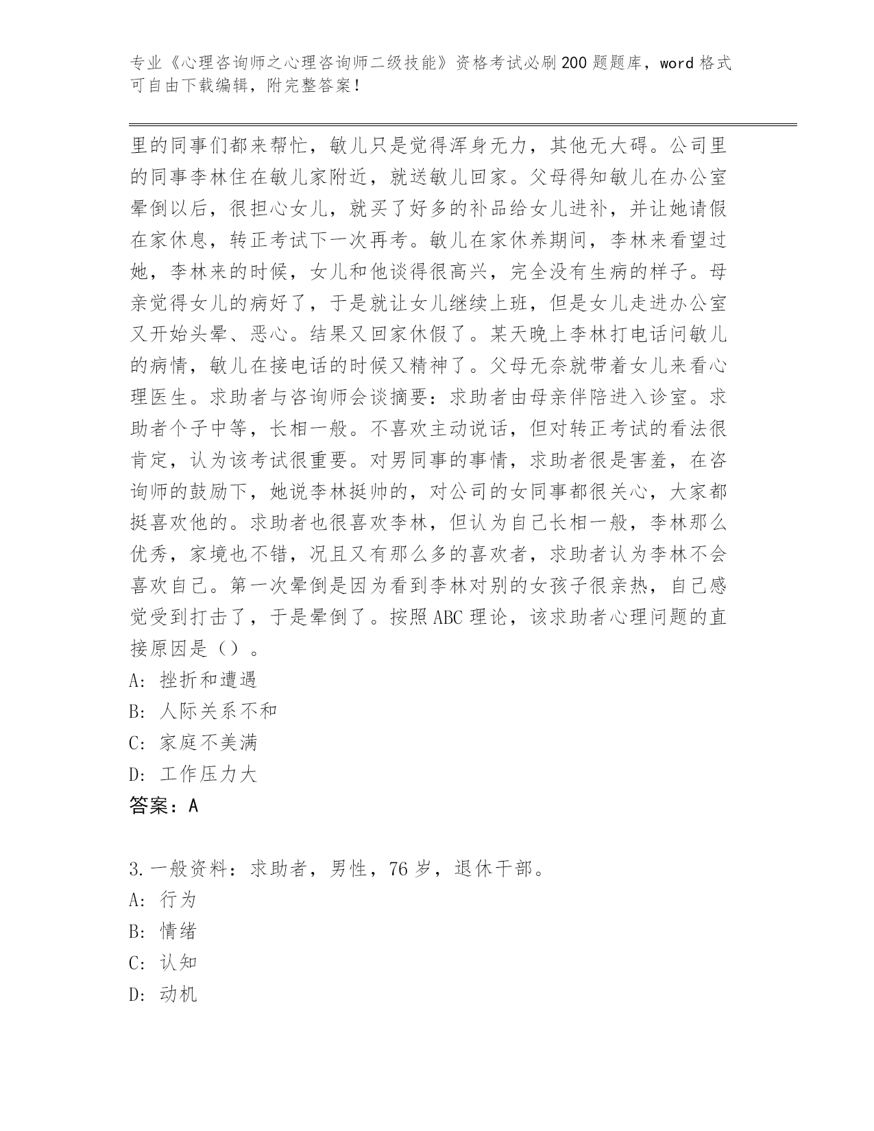 山东省黄岛区内部使用《心理咨询师之心理咨询师二级技能》考试必刷200题大全(夺冠)