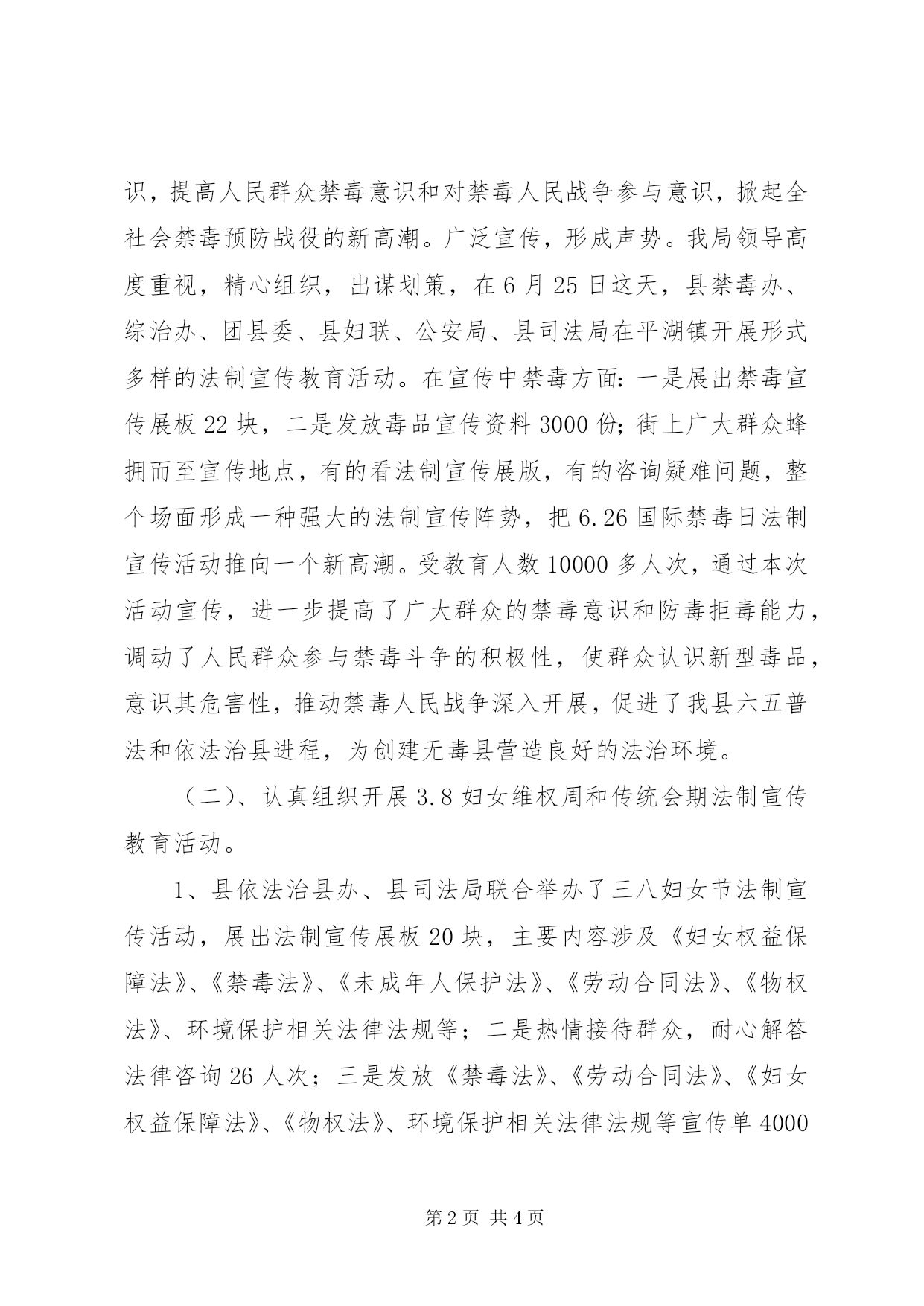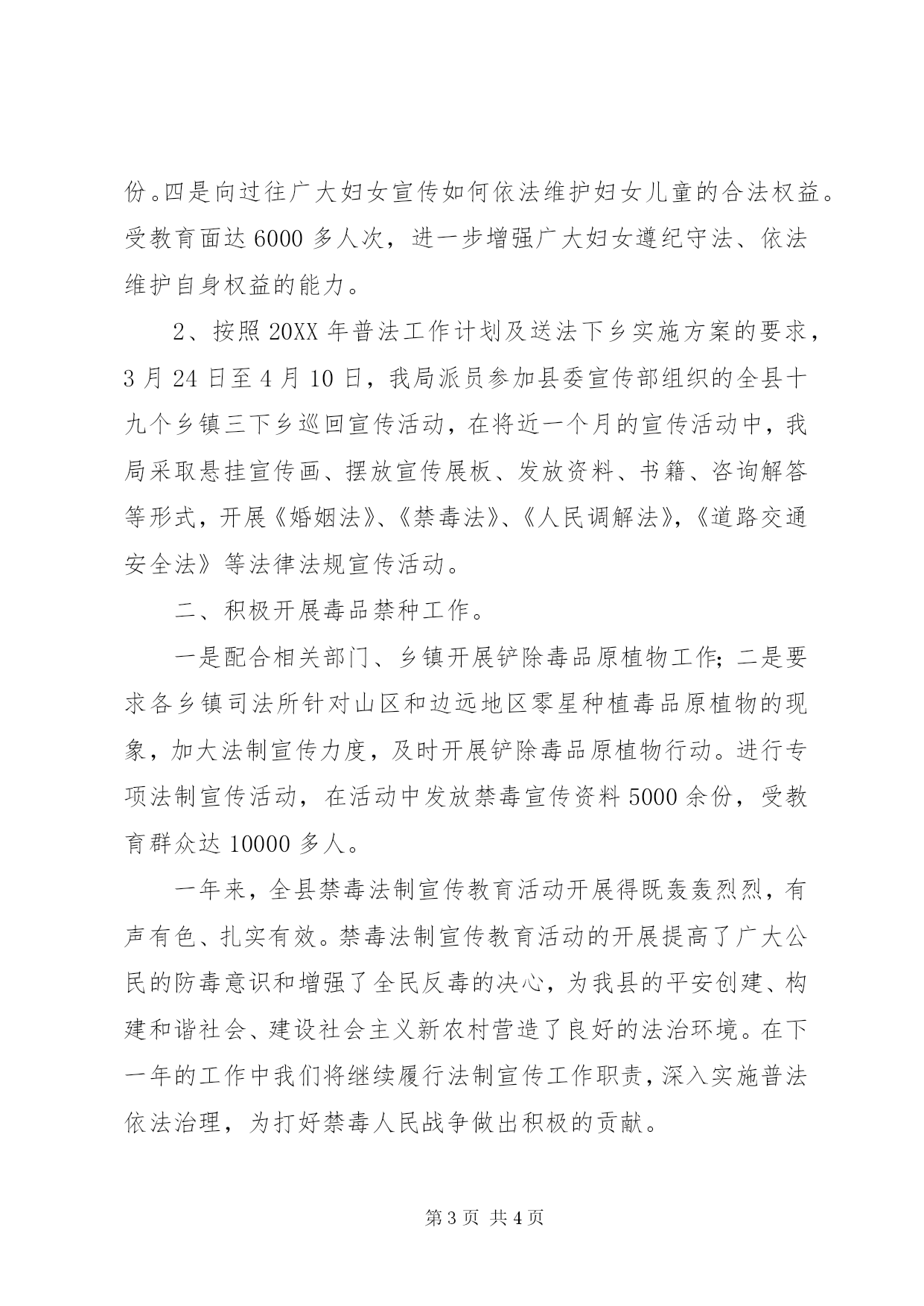 第PAGE\*Arabic\*MERGEFORMAT4页共NUMPAGES\*MERGEFORMAT4页县司法局禁毒工作总结在县委、政府的领导下,在州依法治州办的悉心指导下,在各部门的配合和全社会的参与支持下,作为县禁毒委员会成员单位,我局始终围绕年初签订的《***县二0一二年禁毒工作目标管理责任书》,把禁毒作为法制宣传工作的一项重中之重的工作来抓,充分发挥了法制宣传教育职能作用。进一步深入贯彻《全民禁毒教育实施意见》、司法部《关于做好中华人民共和国禁毒法贯彻实施有关工作的通知》和普及《禁毒法》,切实提高全社会禁毒法律意识,推进禁毒预防战役的深入开展,根据县禁毒委的要求,现将我局20XX年禁毒工作情况作如下总结:一、积极开展禁毒法制宣传教育。禁毒法制宣传教育作为普法依法治理工作的一项重要内容,每年就如何开展好禁毒法制宣传教育工作都有具体的安排和计划,结合县情实际,制定切实可行的年度禁毒法制宣传教育实施方案。根据省、州、县政法工作会议精神,结合六五普法规划和依法治县规划要求,深入开展禁毒法制宣传教育工作。(一)、认真组织开展国际禁毒日宣传活动。在国际禁毒日期间,紧紧围绕禁吸、禁贩、禁种、禁制四禁并举方针,及时开展法制宣传教育工作。进一步提高了广大人民群众禁毒意识,不断地增强抵御毒品诱惑及与毒品违法犯罪作斗争的能力。继续深化毒品预防教育工作,面向全社会普及禁毒知识,提高人民群众禁毒意识和对禁毒人民战争参与意识,掀起全社会禁毒预防战役的新高潮。广泛宣传,形成声势。我局领导高度重视,精心组织,出谋划策,在6月25日这天,县禁毒办、综治办、团县委、县妇联、公安局、县司法局在平湖镇开展形式多样的法制宣传教育活动。在宣传中禁毒方面:一是展出禁毒宣传展板22块,二是发放毒品宣传资料3000份;街上广大群众蜂拥而至宣传地点,有的看法制宣传展版,有的咨询疑难问题,整个场面形成一种强大的法制宣传阵势,把6.26国际禁毒日法制宣传活动推向一个新高潮。受教育人数10000多人次,通过本次活动宣传,进一步提高了广大群众的禁毒意识和防毒拒毒能力,调动了人民群众参与禁毒斗争的积极性,使群众认识新型毒品,意识其危害性,推动禁毒人民战争深入开展,促进了我县六五普法和依法治县进程,为创建无毒县营造良好的法治环境。(二)、认真组织开展3.8妇女维权周和传统会期法制宣传教育活动。1、县依法治县办、县司法局联合举办了三八妇女节法制宣传活动,展出法制宣传展板20块,主要内容涉及《妇女权益保障法》、《禁毒法》、《未成年人保护法》、《劳动合同法》、《物权法》、环境保护相关法律法规等;二是热情接待群众,耐心解答法律咨询26人次;三是发放《禁毒法》、《劳动合同法》、《妇女权益保障法》、《物权法》、环境保护相关法律法规等宣传单4000份。四是向过往广大妇女宣传如何依法维护妇女儿童的合法权益。受教育面达6000多人次,进一步增强广大妇女遵纪守法、依法维护自身权益的能力。2、按照20XX年普法工作计划及送法下乡实施方案的要求,3月24日至4月10日,我局派员参加县委宣传部组织的全县十九个乡镇三下乡巡回宣传活动,在将近一个月的宣传活动中,我局采取悬挂宣传画、摆放宣传展板、发放资料、书籍、咨询解答等形式,开展《婚姻法》、《禁毒法》、《人民调解法》,《道路交通安全法》等法律法规宣传活动。二、积极开展毒品禁种工作。一是配合相关部门、乡镇开展铲除毒品原植物工作;二是要求各乡镇司法所针对山区和边远地区零星种植毒品原植物的现象,加大法制宣传力度,及时开展铲除毒品原植物行动。进行专项法制宣传活动,在活动中发放禁毒宣传资料5000余份,受教育群众达10000多人。一年来,全县禁毒法制宣传教育活动开展得既轰轰烈烈,有声有色、扎实有效。禁毒法制宣传教育活动的开展提高了广大公民的防毒意识和增强了全民反毒的决心,为我县的平安创建、构建和谐社会、建设社会主义新农村营造了良好的法治环境。在下一年的工作中我们将继续履行法制宣传工作职责,深入实施普法依法治理,为打好禁毒人民战争做出积极的贡献。***县司法局二0一三年十二月十二日