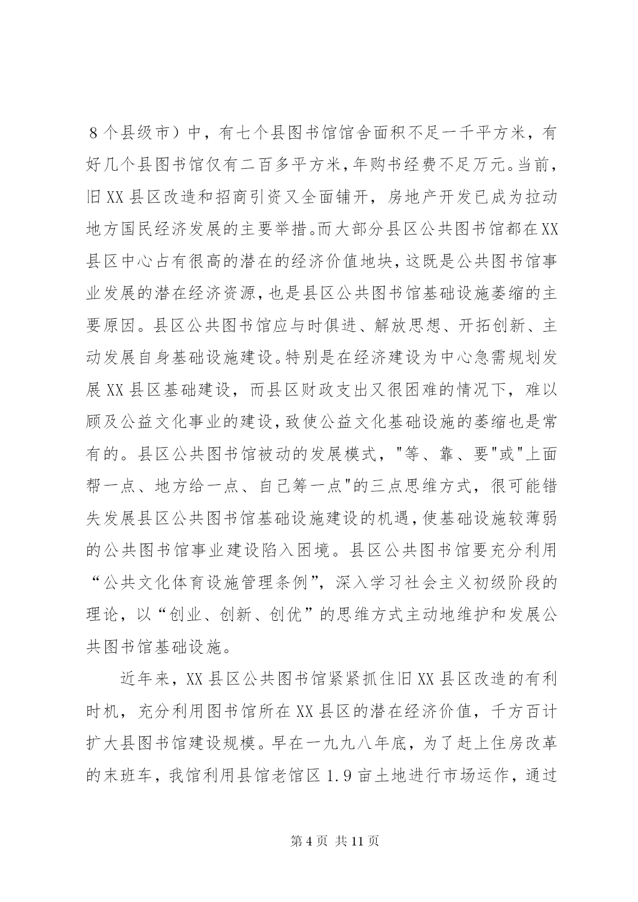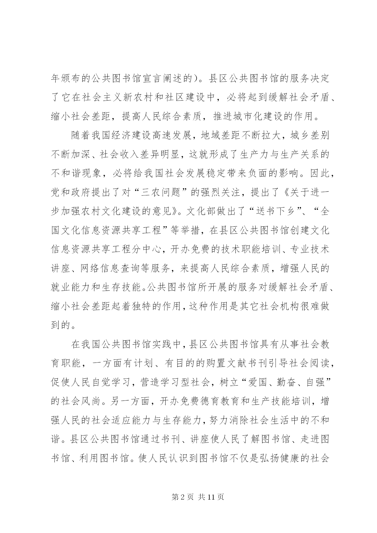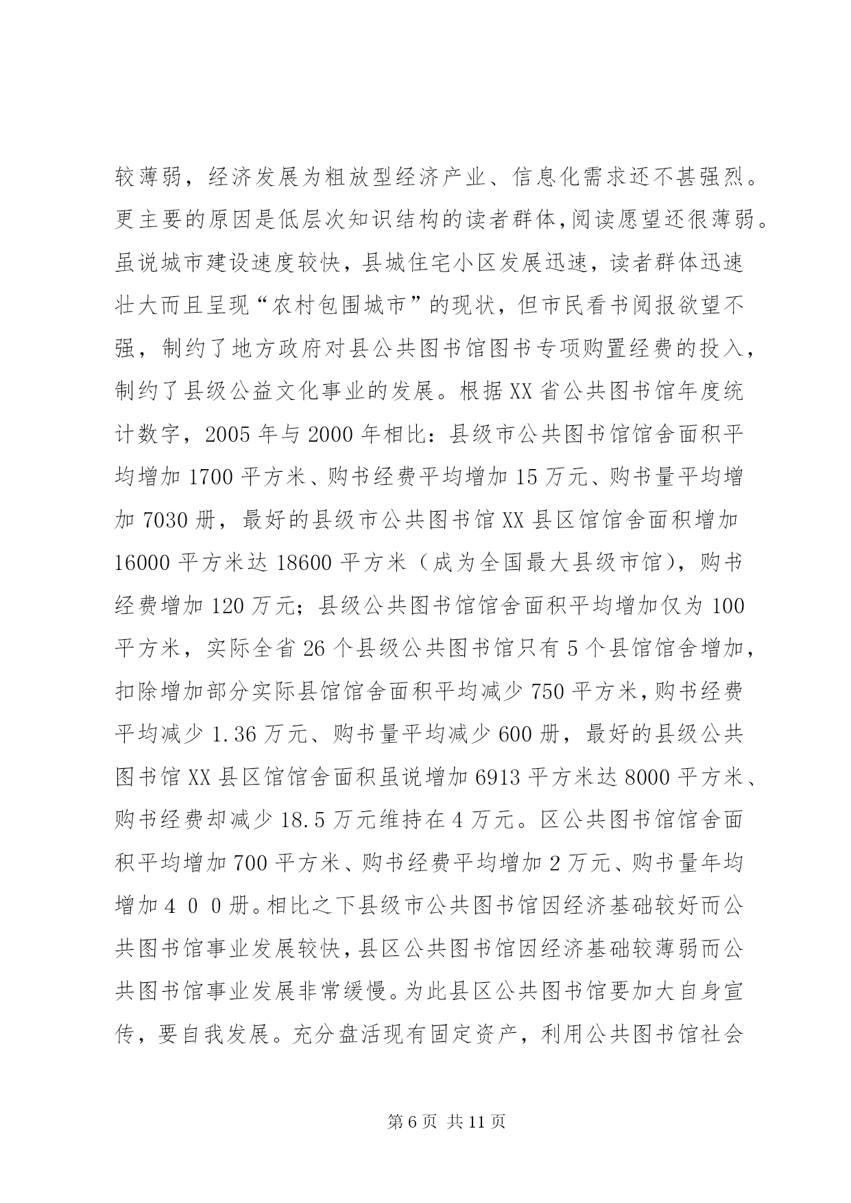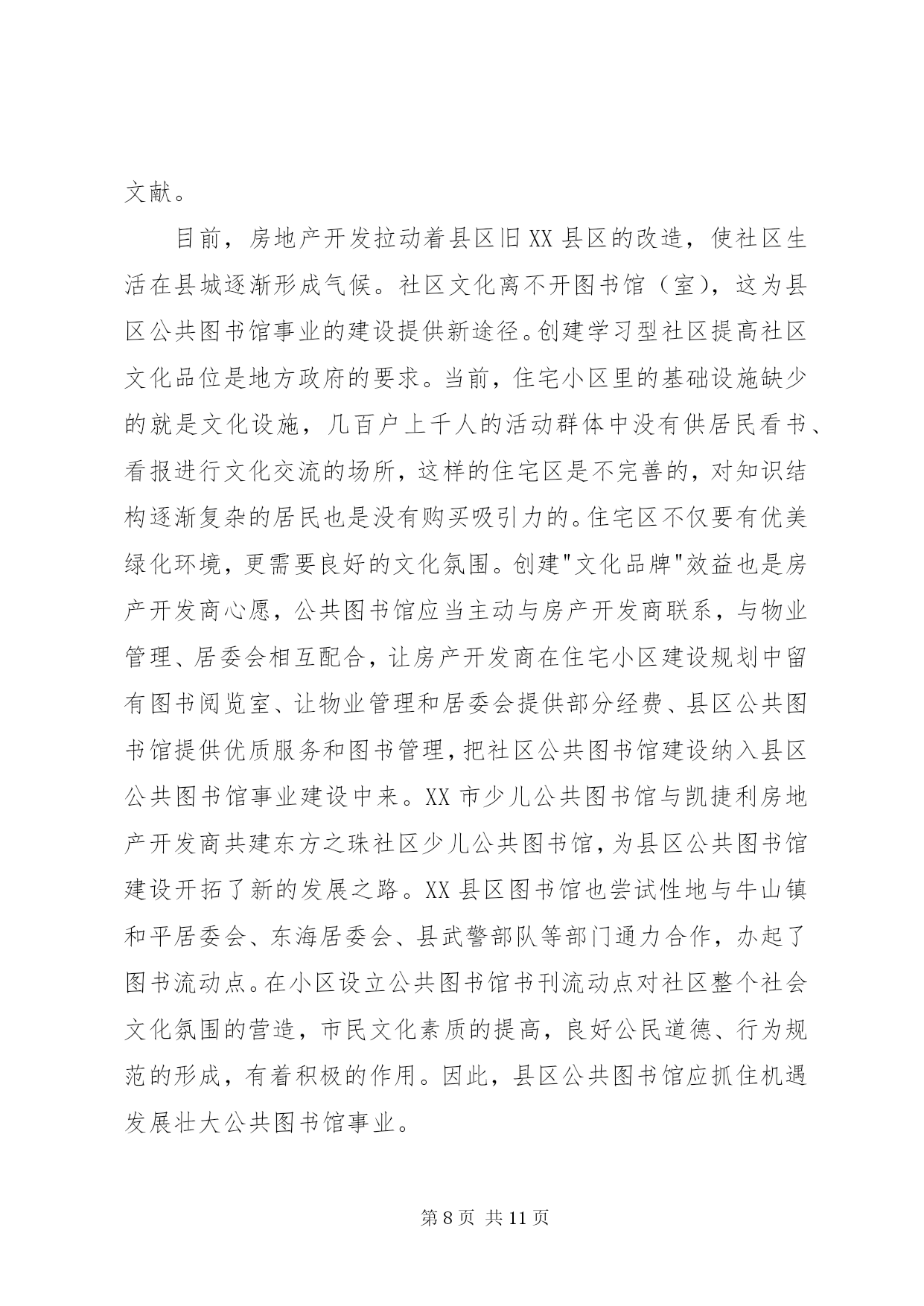 第PAGE\*Arabic\*MERGEFORMAT11页共NUMPAGES\*MERGEFORMAT11页新时期县区公共图书馆建设思考论文提要本文结合本馆工作实践就县区公共图书馆在新时期如何适应社会,巩固、发展基础设施和文化网络建设,充分发挥其文化、教育职能更好地为新农村和社区文化生活服务,提出自己的见解。随着人民物质生活地不断丰富,精神生活品位逐步提高,人们为了适应现代生活,需要不断地获取信息以构筑复合型的知识结构以适应社会。然而,以经济建设为中心,县区地方政府现阶段就很难顾及公共图书馆等社会公益性文化事业的建设。各地旧XX县区改造,房地产开发及招商引资又迫使县区公共图书馆等文化设施必须为经济建设让路,使部分公共图书馆从县城文化、经济、政治中心走向偏离人群的城郊,县区公共图书馆基础设施发展缓慢。针对诸如此类的问题,笔者结合本馆实际情况,就县区公共图书馆建设谈谈自己的想法。1、县区公共图书馆应充分认识其在社会主义新农村文化建设中的作用,让人民群众了解图书馆,认识图书馆,利用图书馆的优势使之成为人民心目中“自我完善、自我教育”的学校,这是新时期县区公共图书馆建设的群众基础。县区公共图书馆是最贴近百姓、体系完备、免费服务的机构,读者不受年龄、种族、性别、宗教信仰、国籍、社会地位的限制而原则上免费地享受服务(这是联合国教科文组织和国际图联94年颁布的公共图书馆宣言阐述的)。县区公共图书馆的服务决定了它在社会主义新农村和社区建设中,必将起到缓解社会矛盾、缩小社会差距,提高人民综合素质,推进城市化建设的作用。随着我国经济建设高速发展,地域差距不断拉大,城乡差别不断加深、社会收入差异明显,这就形成了生产力与生产关系的不和谐现象,必将给我国社会发展稳定带来负面的影响。因此,党和政府提出了对“三农问题”的强烈关注,提出了《关于进一步加强农村文化建设的意见》。文化部做出了“送书下乡”、“全国文化信息资源共享工程”等举措,在县区公共图书馆创建文化信息资源共享工程分中心,开办免费的技术职能培训、专业技术讲座、网络信息查询等服务,来提高人民综合素质,增强人民的就业能力和生存技能。公共图书馆所开展的服务对缓解社会矛盾、缩小社会差距起着独特的作用,这种作用是其它社会机构很难做到的。在我国公共图书馆实践中,县区公共图书馆具有从事社会教育职能,一方面有计划、有目的的购置文献书刊引导社会阅读,促使人民自觉学习,营造学习型社会,树立“爱国、勤奋、自强”的社会风尚。另一方面,开办免费德育教育和生产技能培训,增强人民的社会适应能力与生存能力,努力消除社会生活中的不和谐。县区公共图书馆通过书刊、讲座使人民了解图书馆、走进图书馆、利用图书馆。使人民认识到图书馆不仅是弘扬健康的社会文化、传播先进文化风尚的主阵地,还是人民自我教育、自我完善的最自由和及时获取知识的文献中心。同时,县区公共图书馆具有提升城市文化品位的作用。古朴、典雅具有知识殿堂之称的公共图书馆建筑,充分体现了城镇居民的精神面貌。保存人类文化遗产是公共图书馆的一项重要职能,公共图书馆有着向人民进行文化展示、文化教育、文化交流、文化休闲的作用。优雅读书环境更能突出和提高城市居民的文明素养和文化修养。县区公共图书馆不仅帮助人民获得生产技能,还使人民群众的思想品德、行为规范、综合素质等方面得到提升,特别是对青少年的思想道德教育起这十分重要的作用,也是保障人民提高自身修养的学习权力。不同的城市有不同的人文精神和乡土文化。县区公共图书馆是展示地方文化魅力和城市文明程度的主要标志。2、新时期县区公共图书馆应转变观念,深入学习社会主义初级阶段理论,将自己融与市场经济体系中去,多途径发展县区公共图书馆基础设施建设,这是新时期赋予公共图书馆重要的职责。县区公共图书馆基础设施是公共图书馆开展各项活动基础。近年来,虽然国民经济发展迅速,国民生产总值以二位数增长,但是地方财政支出还相当困难。特别在经济欠发达地区,县区公共图书馆基础设施能维持现状已十分艰难。在我省26个县(28个县级市)中,有七个县图书馆馆舍面积不足一千平方米,有好几个县图书馆仅有二百多平方米,年购书经费不足万元。当前,旧XX县区改造和招商引资又全面铺开,房地产开发已成为拉动地方国民经济发展的主要举措。而大部分县区公共图书馆都在XX县区中心占有很高的潜在的经济价值地块,这既是公共图书馆事业发展的潜在经济资源,也是县区公共图书馆基础设施萎缩的主要原因。县区公共图书馆应与时俱进、解放思想、开拓创新、主动发展自身基础设施建设。特别是在经济建设为中心急需规划发展XX县区基础建设,而县区财政支出又很困难的情况下,难以顾及公益文化事业的建设,致使公益文化基础设施的萎缩也是常有的。县区公共图书馆被动的发展模式,"等、靠、要"或"上面帮一点、地方给一点、自己