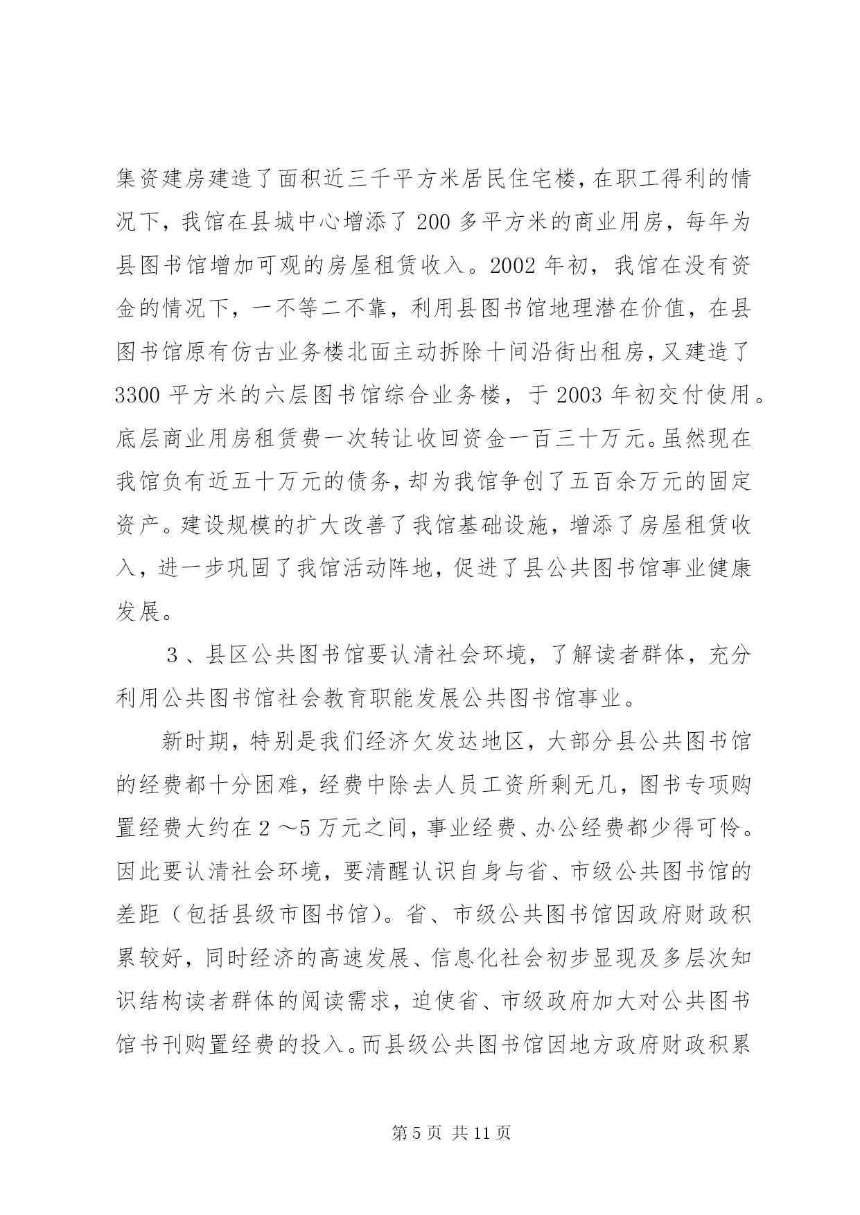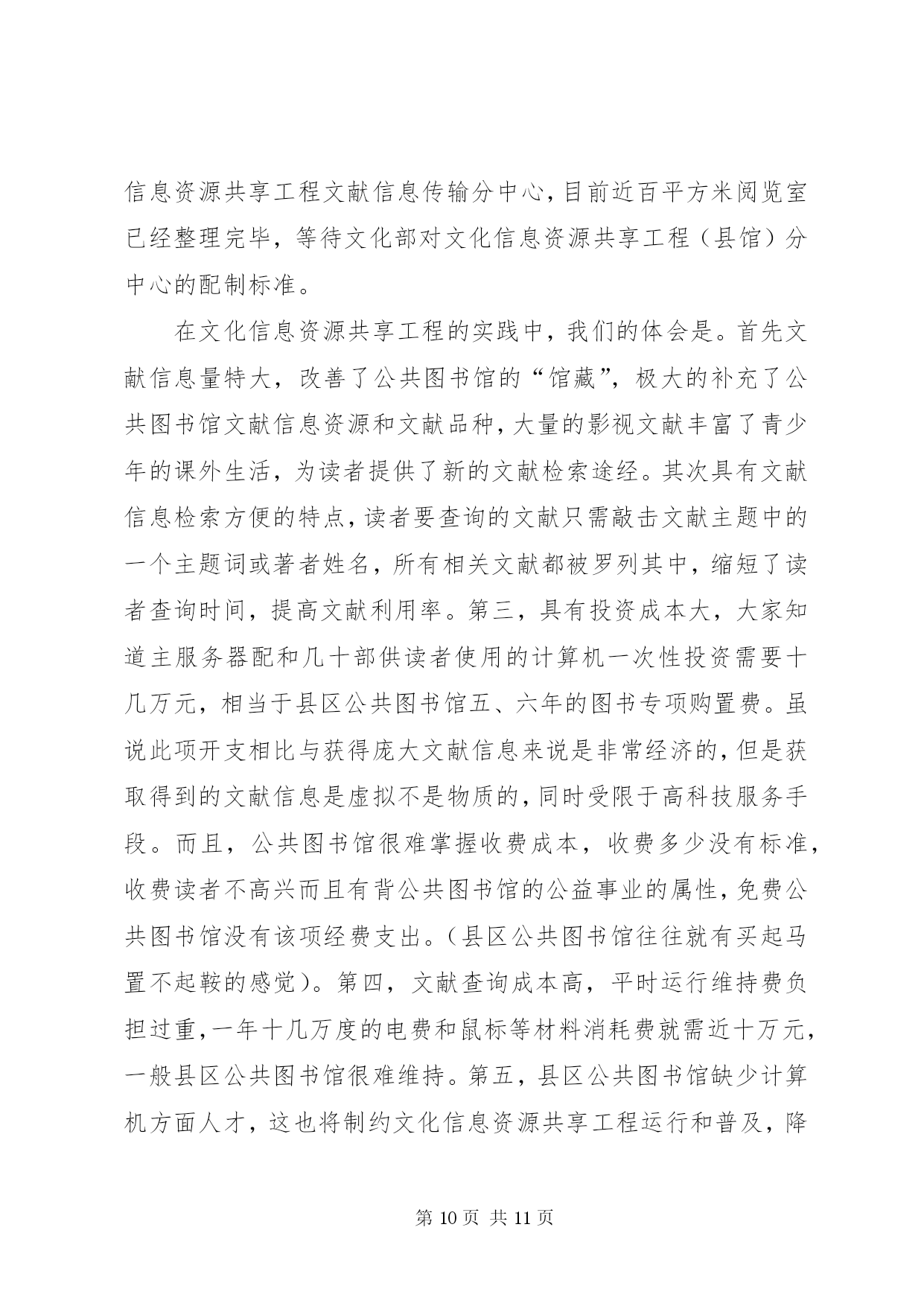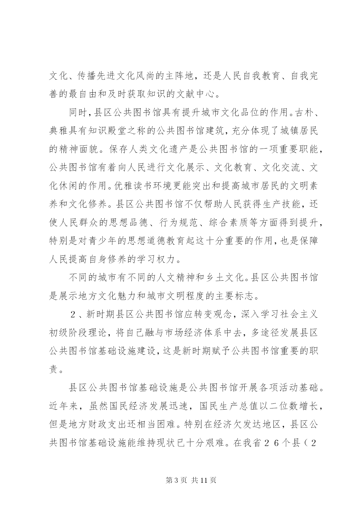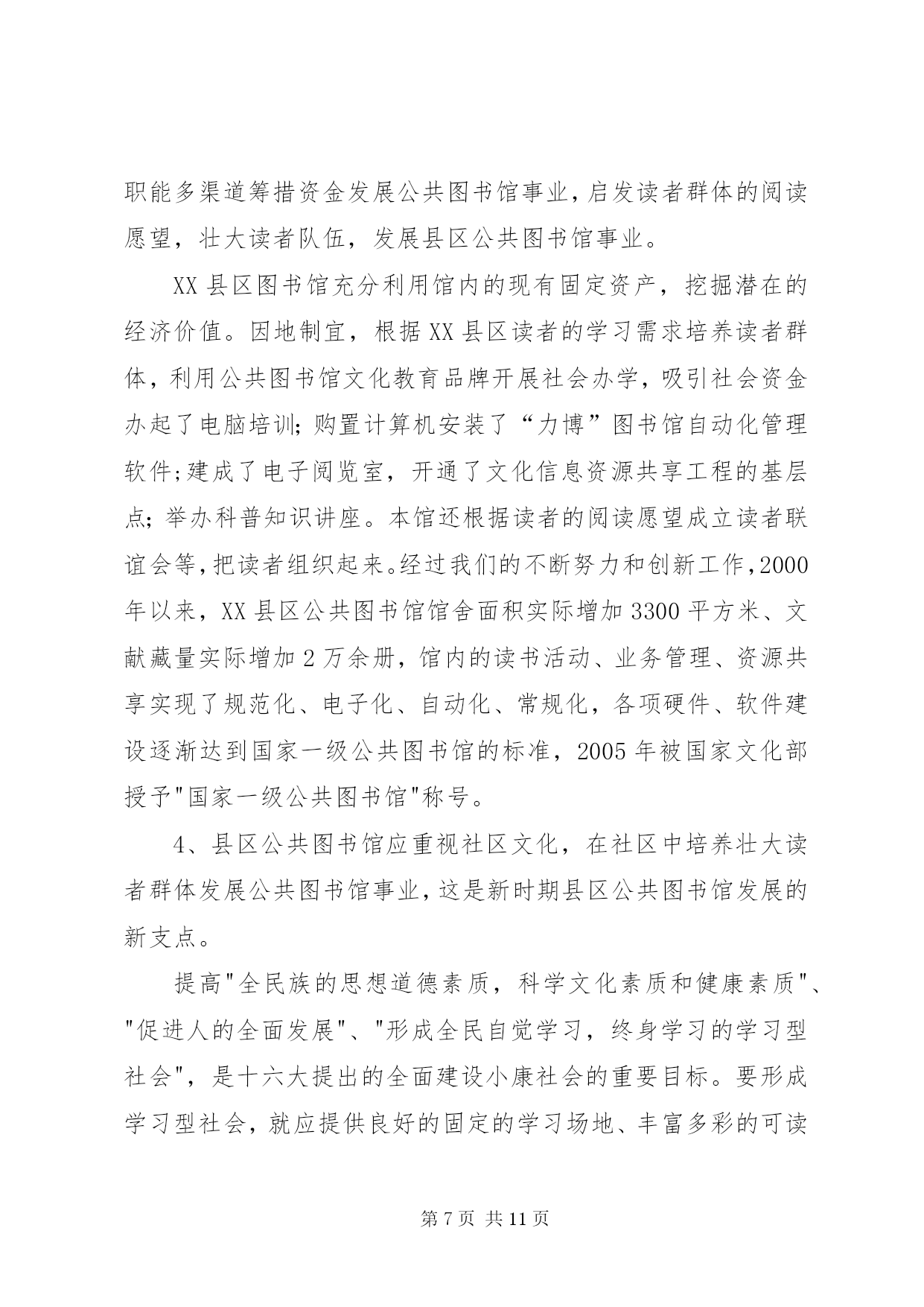 第PAGE\*Arabic\*MERGEFORMAT11页共NUMPAGES\*MERGEFORMAT11页新时期县区公共图书馆建设思考论文提要本文结合本馆工作实践就县区公共图书馆在新时期如何适应社会,巩固、发展基础设施和文化网络建设,充分发挥其文化、教育职能更好地为新农村和社区文化生活服务,提出自己的见解。随着人民物质生活地不断丰富,精神生活品位逐步提高,人们为了适应现代生活,需要不断地获取信息以构筑复合型的知识结构以适应社会。然而,以经济建设为中心,县区地方政府现阶段就很难顾及公共图书馆等社会公益性文化事业的建设。各地旧XX县区改造,房地产开发及招商引资又迫使县区公共图书馆等文化设施必须为经济建设让路,使部分公共图书馆从县城文化、经济、政治中心走向偏离人群的城郊,县区公共图书馆基础设施发展缓慢。针对诸如此类的问题,笔者结合本馆实际情况,就县区公共图书馆建设谈谈自己的想法。1、县区公共图书馆应充分认识其在社会主义新农村文化建设中的作用,让人民群众了解图书馆,认识图书馆,利用图书馆的优势使之成为人民心目中“自我完善、自我教育”的学校,这是新时期县区公共图书馆建设的群众基础。县区公共图书馆是最贴近百姓、体系完备、免费服务的机构,读者不受年龄、种族、性别、宗教信仰、国籍、社会地位的限制而原则上免费地享受服务(这是联合国教科文组织和国际图联94年颁布的公共图书馆宣言阐述的)。县区公共图书馆的服务决定了它在社会主义新农村和社区建设中,必将起到缓解社会矛盾、缩小社会差距,提高人民综合素质,推进城市化建设的作用。随着我国经济建设高速发展,地域差距不断拉大,城乡差别不断加深、社会收入差异明显,这就形成了生产力与生产关系的不和谐现象,必将给我国社会发展稳定带来负面的影响。因此,党和政府提出了对“三农问题”的强烈关注,提出了《关于进一步加强农村文化建设的意见》。文化部做出了“送书下乡”、“全国文化信息资源共享工程”等举措,在县区公共图书馆创建文化信息资源共享工程分中心,开办免费的技术职能培训、专业技术讲座、网络信息查询等服务,来提高人民综合素质,增强人民的就业能力和生存技能。公共图书馆所开展的服务对缓解社会矛盾、缩小社会差距起着独特的作用,这种作用是其它社会机构很难做到的。在我国公共图书馆实践中,县区公共图书馆具有从事社会教育职能,一方面有计划、有目的的购置文献书刊引导社会阅读,促使人民自觉学习,营造学习型社会,树立“爱国、勤奋、自强”的社会风尚。另一方面,开办免费德育教育和生产技能培训,增强人民的社会适应能力与生存能力,努力消除社会生活中的不和谐。县区公共图书馆通过书刊、讲座使人民了解图书馆、走进图书馆、利用图书馆。使人民认识到图书馆不仅是弘扬健康的社会文化、传播先进文化风尚的主阵地,还是人民自我教育、自我完善的最自由和及时获取知识的文献中心。同时,县区公共图书馆具有提升城市文化品位的作用。古朴、典雅具有知识殿堂之称的公共图书馆建筑,充分体现了城镇居民的精神面貌。保存人类文化遗产是公共图书馆的一项重要职能,公共图书馆有着向人民进行文化展示、文化教育、文化交流、文化休闲的作用。优雅读书环境更能突出和提高城市居民的文明素养和文化修养。县区公共图书馆不仅帮助人民获得生产技能,还使人民群众的思想品德、行为规范、综合素质等方面得到提升,特别是对青少年的思想道德教育起这十分重要的作用,也是保障人民提高自身修养的学习权力。不同的城市有不同的人文精神和乡土文化。县区公共图书馆是展示地方文化魅力和城市文明程度的主要标志。2、新时期县区公共图书馆应转变观念,深入学习社会主义初级阶段理论,将自己融与市场经济体系中去,多途径发展县区公共图书馆基础设施建设,这是新时期赋予公共图书馆重要的职责。县区公共图书馆基础设施是公共图书馆开展各项活动基础。近年来,虽然国民经济发展迅速,国民生产总值以二位数增长,但是地方财政支出还相当困难。特别在经济欠发达地区,县区公共图书馆基础设施能维持现状已十分艰难。在我省26个县(28个县级市)中,有七个县图书馆馆舍面积不足一千平方米,有好几个县图书馆仅有二百多平方米,年购书经费不足万元。当前,旧XX县区改造和招商引资又全面铺开,房地产开发已成为拉动地方国民经济发展的主要举措。而大部分县区公共图书馆都在XX县区中心占有很高的潜在的经济价值地块,这既是公共图书馆事业发展的潜在经济资源,也是县区公共图书馆基础设施萎缩的主要原因。县区公共图书馆应与时俱进、解放思想、开拓创新、主动发展自身基础设施建设。特别是在经济建设为中心急需规划发展XX县区基础建设,而县区财政支出又很困难的情况下,难以顾及公益文化事业的建设,致使公益文化基础设施的萎缩也是常有的。县区公共图书馆被动的发展模式,"等、靠、要"或"上面帮一点、地方给一点、自己