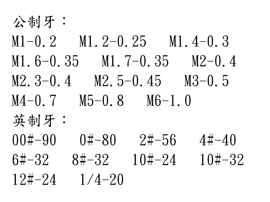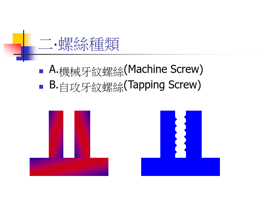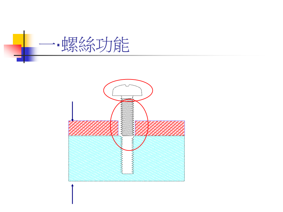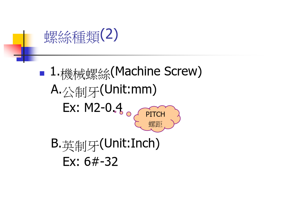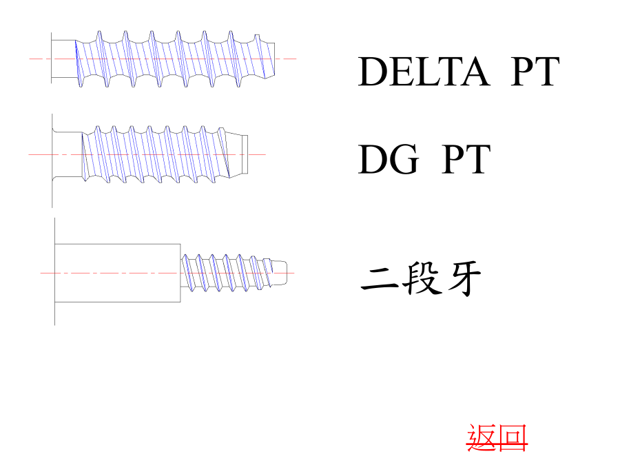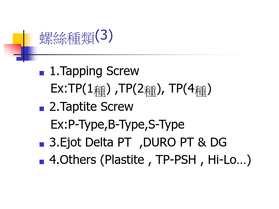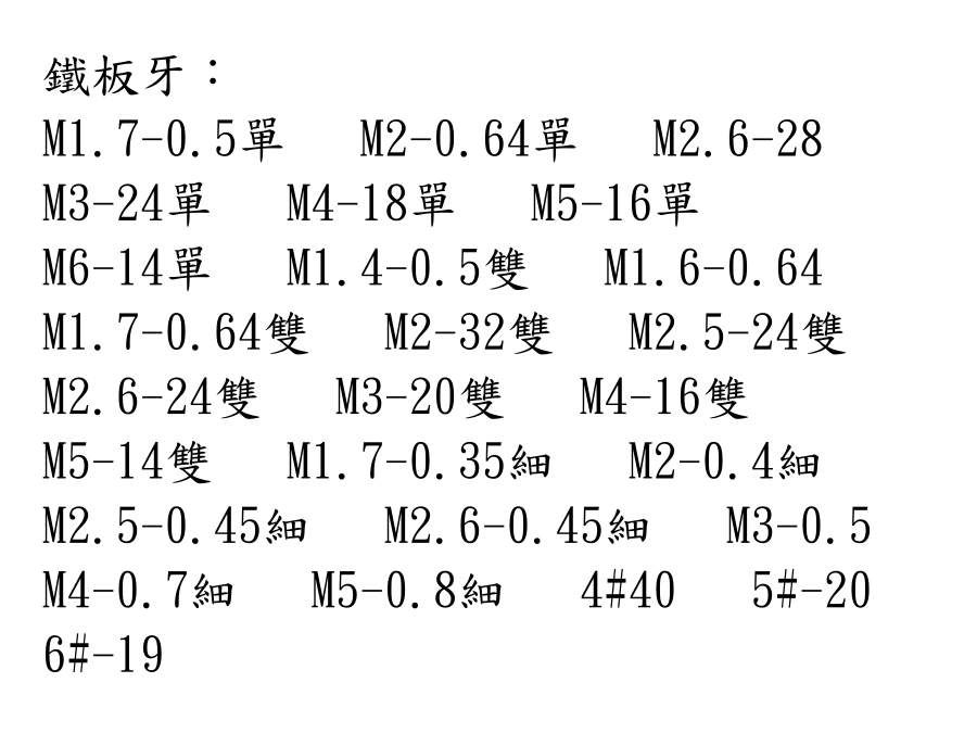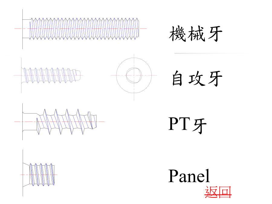 內容概述一.螺絲功能二.螺絲種類螺絲種類(2)公制牙:M1-0.2M1.2-0.25M1.4-0.3M1.6-0.35M1.7-0.35M2-0.4M2.3-0.4M2.5-0.45M3-0.5M4-0.7M5-0.8M6-1.0英制牙:00#-900#-802#-564#-406#-328#-3210#-2410#-3212#-241/4-201.TappingScrewEx:TP(1種),TP(2種),TP(4種)2.TaptiteScrewEx:P-Type,B-Type,S-Type3.EjotDeltaPT,DUROPT&DG4.Others(Plastite,TP-PSH,Hi-Lo…)機械牙DELTAPT鐵板牙:M1.7-0.5單M2-0.64單M2.6-28M3-24單M4-18單M5-16單M6-14單M1.4-0.5雙M1.6-0.64M1.7-0.64雙M2-32雙M2.5-24雙M2.6-24雙M3-20雙M4-16雙M5-14雙M1.7-0.35細M2-0.4細M2.5-0.45細M2.6-0.45細M3-0.5M4-0.7細M5-0.8細4#405#-206#-19三.螺絲規格PHW+LWM3-24x8TP-BFHFPH返回十字穴(philips)SW銅柱螺絲:頭徑:1.00~20.00mm外徑:0.50~10.00mm頭厚:0.20~10.00mm長度:1.00~150.0mm十字穴:0號針~3號針梅花穴:T2~T30內六角穴:M1~M8四.熱處理方式硬度測試位置圖五.常用表面處理六.常用檢測方式(機械性能)敲擊試驗座常用材質常用國際規範