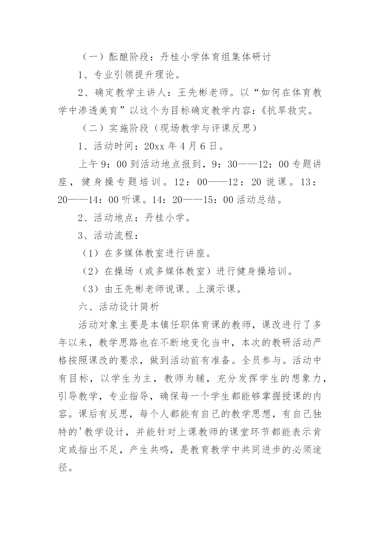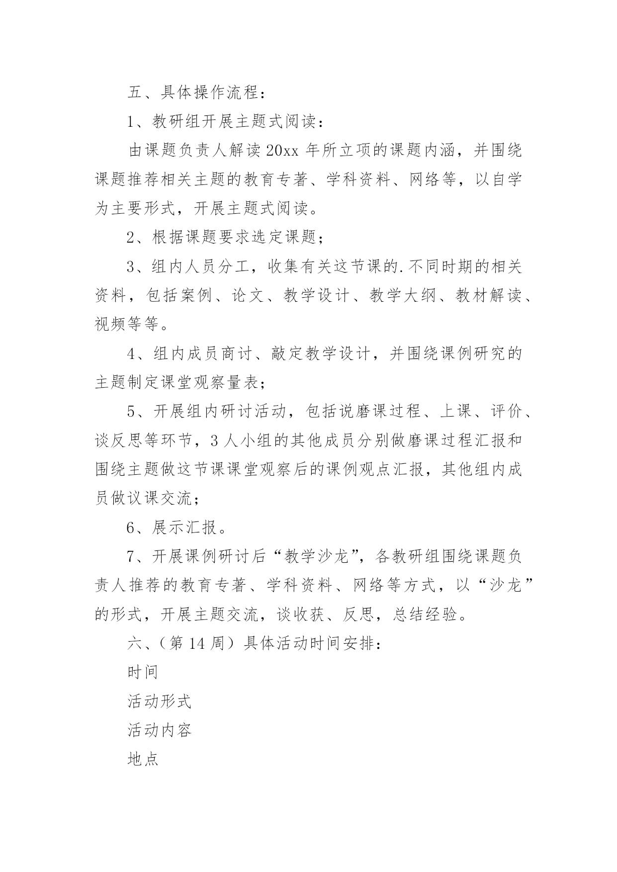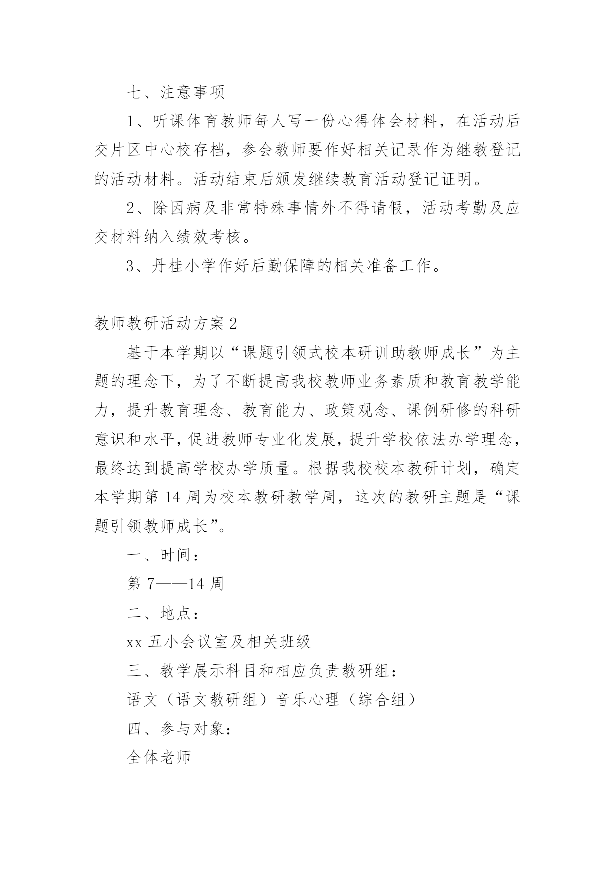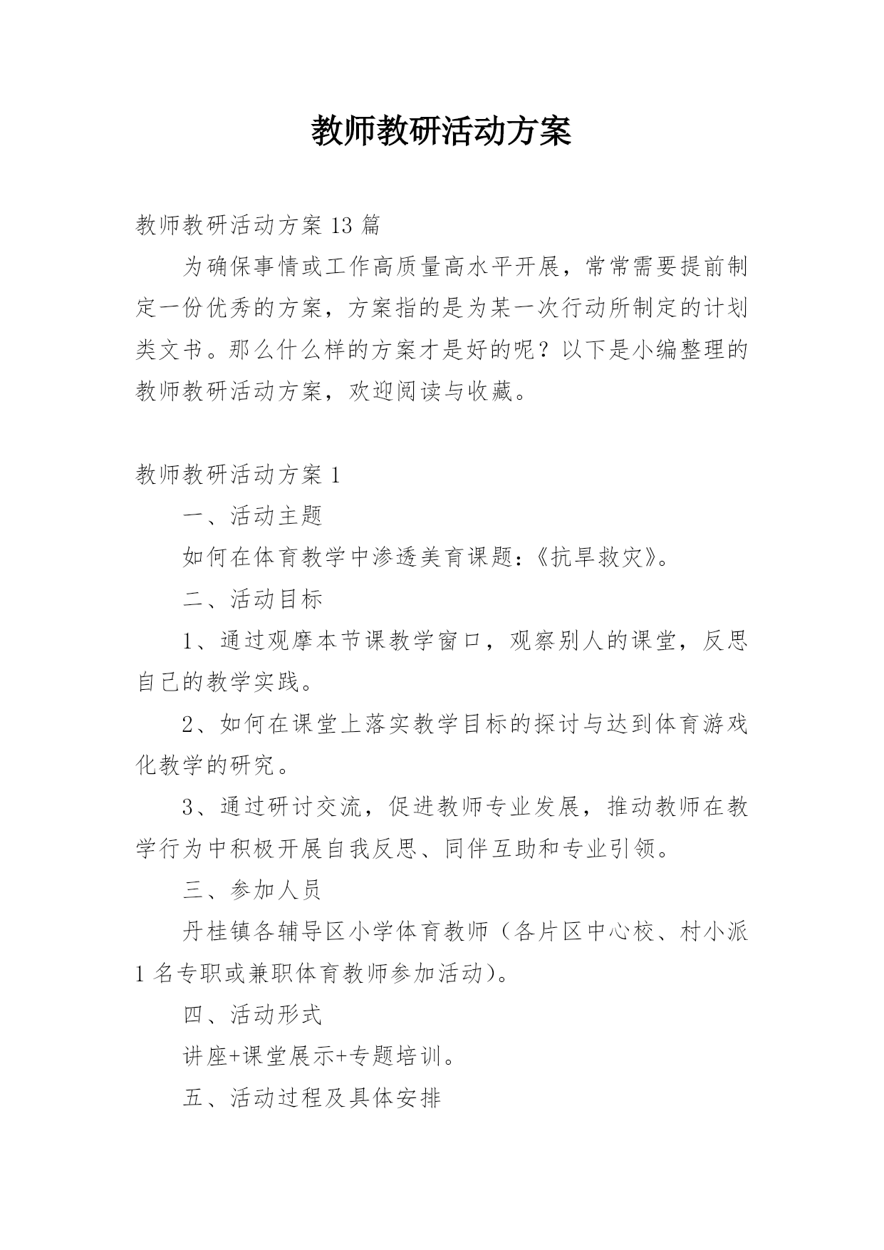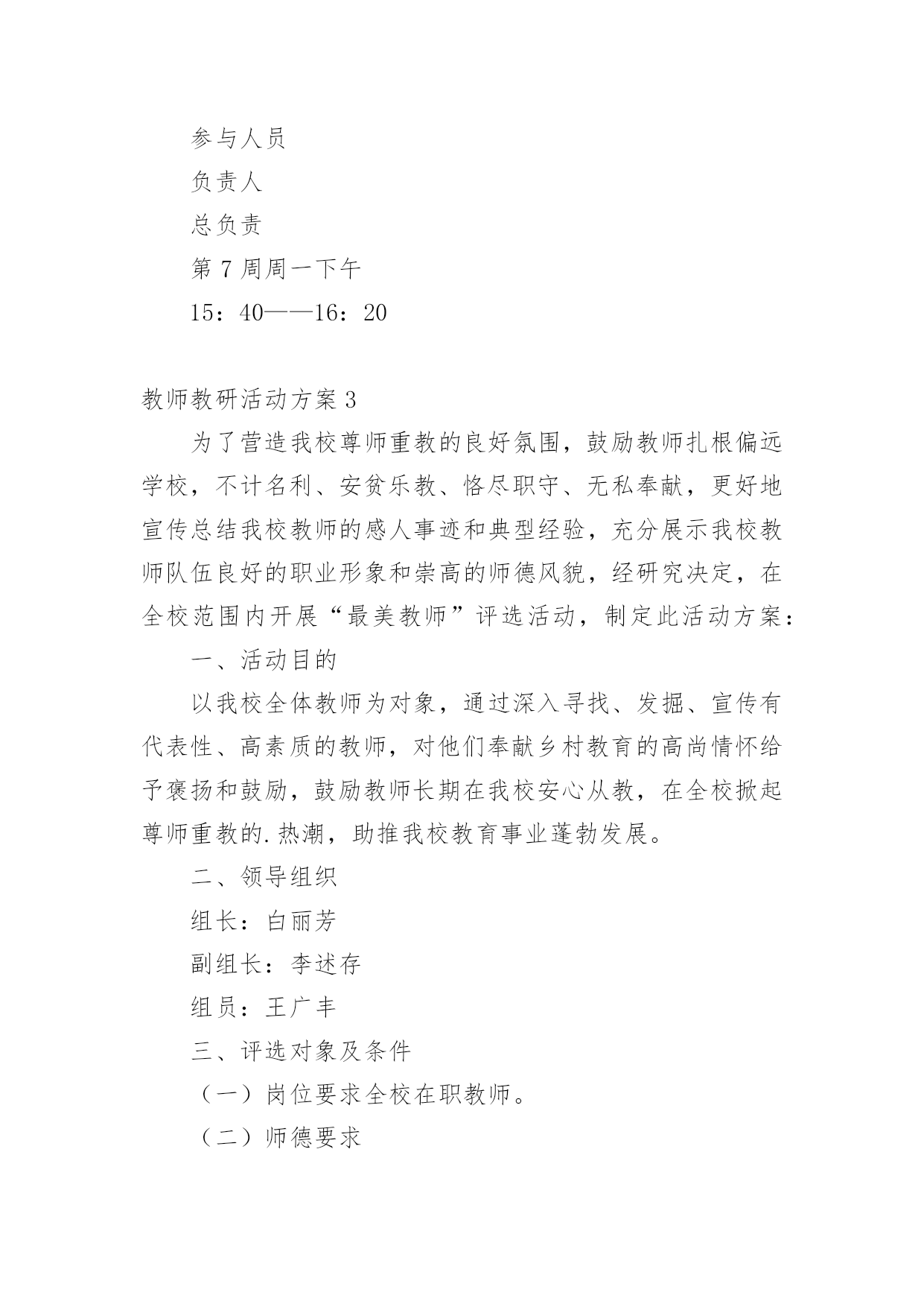教师教研活动方案教师教研活动方案13篇为确保事情或工作高质量高水平开展,常常需要提前制定一份优秀的方案,方案指的是为某一次行动所制定的计划类文书。那么什么样的方案才是好的呢?以下是小编整理的教师教研活动方案,欢迎阅读与收藏。教师教研活动方案1一、活动主题如何在体育教学中渗透美育课题:《抗旱救灾》。二、活动目标1、通过观摩本节课教学窗口,观察别人的课堂,反思自己的教学实践。2、如何在课堂上落实教学目标的探讨与达到体育游戏化教学的研究。3、通过研讨交流,促进教师专业发展,推动教师在教学行为中积极开展自我反思、同伴互助和专业引领。三、参加人员丹桂镇各辅导区小学体育教师(各片区中心校、村小派1名专职或兼职体育教师参加活动)。四、活动形式讲座+课堂展示+专题培训。五、活动过程及具体安排(一)酝酿阶段:丹桂小学体育组集体研讨1、专业引领提升理论。2、确定教学主讲人:王先彬老师。以“如何在体育教学中渗透美育”以这个为目标确定教学内容:《抗旱救灾。(二)实施阶段(现场教学与评课反思)1、活动时间:20xx年4月6日。上午9:00到活动地点报到,9:30——12:00专题讲座,健身操专题培训。12:00——12:20说课。13:20——14:00听课。14:20——15:00活动总结。2、活动地点:丹桂小学。3、活动流程:(1)在多媒体教室进行讲座。(2)在操场(或多媒体教室)进行健身操培训。(3)由王先彬老师说课、上演示课。六、活动设计简析活动对象主要是本镇任职体育课的教师,课改进行了多年以来,教学思路也在不断地变化当中,本次的教研活动严格按照课改的要求,做到活动前有准备。全员参与。活动中有目标,以学生为主,教师为辅,充分发挥学生的想象力,引导教学,专业指导,确保每一个学生都能够掌握授课的内容。课后有反思,每个人都能有自己的教学思想,有自己独特的'教学设计,并能针对上课教师的课堂环节都能表示肯定或指出不足,产生共鸣,是教育教学中共同进步的必须途径。七、注意事项1、听课体育教师每人写一份心得体会材料,在活动后交片区中心校存档,参会教师要作好相关记录作为继教登记的活动材料。活动结束后颁发继续教育活动登记证明。2、除因病及非常特殊事情外不得请假,活动考勤及应交材料纳入绩效考核。3、丹桂小学作好后勤保障的相关准备工作。教师教研活动方案2基于本学期以“课题引领式校本研训助教师成长”为主题的理念下,为了不断提高我校教师业务素质和教育教学能力,提升教育理念、教育能力、政策观念、课例研修的科研意识和水平,促进教师专业化发展,提升学校依法办学理念,最终达到提高学校办学质量。根据我校校本教研计划,确定本学期第14周为校本教研教学周,这次的教研主题是“课题引领教师成长”。一、时间:第7——14周二、地点:xx五小会议室及相关班级三、教学展示科目和相应负责教研组:语文(语文教研组)音乐心理(综合组)四、参与对象:全体老师五、具体操作流程:1、教研组开展主题式阅读:由课题负责人解读20xx年所立项的课题内涵,并围绕课题推荐相关主题的教育专著、学科资料、网络等,以自学为主要形式,开展主题式阅读。2、根据课题要求选定课题;3、组内人员分工,收集有关这节课的.不同时期的相关资料,包括案例、论文、教学设计、教学大纲、教材解读、视频等等。4、组内成员商讨、敲定教学设计,并围绕课例研究的主题制定课堂观察量表;5、开展组内研讨活动,包括说磨课过程、上课、评价、谈反思等环节,3人小组的其他成员分别做磨课过程汇报和围绕主题做这节课课堂观察后的课例观点汇报,其他组内成员做议课交流;6、展示汇报。7、开展课例研讨后“教学沙龙”,各教研组围绕课题负责人推荐的教育专著、学科资料、网络等方式,以“沙龙”的形式,开展主题交流,谈收获、反思,总结经验。六、(第14周)具体活动时间安排:时间活动形式活动内容地点参与人员负责人总负责第7周周一下午15:40——16:20教师教研活动方案3为了营造我校尊师重教的良好氛围,鼓励教师扎根偏远学校,不计名利、安贫乐教、恪尽职守、无私奉献,更好地宣传总结我校教师的感人事迹和典型经验,充分展示我校教师队伍良好的职业形象和崇高的师德风貌,经研究决定,在全校范围内开展“最美教师”评选活动,制定此活动方案:一、活动目的以我校全体教师为对象,通过深入寻找、发掘、宣传有代表性、高素质的教师,对他们奉献乡村教育的高尚情怀给予褒扬和鼓励,鼓励教师长期在我校安心从教,在全校掀起尊师重教的.热潮,助推我校教育事业蓬勃发展。二、领导组织组长:白丽芳副组长:李述存组员:王广丰三、评选对象及条件(一)岗位要求全校在职教师。(二)师德要求1、热爱农村教育事业,具有强烈的责任感和事业心;2.爱岗敬业,乐于奉献,师德高尚,事迹感人;3.以身作则,言传身教,爱生如子,爱校如家;4.热心帮助学困