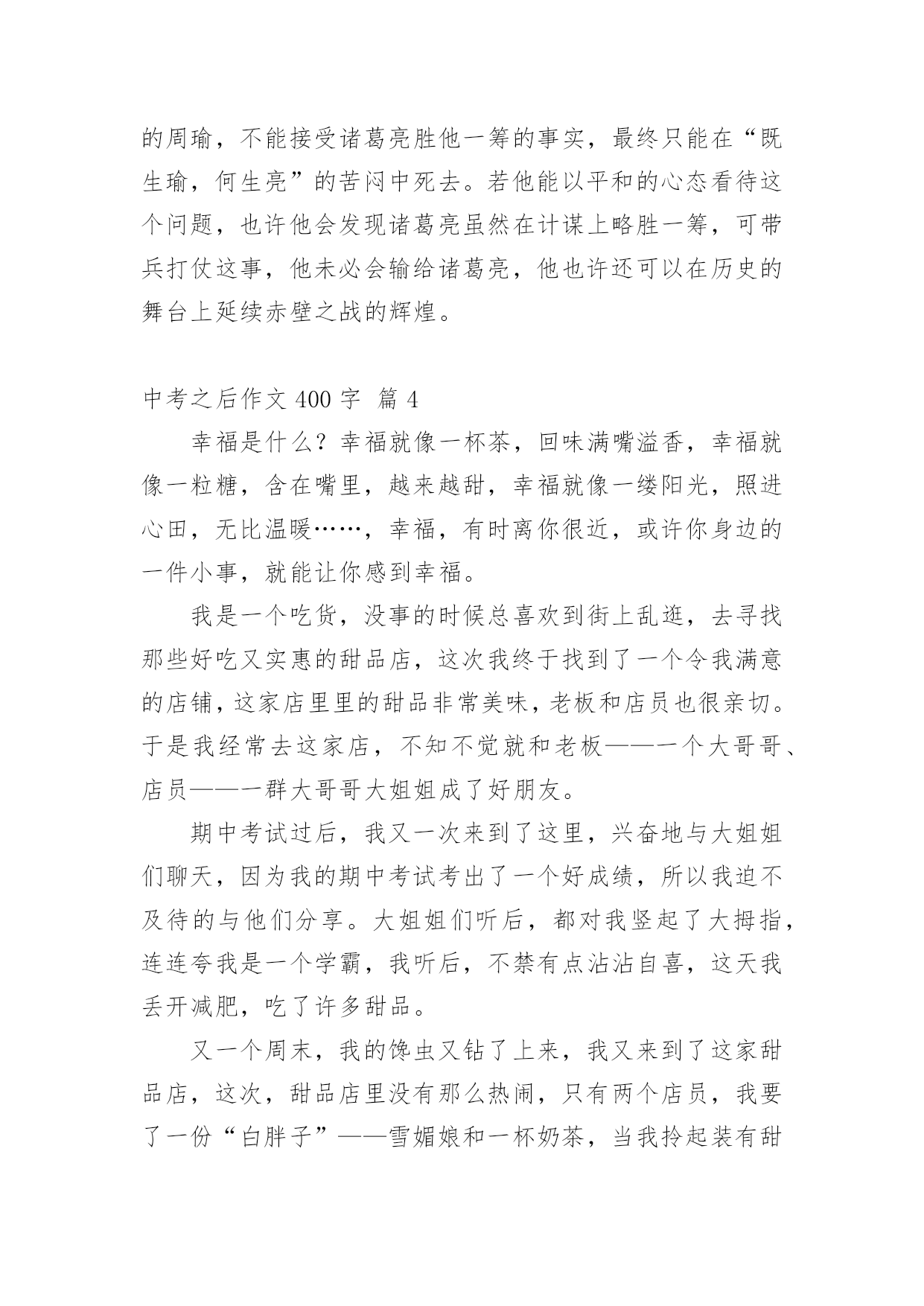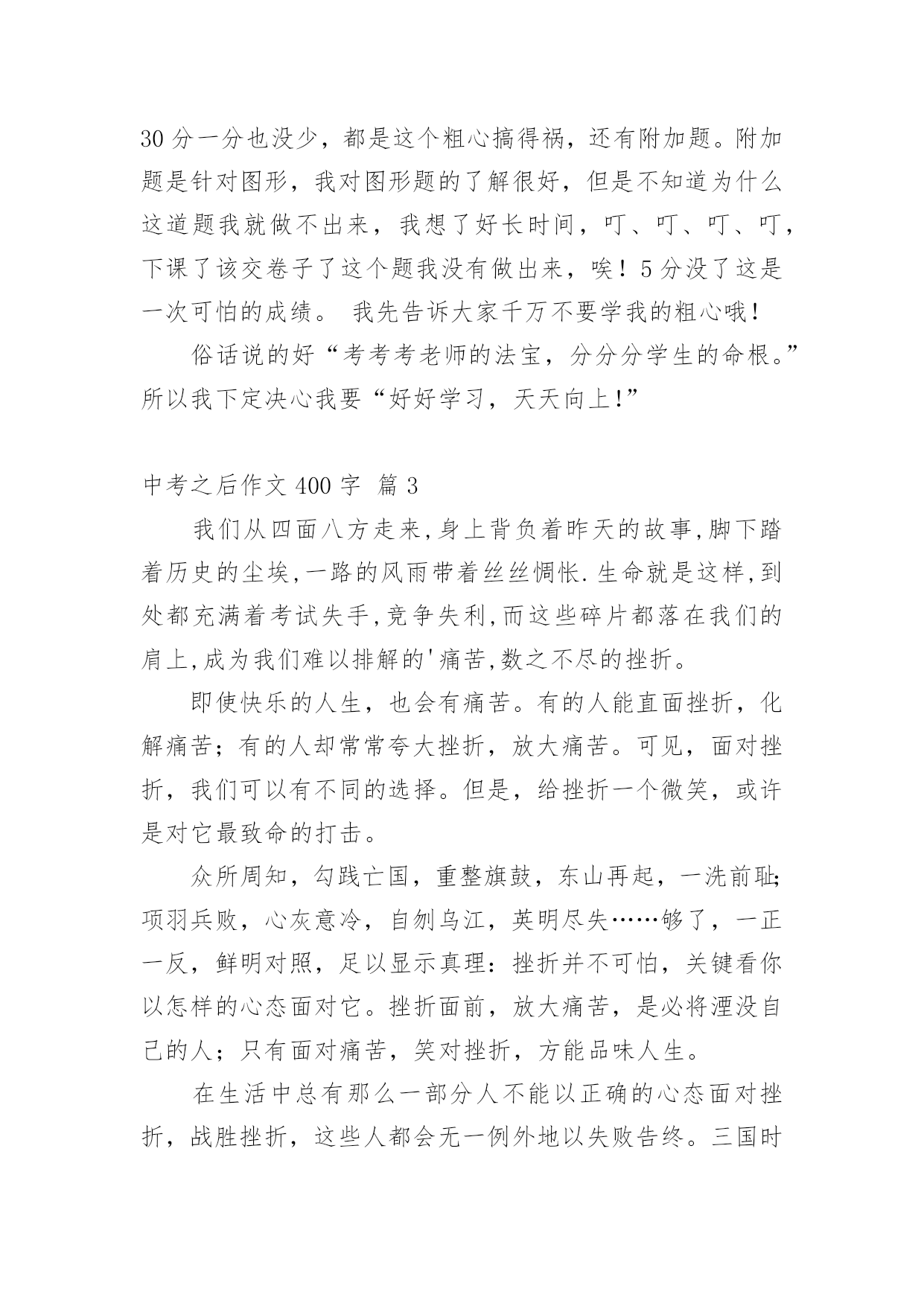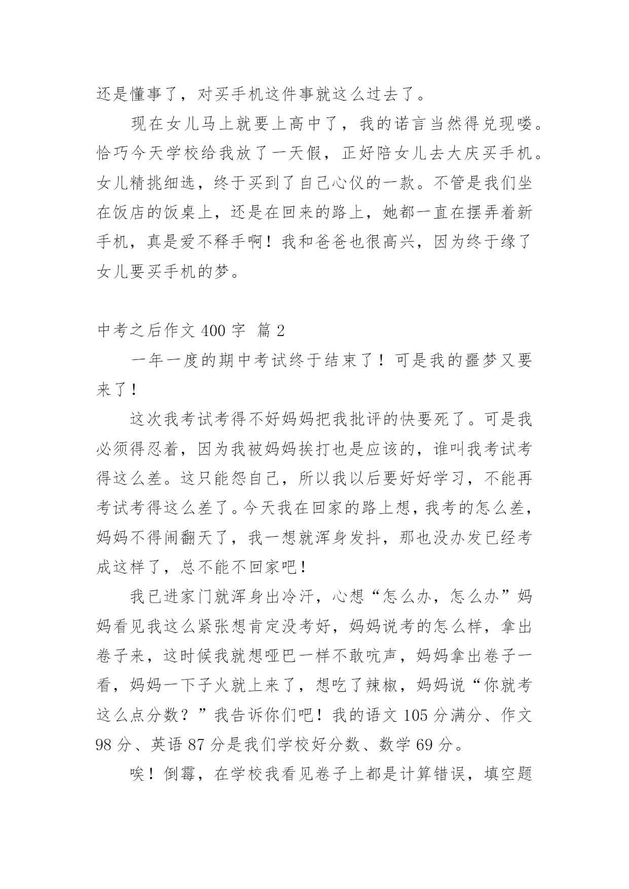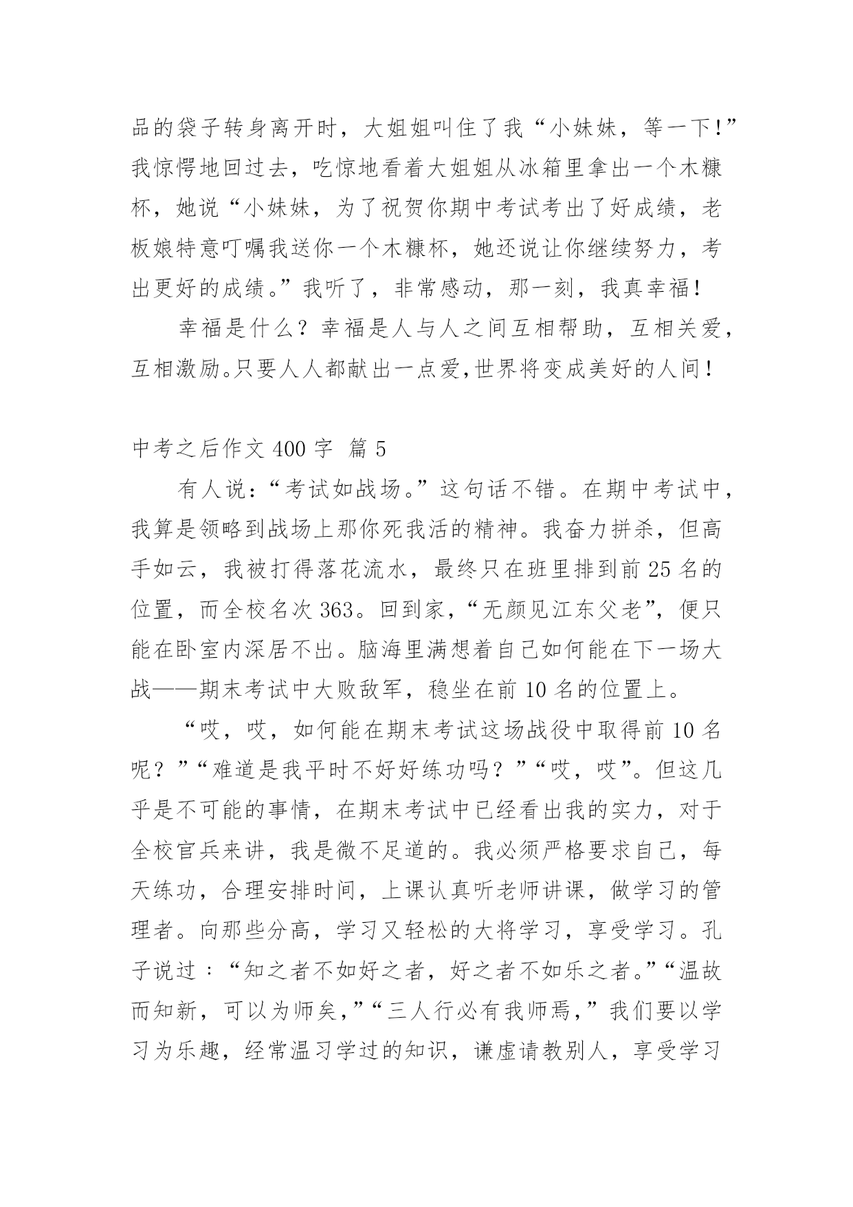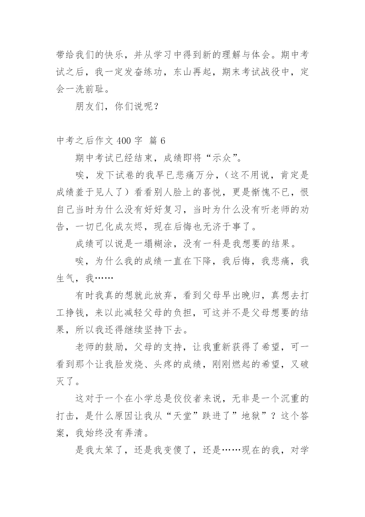 中考之后作文400字中考之后作文400字汇总6篇在学习、工作或生活中,许多人都写过作文吧,作文是由文字组成,经过人的思想考虑,通过语言组织来表达一个主题意义的文体。怎么写作文才能避免踩雷呢?以下是小编为大家收集的中考之后作文400字6篇,仅供参考,希望能够帮助到大家。中考之后作文400字篇1昨天下午送走了所有的孩子——我的又一届小学毕业生。心里既轻松又沉郁,当每一个孩子坐上各自回家的车向我挥手告别时,我强忍住满眼的泪水,心里酸酸的。下班了,快进入家门时,我努力地调整着自己的情绪。在女儿面前我是一个快乐的母亲,从不把不良情绪带给孩子。更何况女儿现在可是一只最快乐、最放松的小鸟儿,20xx中考《中考之后(三)》。果真,一进屋女儿便飞了过来,兴致勃勃,“妈,咱明天去大庆啊?!”我一下想起初二时,女儿想买手机的情景,爸爸欣然同意,但我觉得初二就带着个手机对她来说没有太大的益处,所以不想给她买,我轻轻地说:“等我和爸爸商量商量再说……”女儿反应很快,“我就知道,哼,就你‘坏’!”我心里憋不住乐,爱人太惯着她了,那怎么行!“老姑娘,等你上高中时,妈一定考虑。”“行,妈,那你说话可要算数奥!”我当时心里挺高兴,女儿大了,还是懂事了,对买手机这件事就这么过去了。现在女儿马上就要上高中了,我的诺言当然得兑现喽。恰巧今天学校给我放了一天假,正好陪女儿去大庆买手机。女儿精挑细选,终于买到了自己心仪的一款。不管是我们坐在饭店的饭桌上,还是在回来的路上,她都一直在摆弄着新手机,真是爱不释手啊!我和爸爸也很高兴,因为终于缘了女儿要买手机的梦。中考之后作文400字篇2一年一度的期中考试终于结束了!可是我的噩梦又要来了!这次我考试考得不好妈妈把我批评的快要死了。可是我必须得忍着,因为我被妈妈挨打也是应该的,谁叫我考试考得这么差。这只能怨自己,所以我以后要好好学习,不能再考试考得这么差了。今天我在回家的路上想,我考的怎么差,妈妈不得闹翻天了,我一想就浑身发抖,那也没办发已经考成这样了,总不能不回家吧!我已进家门就浑身出冷汗,心想“怎么办,怎么办”妈妈看见我这么紧张想肯定没考好,妈妈说考的怎么样,拿出卷子来,这时候我就想哑巴一样不敢吭声,妈妈拿出卷子一看,妈妈一下子火就上来了,想吃了辣椒,妈妈说“你就考这么点分数?”我告诉你们吧!我的语文105分满分、作文98分、英语87分是我们学校好分数、数学69分。唉!倒霉,在学校我看见卷子上都是计算错误,填空题30分一分也没少,都是这个粗心搞得祸,还有附加题。附加题是针对图形,我对图形题的了解很好,但是不知道为什么这道题我就做不出来,我想了好长时间,叮、叮、叮、叮,下课了该交卷子了这个题我没有做出来,唉!5分没了这是一次可怕的成绩。我先告诉大家千万不要学我的粗心哦!俗话说的好“考考考老师的法宝,分分分学生的命根。”所以我下定决心我要“好好学习,天天向上!”中考之后作文400字篇3我们从四面八方走来,身上背负着昨天的故事,脚下踏着历史的尘埃,一路的风雨带着丝丝惆怅.生命就是这样,到处都充满着考试失手,竞争失利,而这些碎片都落在我们的肩上,成为我们难以排解的'痛苦,数之不尽的挫折。即使快乐的人生,也会有痛苦。有的人能直面挫折,化解痛苦;有的人却常常夸大挫折,放大痛苦。可见,面对挫折,我们可以有不同的选择。但是,给挫折一个微笑,或许是对它最致命的打击。众所周知,勾践亡国,重整旗鼓,东山再起,一洗前耻;项羽兵败,心灰意冷,自刎乌江,英明尽失……够了,一正一反,鲜明对照,足以显示真理:挫折并不可怕,关键看你以怎样的心态面对它。挫折面前,放大痛苦,是必将湮没自己的人;只有面对痛苦,笑对挫折,方能品味人生。在生活中总有那么一部分人不能以正确的心态面对挫折,战胜挫折,这些人都会无一例外地以失败告终。三国时的周瑜,不能接受诸葛亮胜他一筹的事实,最终只能在“既生瑜,何生亮”的苦闷中死去。若他能以平和的心态看待这个问题,也许他会发现诸葛亮虽然在计谋上略胜一筹,可带兵打仗这事,他未必会输给诸葛亮,他也许还可以在历史的舞台上延续赤壁之战的辉煌。中考之后作文400字篇4幸福是什么?幸福就像一杯茶,回味满嘴溢香,幸福就像一粒糖,含在嘴里,越来越甜,幸福就像一缕阳光,照进心田,无比温暖……,幸福,有时离你很近,或许你身边的一件小事,就能让你感到幸福。我是一个吃货,没事的时候总喜欢到街上乱逛,去寻找那些好吃又实惠的甜品店,这次我终于找到了一个令我满意的店铺,这家店里里的甜品非常美味,老板和店员也很亲切。于是我经常去这家店,不知不觉就和老板——一个大哥哥、店员——一群大哥哥大姐姐成了好朋友。期中考试过后,我又一次来到了这里,兴奋地与大姐姐们聊天,因为我的期中考试考出了一个好成绩,所以我迫不及待的与他们分享。大姐姐们听后,都对我竖起了大拇指,连连夸我是一个