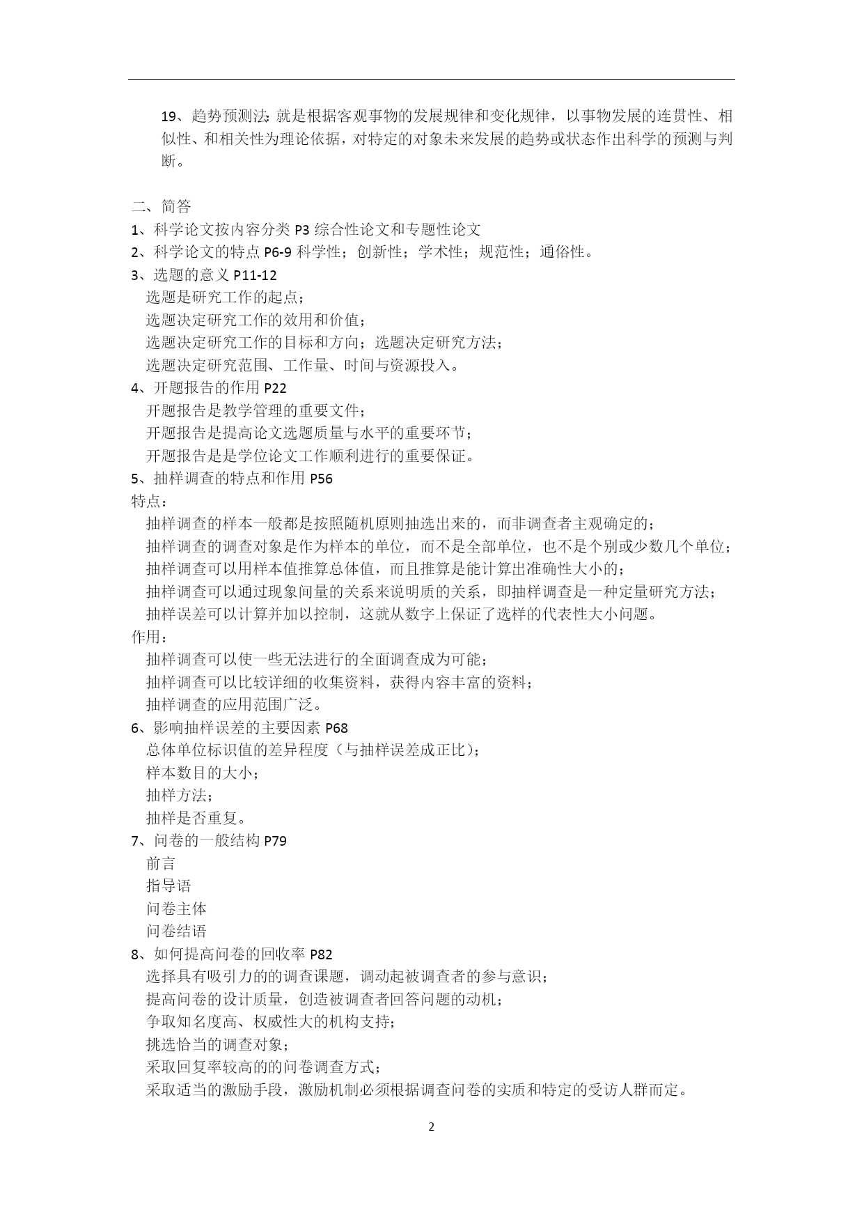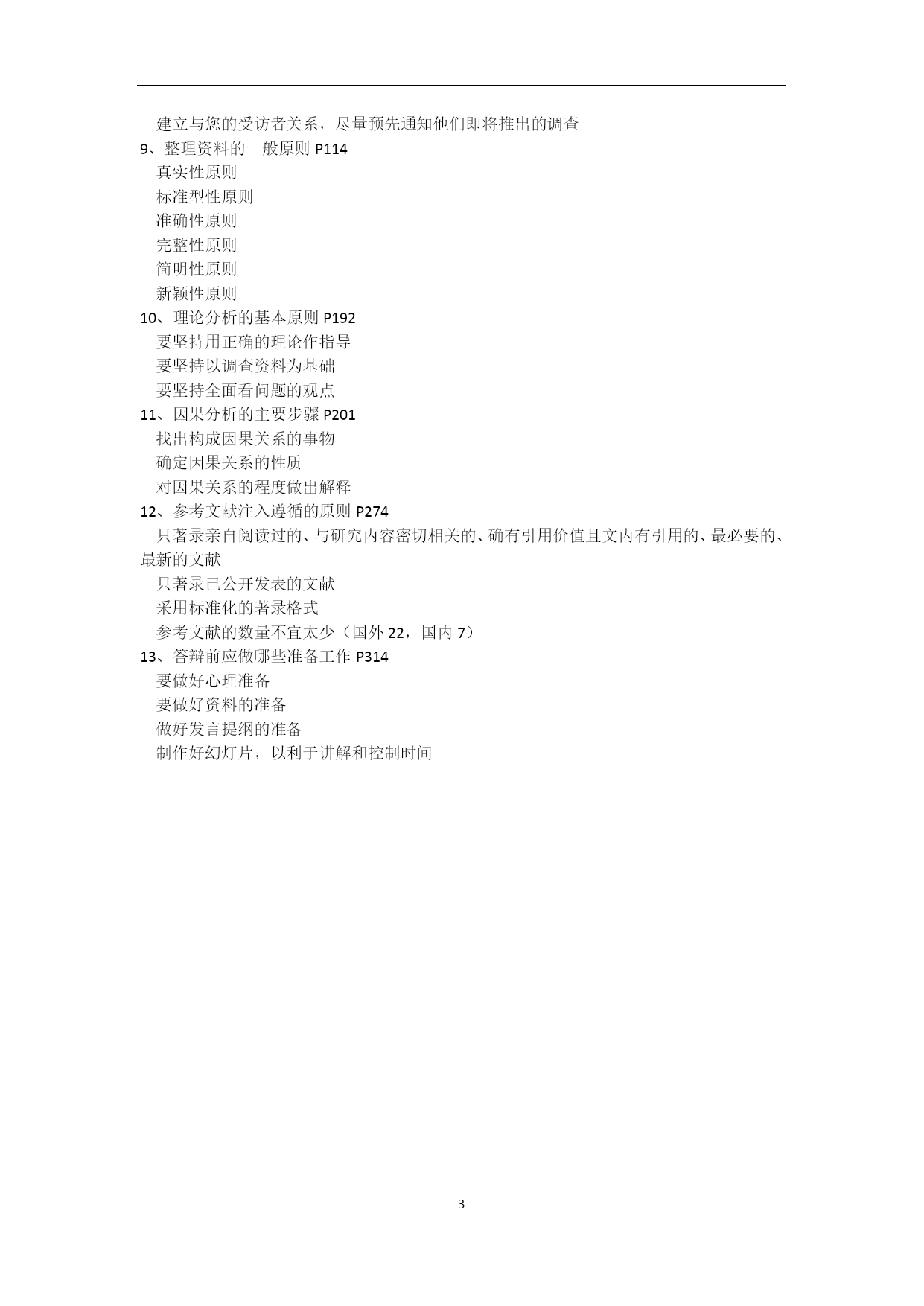 PAGE\*MERGEFORMAT3名词解释社科论文:是以人类社会为研究对象,采用科学通俗的语言、科学逻辑思维方式,并按照一定的写作格式撰写的论文。学位论文:指学位申请者(大学生、硕士生、博士生或相关人员)为申请某一学位而撰写和提交的论文。依学位高低分为学士、说是、博士三级。学士论文:指大学本科毕业生申请学士学位要提交的论文,其目的在于检查学生在大学学习期间对基础知识和专业知识掌握的程度以及对应用这些知识解决实际问题的能力进行全面考核,大学毕业时由学校授予最初一级的学位。开题报告:是指在论文选题确定之后,学生就该选题为什么要研究、研究什么、怎样研究以及目前开展研究具备的条件等做进一步说明的一种文字材料。历史文献:指的是对过去发生的、年代比较久远的时间的记载,通常当事人已经不在人世。这些资料可以为我么提供一个了解过去的窗口,比较适合历史研究。标准化访谈:又称结构性访谈、正式访谈、导向式访谈或控制式访谈,是一种对访谈对象和访谈过程高度控制的访谈,即访谈对象按照统一的标准和方法选取,访谈过程中访谈者按照统一设计的问卷或访谈表进行访谈,不能随意对问题进行解释。问卷:是指按照一定的理论假设设计出来的,由一系列问题和备选答案及说明组成的一种收集资料的工具。问卷调查法:是调查者运用统一设计的问卷,利用书面问答的方式,向被调查者了解情况并收集信息的方法,包括问卷的设计和问卷调查的实施两大部分组成。一次文献:也称原始文献,是以作者本人的生产和调查研究工作成为依据而创作的文献。10、分组:是指根据调查目的的要求,按照一定的标准,把调查的数字资料划分为若干性质的组。11、资料汇总:是指根据研究的目的,把分组后的各种数据(标志值)汇集到有关表格中,并进行计算和加总,以集中、系统地反映调查对象总体的数量情况。12、相对指标:是两个相互联系的统计指标的对比,用来反映现象之间的数量联系程度和数量上的对比关系。一般用相对数来表示,故又称相对数。两种表现形式:无/有名数。13、理论分析:是指在对调查资料进行整理、分类和统计分析的基础上,借助抽象思维对资料进行加工制作,揭示事物的本质和内在联系,由此上升到理性认识。14、历史分析法:就是根据马克思主义观点,通过对有关研究对象、对历史资料进行科学的分析,说明它在历史上怎样发生的,又是怎样发展到现在状况的。换言之,就是分析事物历史和现状的关系,包括历史和现状的一致方面以及由于环境、社会条件的变化而造成的不一致方面。15、归纳法:是通过对许多特殊或个别现象及问题的分析比较,得出一般结论或带有普遍性原理的方法。根据对象不同。可分为完全/不完全归纳法。16、演绎法:是从一般性前提推出个别性结论的方法。17、SWOT分析法:是通过具体的情景分析,把与研究项目密切关联的各种主要内部优势因素、劣势因素和外部机会因素、威胁因素分别识别和评估出来,依据矩阵的形式进行科学的排列组合,然后运用系统分析的研究方法将各个主要因素相互匹配进行分析,最后提出相应对策的方法。18、案例研究方法:又称个案研究法,是一种常用的定性研究方法。该方法适合于对现实中某一复杂和具体的问题进行深入和全面的考察,帮助了解事实真相,并发现事物之间的内在联系。通过案例研究,人们可以对某些现象、事物进行描述和探索。19、趋势预测法:就是根据客观事物的发展规律和变化规律,以事物发展的连贯性、相似性、和相关性为理论依据,对特定的对象未来发展的趋势或状态作出科学的预测与判断。简答1、科学论文按内容分类P3综合性论文和专题性论文2、科学论文的特点P6-9科学性;创新性;学术性;规范性;通俗性。3、选题的意义P11-12选题是研究工作的起点;选题决定研究工作的效用和价值;选题决定研究工作的目标和方向;选题决定研究方法;选题决定研究范围、工作量、时间与资源投入。4、开题报告的作用P22开题报告是教学管理的重要文件;开题报告是提高论文选题质量与水平的重要环节;开题报告是是学位论文工作顺利进行的重要保证。5、抽样调查的特点和作用P56特点:抽样调查的样本一般都是按照随机原则抽选出来的,而非调查者主观确定的;抽样调查的调查对象是作为样本的单位,而不是全部单位,也不是个别或少数几个单位;抽样调查可以用样本值推算总体值,而且推算是能计算出准确性大小的;抽样调查可以通过现象间量的关系来说明质的关系,即抽样调查是一种定量研究方法;抽样误差可以计算并加以控制,这就从数字上保证了选样的代表性大小问题。作用:抽样调查可以使一些无法进行的全面调查成为可能;抽样调查可以比较详细的收集资料,获得内容丰富的资料;抽样调查的应用范围广泛。6、影响抽样误差的主要因素P68总体单位标识值的差异程度(与抽样误差成正