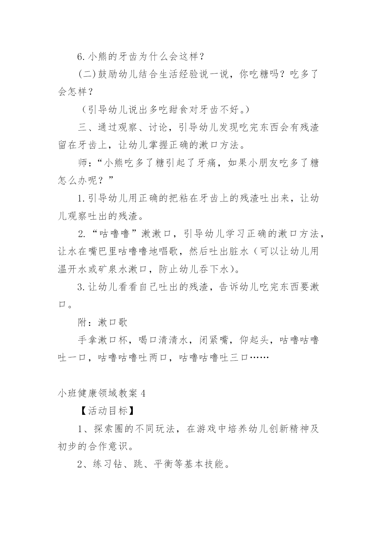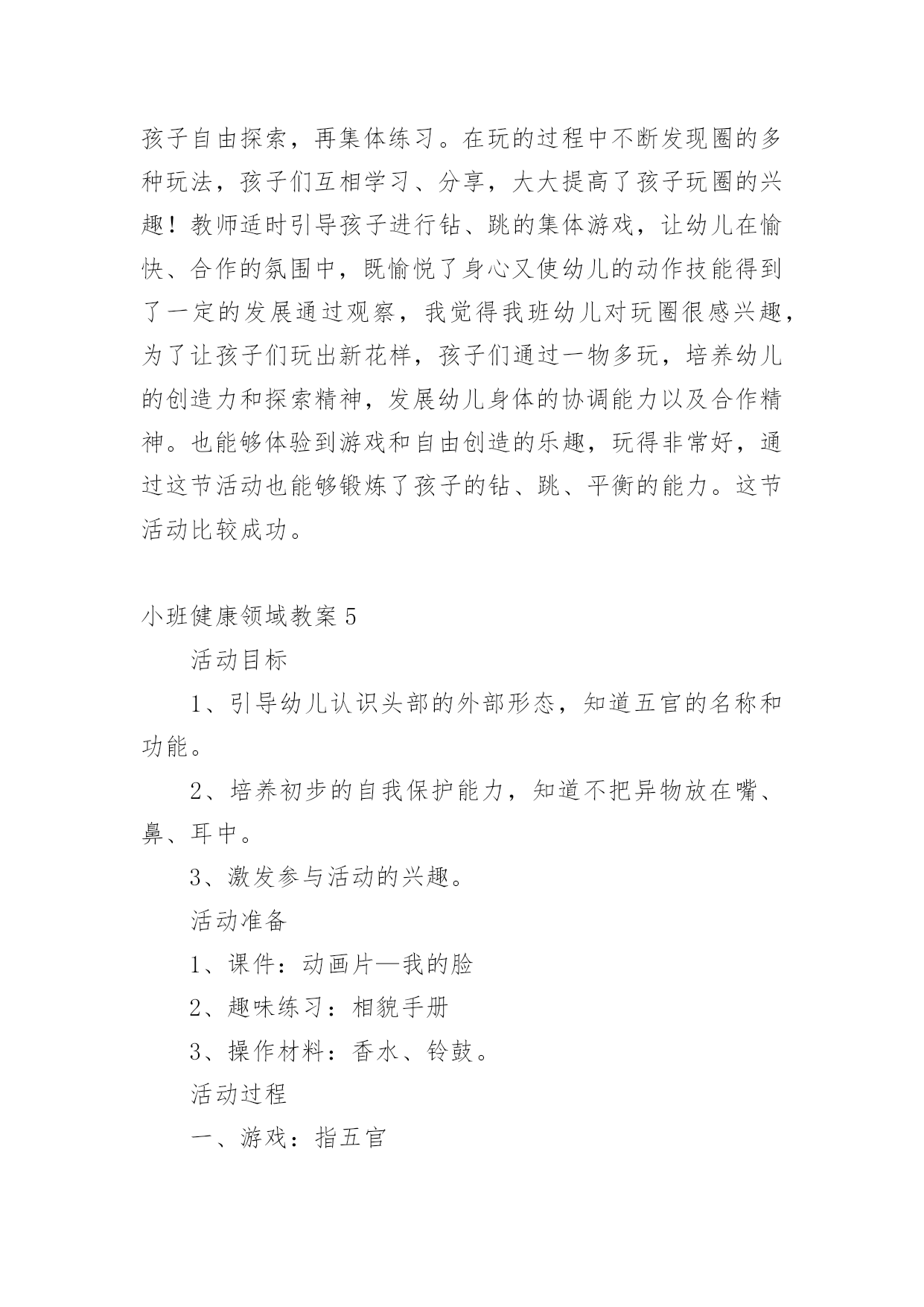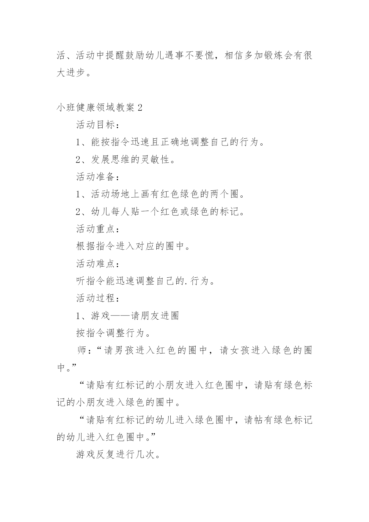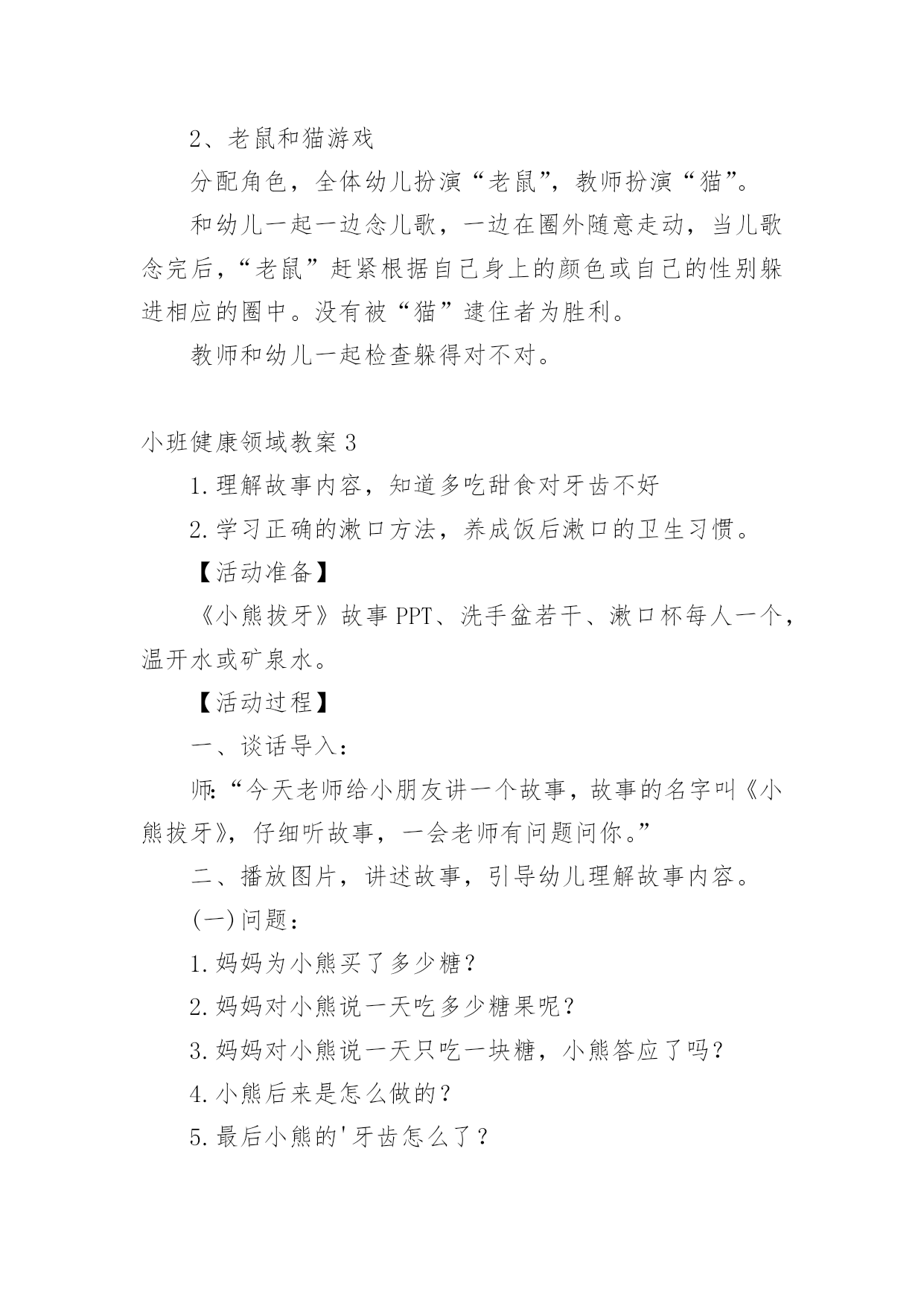 小班健康领域教案小班健康领域教案15篇作为一名教师,往往需要进行教案编写工作,借助教案可以有效提升自己的教学能力。怎样写教案才更能起到其作用呢?下面是小编整理的小班健康领域教案,欢迎阅读与收藏。小班健康领域教案1活动目标:1、发展四散追逐跑能力。2、满足娱乐、模仿、认识、创新、表现、审美、交往和竞赛需要,发展上述诸方面的兴趣、情感与能力。3、丰富对小鸡的知识,增强爱鸡感情。玩法:幼儿边说儿歌“鸡妈妈真能干,会捉虫,能下蛋,孵养小鸡带着玩。老鹰来了她不怕,保护鸡仔真勇敢。失散的小鸡都找回,咕嗒咕嗒叫得欢”。然后围蹲成圆形,“鸡妈妈”(教师当)绕鸡蛋边走边问:“小鸡小鸡多大啦?”小鸡回答:“长出脑袋和嘴巴。”鸡妈妈连续问,小鸡依次回答,“翅膀出来子!”“爪子会动了!”最后鸡妈妈说:“小鸡快出来撒欢找小虫吃吧!”幼儿随音乐模仿小鸡走、跑、跳、站、啼叫、刨食、戏斗。音乐曲调忽变,鸡妈妈惊呼:“老鹰来了!”鸡妈妈和小鸡奔跑躲闪。老鹰把抓到的小鸡藏到场地附近,自己飞走了。鸡妈妈和小鸡查看小鸡的丢失数,然后带着小鸡寻找丢失的伙伴。最后围拥着被找到的小鸡回“窝”。指导建议:1、发展四散躲跑能力是此游戏的主要目的。可从以下几方面来发展此能力:(1)采用有情节的曲线跑、往返跑、∞字交叉跑活动,发展变向跑、变速跑和躲闪能力。(2)帮助幼儿掌握躲闪策略:如鹰来就跑、鹰走休歇,以逸待劳;突然起动,突然变向跑以甩开对手;跑向人群、分散目标;利用障碍与鹰周旋等。2、根据游戏情节设计的“孵鸡”、“撒欢”和“找鸡”等非主体活动能满足幼儿模仿、表现、审美、交往、创新等需要,促进他们多种素质发展。要充分利用并不断丰富和变化这些环境因素以促进幼儿发展。3、寻找丢失小鸡的活动不仅能使身体平静下来,而且能培养幼儿的友谊感和师童感。教师应敏锐地观察幼儿的情感表现,及时予以引导。4、教师应增强情感教育意识,要有目的、有计划地培育幼儿爱鸡之情,爱友之情,创新之情,审美之情。5、可从以下几方面去引导幼儿发挥和发展自己的创新才能:(1)不断构思新的模仿小鸡的动作。(2)在躲闪活动中主动观察场上情况,灵活地使用各种躲闪动作和策略,或创造新的动作和策略。(3)不断变化追逐躲闪活动的玩法,为发挥幼儿创造潜能创造新的环境。揪尾巴游戏:2人1组,每人领后塞一布条当尾巴。2人想方设法把对方领后的布条揪下。先揪下的胜。不准抓住对方揪。“勇敢的小鸡”是由“孵小鸡”游戏的简化。它去掉孵鸡活动,保留了“撒欢”、“躲闪老鹰”和“寻找伙伴”活动。活动反思:在活动中,认真组织和指导幼儿锻炼身体的同时,有目的'、有计划、有步骤的引导幼儿去获取知识,发展观察力、记忆力、想象力和模仿力,丰富和发展自己的健康情感,收到了较好的教育效果,本地活动以孵小鸡为主题,吧体育、语言、常识等多种教育活动有机结合,自然贴切,收到了相互为用,相互加强的整体效益。幼儿的身体负荷恰到好处。高潮间过度平缓,注意了急缓结合、动静交替。游戏中所提出的任务难度适当,幼儿注意力和意志负荷不大,符合三岁后期儿童年龄特点、负荷能力以及教育目标,健身效果好。情感教育收到预收效果。教师通过组织、观察、模仿、表现活动和讲故事,激发了幼儿对小鸡的喜爱,并引导这一积极情感成为游戏活动的精神动力。游戏中涉及的寻找丢失“小鸡”的情节和相互鼓励收到了增进友谊的效果。不足之处是“躲老鹰”环节,有个别幼儿一听到“老鹰”来了就慌忙乱跑,总是忘记看“老鹰”在哪,也就是不会躲,在今后的生活、活动中提醒鼓励幼儿遇事不要慌,相信多加锻炼会有很大进步。小班健康领域教案2活动目标:1、能按指令迅速且正确地调整自己的行为。2、发展思维的灵敏性。活动准备:1、活动场地上画有红色绿色的两个圈。2、幼儿每人贴一个红色或绿色的标记。活动重点:根据指令进入对应的圈中。活动难点:听指令能迅速调整自己的.行为。活动过程:1、游戏——请朋友进圈按指令调整行为。师:“请男孩进入红色的圈中,请女孩进入绿色的圈中。”“请贴有红标记的小朋友进入红色圈中,请贴有绿色标记的小朋友进入绿色的圈中。“请贴有红标记的幼儿进入绿色圈中,请帖有绿色标记的幼儿进入红色圈中。”游戏反复进行几次。2、老鼠和猫游戏分配角色,全体幼儿扮演“老鼠”,教师扮演“猫”。和幼儿一起一边念儿歌,一边在圈外随意走动,当儿歌念完后,“老鼠”赶紧根据自己身上的颜色或自己的性别躲进相应的圈中。没有被“猫”逮住者为胜利。教师和幼儿一起检查躲得对不对。小班健康领域教案31.理解故事内容,知道多吃甜食对牙齿不好2.学习正确的漱口方法,养成饭后漱口的卫生习惯。【活动准备】《小熊拔牙》故事PPT、洗手盆若干、漱口杯每人一个,温开水或矿泉水。【活动过程】一、谈话导入:师:“今天老师给小朋友讲一个故事,故事的名字叫《小熊拔牙》,仔细听故事,一会老师有问题问