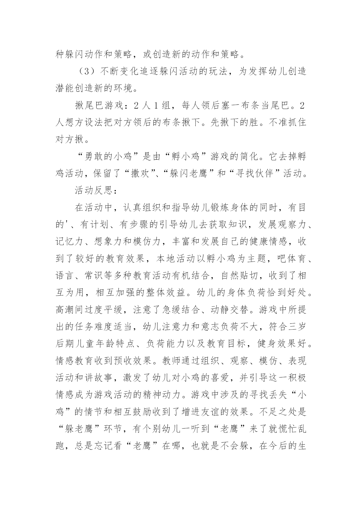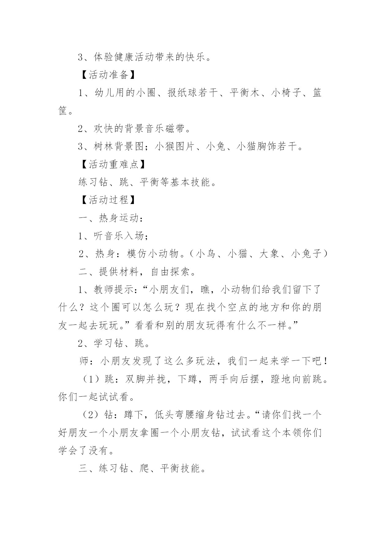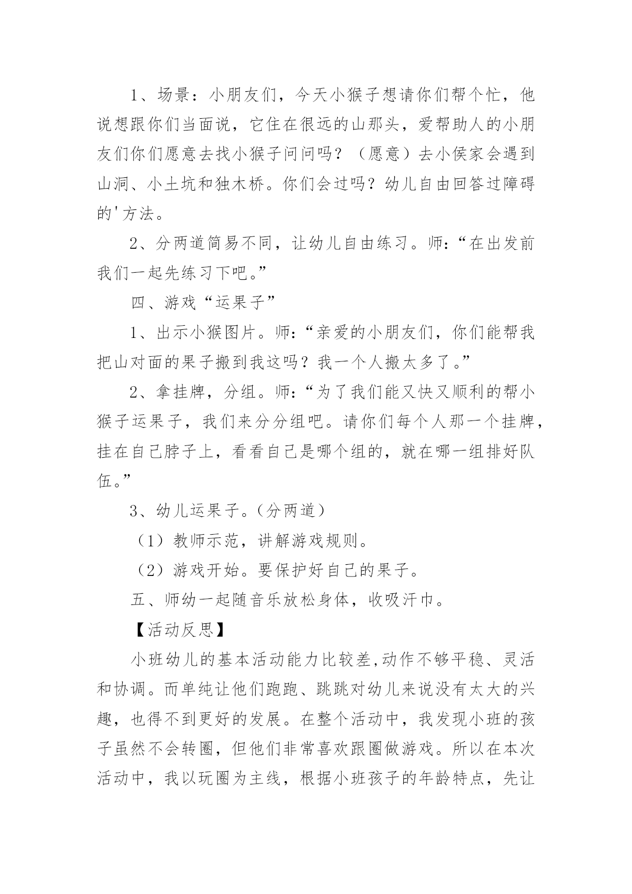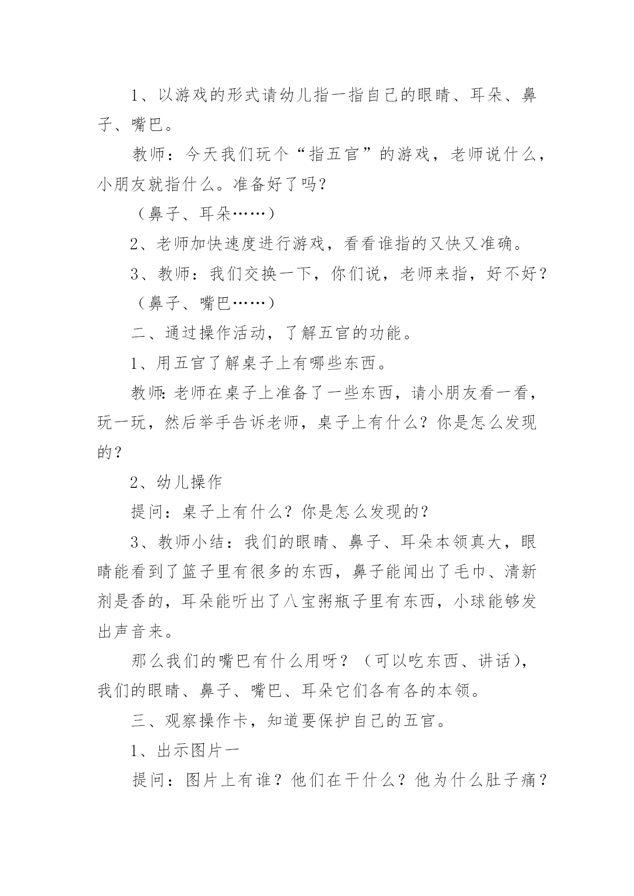 小班健康领域教案小班健康领域教案15篇作为一名教师,往往需要进行教案编写工作,借助教案可以有效提升自己的教学能力。怎样写教案才更能起到其作用呢?下面是小编整理的小班健康领域教案,欢迎阅读与收藏。小班健康领域教案1活动目标:1、发展四散追逐跑能力。2、满足娱乐、模仿、认识、创新、表现、审美、交往和竞赛需要,发展上述诸方面的兴趣、情感与能力。3、丰富对小鸡的知识,增强爱鸡感情。玩法:幼儿边说儿歌“鸡妈妈真能干,会捉虫,能下蛋,孵养小鸡带着玩。老鹰来了她不怕,保护鸡仔真勇敢。失散的小鸡都找回,咕嗒咕嗒叫得欢”。然后围蹲成圆形,“鸡妈妈”(教师当)绕鸡蛋边走边问:“小鸡小鸡多大啦?”小鸡回答:“长出脑袋和嘴巴。”鸡妈妈连续问,小鸡依次回答,“翅膀出来子!”“爪子会动了!”最后鸡妈妈说:“小鸡快出来撒欢找小虫吃吧!”幼儿随音乐模仿小鸡走、跑、跳、站、啼叫、刨食、戏斗。音乐曲调忽变,鸡妈妈惊呼:“老鹰来了!”鸡妈妈和小鸡奔跑躲闪。老鹰把抓到的小鸡藏到场地附近,自己飞走了。鸡妈妈和小鸡查看小鸡的丢失数,然后带着小鸡寻找丢失的伙伴。最后围拥着被找到的小鸡回“窝”。指导建议:1、发展四散躲跑能力是此游戏的主要目的。可从以下几方面来发展此能力:(1)采用有情节的曲线跑、往返跑、∞字交叉跑活动,发展变向跑、变速跑和躲闪能力。(2)帮助幼儿掌握躲闪策略:如鹰来就跑、鹰走休歇,以逸待劳;突然起动,突然变向跑以甩开对手;跑向人群、分散目标;利用障碍与鹰周旋等。2、根据游戏情节设计的“孵鸡”、“撒欢”和“找鸡”等非主体活动能满足幼儿模仿、表现、审美、交往、创新等需要,促进他们多种素质发展。要充分利用并不断丰富和变化这些环境因素以促进幼儿发展。3、寻找丢失小鸡的活动不仅能使身体平静下来,而且能培养幼儿的友谊感和师童感。教师应敏锐地观察幼儿的情感表现,及时予以引导。4、教师应增强情感教育意识,要有目的、有计划地培育幼儿爱鸡之情,爱友之情,创新之情,审美之情。5、可从以下几方面去引导幼儿发挥和发展自己的创新才能:(1)不断构思新的模仿小鸡的动作。(2)在躲闪活动中主动观察场上情况,灵活地使用各种躲闪动作和策略,或创造新的动作和策略。(3)不断变化追逐躲闪活动的玩法,为发挥幼儿创造潜能创造新的环境。揪尾巴游戏:2人1组,每人领后塞一布条当尾巴。2人想方设法把对方领后的布条揪下。先揪下的胜。不准抓住对方揪。“勇敢的小鸡”是由“孵小鸡”游戏的简化。它去掉孵鸡活动,保留了“撒欢”、“躲闪老鹰”和“寻找伙伴”活动。活动反思:在活动中,认真组织和指导幼儿锻炼身体的同时,有目的'、有计划、有步骤的引导幼儿去获取知识,发展观察力、记忆力、想象力和模仿力,丰富和发展自己的健康情感,收到了较好的教育效果,本地活动以孵小鸡为主题,吧体育、语言、常识等多种教育活动有机结合,自然贴切,收到了相互为用,相互加强的整体效益。幼儿的身体负荷恰到好处。高潮间过度平缓,注意了急缓结合、动静交替。游戏中所提出的任务难度适当,幼儿注意力和意志负荷不大,符合三岁后期儿童年龄特点、负荷能力以及教育目标,健身效果好。情感教育收到预收效果。教师通过组织、观察、模仿、表现活动和讲故事,激发了幼儿对小鸡的喜爱,并引导这一积极情感成为游戏活动的精神动力。游戏中涉及的寻找丢失“小鸡”的情节和相互鼓励收到了增进友谊的效果。不足之处是“躲老鹰”环节,有个别幼儿一听到“老鹰”来了就慌忙乱跑,总是忘记看“老鹰”在哪,也就是不会躲,在今后的生活、活动中提醒鼓励幼儿遇事不要慌,相信多加锻炼会有很大进步。小班健康领域教案2活动目标:1、能按指令迅速且正确地调整自己的行为。2、发展思维的灵敏性。活动准备:1、活动场地上画有红色绿色的两个圈。2、幼儿每人贴一个红色或绿色的标记。活动重点:根据指令进入对应的圈中。活动难点:听指令能迅速调整自己的.行为。活动过程:1、游戏——请朋友进圈按指令调整行为。师:“请男孩进入红色的圈中,请女孩进入绿色的圈中。”“请贴有红标记的小朋友进入红色圈中,请贴有绿色标记的小朋友进入绿色的圈中。“请贴有红标记的幼儿进入绿色圈中,请帖有绿色标记的幼儿进入红色圈中。”游戏反复进行几次。2、老鼠和猫游戏分配角色,全体幼儿扮演“老鼠”,教师扮演“猫”。和幼儿一起一边念儿歌,一边在圈外随意走动,当儿歌念完后,“老鼠”赶紧根据自己身上的颜色或自己的性别躲进相应的圈中。没有被“猫”逮住者为胜利。教师和幼儿一起检查躲得对不对。小班健康领域教案31.理解故事内容,知道多吃甜食对牙齿不好2.学习正确的漱口方法,养成饭后漱口的卫生习惯。【活动准备】《小熊拔牙》故事PPT、洗手盆若干、漱口杯每人一个,温开水或矿泉水。【活动过程】一、谈话导入:师:“今天老师给小朋友讲一个故事,故事的名字叫《小熊拔牙》,仔细听故事,一会老师有问题问