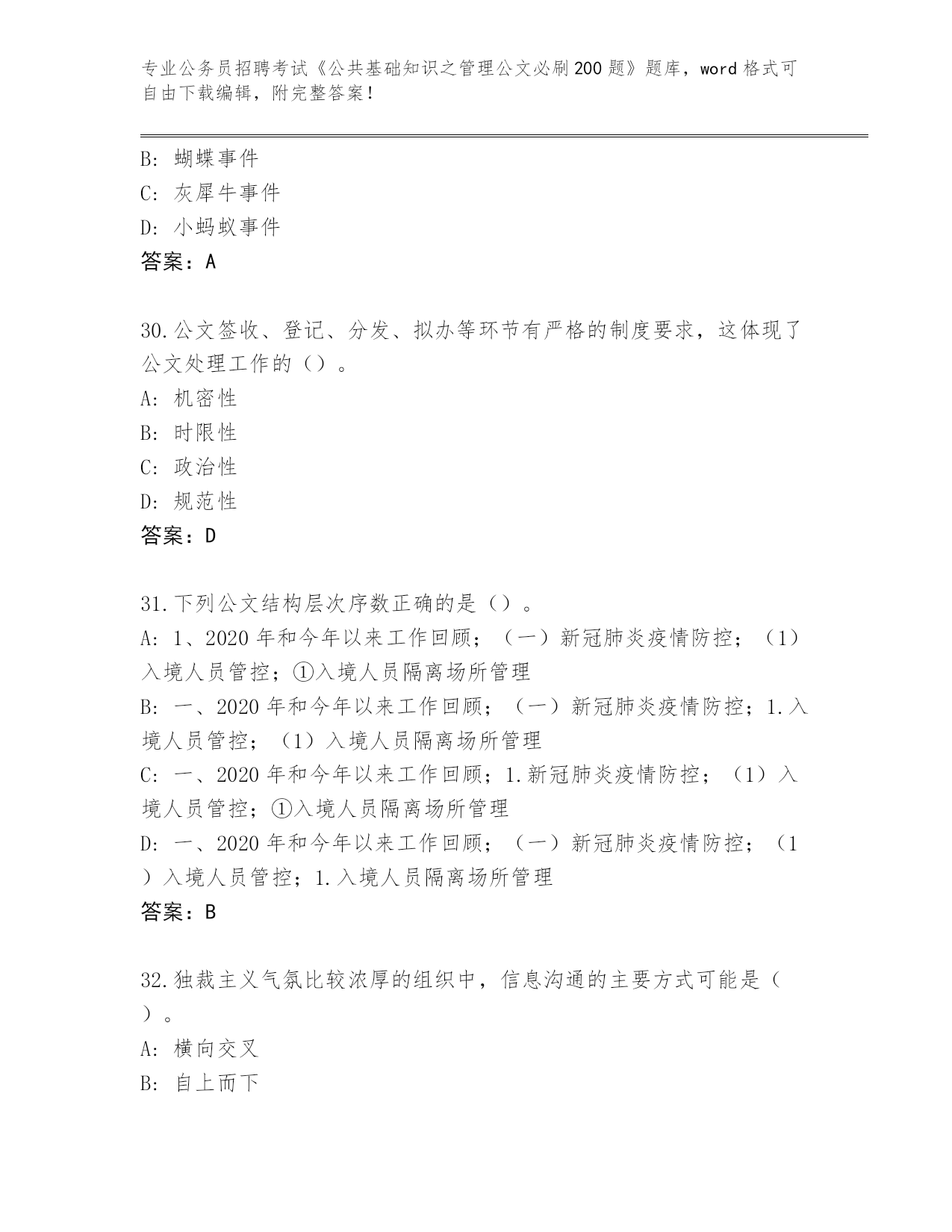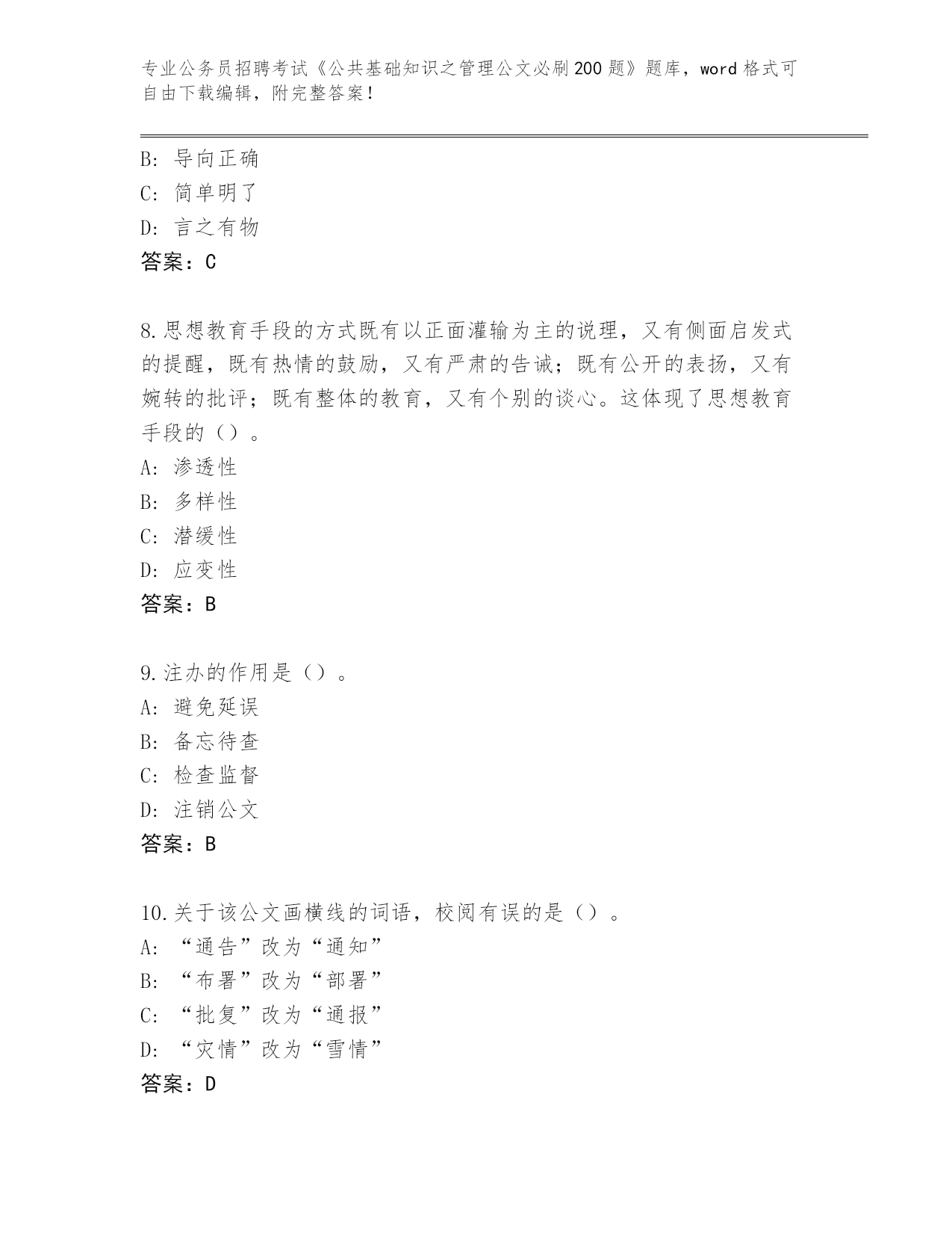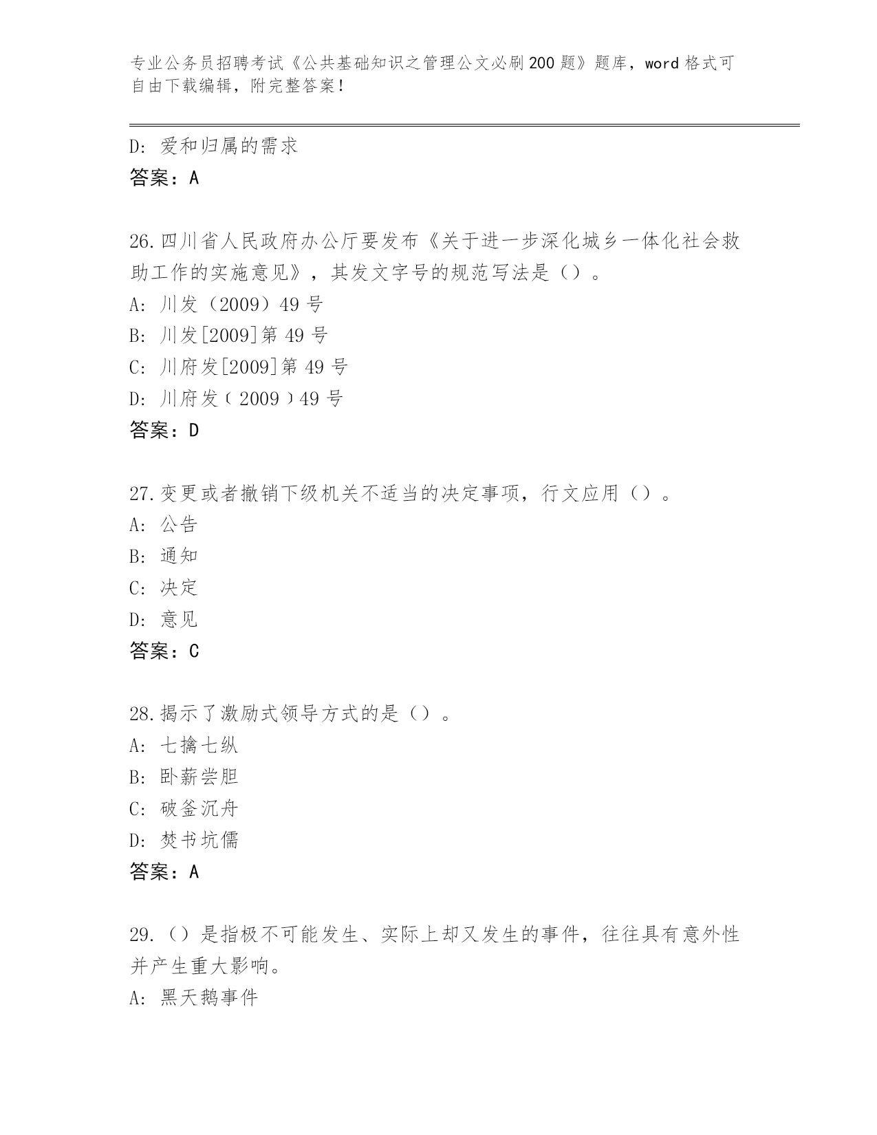 历年云南省会泽县公务员招聘考试《公共基础知识之管理公文必刷200题》完整版(A卷)