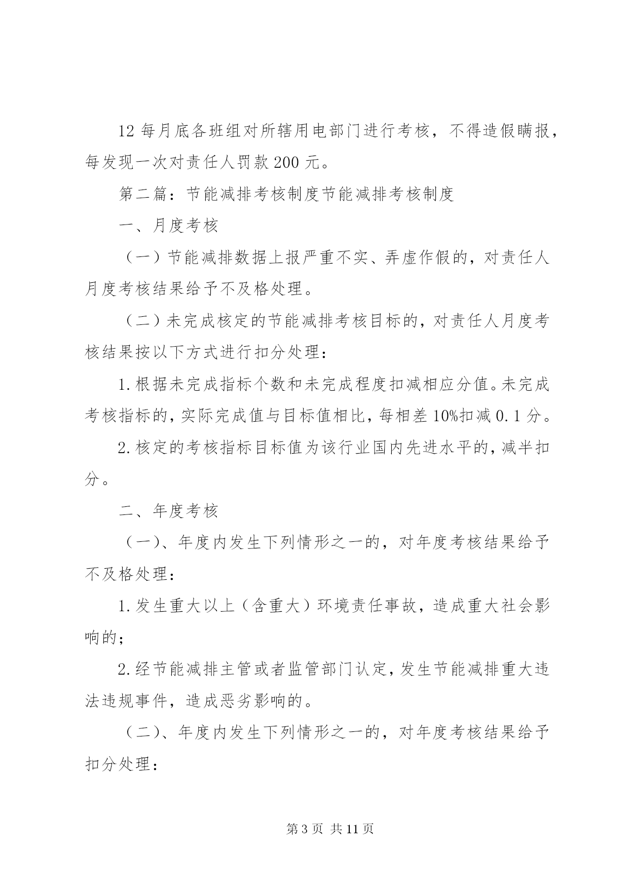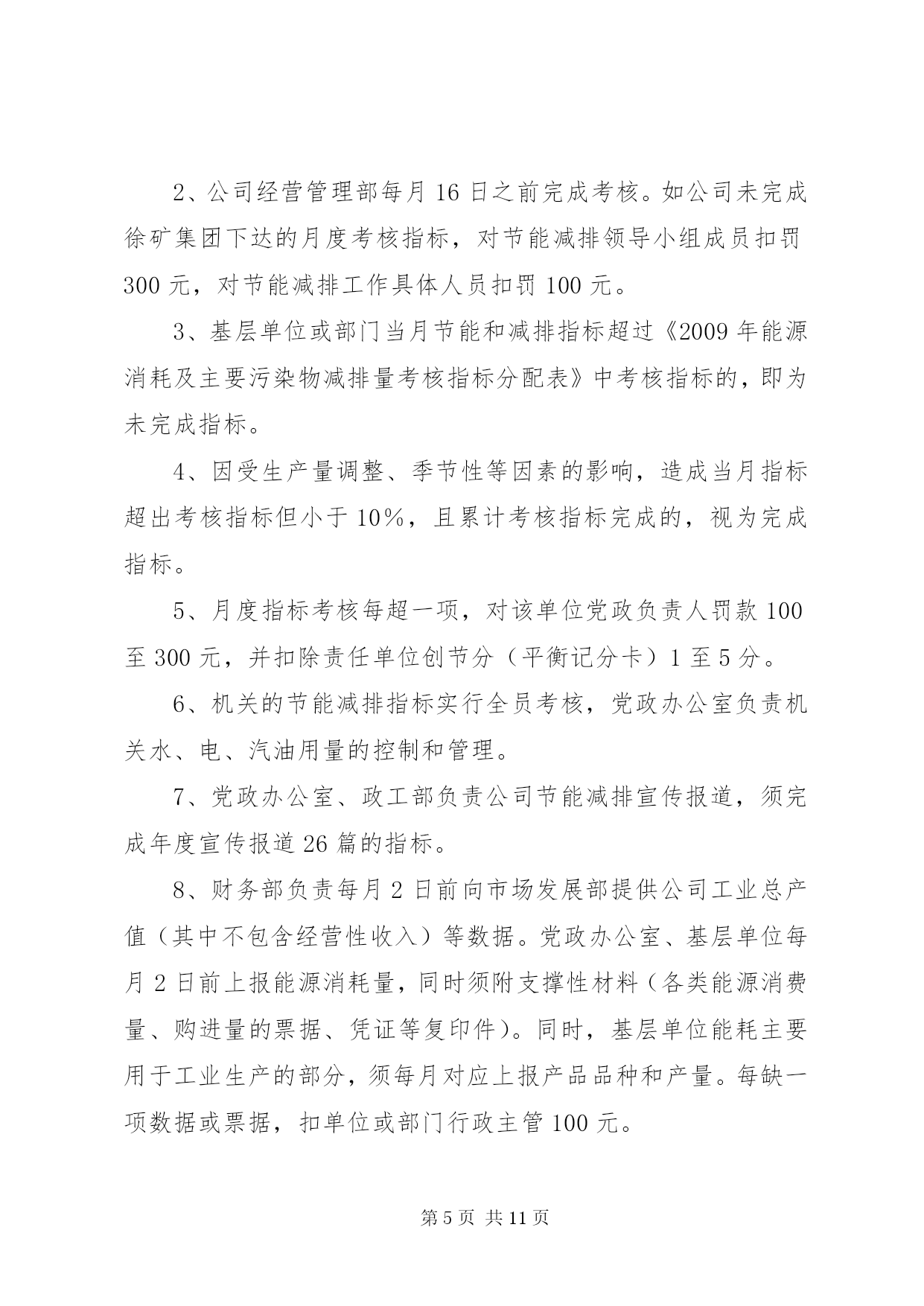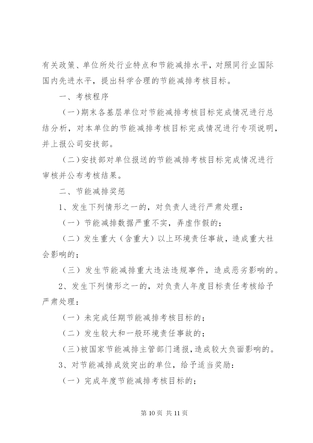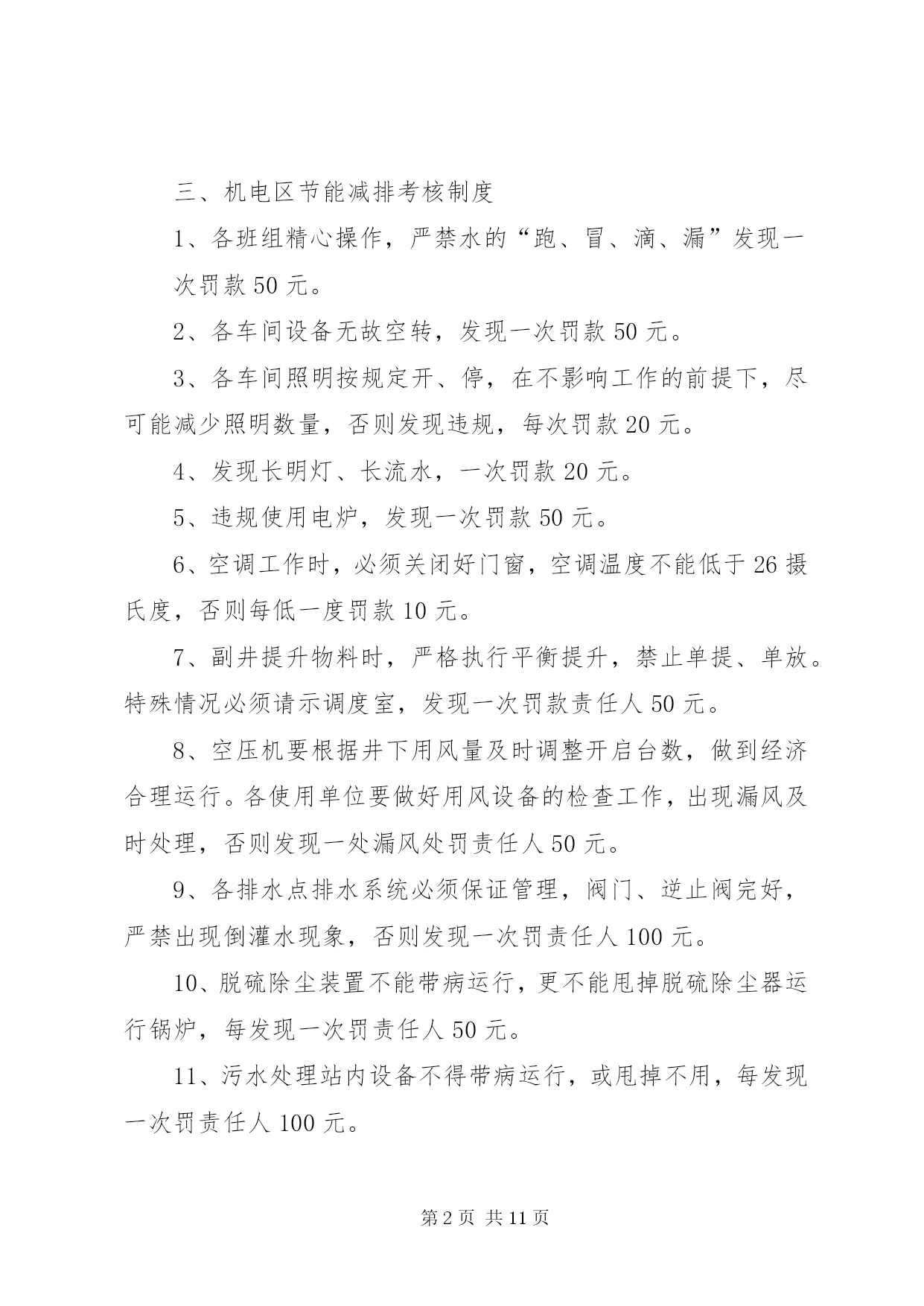 第PAGE\*Arabic\*MERGEFORMAT11页共NUMPAGES\*MERGEFORMAT11页机电区节能减排考核制度机电区为了更好开展节能减排工作,在全员中培养节能减排意识,实现年度及月度节能减排目标,专门成立了机电区节能减排领导小组。明确机电区节能减排各个层面的责任人、责任内容及具体考核措施,确保机电区节能减排工作长期有效深入开展。一、机电区节能减排责任划分。1.责任人:侯兴明李志明吕震2.责任内容(1).负责贯彻落实机电区节能减排的有关规定、制度、措施。(2).负责制定机电区节能减排的有关规定、制度、措施。(3).负责制定机电区节能减排目标。(4).监督、检查机电区节能减排工作的落实情况。二、班组节能减排责任划分。1、责任人:张福弟牛玉海李玉柱赵云国岳飞温树成2、责任内容(1).负责认真落实各自班组的具体节能减排分解目标。(2).负责对各自班组员工进行节能减排有关规定、制度、措施的贯彻、培训、学习逐步培养员工的节能减排意识。(3).负责各自班组日常节能减排考核工作。(4).负责各自工段定期节能减排工作总结。三、机电区节能减排考核制度1、各班组精心操作,严禁水的“跑、冒、滴、漏”发现一次罚款50元。2、各车间设备无故空转,发现一次罚款50元。3、各车间照明按规定开、停,在不影响工作的前提下,尽可能减少照明数量,否则发现违规,每次罚款20元。4、发现长明灯、长流水,一次罚款20元。5、违规使用电炉,发现一次罚款50元。6、空调工作时,必须关闭好门窗,空调温度不能低于26摄氏度,否则每低一度罚款10元。7、副井提升物料时,严格执行平衡提升,禁止单提、单放。特殊情况必须请示调度室,发现一次罚款责任人50元。8、空压机要根据井下用风量及时调整开启台数,做到经济合理运行。各使用单位要做好用风设备的检查工作,出现漏风及时处理,否则发现一处漏风处罚责任人50元。9、各排水点排水系统必须保证管理,阀门、逆止阀完好,严禁出现倒灌水现象,否则发现一次罚责任人100元。10、脱硫除尘装置不能带病运行,更不能甩掉脱硫除尘器运行锅炉,每发现一次罚责任人50元。11、污水处理站内设备不得带病运行,或甩掉不用,每发现一次罚责任人100元。12每月底各班组对所辖用电部门进行考核,不得造假瞒报,每发现一次对责任人罚款200元。第二篇:节能减排考核制度节能减排考核制度一、月度考核(一)节能减排数据上报严重不实、弄虚作假的,对责任人月度考核结果给予不及格处理。(二)未完成核定的节能减排考核目标的,对责任人月度考核结果按以下方式进行扣分处理:1.根据未完成指标个数和未完成程度扣减相应分值。未完成考核指标的,实际完成值与目标值相比,每相差10%扣减0.1分。2.核定的考核指标目标值为该行业国内先进水平的,减半扣分。二、年度考核(一)、年度内发生下列情形之一的,对年度考核结果给予不及格处理:1.发生重大以上(含重大)环境责任事故,造成重大社会影响的;2.经节能减排主管或者监管部门认定,发生节能减排重大违法违规事件,造成恶劣影响的。(二)、年度内发生下列情形之一的,对年度考核结果给予扣分处理:1.发生较大和一般环境责任事故的,按以下方式进行扣分:(1)每发生一次较大环境责任事故(Ⅲ级),重点类、关注类和一般类分别扣减0.3分、0.5分和0.7分;(2)每发生一次一般环境责任事故(Ⅳ级),重点类、关注类和一般类企业分别扣减0.1分、0.3分和0.5分;(3)在当年不能认定的环境责任事故顺延处理。2.被国家节能减排主管部门以及集团主管部门通报,造成较大负面影响的,每通报一次扣减0.2分,最多扣1分。第三篇:节能减排考核办法xx公司制定节能减排考核办法xx公司为贯彻落实徐矿集团节能减排指标,采用定量与定性相结合的考核方法,实行月度和年度相结合的考核制度。具体考核分为十一个方面的内容:1、每月1日前由财务部提供上月公司各单位用水量明细表,单位自用煤明细表及各项发票复印件。每延误一次或错报、漏报一次扣罚部门行政主管100元;如因未报或错报数据,造成上级对公司的处罚,除其责任由部门行政主管承担外,公司另将追究相关责任人的责任。公司节能减排办公室每月2日前完成各单位及部门能源(电、煤、油、水等)消耗量、主要污染物排放量(COD、SO2)等指标统计,并书面报公司节能减排领导小组审定后,由经营管理部进行考核、市场发展部进行汇总,工资部每月将受奖罚的人员明细提供给节能减排领导小组办公室。2、公司经营管理部每月16日之前完成考核。如公司未完成徐矿集团下达的月度考核指标,对节能减排领导小组成员扣罚300元,对节能减排工作具体人员扣罚100元。3、基层单位或部门当月节能和减排指标超过《2009年能源消耗及主要污染物减排量考核指标分配表》中考核指标的,即为未