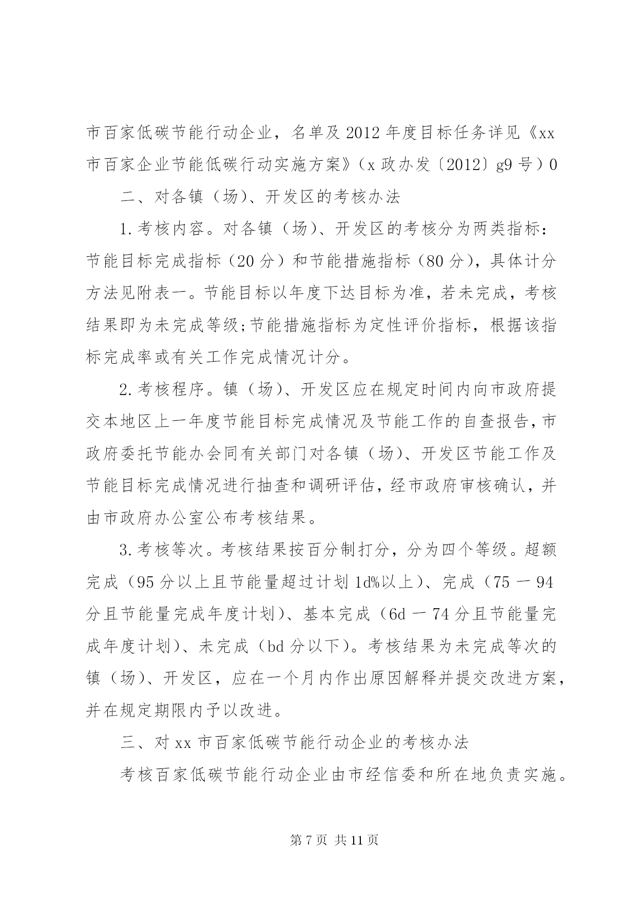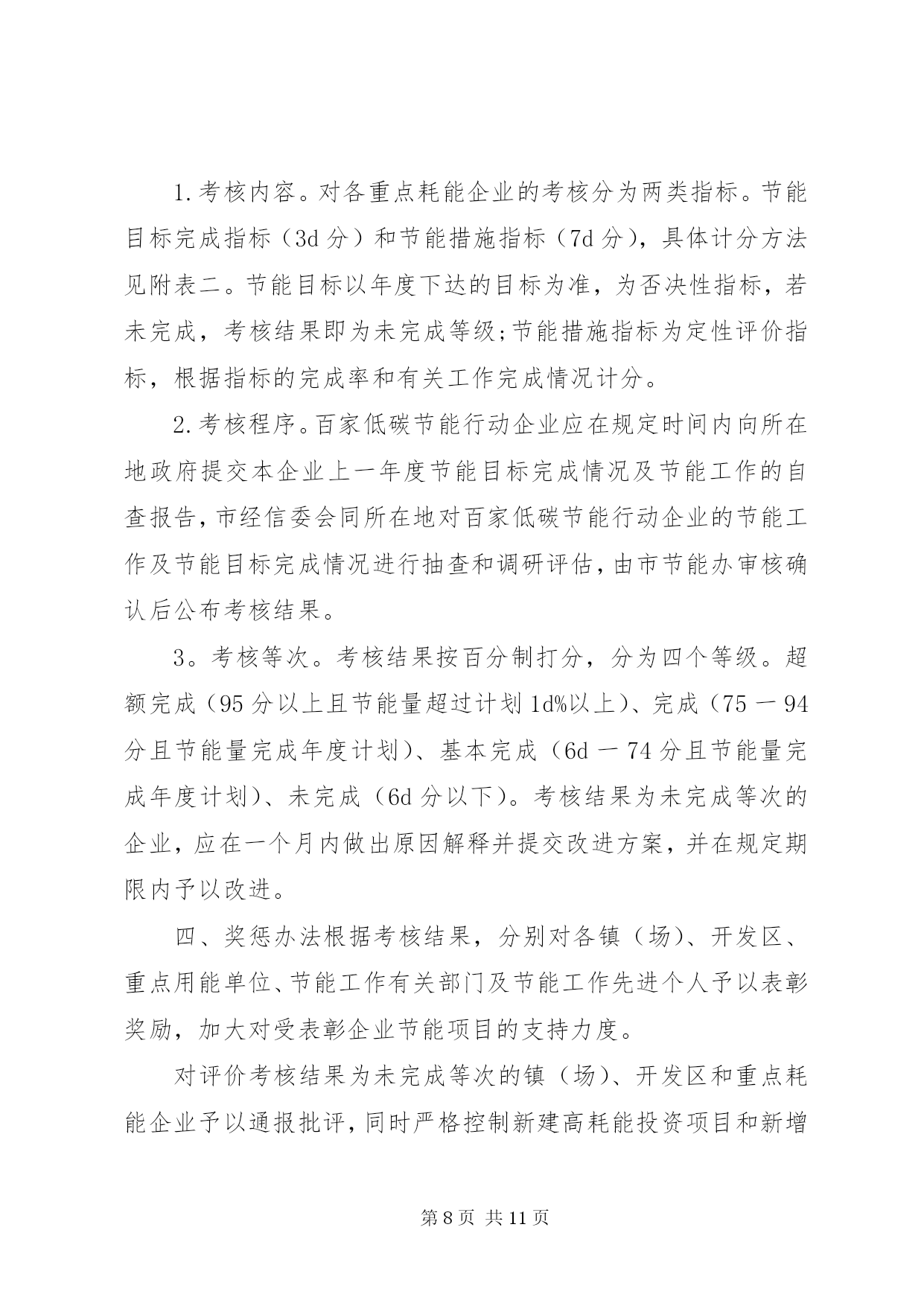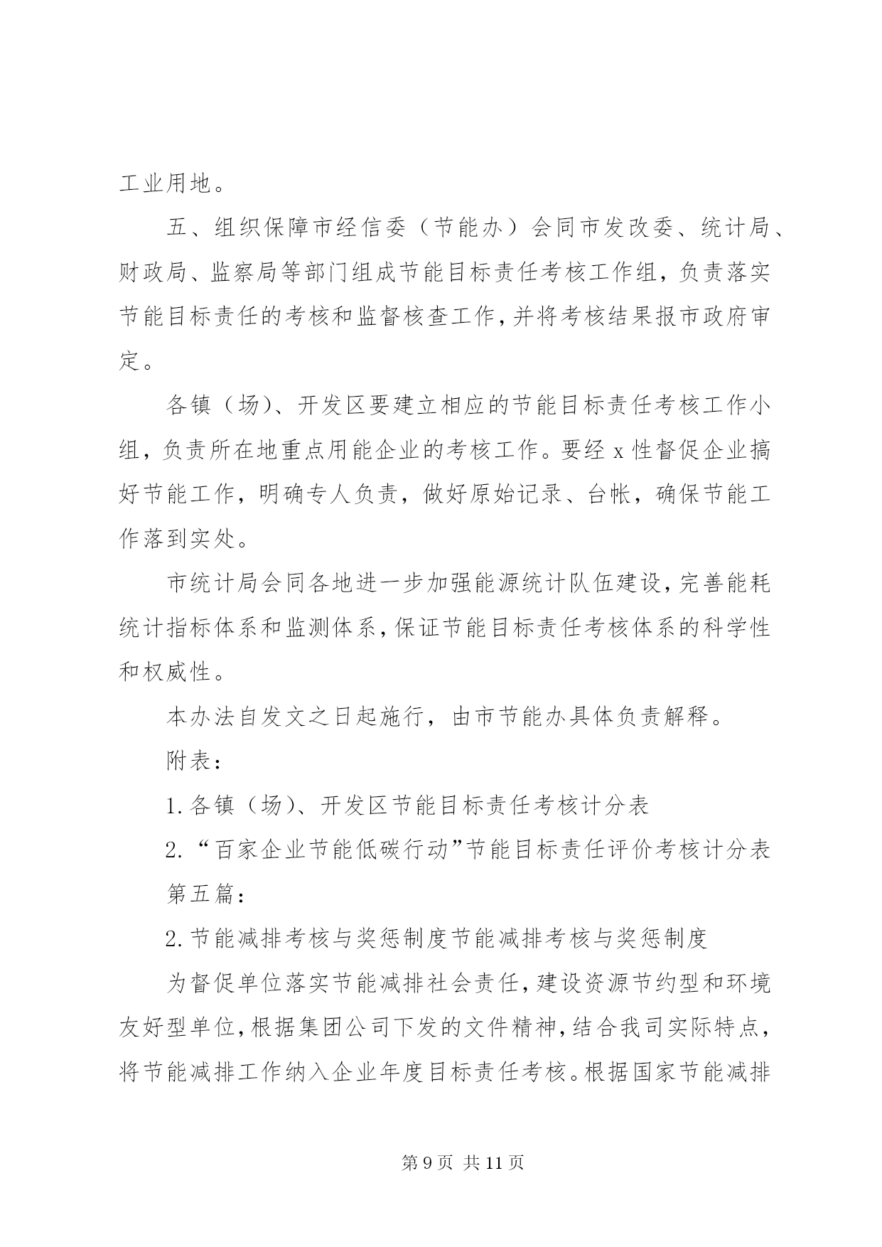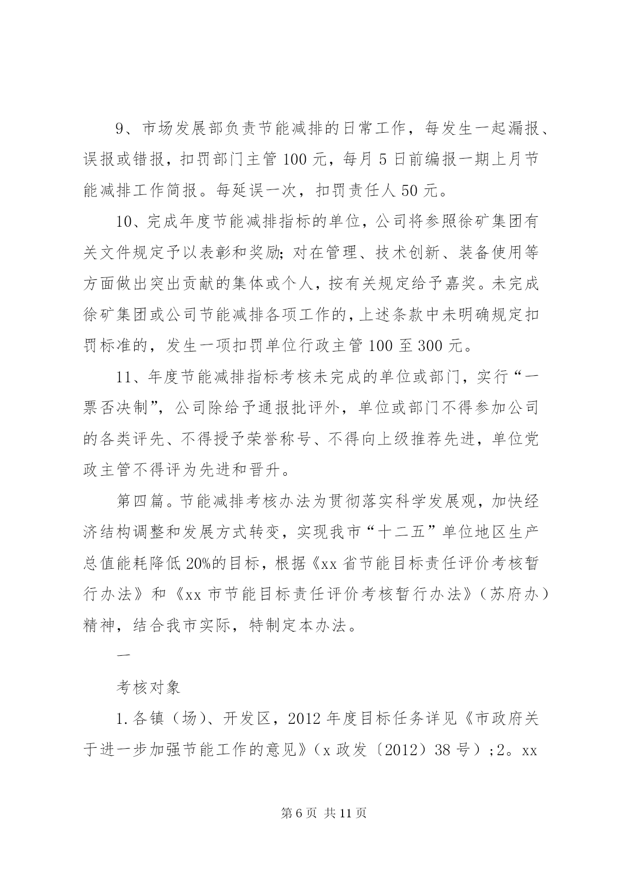 第PAGE\*Arabic\*MERGEFORMAT11页共NUMPAGES\*MERGEFORMAT11页机电区节能减排考核制度机电区为了更好开展节能减排工作,在全员中培养节能减排意识,实现年度及月度节能减排目标,专门成立了机电区节能减排领导小组。明确机电区节能减排各个层面的责任人、责任内容及具体考核措施,确保机电区节能减排工作长期有效深入开展。一、机电区节能减排责任划分。1.责任人:侯兴明李志明吕震2.责任内容(1).负责贯彻落实机电区节能减排的有关规定、制度、措施。(2).负责制定机电区节能减排的有关规定、制度、措施。(3).负责制定机电区节能减排目标。(4).监督、检查机电区节能减排工作的落实情况。二、班组节能减排责任划分。1、责任人:张福弟牛玉海李玉柱赵云国岳飞温树成2、责任内容(1).负责认真落实各自班组的具体节能减排分解目标。(2).负责对各自班组员工进行节能减排有关规定、制度、措施的贯彻、培训、学习逐步培养员工的节能减排意识。(3).负责各自班组日常节能减排考核工作。(4).负责各自工段定期节能减排工作总结。三、机电区节能减排考核制度1、各班组精心操作,严禁水的“跑、冒、滴、漏”发现一次罚款50元。2、各车间设备无故空转,发现一次罚款50元。3、各车间照明按规定开、停,在不影响工作的前提下,尽可能减少照明数量,否则发现违规,每次罚款20元。4、发现长明灯、长流水,一次罚款20元。5、违规使用电炉,发现一次罚款50元。6、空调工作时,必须关闭好门窗,空调温度不能低于26摄氏度,否则每低一度罚款10元。7、副井提升物料时,严格执行平衡提升,禁止单提、单放。特殊情况必须请示调度室,发现一次罚款责任人50元。8、空压机要根据井下用风量及时调整开启台数,做到经济合理运行。各使用单位要做好用风设备的检查工作,出现漏风及时处理,否则发现一处漏风处罚责任人50元。9、各排水点排水系统必须保证管理,阀门、逆止阀完好,严禁出现倒灌水现象,否则发现一次罚责任人100元。10、脱硫除尘装置不能带病运行,更不能甩掉脱硫除尘器运行锅炉,每发现一次罚责任人50元。11、污水处理站内设备不得带病运行,或甩掉不用,每发现一次罚责任人100元。12每月底各班组对所辖用电部门进行考核,不得造假瞒报,每发现一次对责任人罚款200元。第二篇:节能减排考核制度节能减排考核制度一、月度考核(一)节能减排数据上报严重不实、弄虚作假的,对责任人月度考核结果给予不及格处理。(二)未完成核定的节能减排考核目标的,对责任人月度考核结果按以下方式进行扣分处理:1.根据未完成指标个数和未完成程度扣减相应分值。未完成考核指标的,实际完成值与目标值相比,每相差10%扣减0.1分。2.核定的考核指标目标值为该行业国内先进水平的,减半扣分。二、年度考核(一)、年度内发生下列情形之一的,对年度考核结果给予不及格处理:1.发生重大以上(含重大)环境责任事故,造成重大社会影响的;2.经节能减排主管或者监管部门认定,发生节能减排重大违法违规事件,造成恶劣影响的。(二)、年度内发生下列情形之一的,对年度考核结果给予扣分处理:1.发生较大和一般环境责任事故的,按以下方式进行扣分:(1)每发生一次较大环境责任事故(Ⅲ级),重点类、关注类和一般类分别扣减0.3分、0.5分和0.7分;(2)每发生一次一般环境责任事故(Ⅳ级),重点类、关注类和一般类企业分别扣减0.1分、0.3分和0.5分;(3)在当年不能认定的环境责任事故顺延处理。2.被国家节能减排主管部门以及集团主管部门通报,造成较大负面影响的,每通报一次扣减0.2分,最多扣1分。第三篇:节能减排考核办法xx公司制定节能减排考核办法xx公司为贯彻落实徐矿集团节能减排指标,采用定量与定性相结合的考核方法,实行月度和年度相结合的考核制度。具体考核分为十一个方面的内容:1、每月1日前由财务部提供上月公司各单位用水量明细表,单位自用煤明细表及各项发票复印件。每延误一次或错报、漏报一次扣罚部门行政主管100元;如因未报或错报数据,造成上级对公司的处罚,除其责任由部门行政主管承担外,公司另将追究相关责任人的责任。公司节能减排办公室每月2日前完成各单位及部门能源(电、煤、油、水等)消耗量、主要污染物排放量(COD、SO2)等指标统计,并书面报公司节能减排领导小组审定后,由经营管理部进行考核、市场发展部进行汇总,工资部每月将受奖罚的人员明细提供给节能减排领导小组办公室。2、公司经营管理部每月16日之前完成考核。如公司未完成徐矿集团下达的月度考核指标,对节能减排领导小组成员扣罚300元,对节能减排工作具体人员扣罚100元。3、基层单位或部门当月节能和减排指标超过《2009年能源消耗及主要污染物减排量考核指标分配表》中考核指标的,即为未