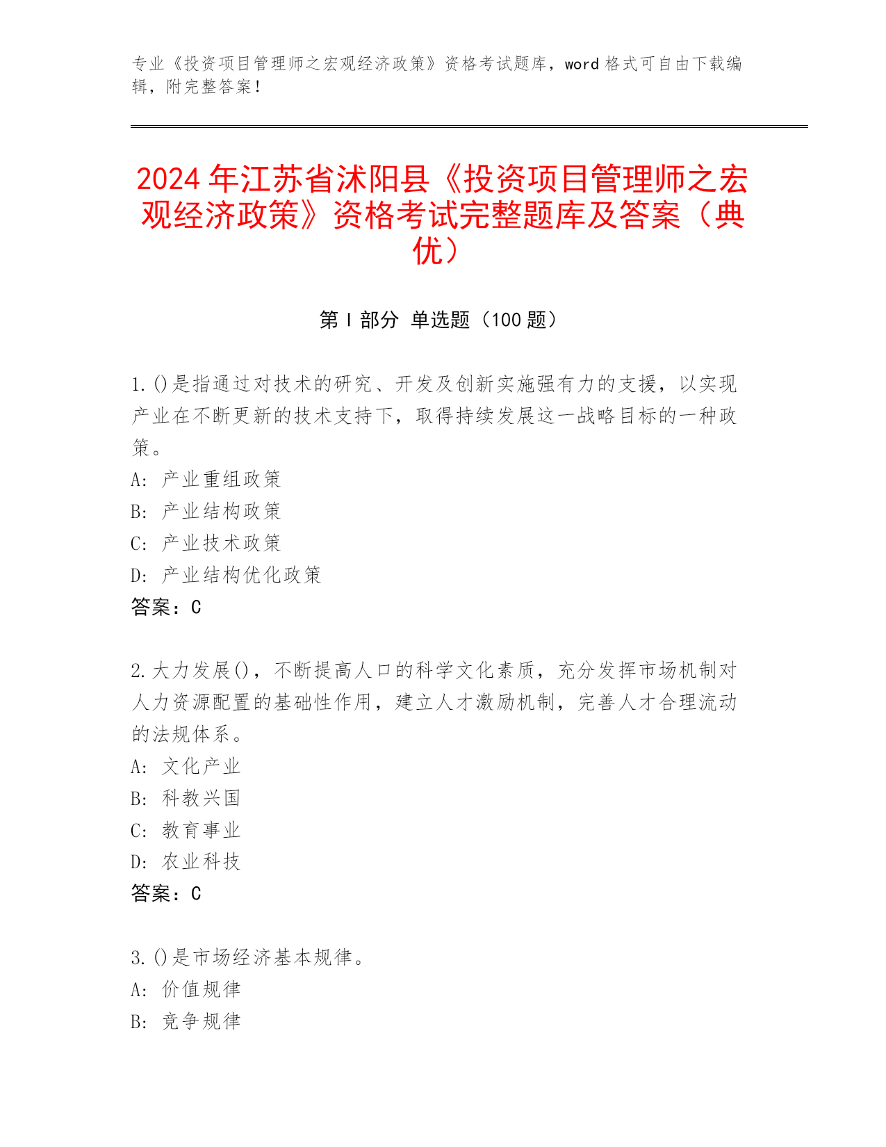 2024年江苏省沭阳县《投资项目管理师之宏观经济政策》资格考试完整题库及答案(典优).docx