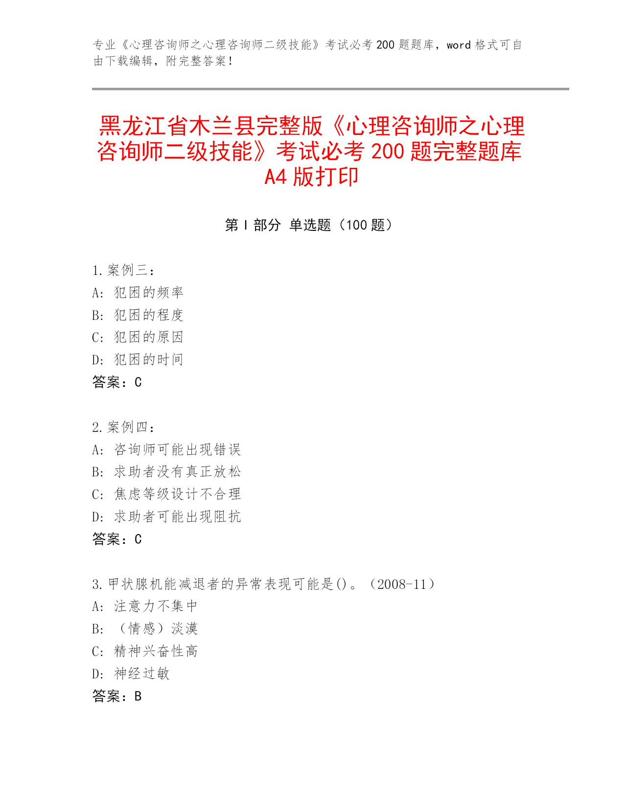 黑龙江省木兰县完整版《心理咨询师之心理咨询师二级技能》考试必考200题完整题库A4版打印