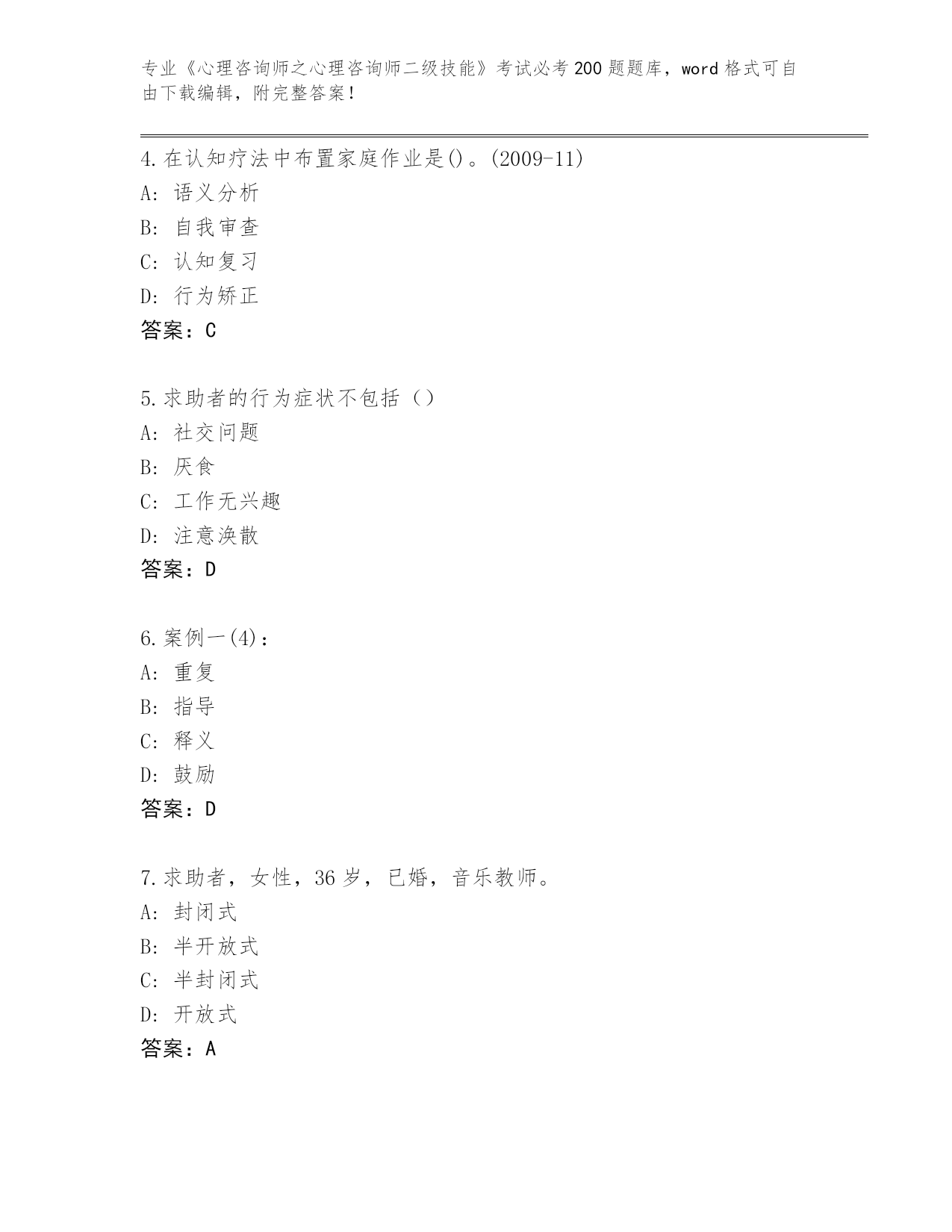 浙江省开化县完整版《心理咨询师之心理咨询师二级技能》考试必考200题完整版A4版可打印